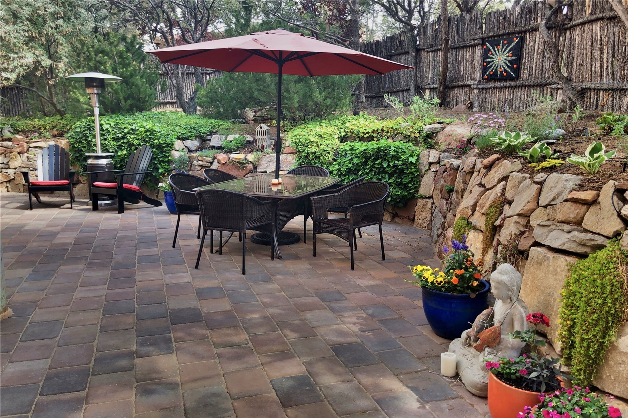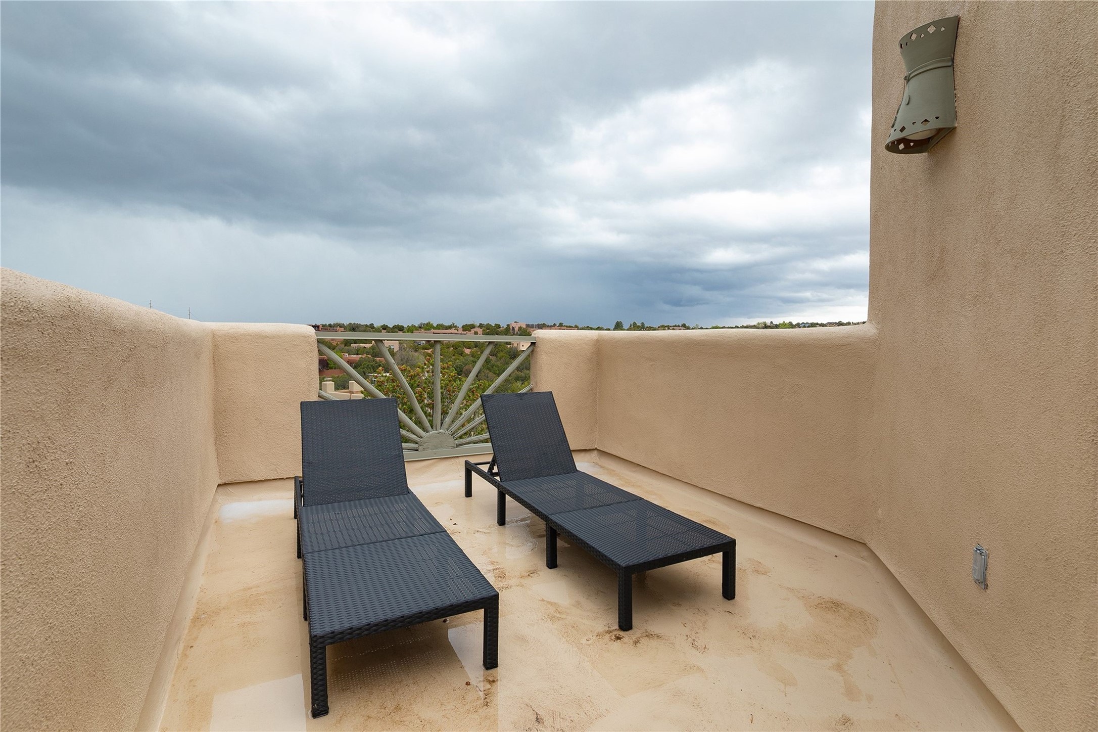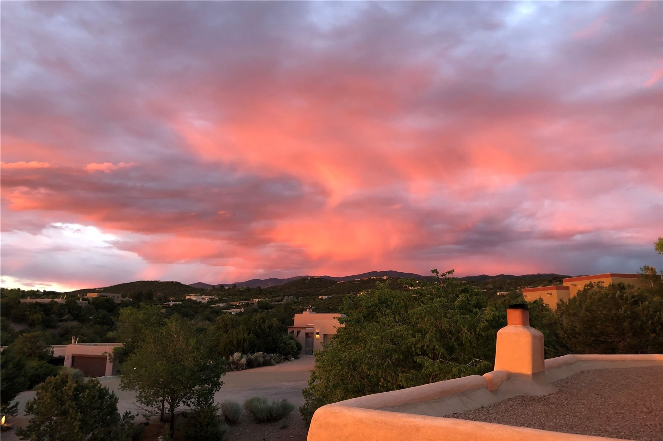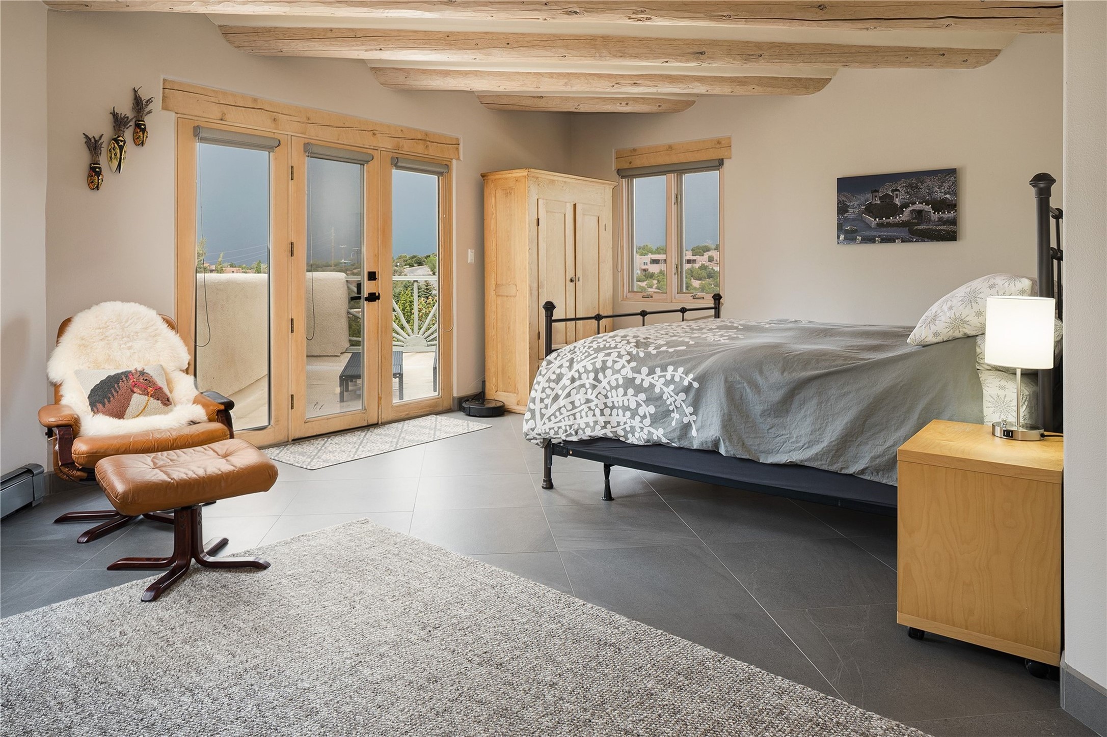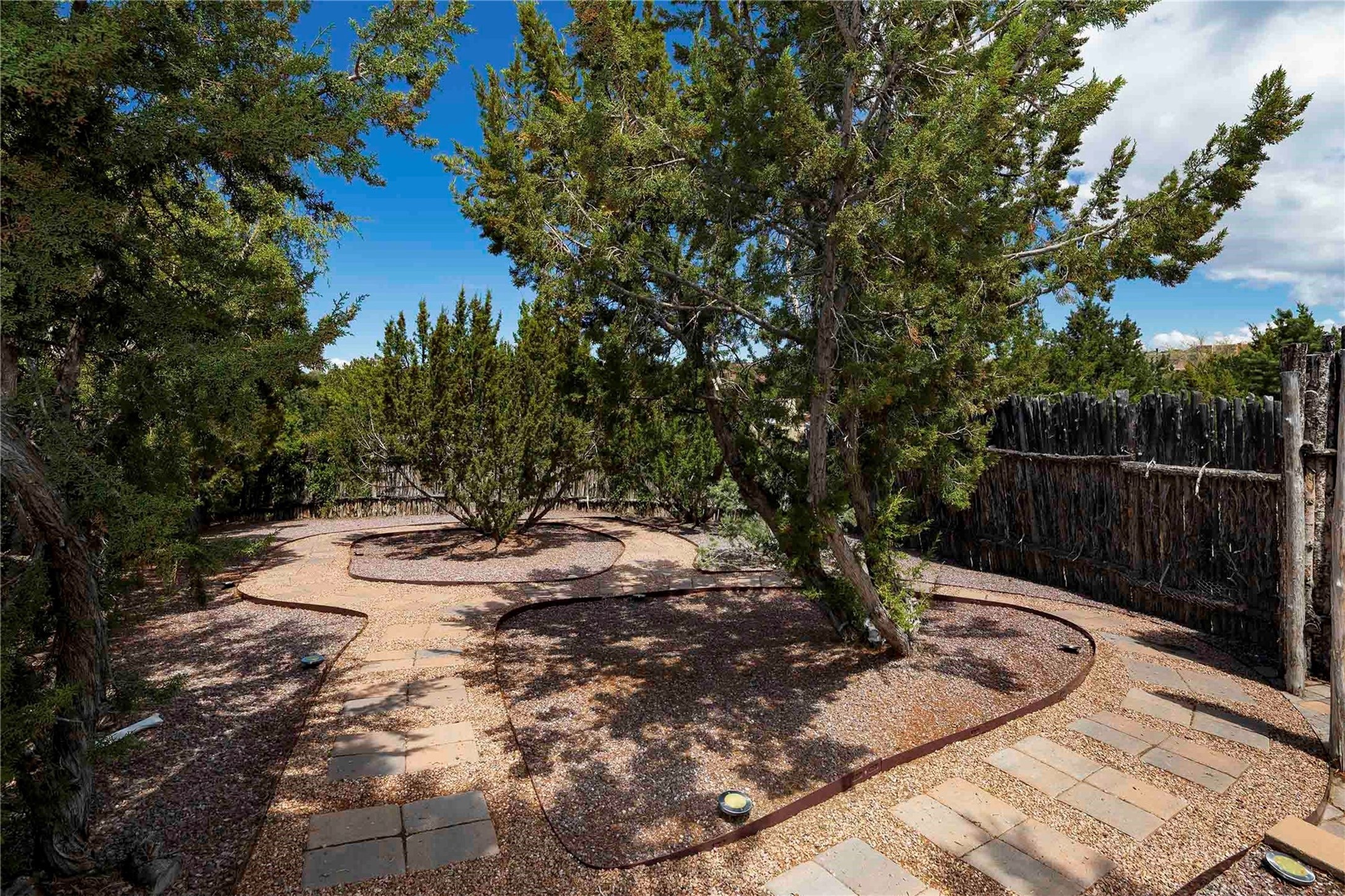 Set in the North Hills above Historic downtown Santa Fe, this serene, sophisticated home is an expressive mix of Soft Contemporary and Traditional styles. Gorgeous hardwood floors sweep from the foyer through the living/dining area with its double-sided kiva fireplace and adjacent deck. The kitchen continues the home's handsome palette with chocolate-colored countertops, maple cabinets and a sun-bathed alcove for casual meals. A few steps down from the kitchen is a den, with adjacent Laundry/Mudroom and double-door access to the sheltered back patio. A sleek, custom staircase leads to the home's four bedrooms. A soothing sanctuary, the Primary bedroom has a coved ceiling, fireplace, private view deck and ensuite, remodeled bath with walk-in, glass-walled shower. In the back garden, a moss rock wall borders an expansive, paver patio, with water feature. The atmosphere turns magical as the path glides toward the lower garden with its outdoor shower and hot tub. A new, high-efficiency boiler, solar and on-demand hot water heater add to the appeal of this refined offering. Residents of the Estancia Primera community enjoy an outdoor pool, tennis courts, and clubhouse. Walking trails enable quick access to downtown. Hiking trails and the Ski Basin are a short drive away.