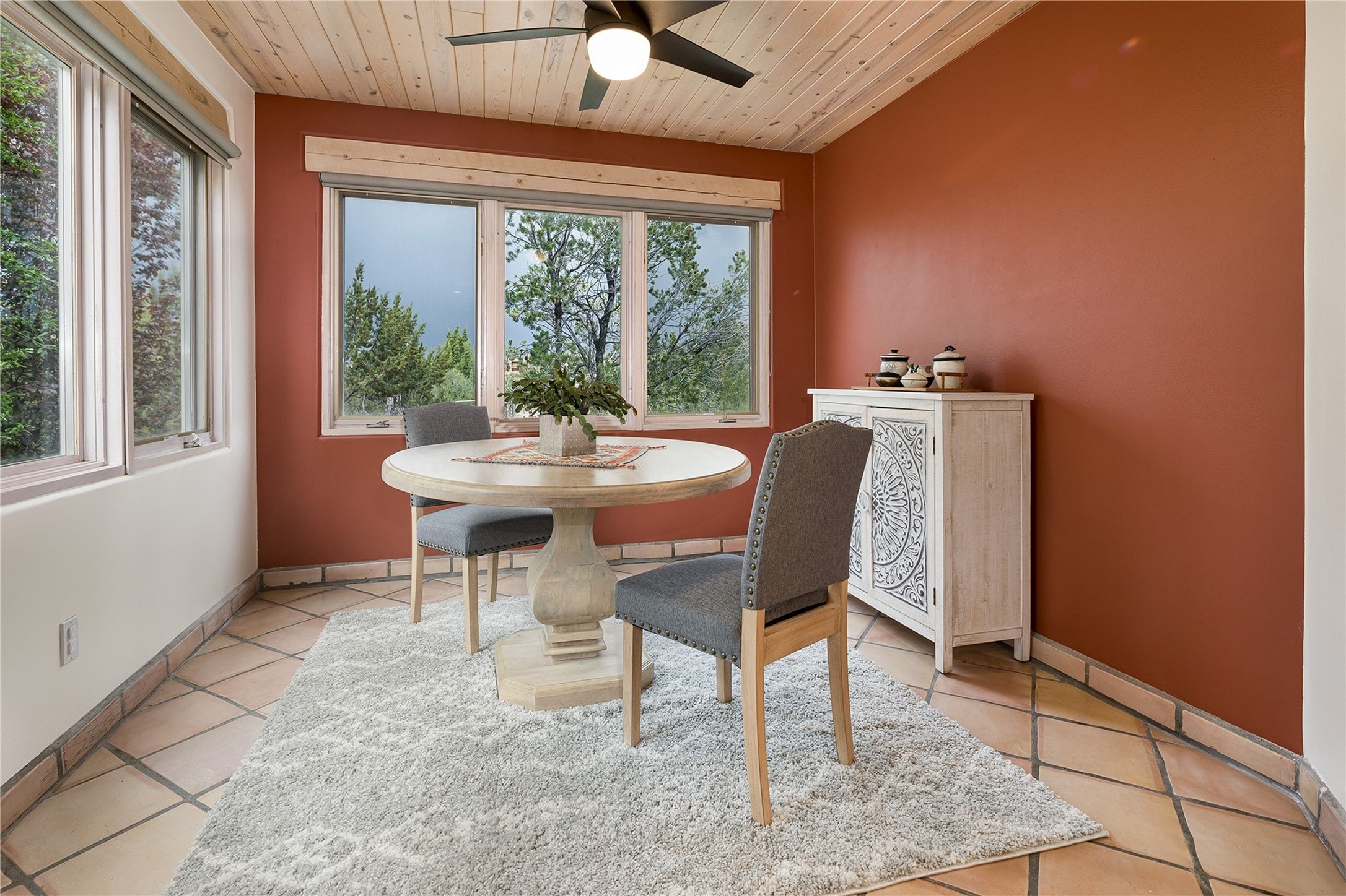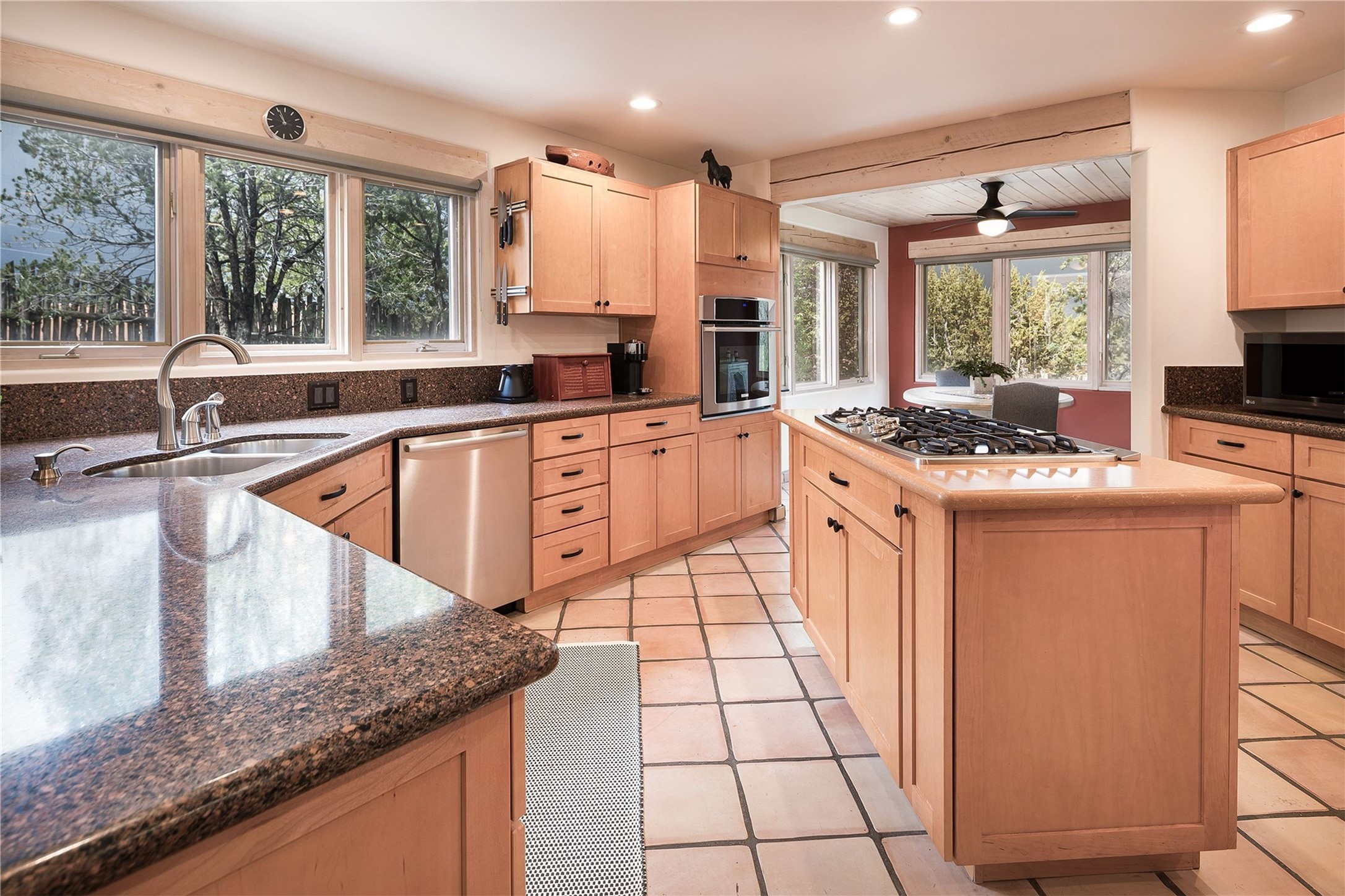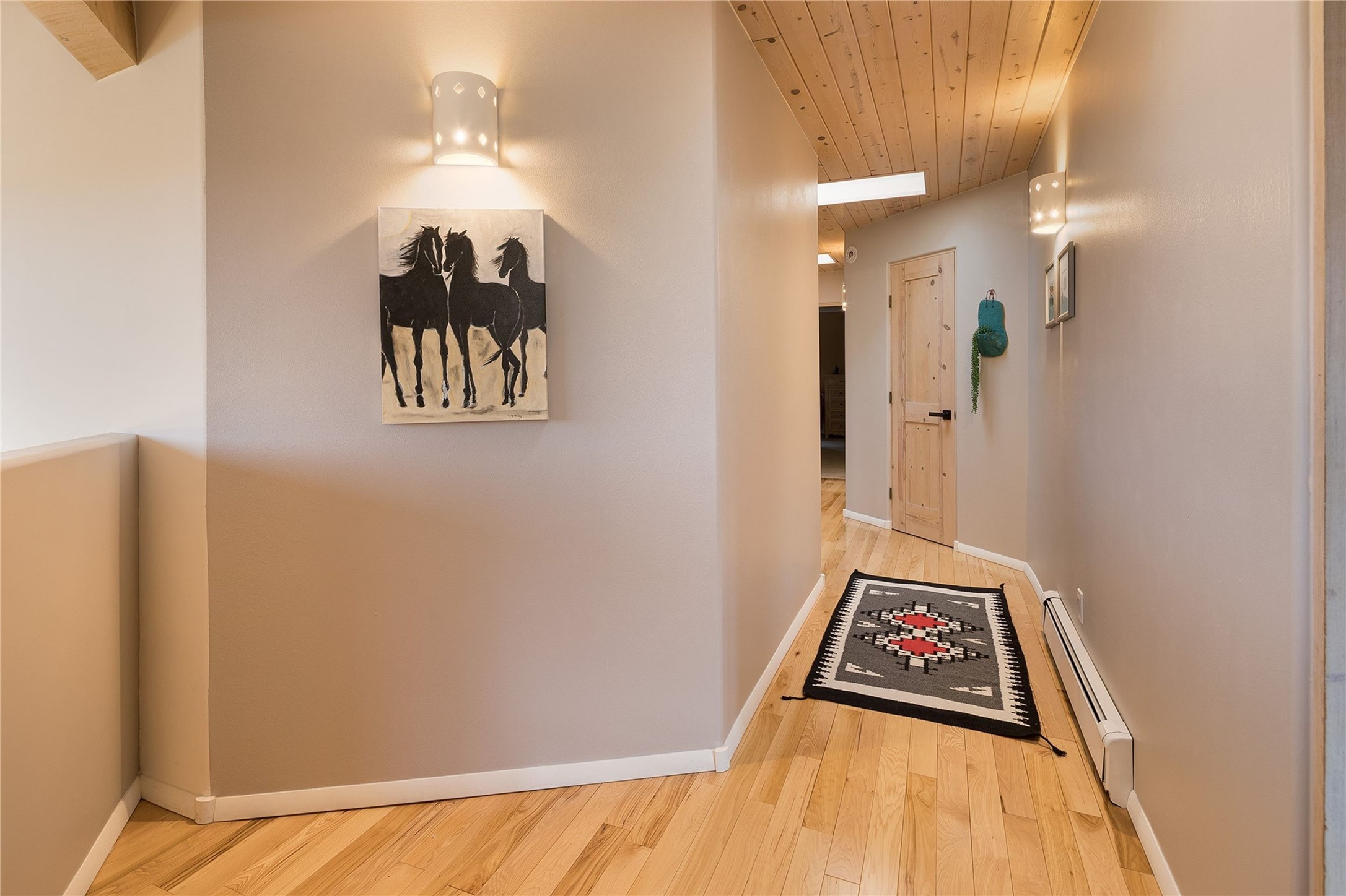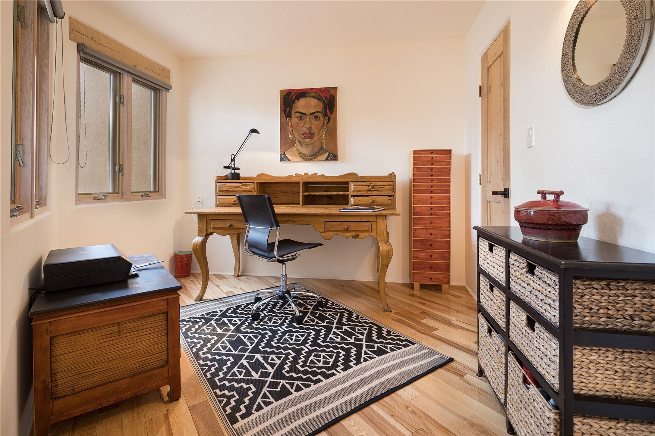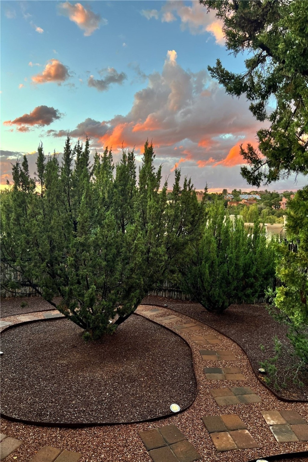 Set in the North Hills above Historic downtown Santa Fe, this serene, sophisticated home is an expressive mix of Soft Contemporary and Traditional styles. Gorgeous hardwood floors sweep from the foyer through the living/dining area with its double-sided kiva fireplace and adjacent deck. The kitchen continues the home's handsome palette with chocolate-colored countertops, maple cabinets and a sun-bathed alcove for casual meals. A few steps down from the kitchen is a den, with adjacent Laundry/Mudroom and double-door access to the sheltered back patio. A sleek, custom staircase leads to the home's four bedrooms. A soothing sanctuary, the Primary bedroom has a coved ceiling, fireplace, private view deck and ensuite, remodeled bath with walk-in, glass-walled shower. In the back garden, a moss rock wall borders an expansive, paver patio, with water feature. The atmosphere turns magical as the path glides toward the lower garden with its outdoor shower and hot tub. A new, high-efficiency boiler, solar and on-demand hot water heater add to the appeal of this refined offering. Residents of the Estancia Primera community enjoy an outdoor pool, tennis courts, and clubhouse. Walking trails enable quick access to downtown. Hiking trails and the Ski Basin are a short drive away.