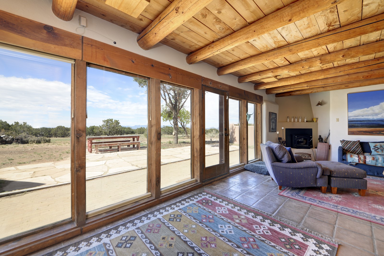 Updated charming ADOBE Passive solar home with a rustic contemporary vibe. It has two bedrooms and an office/bedroom, plus two full bathrooms on a large lot with STUNNING mountain views. The kitchen and both bathrooms were meticulously remodeled in late 2021, featuring sleek, quartz countertops, Fisher/ Paykel refrigerator, JennAir range, and a Bosch dishwasher. In addition, a new TPO roof, hot water tank, and a highly efficient Kuma wood-burning fireplace insert were also added. In 2023, two HVAC mini-split systems were installed, along with six inverters and a new washer/dryer. In 2024, a new hot tub/spa for relaxing and viewing the stellar sunsets, night sky, and bright stars. The primary bedroom features a kiva fireplace, a Trombe wall, and an en-suite bathroom. The bedrooms are on opposite sides of the home with private courtyards. The heated two-car garage has storage shelves and a workbench. The side yard is fully fenced and great for pets. Enjoy miles of walking and biking trails, a community center with a pool, tennis, pickleball courts, and dog parks. El Dorado has its own grocery store, convenience store, post office, gym, clinic, hardware store, senior center, restaurants, etc.. The home is also within blocks of one of the more highly regarded elementary schools in Santa Fe. All within a 15-20 minute drive to Santa Fe.