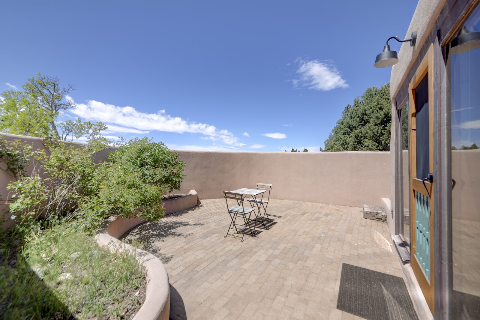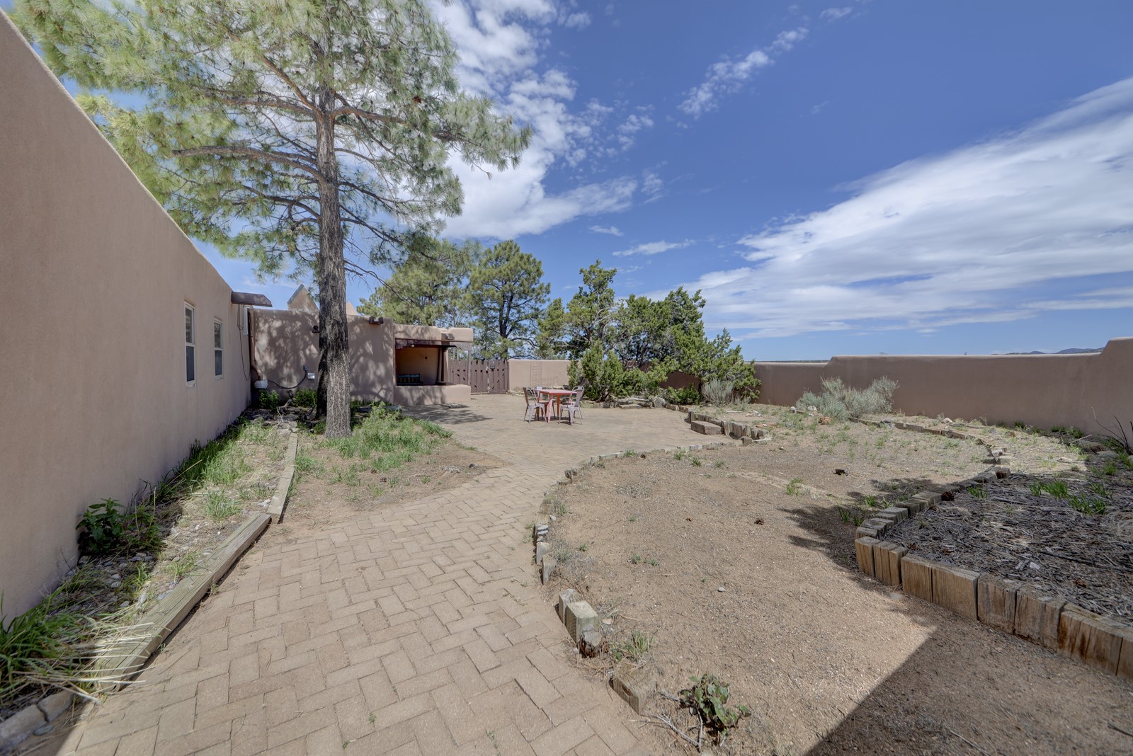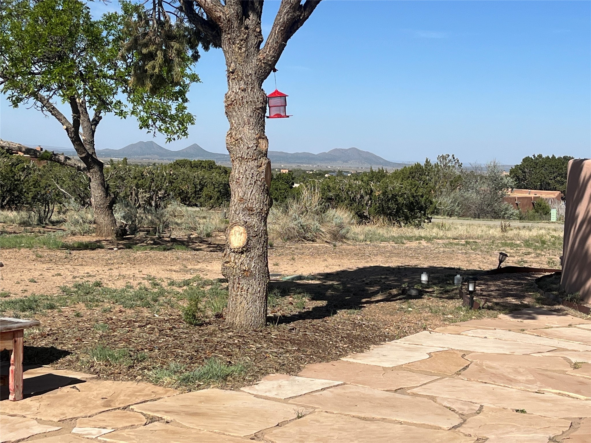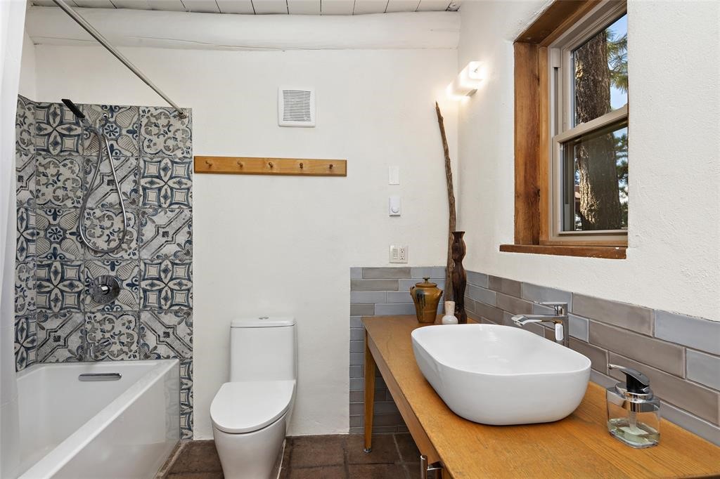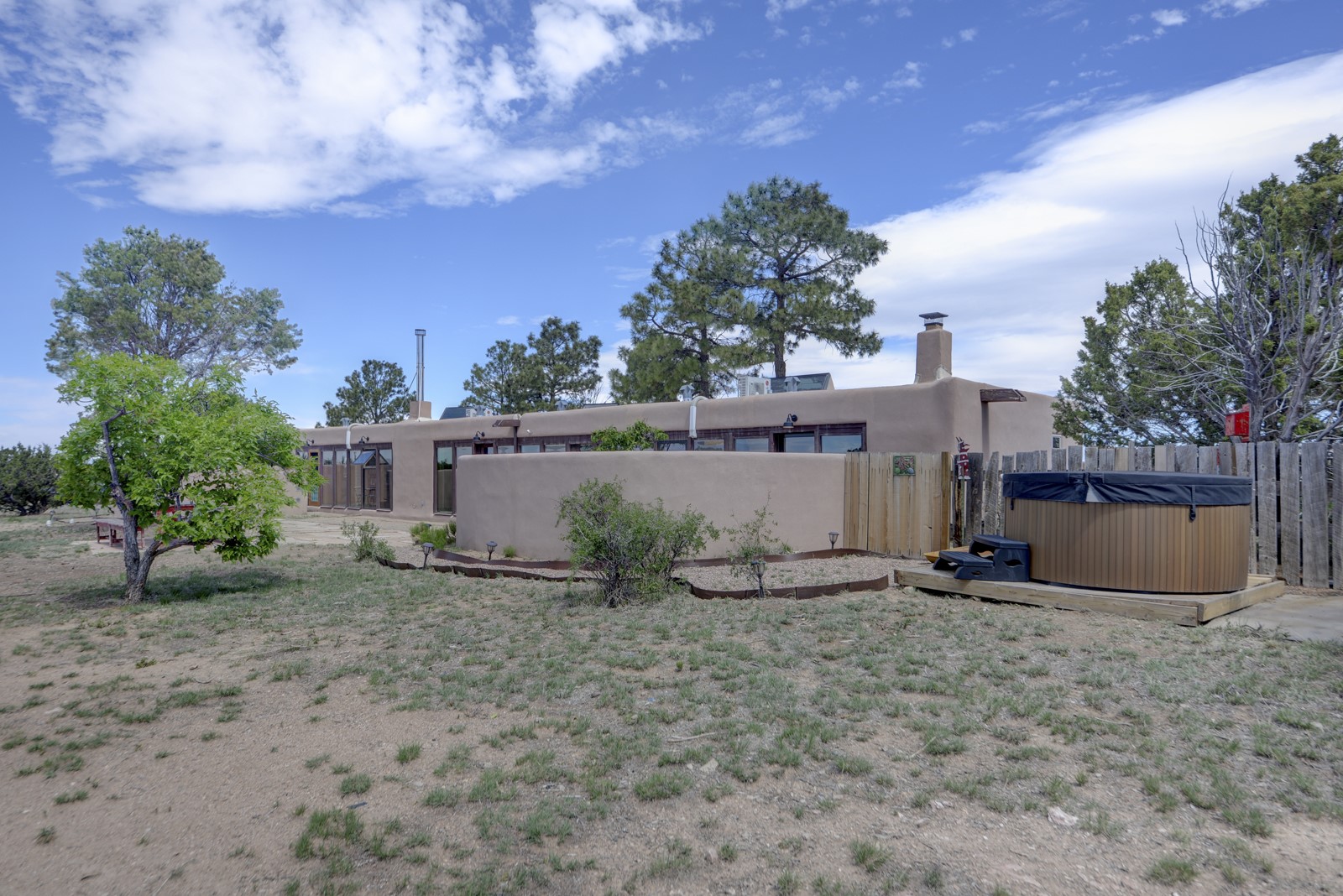 Updated charming ADOBE Passive solar home with a rustic contemporary vibe. It has two bedrooms and an office/bedroom, plus two full bathrooms on a large lot with STUNNING mountain views. The kitchen and both bathrooms were meticulously remodeled in late 2021, featuring sleek, quartz countertops, Fisher/ Paykel refrigerator, JennAir range, and a Bosch dishwasher. In addition, a new TPO roof, hot water tank, and a highly efficient Kuma wood-burning fireplace insert were also added. In 2023, two HVAC mini-split systems were installed, along with six inverters and a new washer/dryer. In 2024, a new hot tub/spa for relaxing and viewing the stellar sunsets, night sky, and bright stars. The primary bedroom features a kiva fireplace, a Trombe wall, and an en-suite bathroom. The bedrooms are on opposite sides of the home with private courtyards. The heated two-car garage has storage shelves and a workbench. The side yard is fully fenced and great for pets. Enjoy miles of walking and biking trails, a community center with a pool, tennis, pickleball courts, and dog parks. El Dorado has its own grocery store, convenience store, post office, gym, clinic, hardware store, senior center, restaurants, etc.. The home is also within blocks of one of the more highly regarded elementary schools in Santa Fe. All within a 15-20 minute drive to Santa Fe.