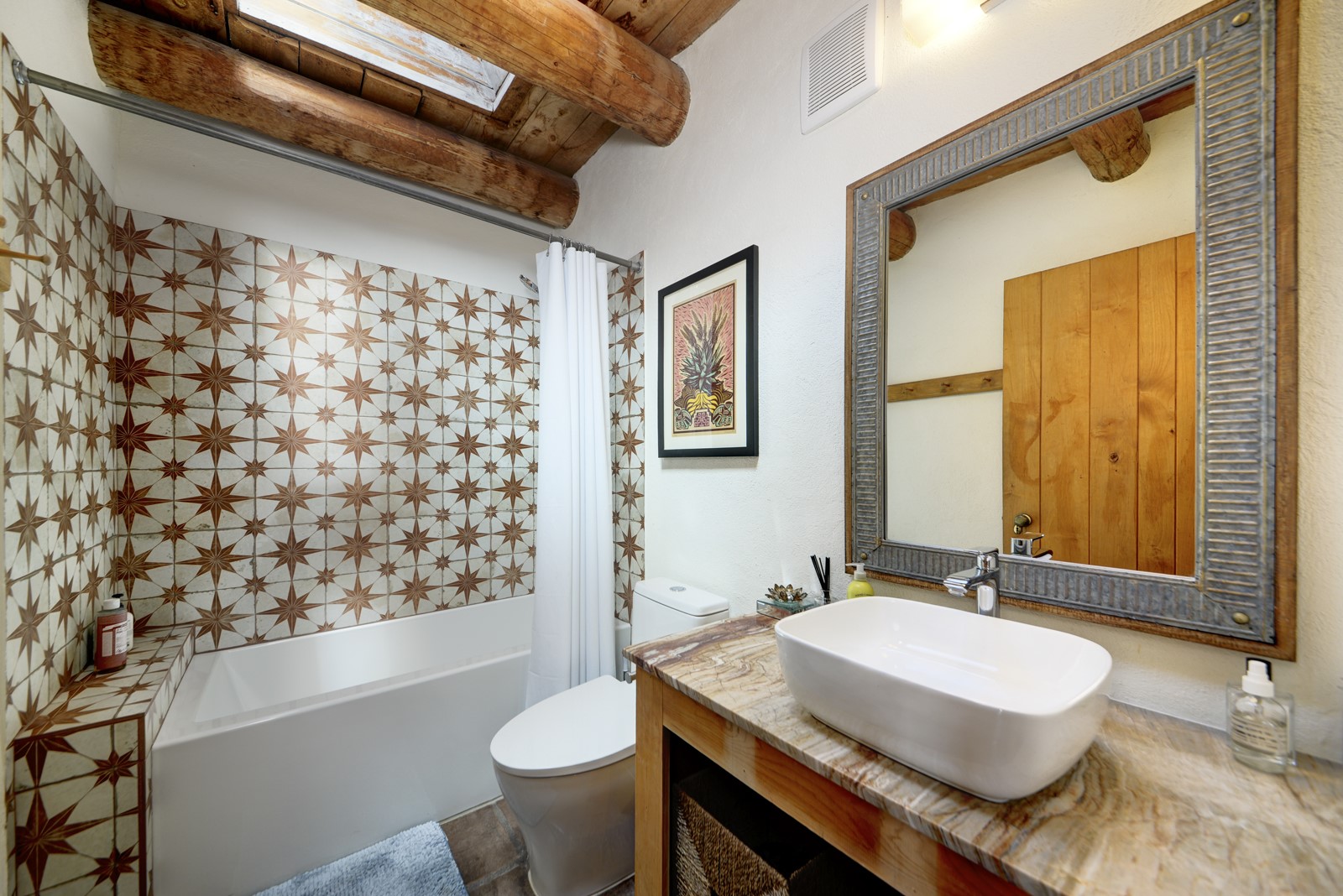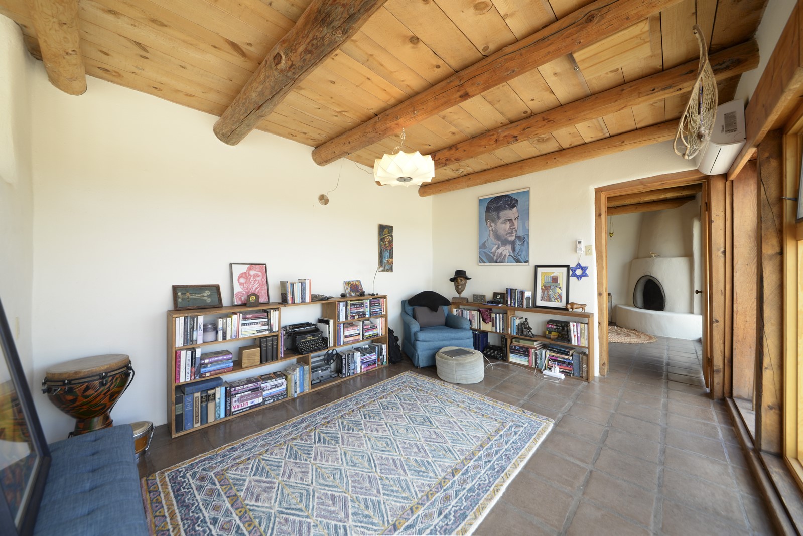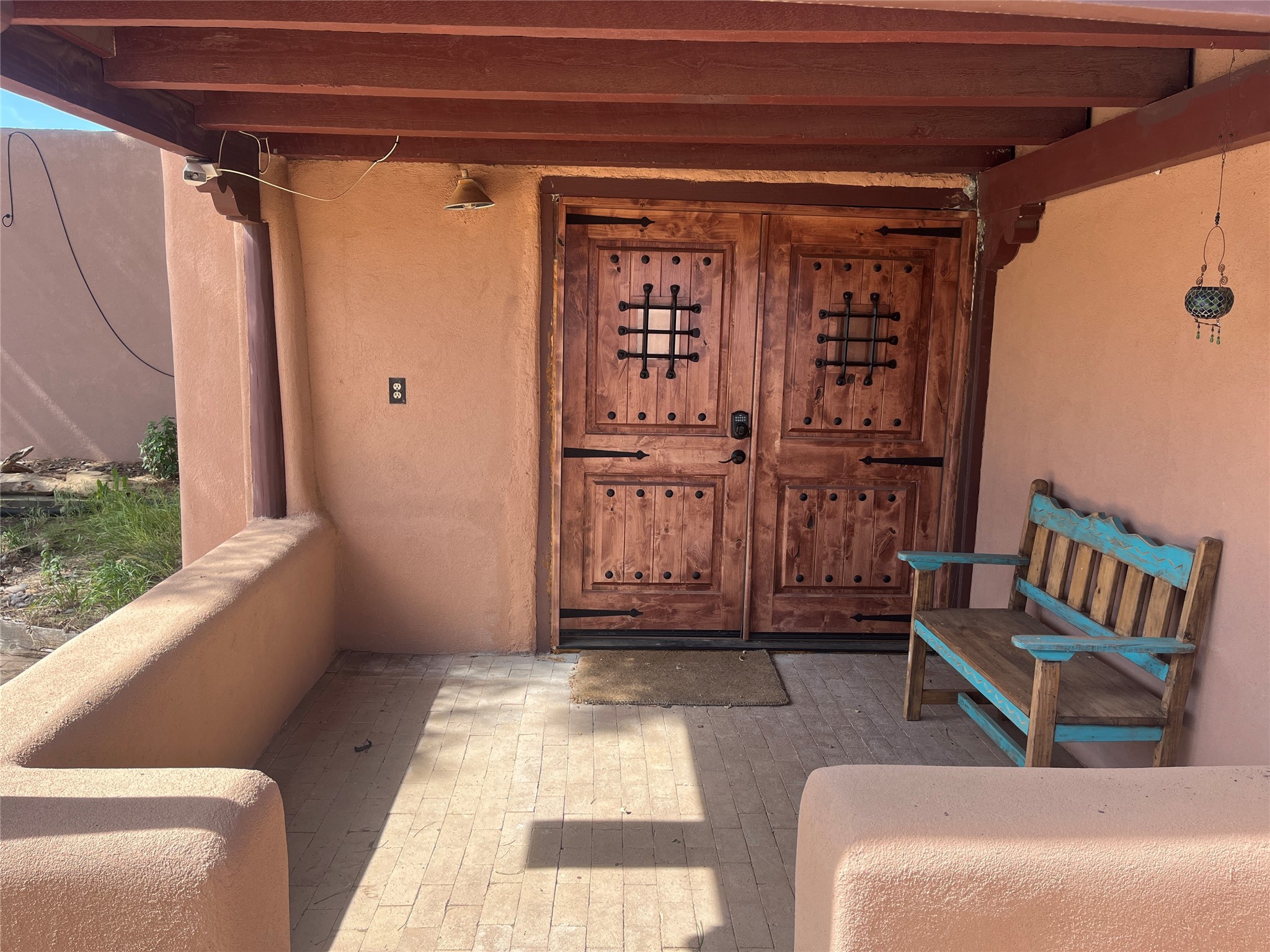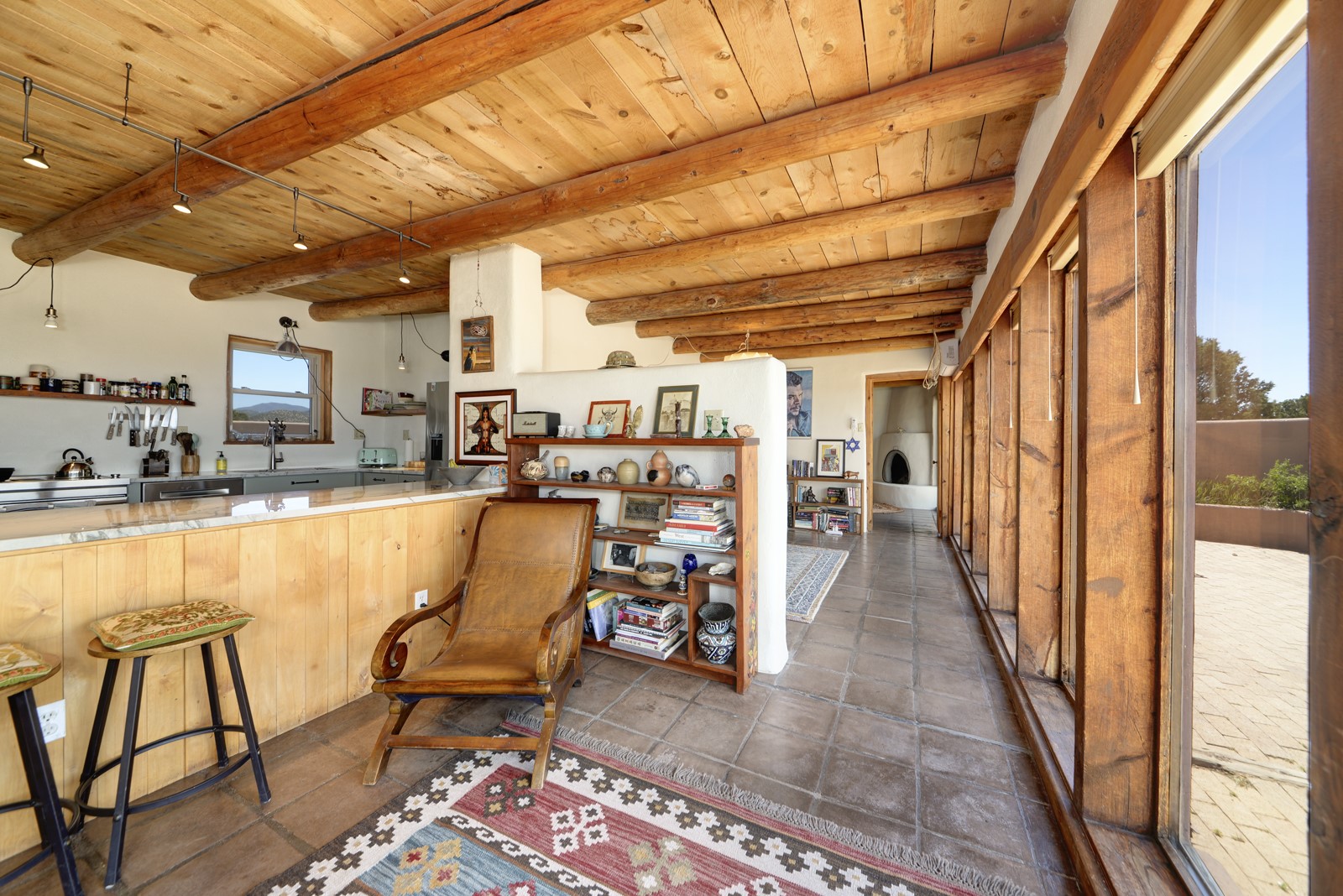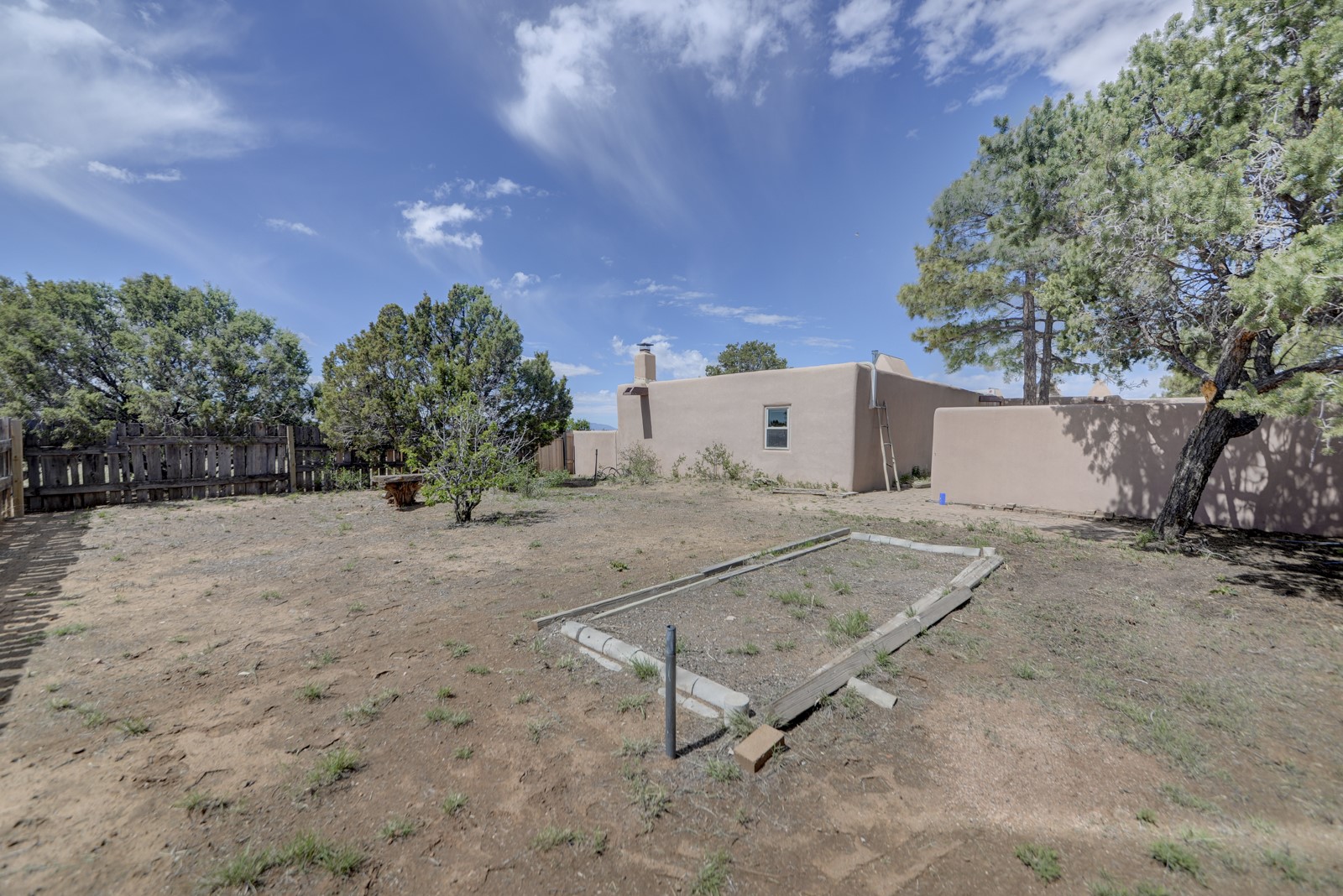 Updated charming ADOBE Passive solar home with a rustic contemporary vibe. It has two bedrooms and an office/bedroom, plus two full bathrooms on a large lot with STUNNING mountain views. The kitchen and both bathrooms were meticulously remodeled in late 2021, featuring sleek, quartz countertops, Fisher/ Paykel refrigerator, JennAir range, and a Bosch dishwasher. In addition, a new TPO roof, hot water tank, and a highly efficient Kuma wood-burning fireplace insert were also added. In 2023, two HVAC mini-split systems were installed, along with six inverters and a new washer/dryer. In 2024, a new hot tub/spa for relaxing and viewing the stellar sunsets, night sky, and bright stars. The primary bedroom features a kiva fireplace, a Trombe wall, and an en-suite bathroom. The bedrooms are on opposite sides of the home with private courtyards. The heated two-car garage has storage shelves and a workbench. The side yard is fully fenced and great for pets. Enjoy miles of walking and biking trails, a community center with a pool, tennis, pickleball courts, and dog parks. El Dorado has its own grocery store, convenience store, post office, gym, clinic, hardware store, senior center, restaurants, etc.. The home is also within blocks of one of the more highly regarded elementary schools in Santa Fe. All within a 15-20 minute drive to Santa Fe.