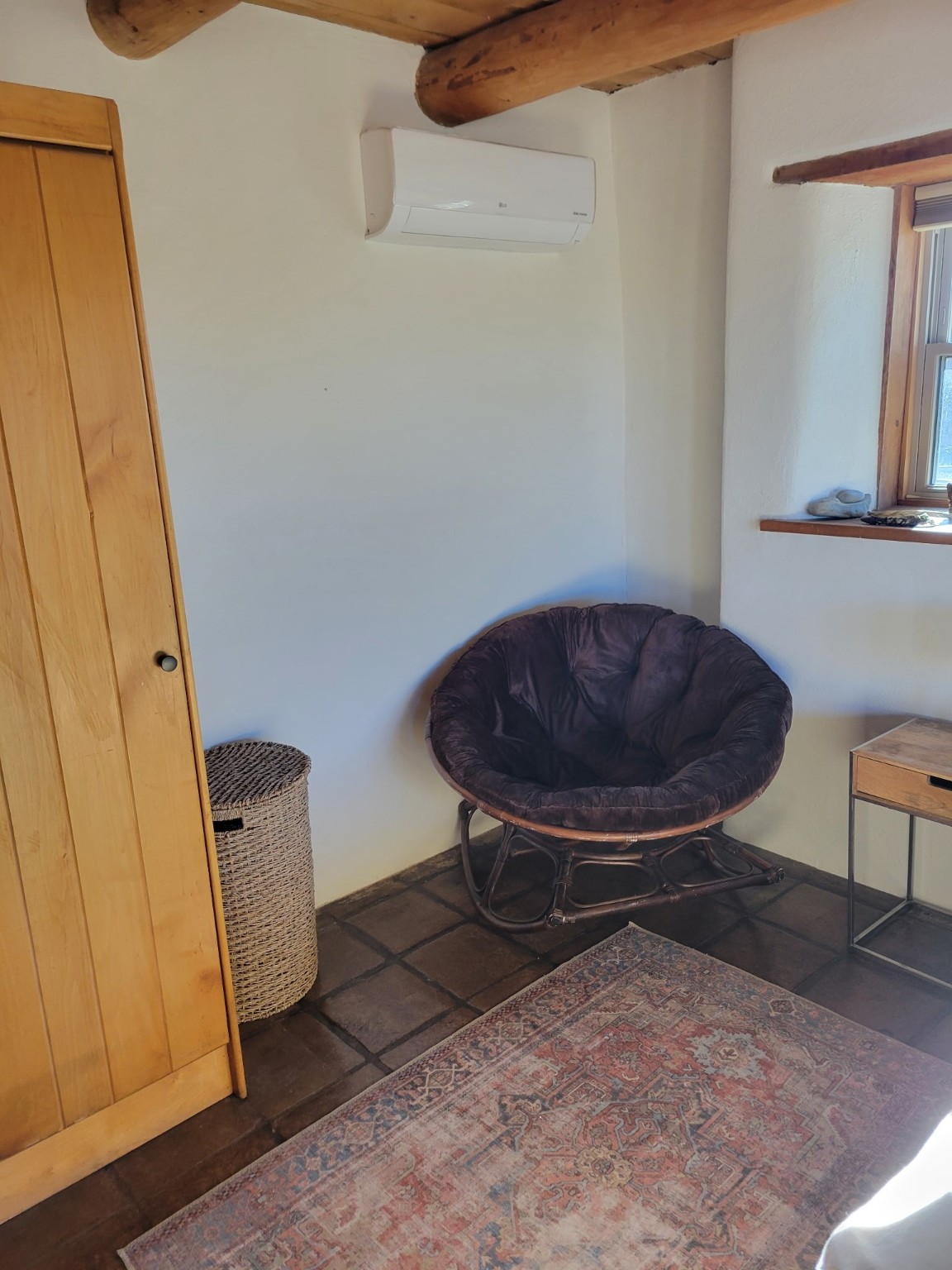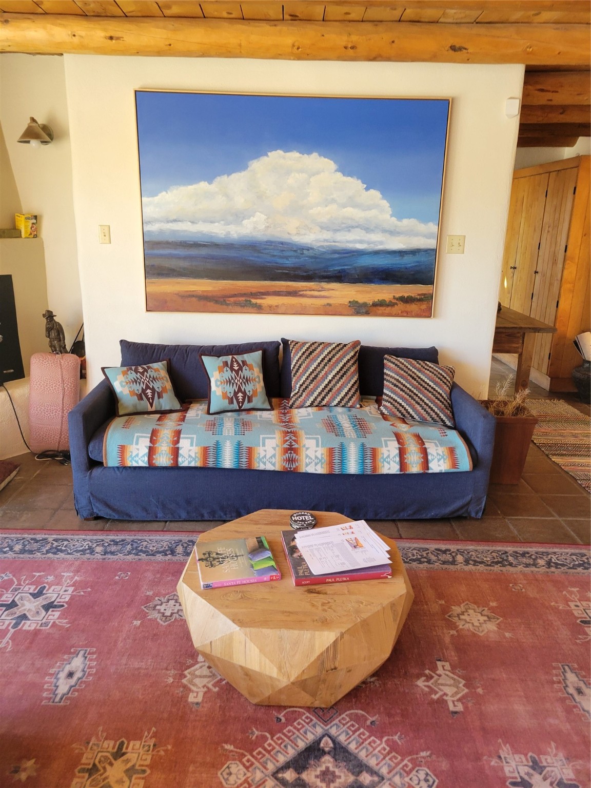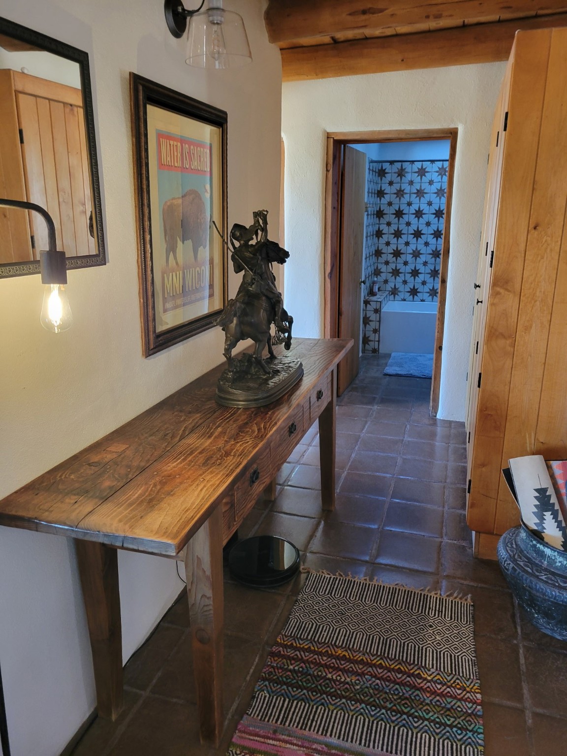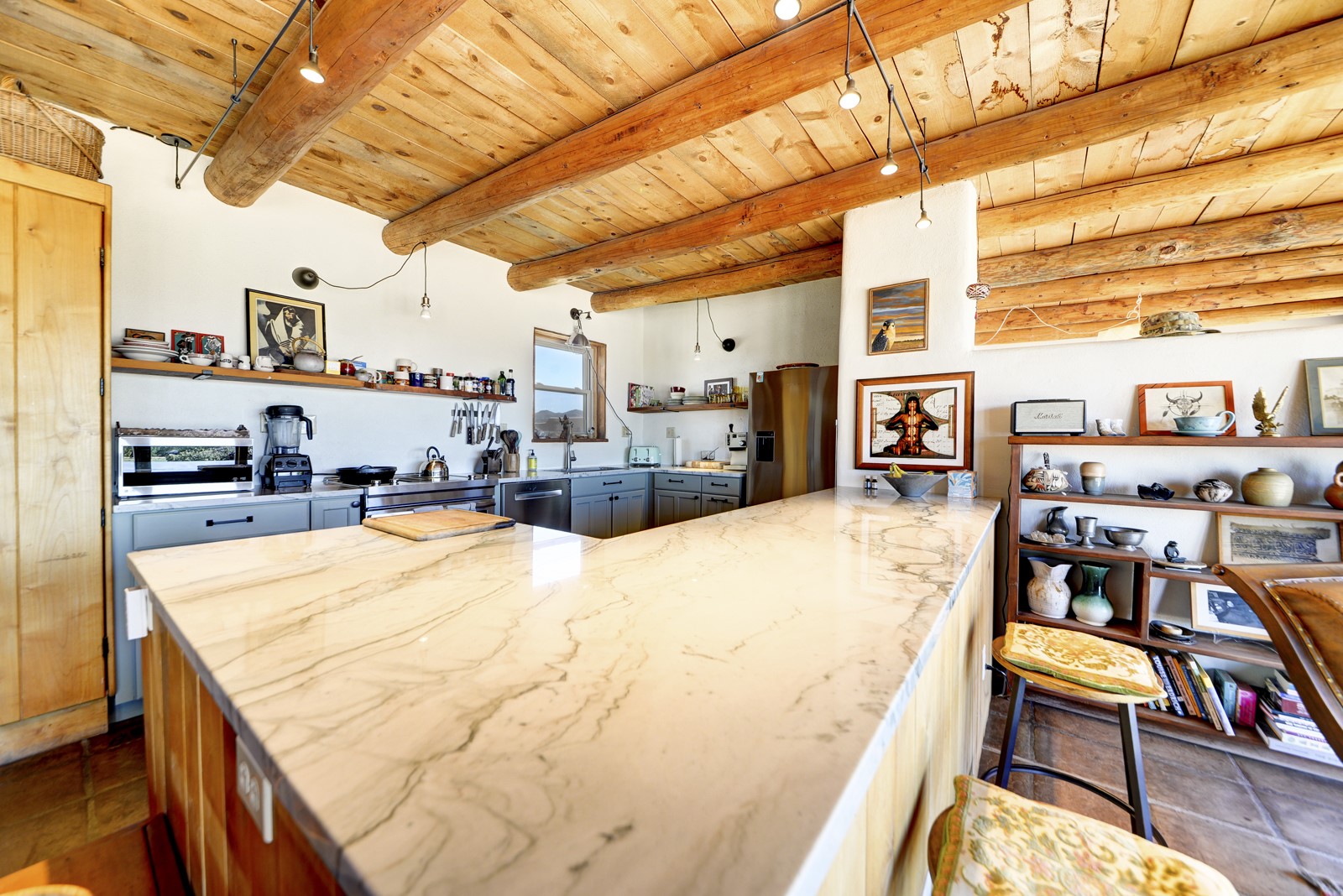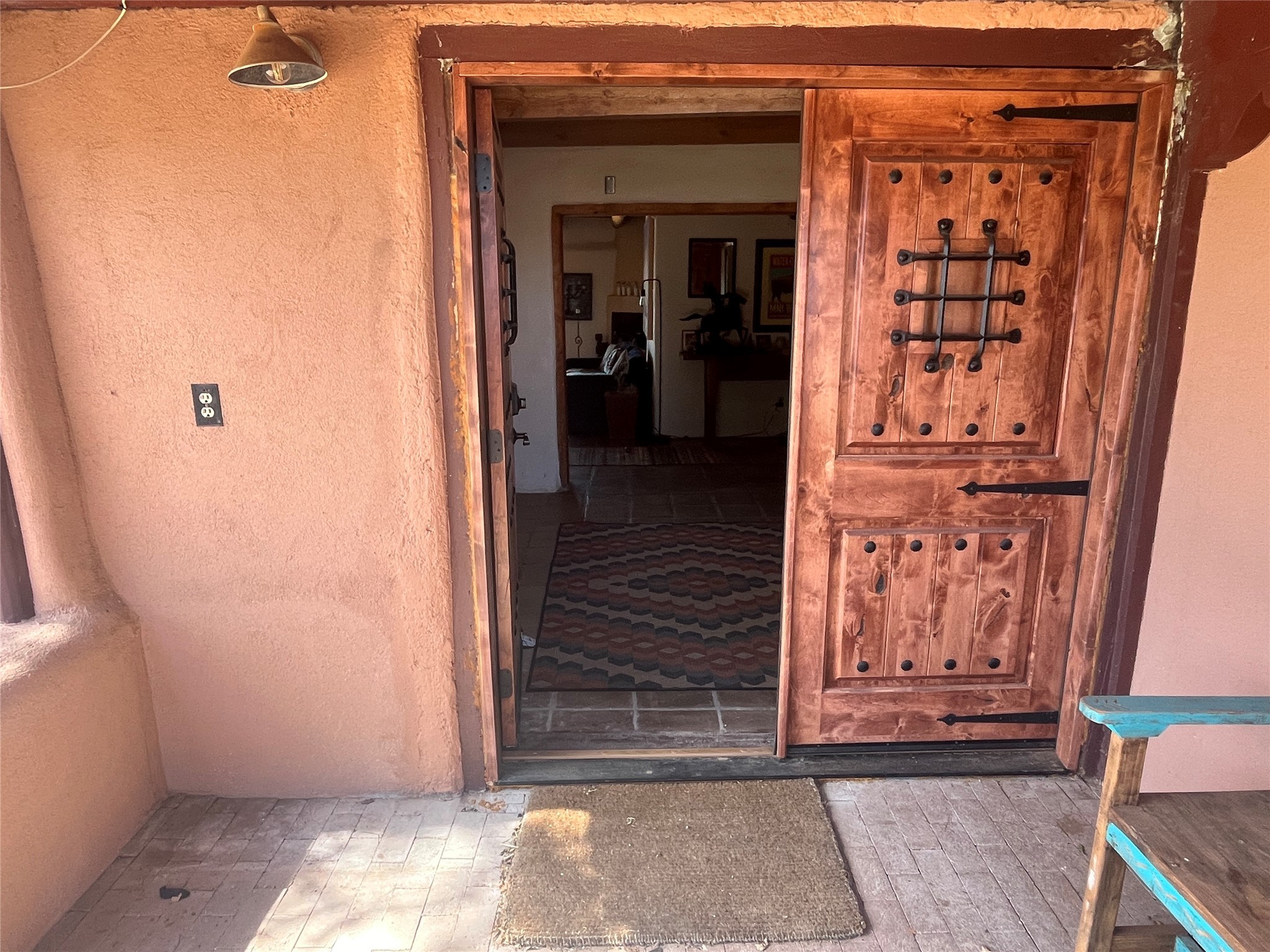 Updated charming ADOBE Passive solar home with a rustic contemporary vibe. It has two bedrooms and an office/bedroom, plus two full bathrooms on a large lot with STUNNING mountain views. The kitchen and both bathrooms were meticulously remodeled in late 2021, featuring sleek, quartz countertops, Fisher/ Paykel refrigerator, JennAir range, and a Bosch dishwasher. In addition, a new TPO roof, hot water tank, and a highly efficient Kuma wood-burning fireplace insert were also added. In 2023, two HVAC mini-split systems were installed, along with six inverters and a new washer/dryer. In 2024, a new hot tub/spa for relaxing and viewing the stellar sunsets, night sky, and bright stars. The primary bedroom features a kiva fireplace, a Trombe wall, and an en-suite bathroom. The bedrooms are on opposite sides of the home with private courtyards. The heated two-car garage has storage shelves and a workbench. The side yard is fully fenced and great for pets. Enjoy miles of walking and biking trails, a community center with a pool, tennis, pickleball courts, and dog parks. El Dorado has its own grocery store, convenience store, post office, gym, clinic, hardware store, senior center, restaurants, etc.. The home is also within blocks of one of the more highly regarded elementary schools in Santa Fe. All within a 15-20 minute drive to Santa Fe.
