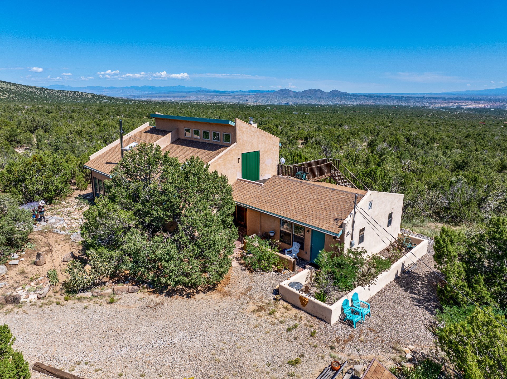 Sited high on the northern slopes of the Ortiz Mountains, this working artist's retreat offers away-from-it-all serenity while still being with an easy commute of Santa Fe. The home and studio is centered on a gently sloping 15.59 acre lot that offers space for gardening, horses, other animals, or outbuildings. The home features three bedrooms and two full baths, with soaring ceilings in the living room and kitchen, and a primary bedroom on the second floor with rooftop deck. Brick and wood floors, wood ceilings, and an interior adobe wall exude warmth. Outside, a north facing patio takes in breathtaking views across the Galisteo Basin to the Sangre de Cristo's. The attached artist's studio has its own entrance and bathroom, and could easily be converted back to its previous use as a guest house if additional living space or rental income was desired. Two storage sheds are on the lot, including a large and sturdy shed that could be used as shop space or more studio space. Connected to public electric, with fast internet and a good well. The property also has a Bed and Breakfast license from Santa Fe County. Owner will offer a $25,000 credit to replace shingle roof with metal roofing, and may offer owner financing with substantial down. 20 miles to the south side of Santa Fe, 57 miles to the Albuquerque airport, and near dining and entertainment opportunities in Madrid and Cerrillos. Accepting back up offers.