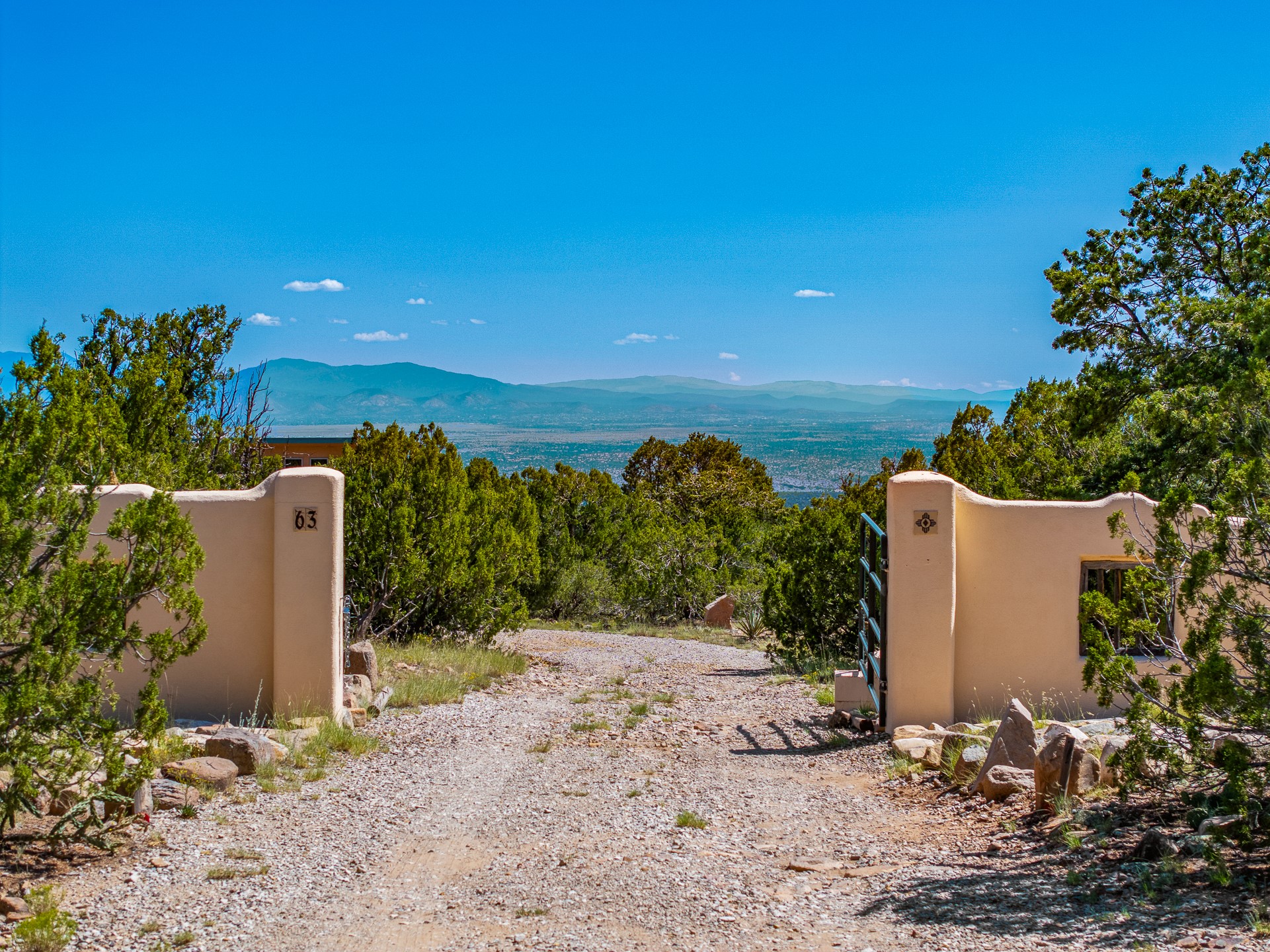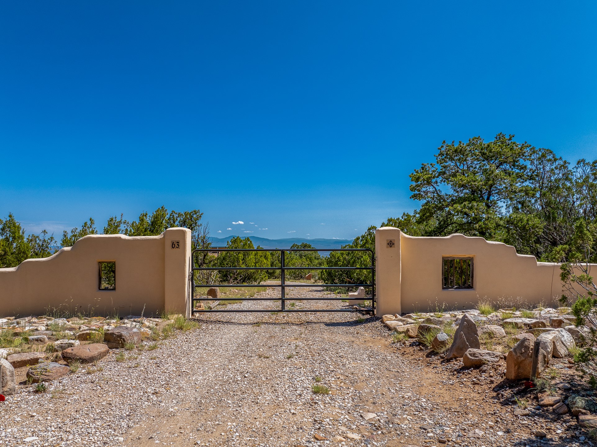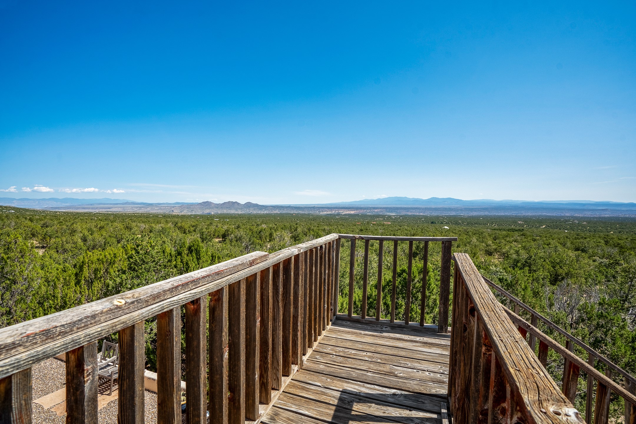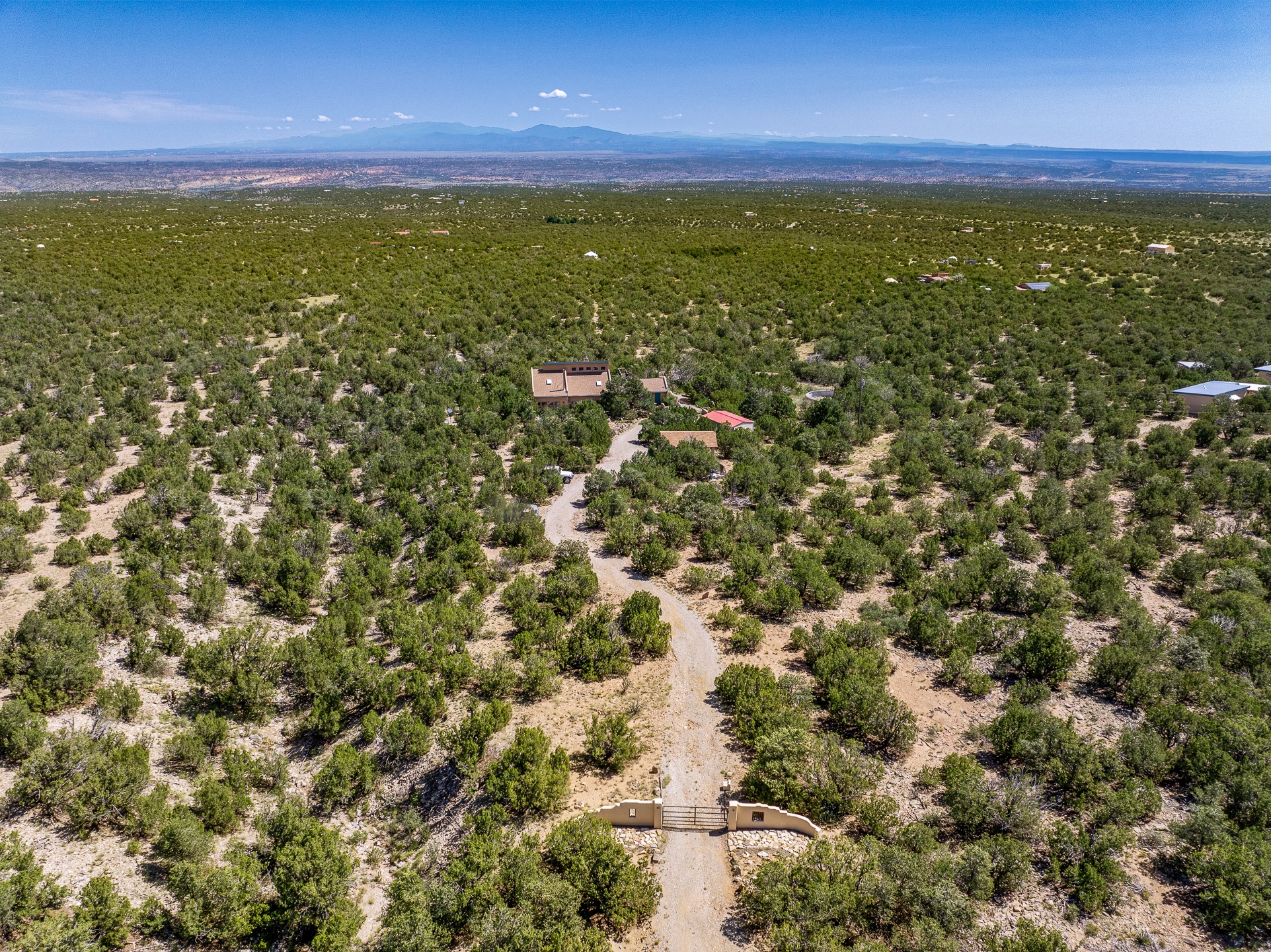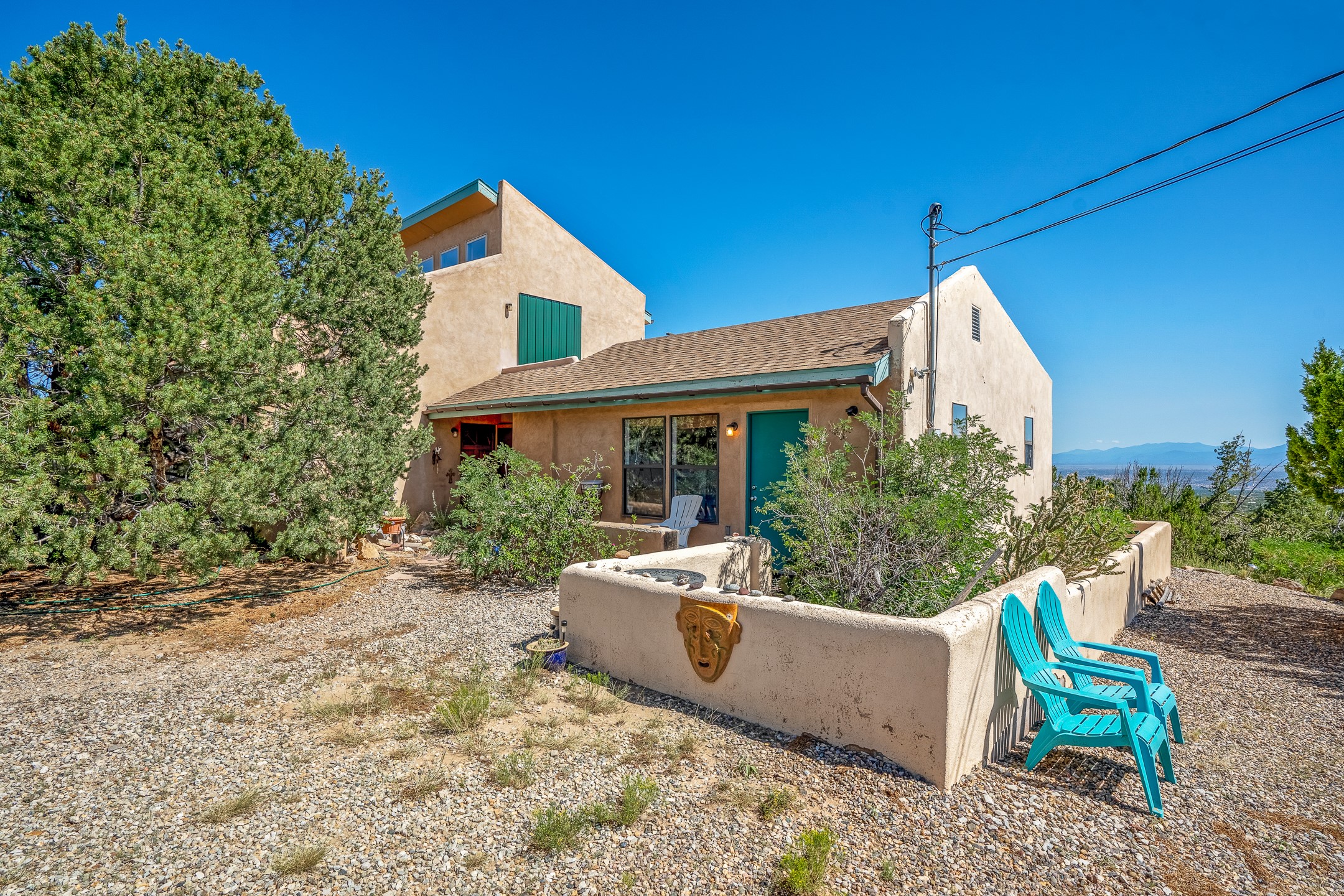 Sited high on the northern slopes of the Ortiz Mountains, this working artist's retreat offers away-from-it-all serenity while still being with an easy commute of Santa Fe. The home and studio is centered on a gently sloping 15.59 acre lot that offers space for gardening, horses, other animals, or outbuildings. The home features three bedrooms and two full baths, with soaring ceilings in the living room and kitchen, and a primary bedroom on the second floor with rooftop deck. Brick and wood floors, wood ceilings, and an interior adobe wall exude warmth. Outside, a north facing patio takes in breathtaking views across the Galisteo Basin to the Sangre de Cristo's. The attached artist's studio has its own entrance and bathroom, and could easily be converted back to its previous use as a guest house if additional living space or rental income was desired. Two storage sheds are on the lot, including a large and sturdy shed that could be used as shop space or more studio space. Connected to public electric, with fast internet and a good well. The property also has a Bed and Breakfast license from Santa Fe County. Owner will offer a $25,000 credit to replace shingle roof with metal roofing, and may offer owner financing with substantial down. 20 miles to the south side of Santa Fe, 57 miles to the Albuquerque airport, and near dining and entertainment opportunities in Madrid and Cerrillos. Accepting back up offers.