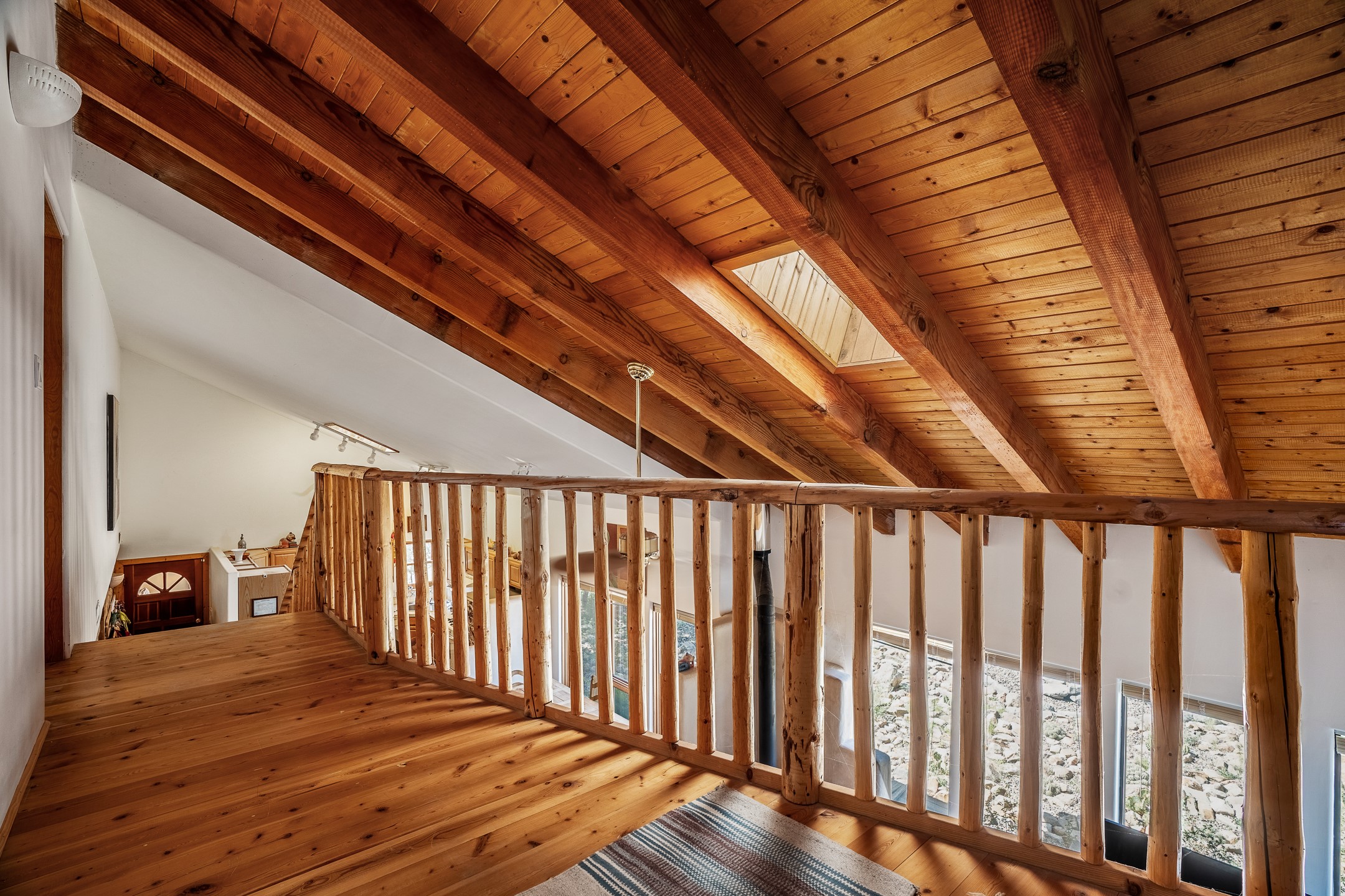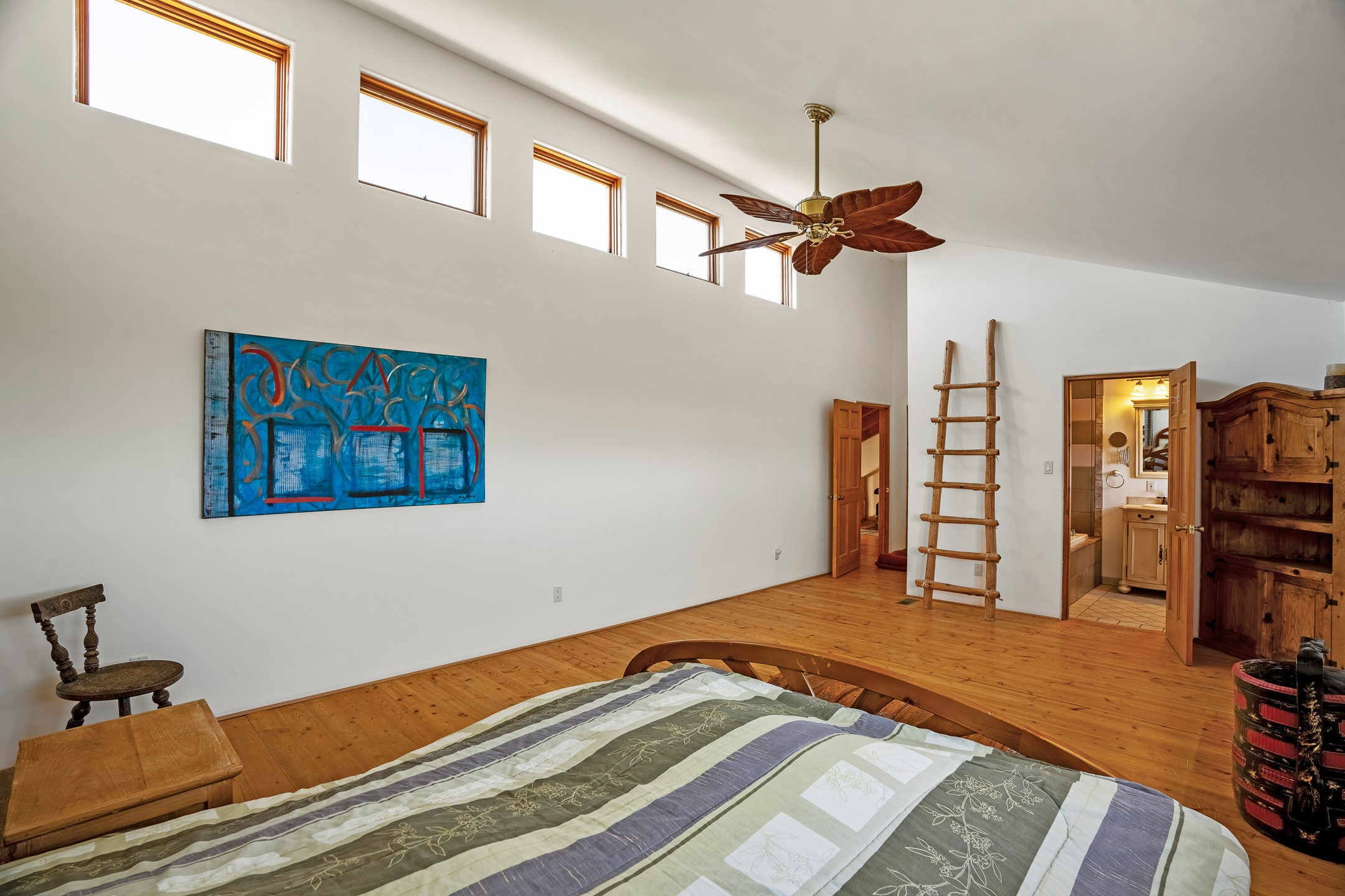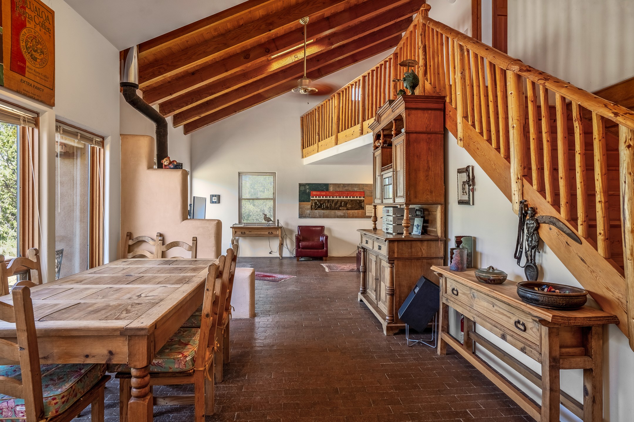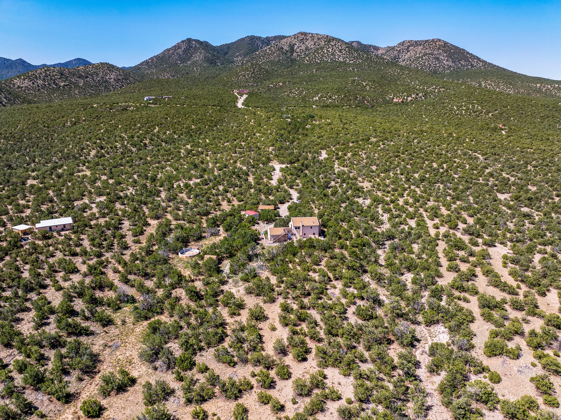 Sited high on the northern slopes of the Ortiz Mountains, this working artist's retreat offers away-from-it-all serenity while still being with an easy commute of Santa Fe. The home and studio is centered on a gently sloping 15.59 acre lot that offers space for gardening, horses, other animals, or outbuildings. The home features three bedrooms and two full baths, with soaring ceilings in the living room and kitchen, and a primary bedroom on the second floor with rooftop deck. Brick and wood floors, wood ceilings, and an interior adobe wall exude warmth. Outside, a north facing patio takes in breathtaking views across the Galisteo Basin to the Sangre de Cristo's. The attached artist's studio has its own entrance and bathroom, and could easily be converted back to its previous use as a guest house if additional living space or rental income was desired. Two storage sheds are on the lot, including a large and sturdy shed that could be used as shop space or more studio space. Connected to public electric, with fast internet and a good well. The property also has a Bed and Breakfast license from Santa Fe County. Owner will offer a $25,000 credit to replace shingle roof with metal roofing, and may offer owner financing with substantial down. 20 miles to the south side of Santa Fe, 57 miles to the Albuquerque airport, and near dining and entertainment opportunities in Madrid and Cerrillos. Accepting back up offers.