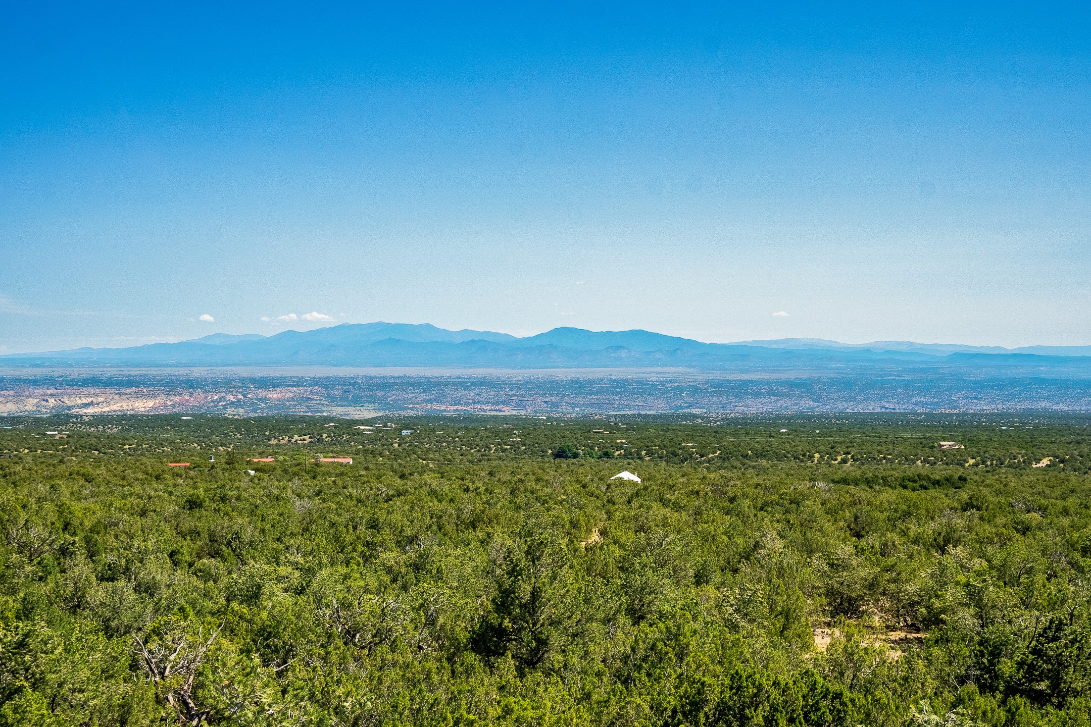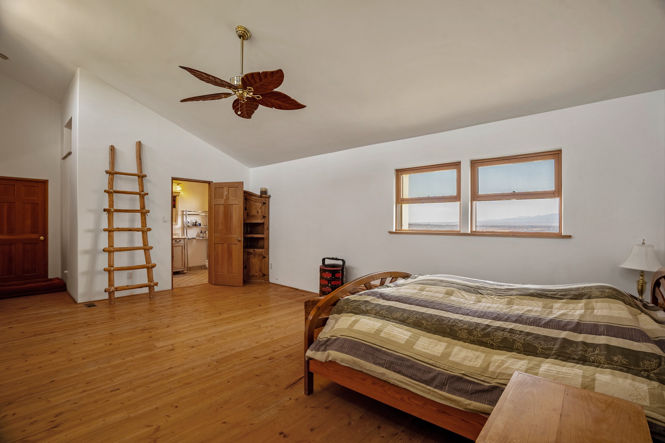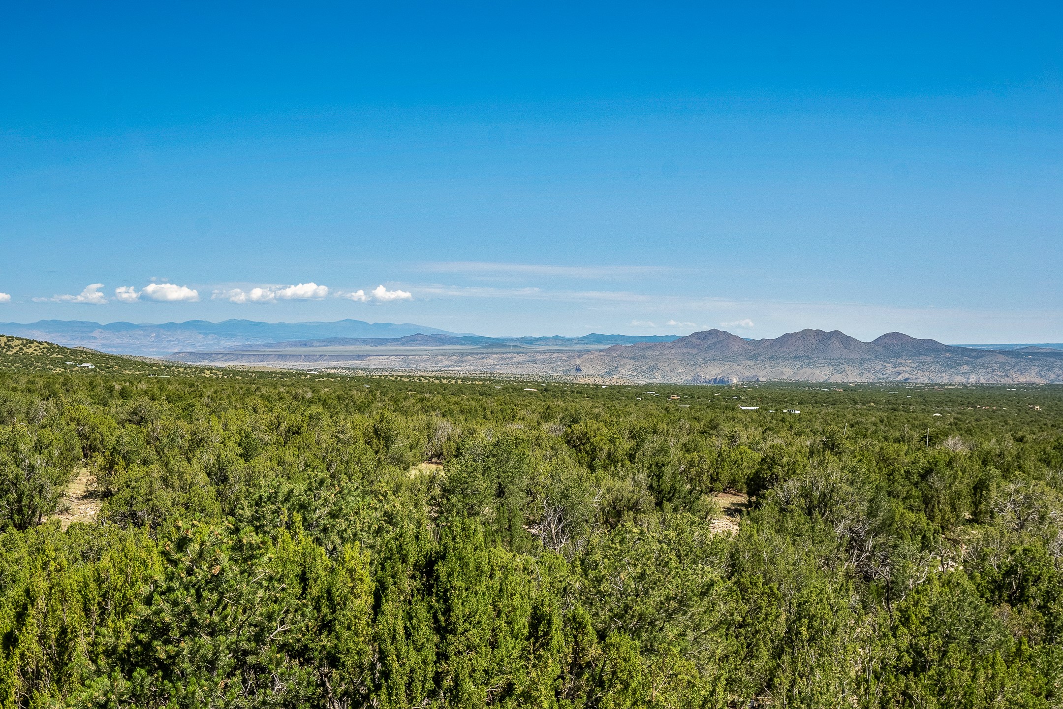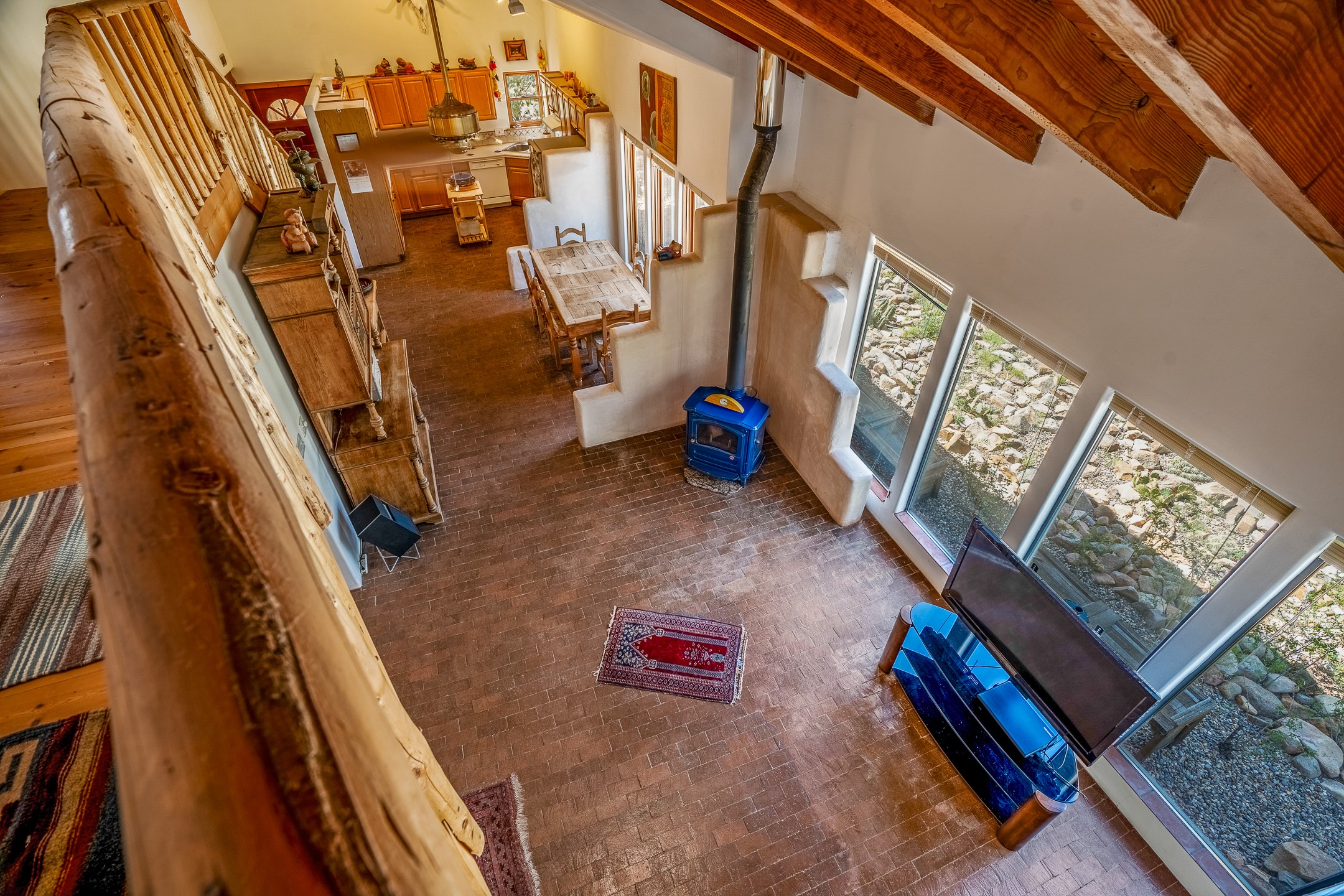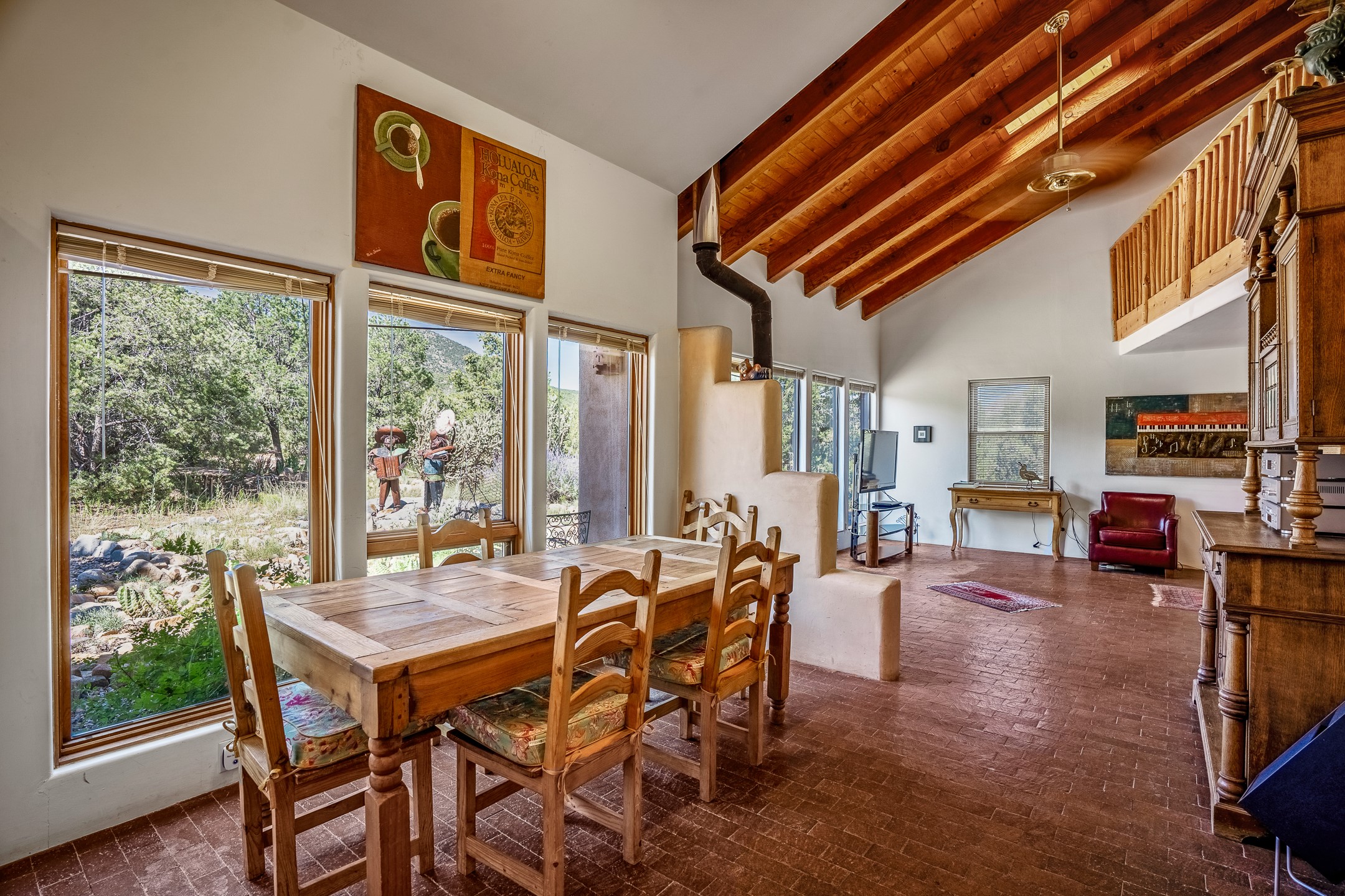 Sited high on the northern slopes of the Ortiz Mountains, this working artist's retreat offers away-from-it-all serenity while still being with an easy commute of Santa Fe. The home and studio is centered on a gently sloping 15.59 acre lot that offers space for gardening, horses, other animals, or outbuildings. The home features three bedrooms and two full baths, with soaring ceilings in the living room and kitchen, and a primary bedroom on the second floor with rooftop deck. Brick and wood floors, wood ceilings, and an interior adobe wall exude warmth. Outside, a north facing patio takes in breathtaking views across the Galisteo Basin to the Sangre de Cristo's. The attached artist's studio has its own entrance and bathroom, and could easily be converted back to its previous use as a guest house if additional living space or rental income was desired. Two storage sheds are on the lot, including a large and sturdy shed that could be used as shop space or more studio space. Connected to public electric, with fast internet and a good well. The property also has a Bed and Breakfast license from Santa Fe County. Owner will offer a $25,000 credit to replace shingle roof with metal roofing, and may offer owner financing with substantial down. 20 miles to the south side of Santa Fe, 57 miles to the Albuquerque airport, and near dining and entertainment opportunities in Madrid and Cerrillos. Accepting back up offers.