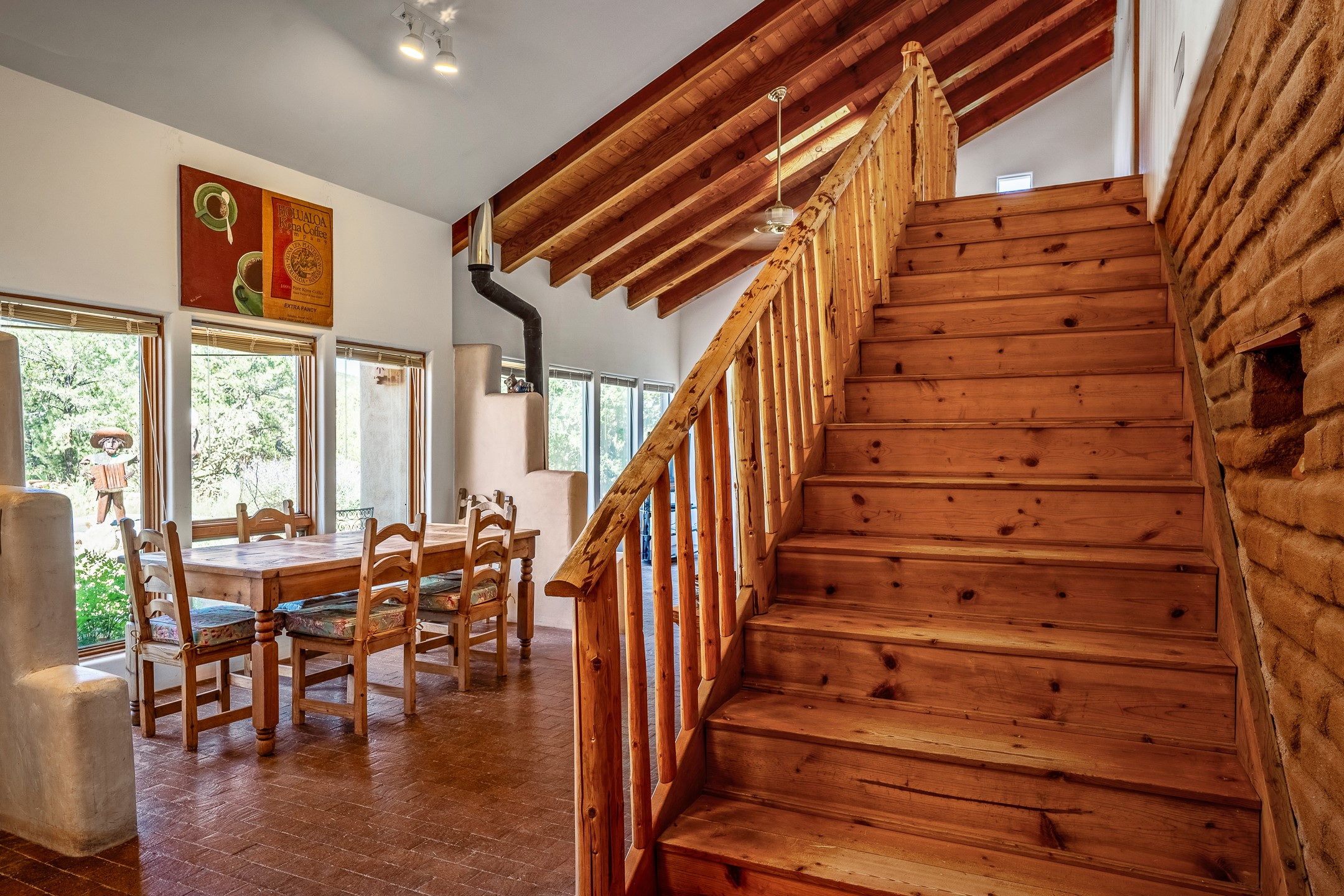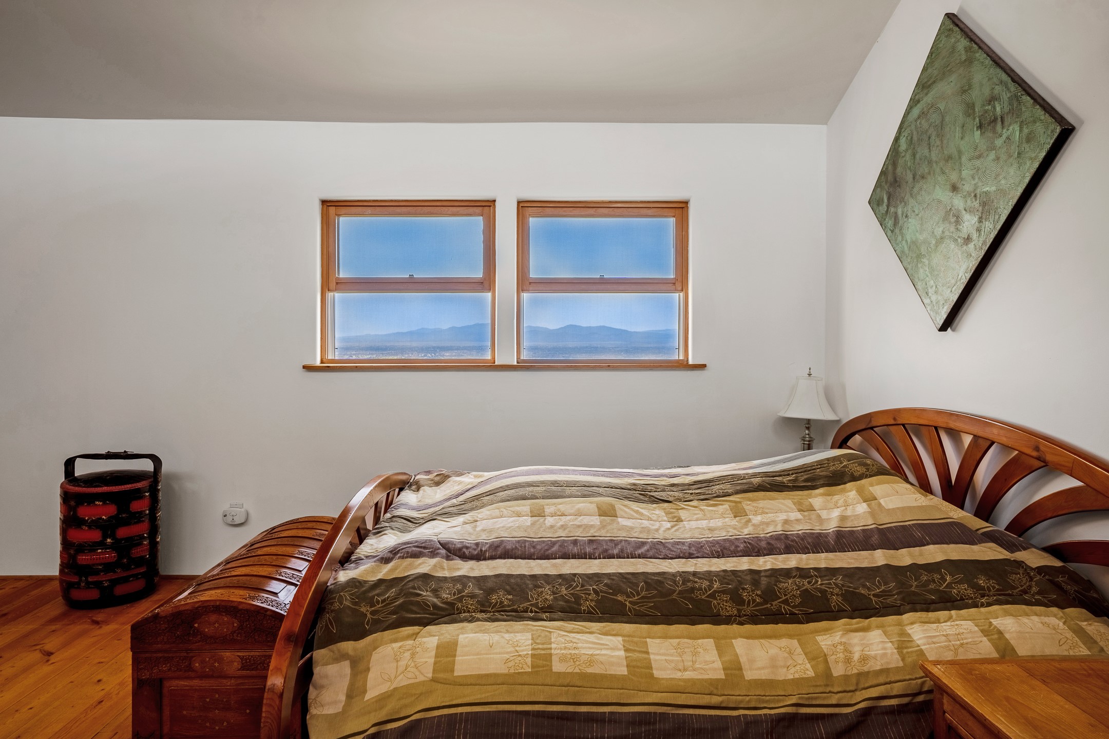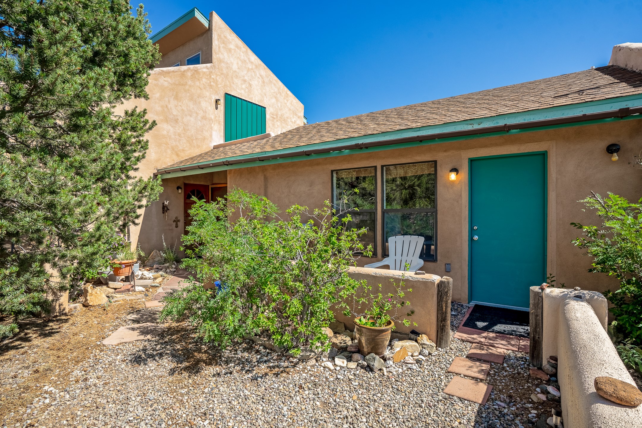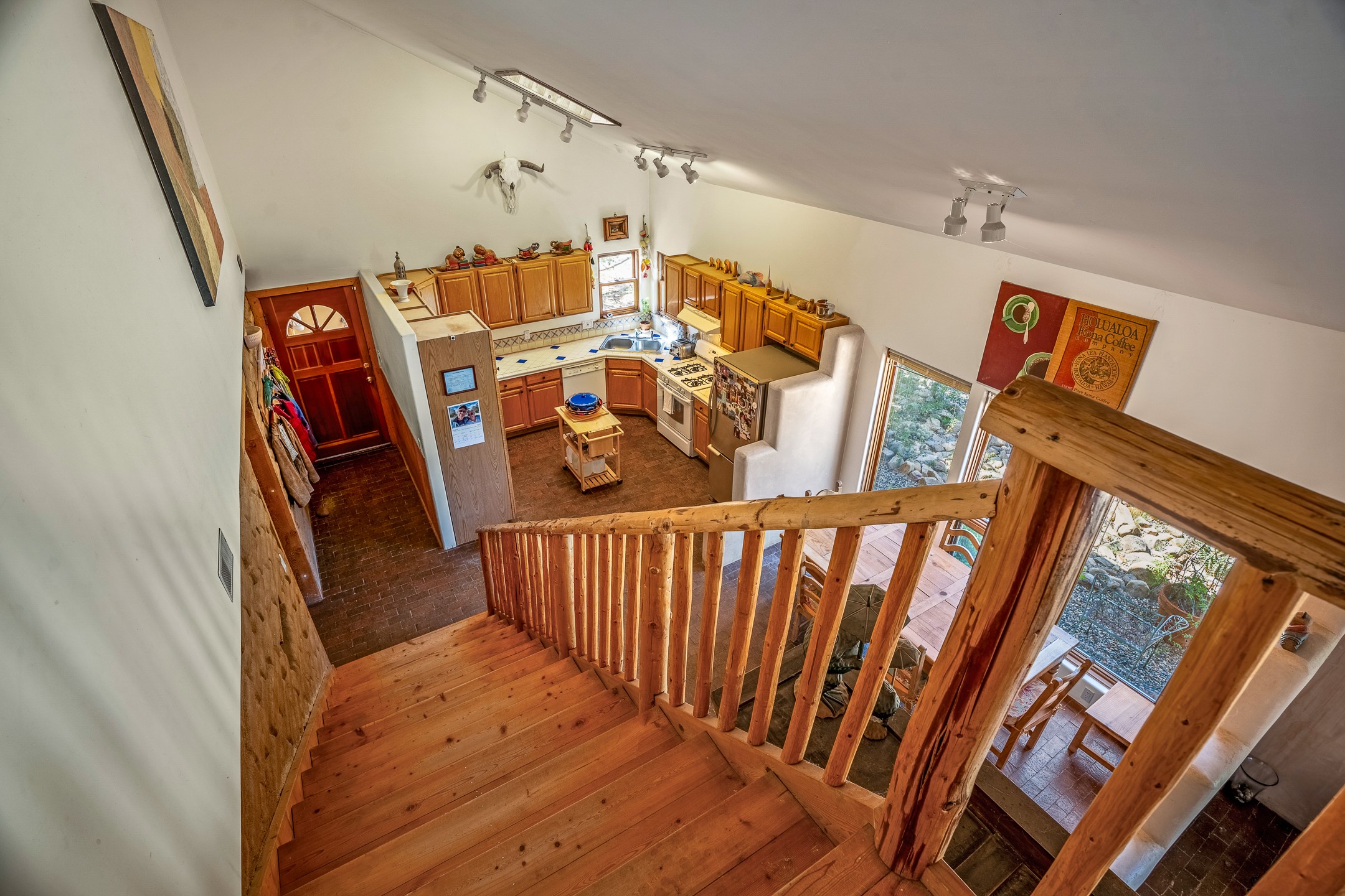 Sited high on the northern slopes of the Ortiz Mountains, this working artist's retreat offers away-from-it-all serenity while still being with an easy commute of Santa Fe. The home and studio is centered on a gently sloping 15.59 acre lot that offers space for gardening, horses, other animals, or outbuildings. The home features three bedrooms and two full baths, with soaring ceilings in the living room and kitchen, and a primary bedroom on the second floor with rooftop deck. Brick and wood floors, wood ceilings, and an interior adobe wall exude warmth. Outside, a north facing patio takes in breathtaking views across the Galisteo Basin to the Sangre de Cristo's. The attached artist's studio has its own entrance and bathroom, and could easily be converted back to its previous use as a guest house if additional living space or rental income was desired. Two storage sheds are on the lot, including a large and sturdy shed that could be used as shop space or more studio space. Connected to public electric, with fast internet and a good well. The property also has a Bed and Breakfast license from Santa Fe County. Owner will offer a $25,000 credit to replace shingle roof with metal roofing, and may offer owner financing with substantial down. 20 miles to the south side of Santa Fe, 57 miles to the Albuquerque airport, and near dining and entertainment opportunities in Madrid and Cerrillos. Accepting back up offers.