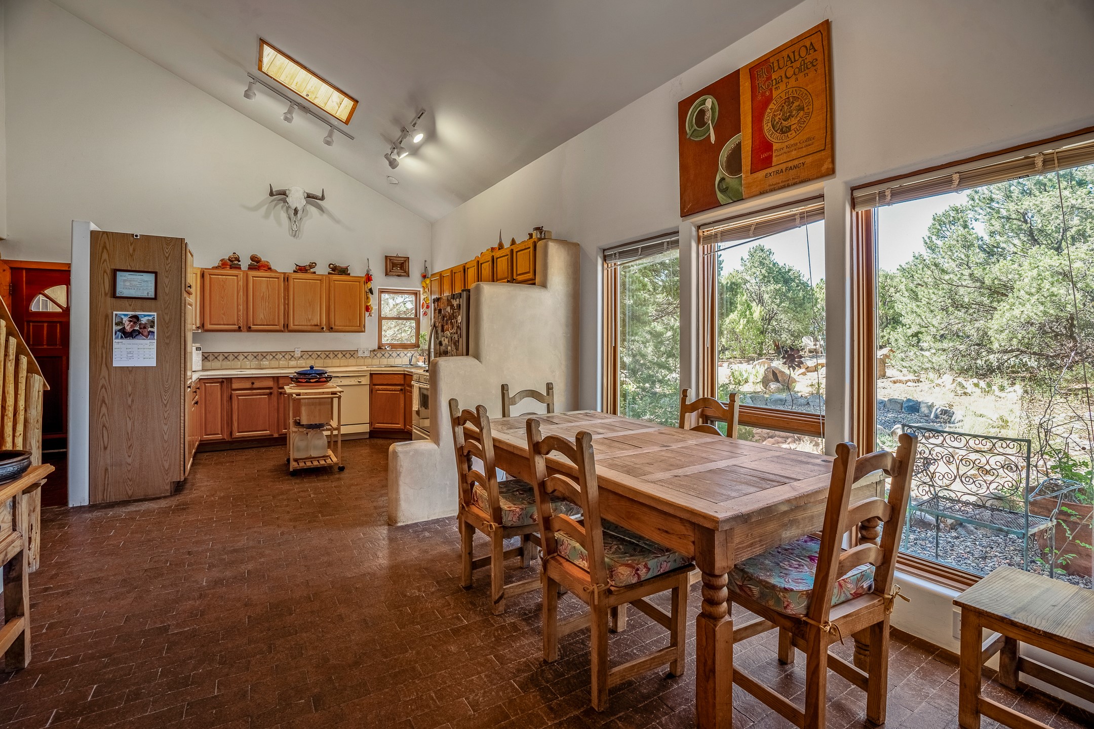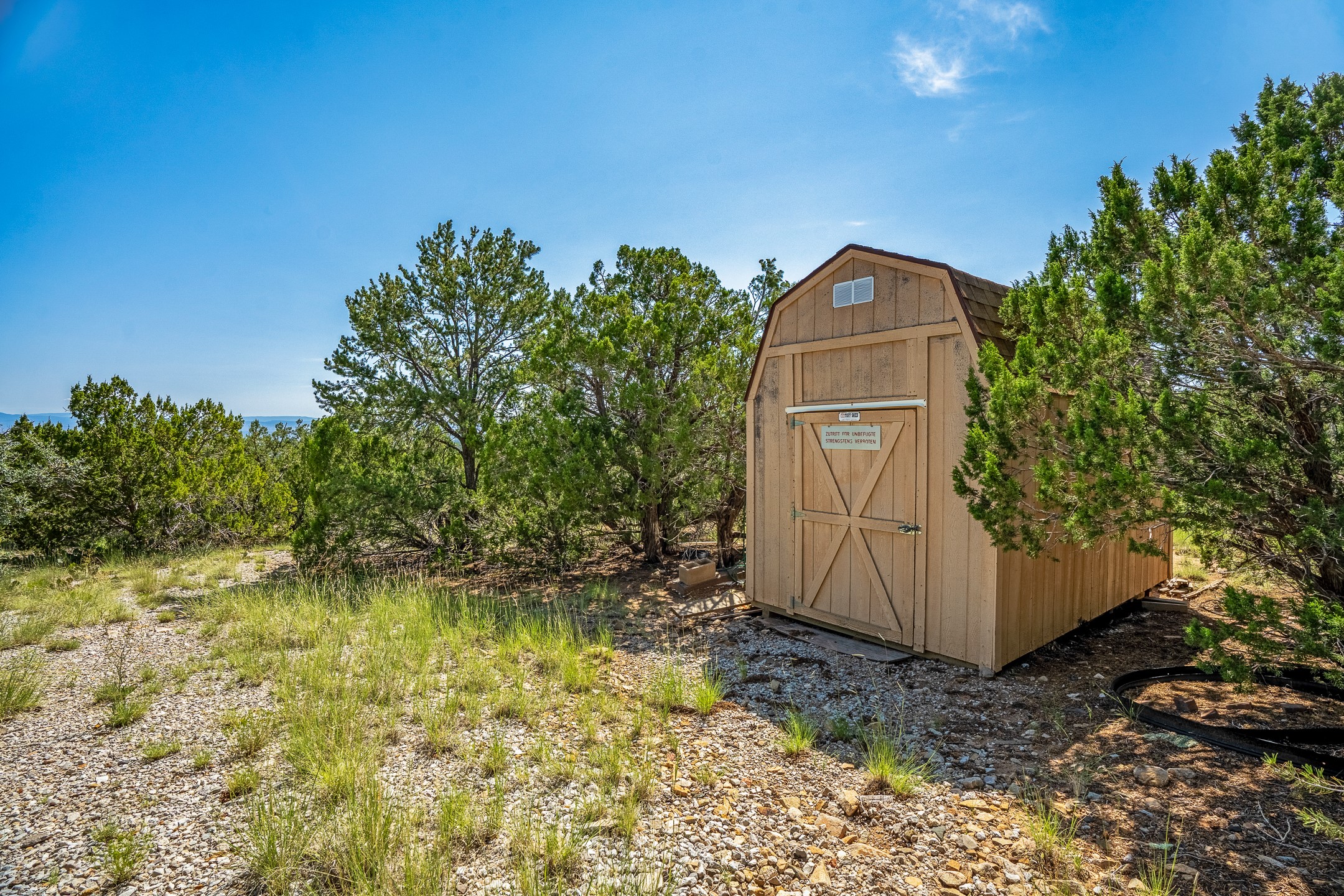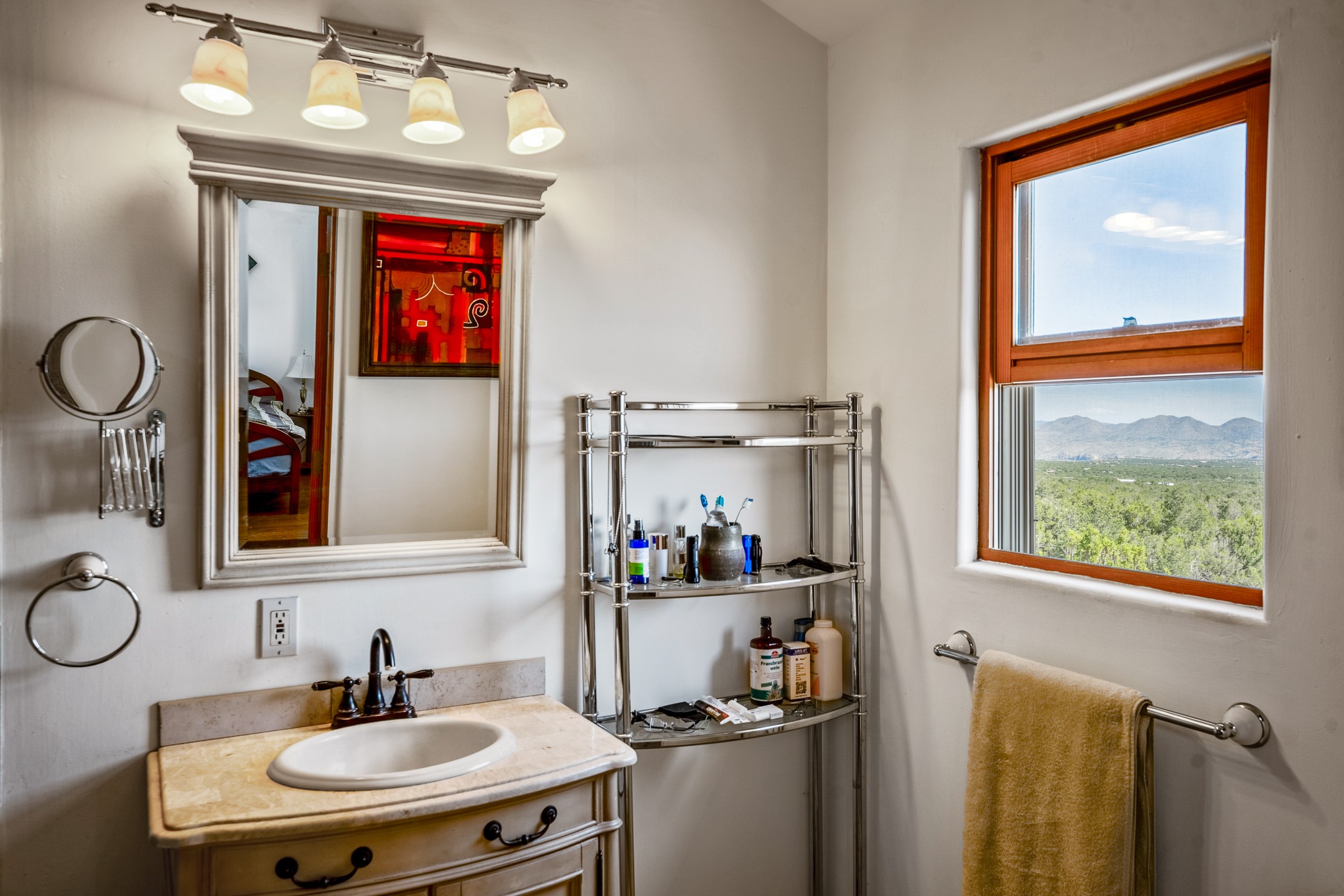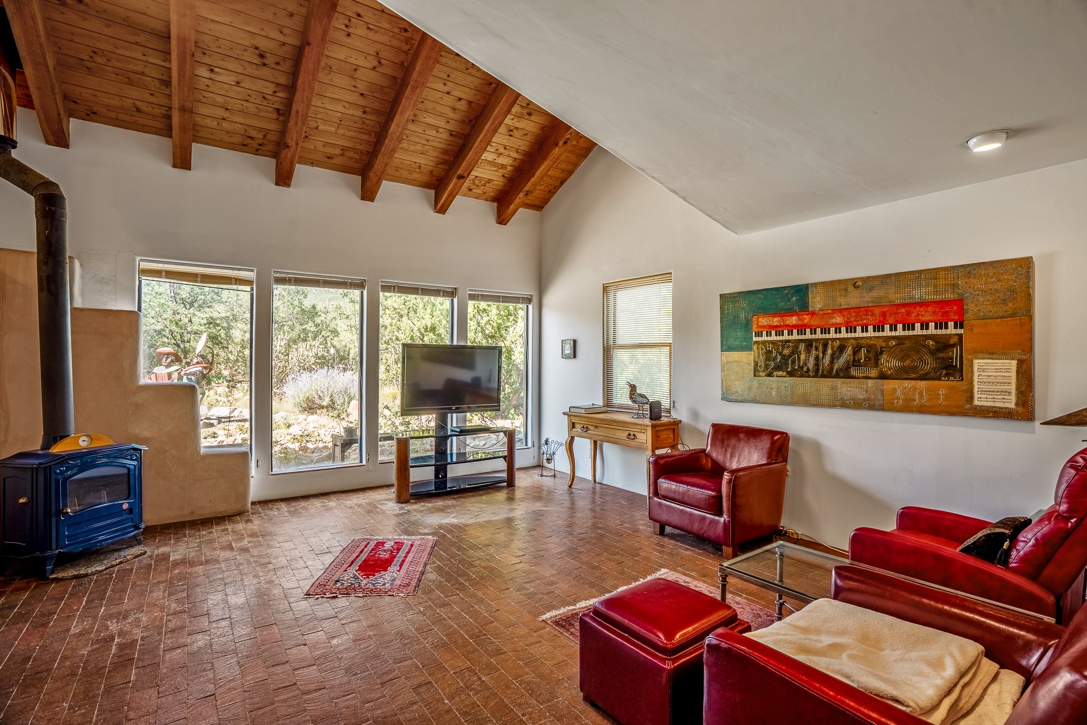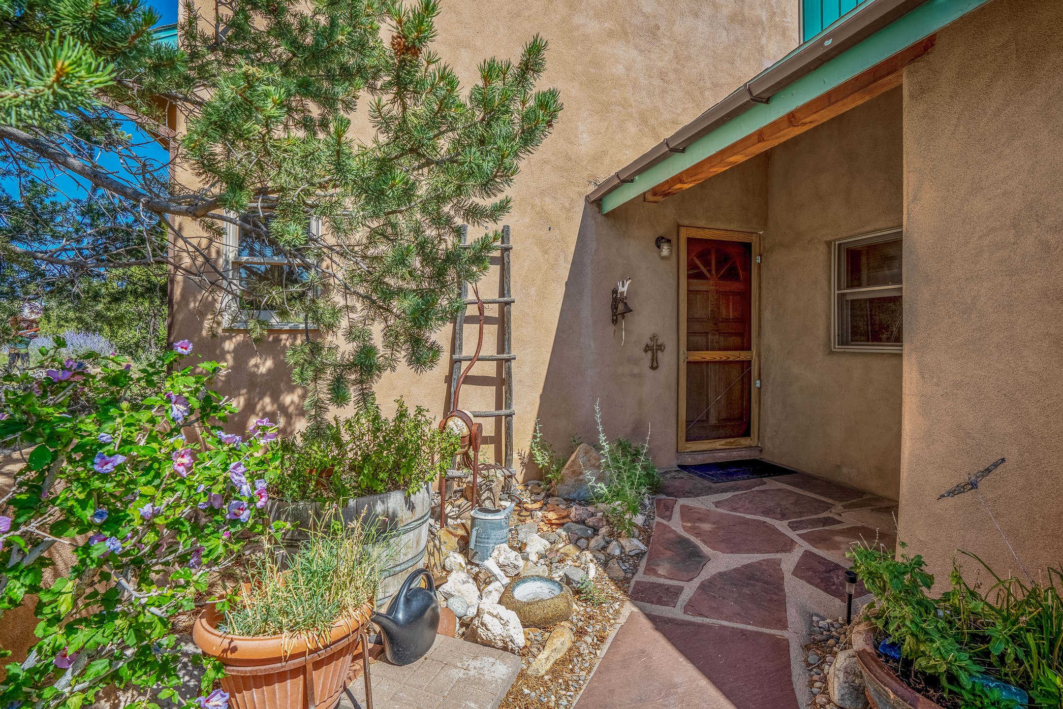 Sited high on the northern slopes of the Ortiz Mountains, this working artist's retreat offers away-from-it-all serenity while still being with an easy commute of Santa Fe. The home and studio is centered on a gently sloping 15.59 acre lot that offers space for gardening, horses, other animals, or outbuildings. The home features three bedrooms and two full baths, with soaring ceilings in the living room and kitchen, and a primary bedroom on the second floor with rooftop deck. Brick and wood floors, wood ceilings, and an interior adobe wall exude warmth. Outside, a north facing patio takes in breathtaking views across the Galisteo Basin to the Sangre de Cristo's. The attached artist's studio has its own entrance and bathroom, and could easily be converted back to its previous use as a guest house if additional living space or rental income was desired. Two storage sheds are on the lot, including a large and sturdy shed that could be used as shop space or more studio space. Connected to public electric, with fast internet and a good well. The property also has a Bed and Breakfast license from Santa Fe County. Owner will offer a $25,000 credit to replace shingle roof with metal roofing, and may offer owner financing with substantial down. 20 miles to the south side of Santa Fe, 57 miles to the Albuquerque airport, and near dining and entertainment opportunities in Madrid and Cerrillos. Accepting back up offers.