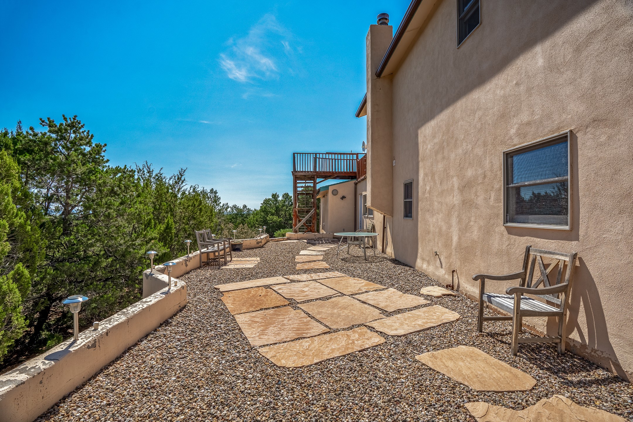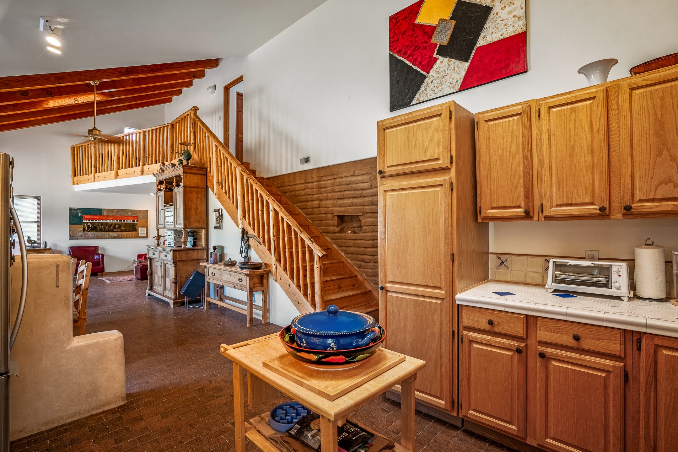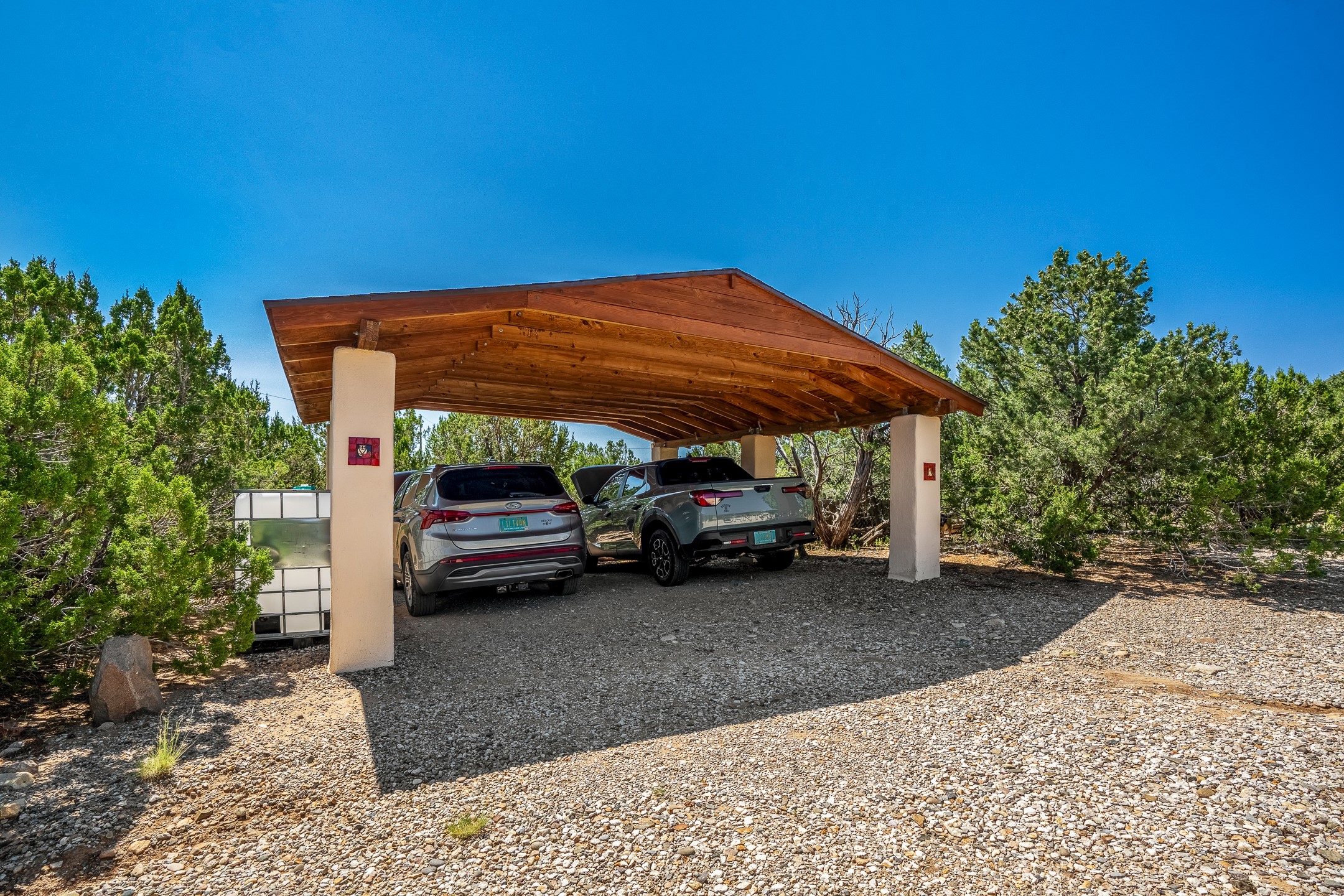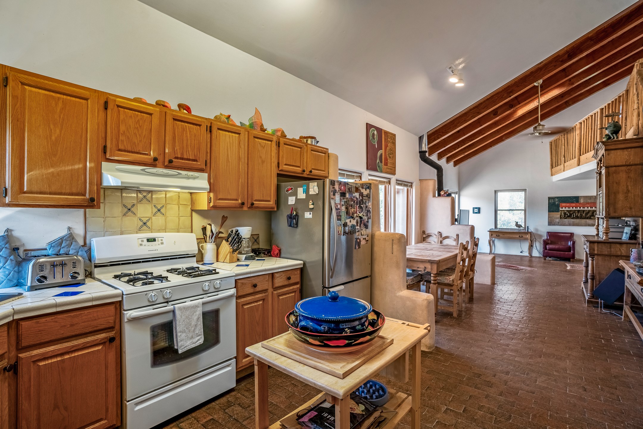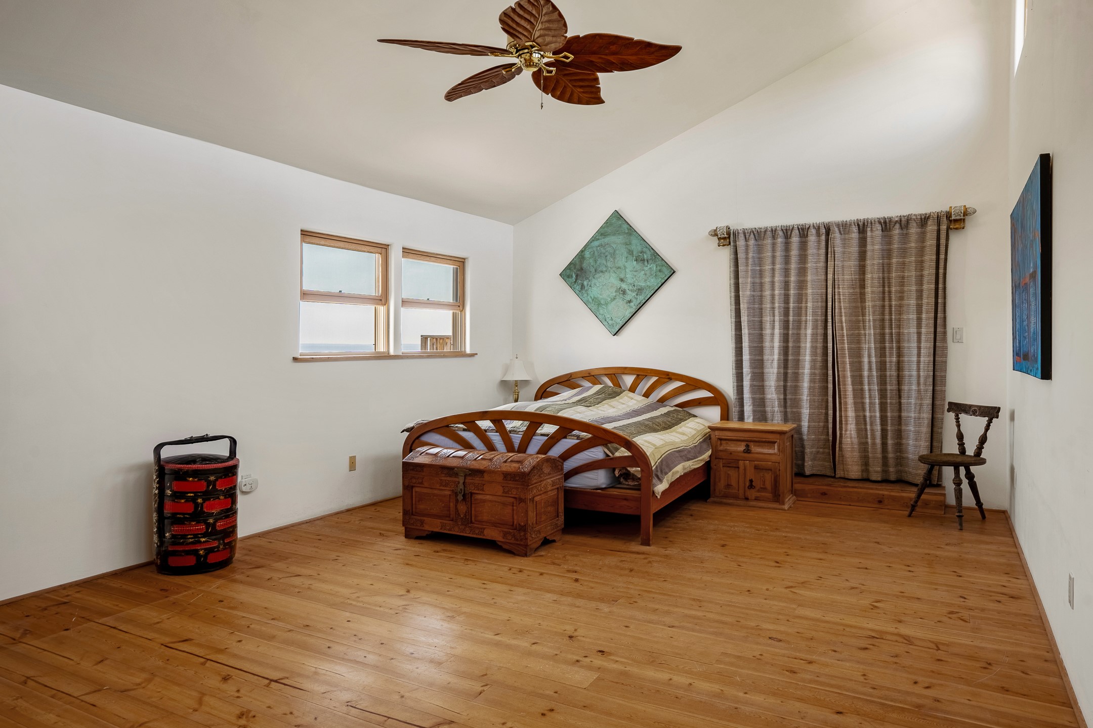 Sited high on the northern slopes of the Ortiz Mountains, this working artist's retreat offers away-from-it-all serenity while still being with an easy commute of Santa Fe. The home and studio is centered on a gently sloping 15.59 acre lot that offers space for gardening, horses, other animals, or outbuildings. The home features three bedrooms and two full baths, with soaring ceilings in the living room and kitchen, and a primary bedroom on the second floor with rooftop deck. Brick and wood floors, wood ceilings, and an interior adobe wall exude warmth. Outside, a north facing patio takes in breathtaking views across the Galisteo Basin to the Sangre de Cristo's. The attached artist's studio has its own entrance and bathroom, and could easily be converted back to its previous use as a guest house if additional living space or rental income was desired. Two storage sheds are on the lot, including a large and sturdy shed that could be used as shop space or more studio space. Connected to public electric, with fast internet and a good well. The property also has a Bed and Breakfast license from Santa Fe County. Owner will offer a $25,000 credit to replace shingle roof with metal roofing, and may offer owner financing with substantial down. 20 miles to the south side of Santa Fe, 57 miles to the Albuquerque airport, and near dining and entertainment opportunities in Madrid and Cerrillos. Accepting back up offers.