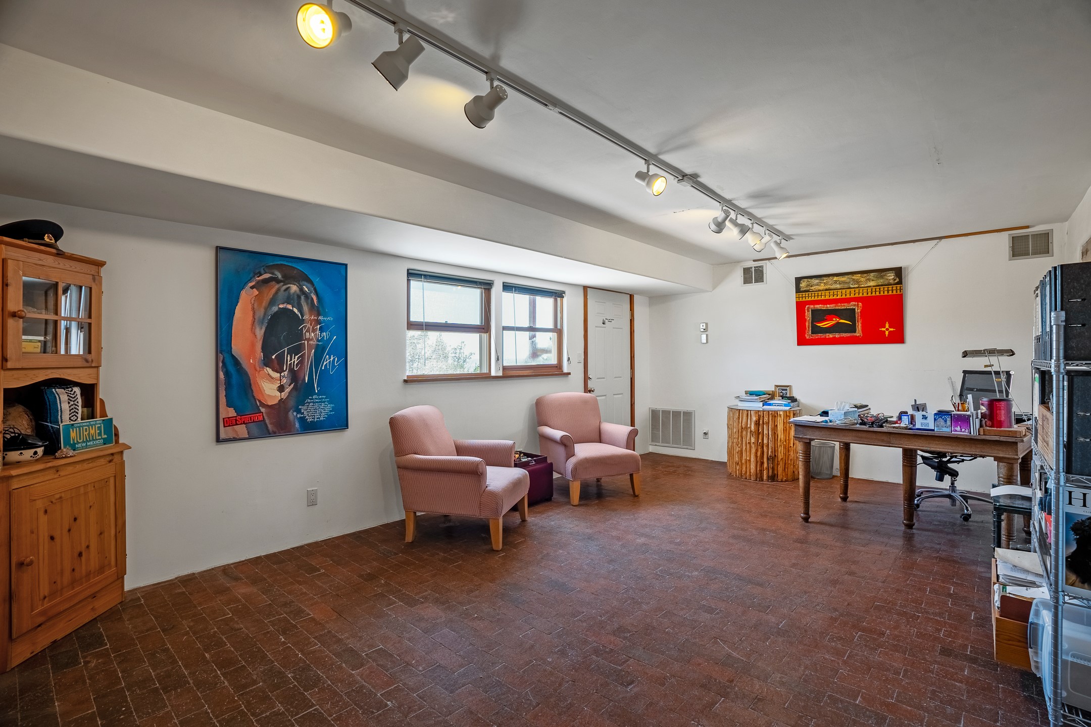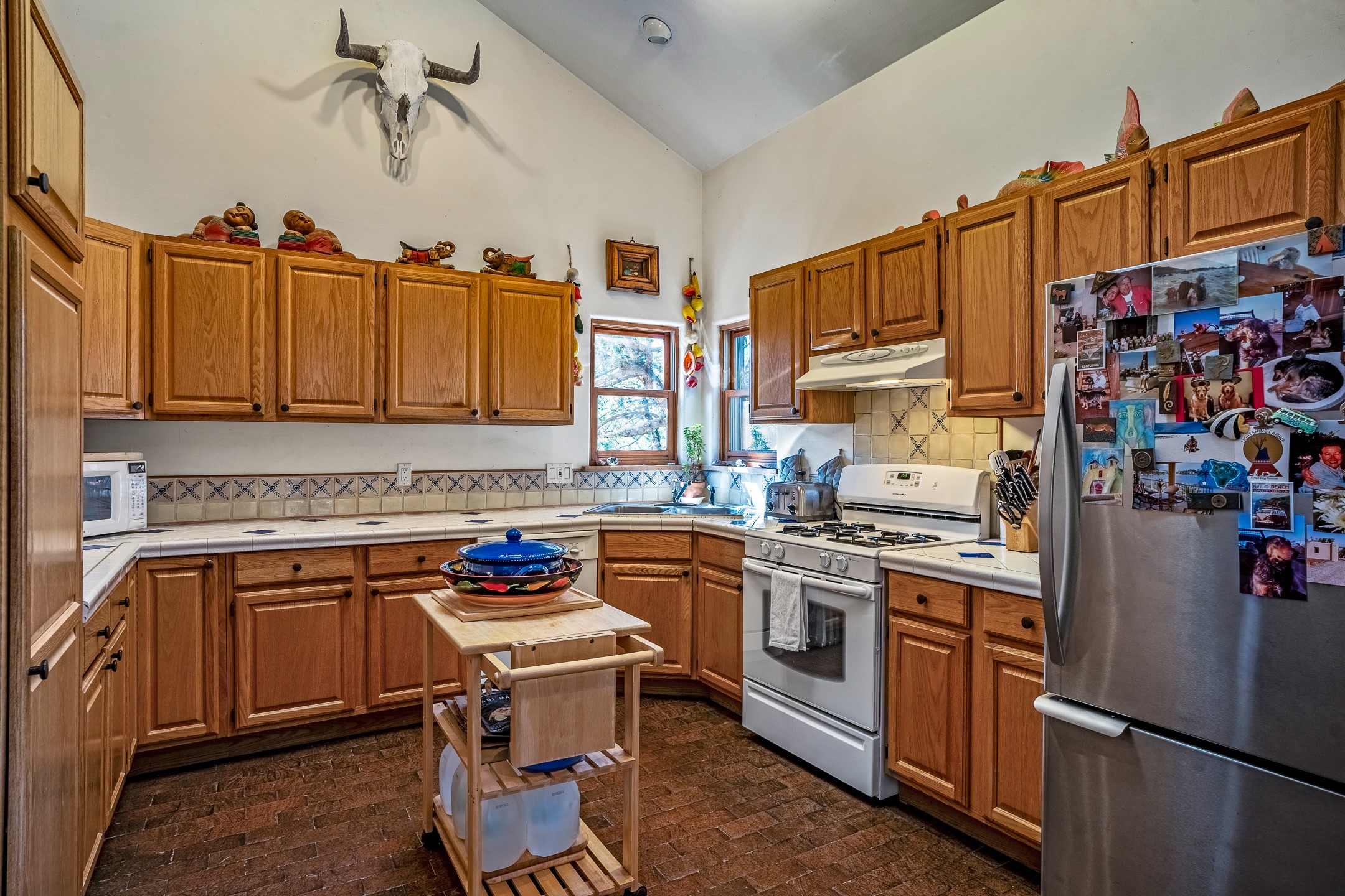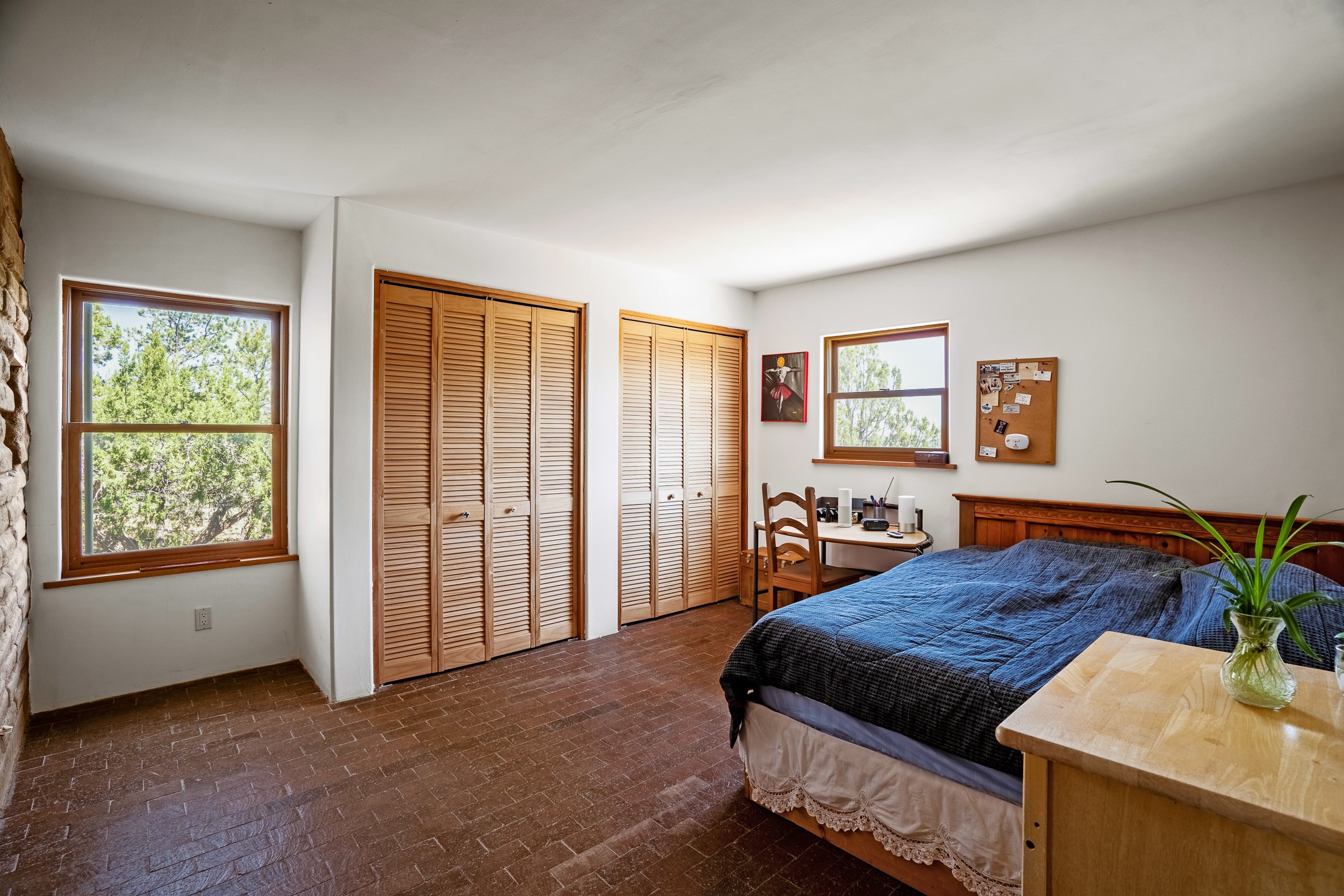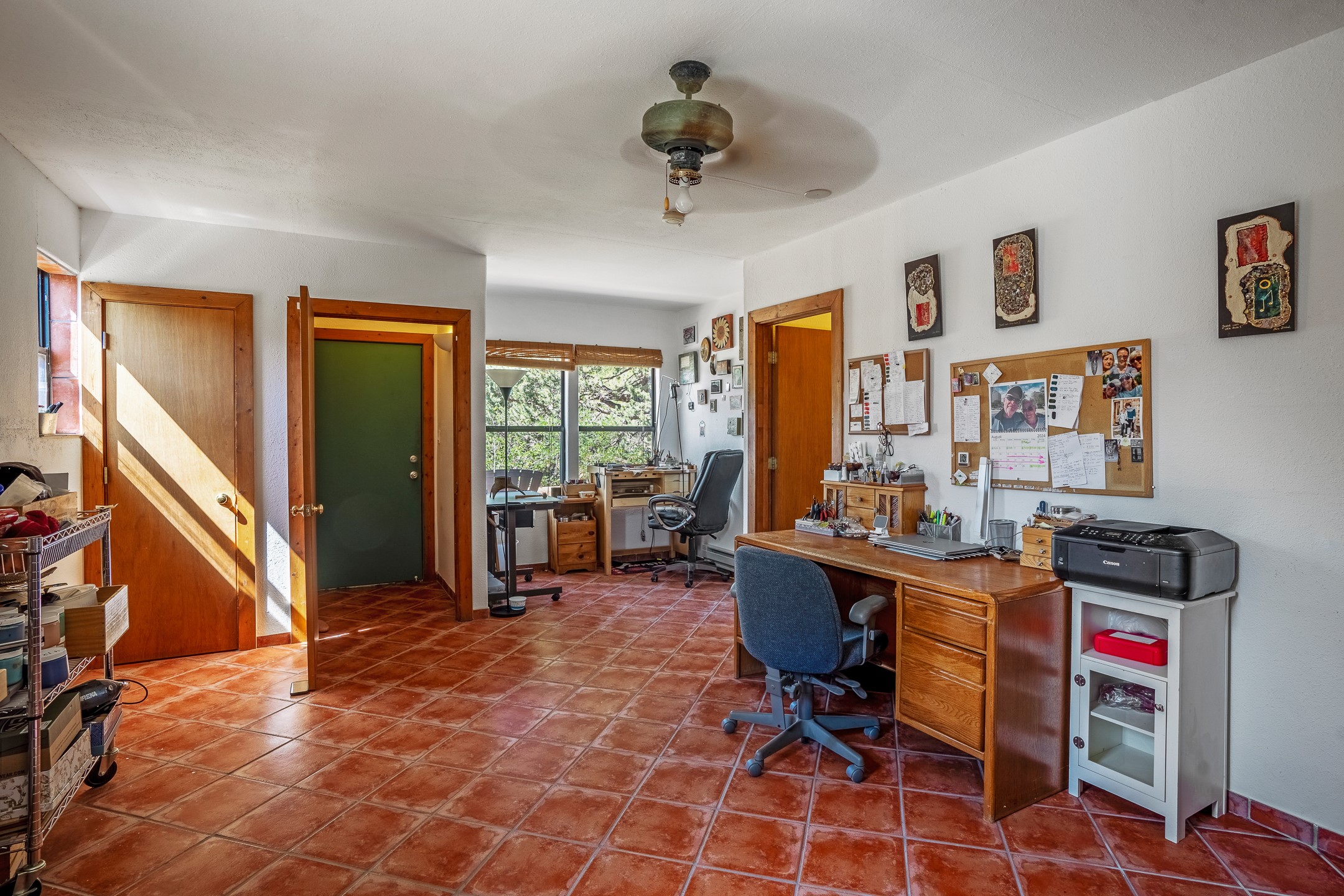 Sited high on the northern slopes of the Ortiz Mountains, this working artist's retreat offers away-from-it-all serenity while still being with an easy commute of Santa Fe. The home and studio is centered on a gently sloping 15.59 acre lot that offers space for gardening, horses, other animals, or outbuildings. The home features three bedrooms and two full baths, with soaring ceilings in the living room and kitchen, and a primary bedroom on the second floor with rooftop deck. Brick and wood floors, wood ceilings, and an interior adobe wall exude warmth. Outside, a north facing patio takes in breathtaking views across the Galisteo Basin to the Sangre de Cristo's. The attached artist's studio has its own entrance and bathroom, and could easily be converted back to its previous use as a guest house if additional living space or rental income was desired. Two storage sheds are on the lot, including a large and sturdy shed that could be used as shop space or more studio space. Connected to public electric, with fast internet and a good well. The property also has a Bed and Breakfast license from Santa Fe County. Owner will offer a $25,000 credit to replace shingle roof with metal roofing, and may offer owner financing with substantial down. 20 miles to the south side of Santa Fe, 57 miles to the Albuquerque airport, and near dining and entertainment opportunities in Madrid and Cerrillos. Accepting back up offers.