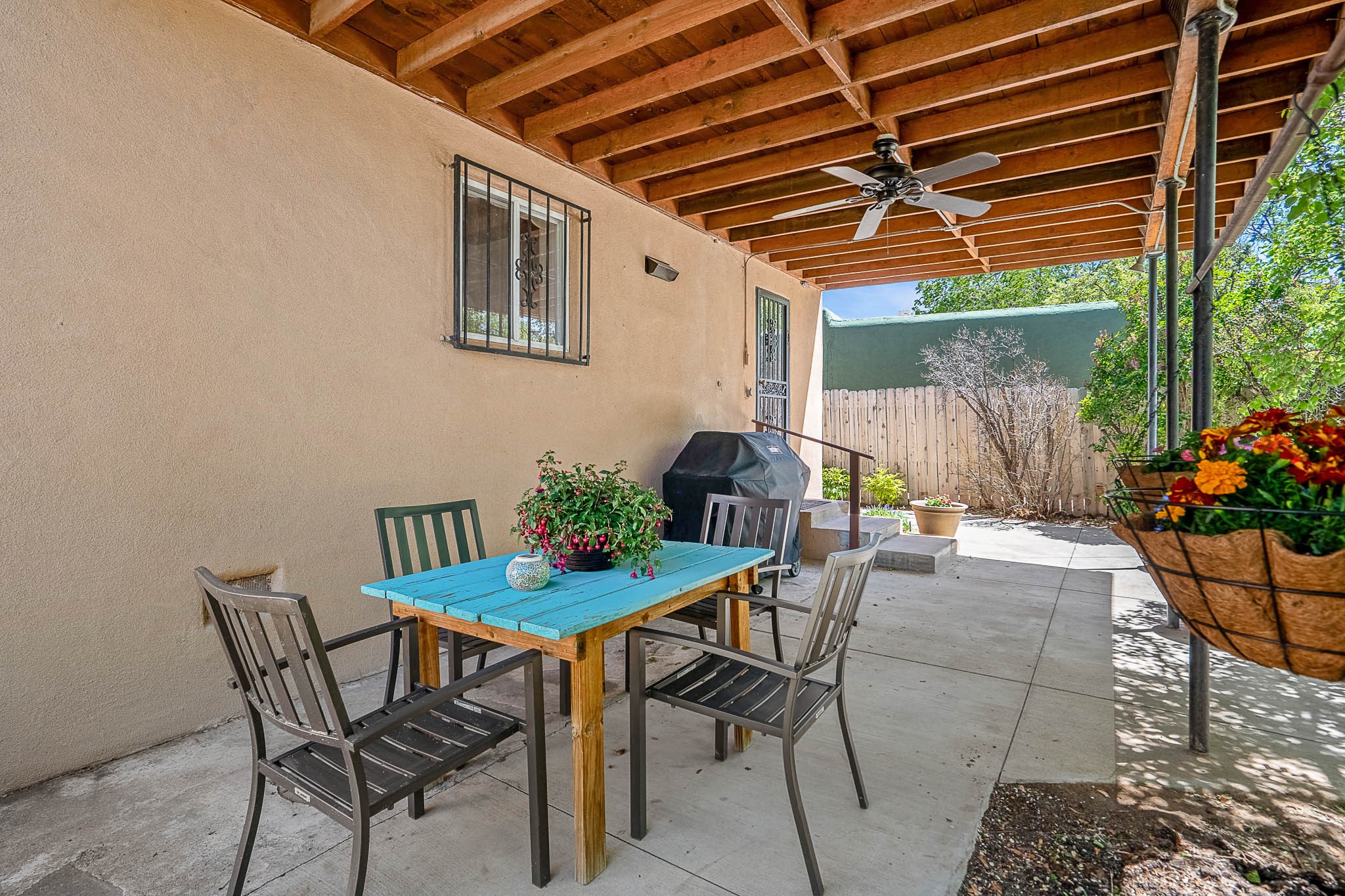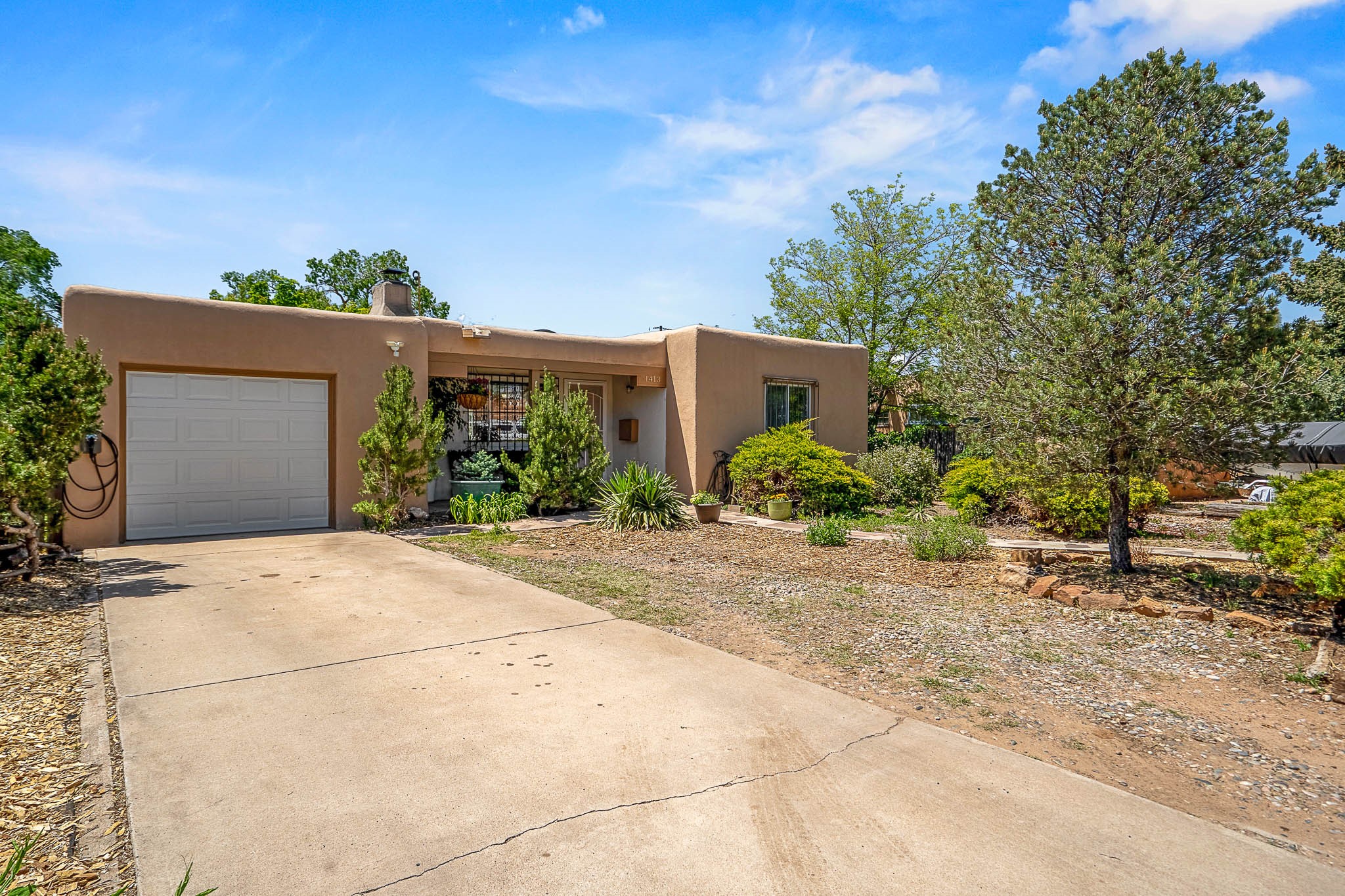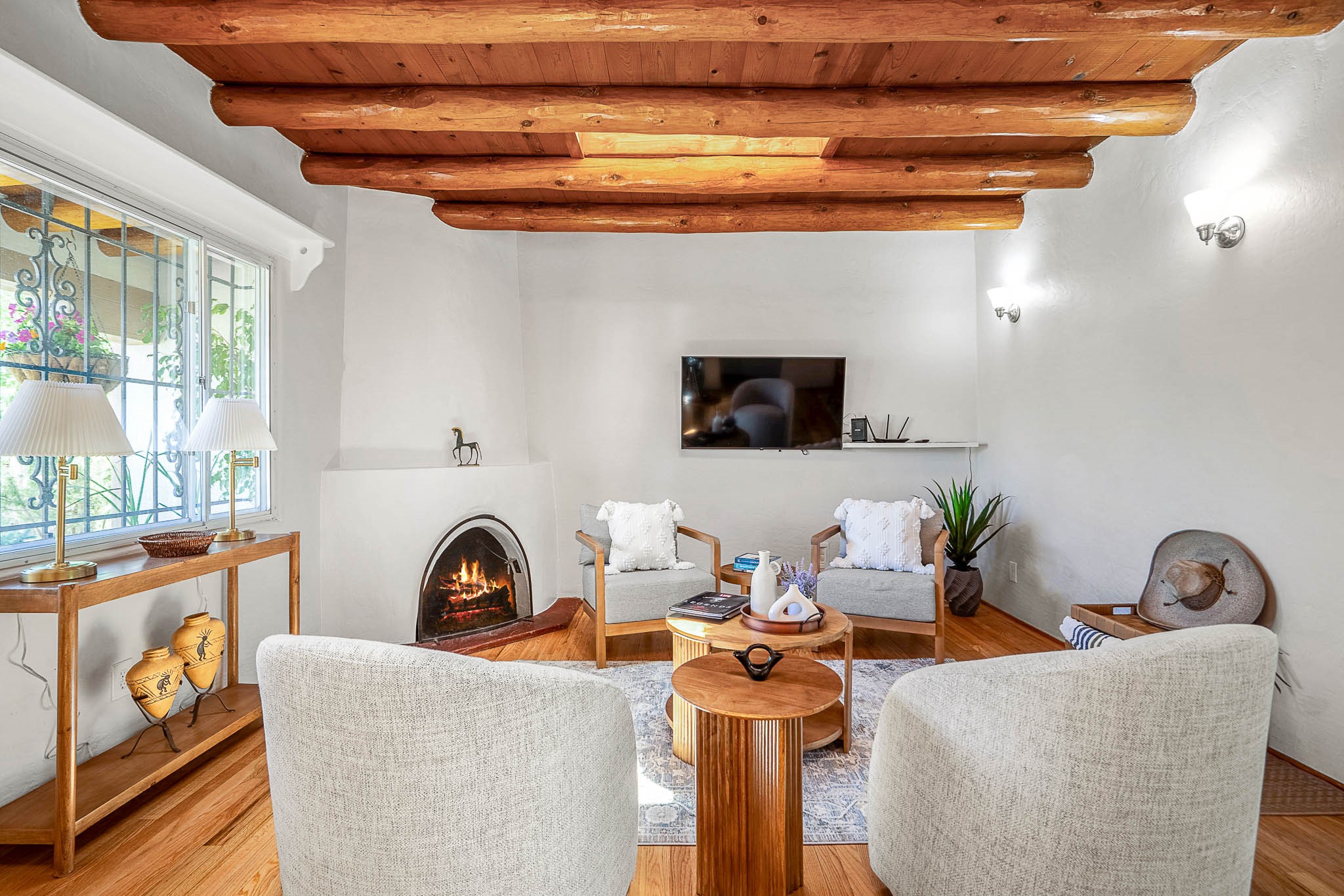 Classic Stamm located in the highly desirable Casa Linda neighborhood. This charming two-bedroom, one-bathroom home is situated within a well established Stamm neighborhood, known for its classic architectural style and central location.Inside, the residence boasts beautiful exposed vigas, original oak hardwood floors throughout (except in the kitchen), and a welcoming kiva wood-burning fireplace, complemented by a traditional nicho. The original solid wood front door has been thoughtfully restored, enhancing the home's unique character and creating a warm and inviting entry.This property also offers modern conveniences such as central cooling, forced air heating, a tankless water heater, and the added benefit of an electric car charger. Recent updates include a newer roof with a transferable 5-year warranty, and for future expansion, blueprints for a primary suite addition & carport are also included. The home is set on a spacious lot, providing ample outdoor living space.Given the desirability of Stamm homes in this area, they tend to be highly sought after and sell quickly. Schedule a showing today!