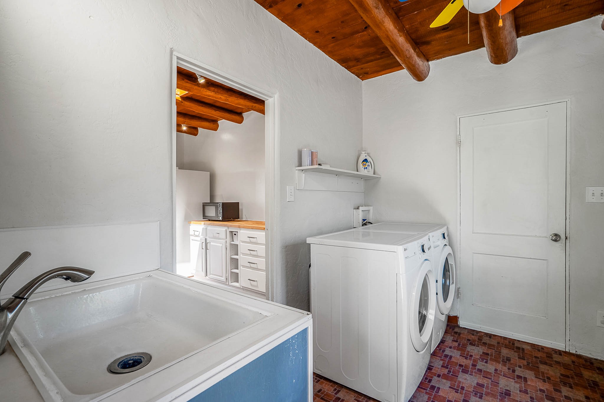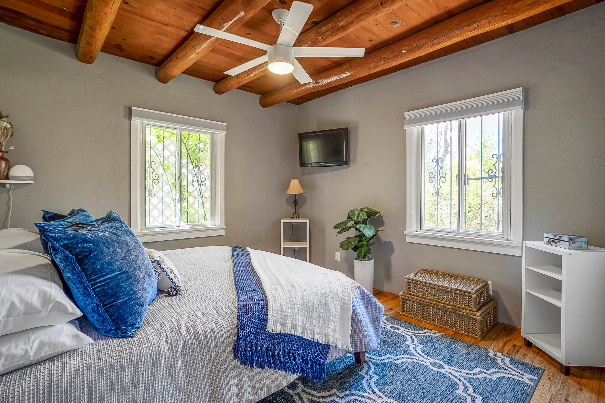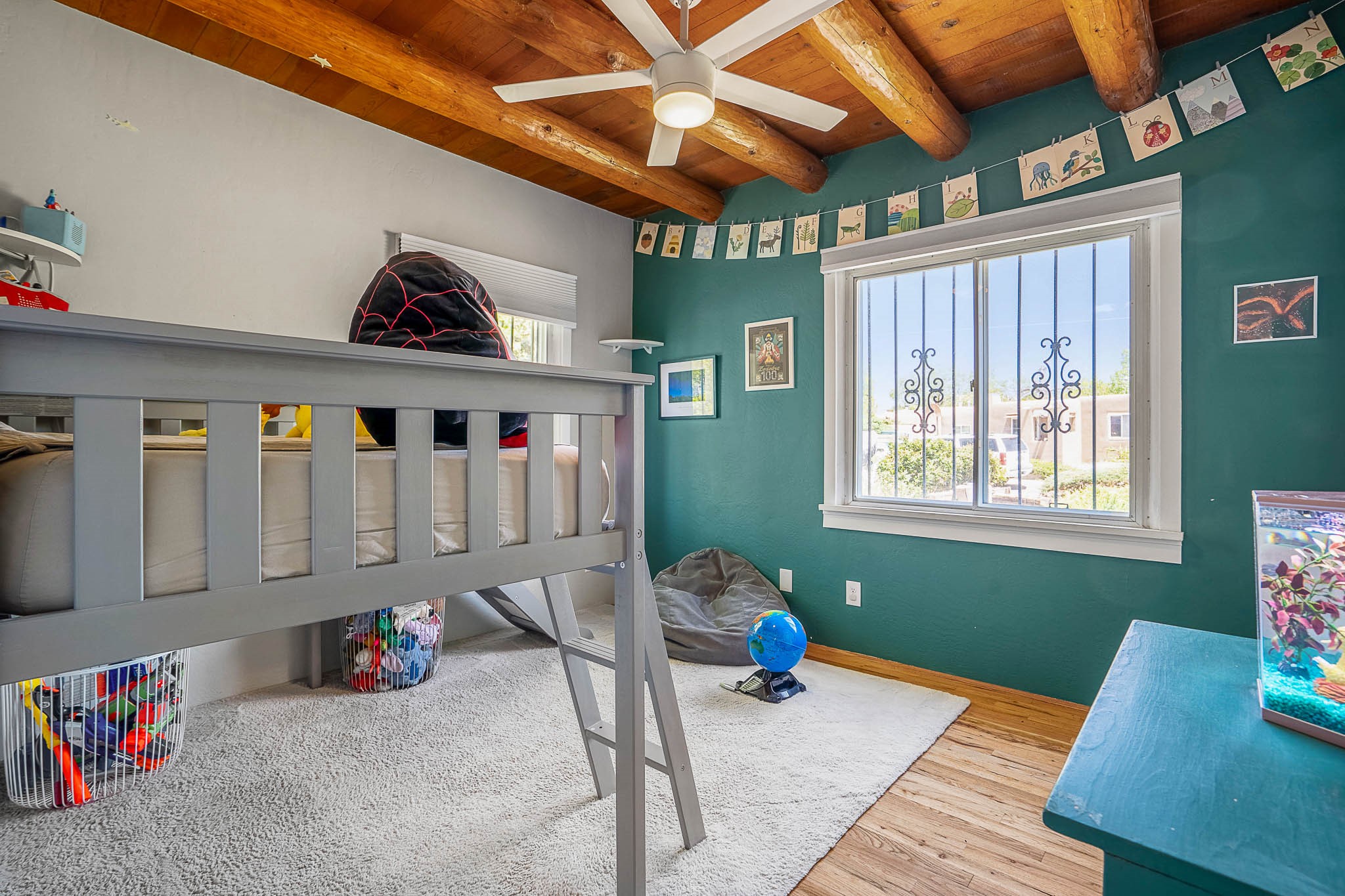 Classic Stamm located in the highly desirable Casa Linda neighborhood. This charming two-bedroom, one-bathroom home is situated within a well established Stamm neighborhood, known for its classic architectural style and central location.Inside, the residence boasts beautiful exposed vigas, original oak hardwood floors throughout (except in the kitchen), and a welcoming kiva wood-burning fireplace, complemented by a traditional nicho. The original solid wood front door has been thoughtfully restored, enhancing the home's unique character and creating a warm and inviting entry.This property also offers modern conveniences such as central cooling, forced air heating, a tankless water heater, and the added benefit of an electric car charger. Recent updates include a newer roof with a transferable 5-year warranty, and for future expansion, blueprints for a primary suite addition & carport are also included. The home is set on a spacious lot, providing ample outdoor living space.Given the desirability of Stamm homes in this area, they tend to be highly sought after and sell quickly. Schedule a showing today!