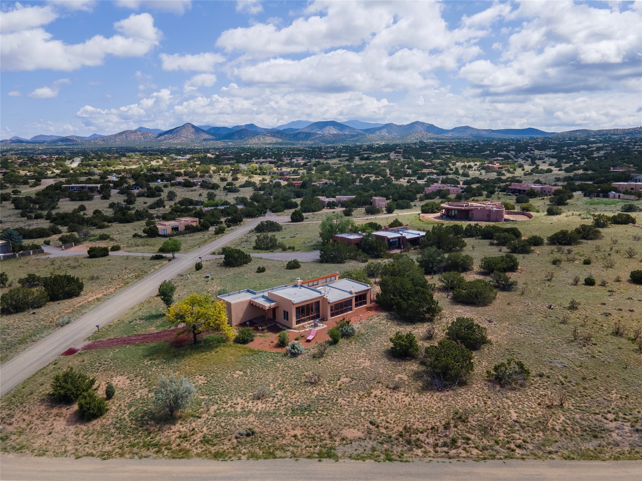Enjoy the natural beauty of Eldorado, especially its glorious mountain views, from this well built, well designed passive solar gem, on an expansive corner lot. Built by Aram Farber of Adobeworks, the home offers peace and serenity as you enter its spacious Living Room with its light, airy feeling. Enjoy Southwest authenticity and charm from warm saltillo tile flooring, a commanding kiva, beautiful, high tongue and groove ceilings and various wooden accents. Its dining room has a lovely new accent wall, and the kitchen has been upgraded with quartz and butcher block counters and a new stove and dishwasher. You'll find well sized bedrooms and bathrooms that flow nicely from the public spaces. Seller added a fenced area for pets and has repainted the stucco and exterior trim, plus adding new flooring to all bedrooms. Here you'll find a sweet sanctuary to savor a wonderful Santa Fe lifestyle.