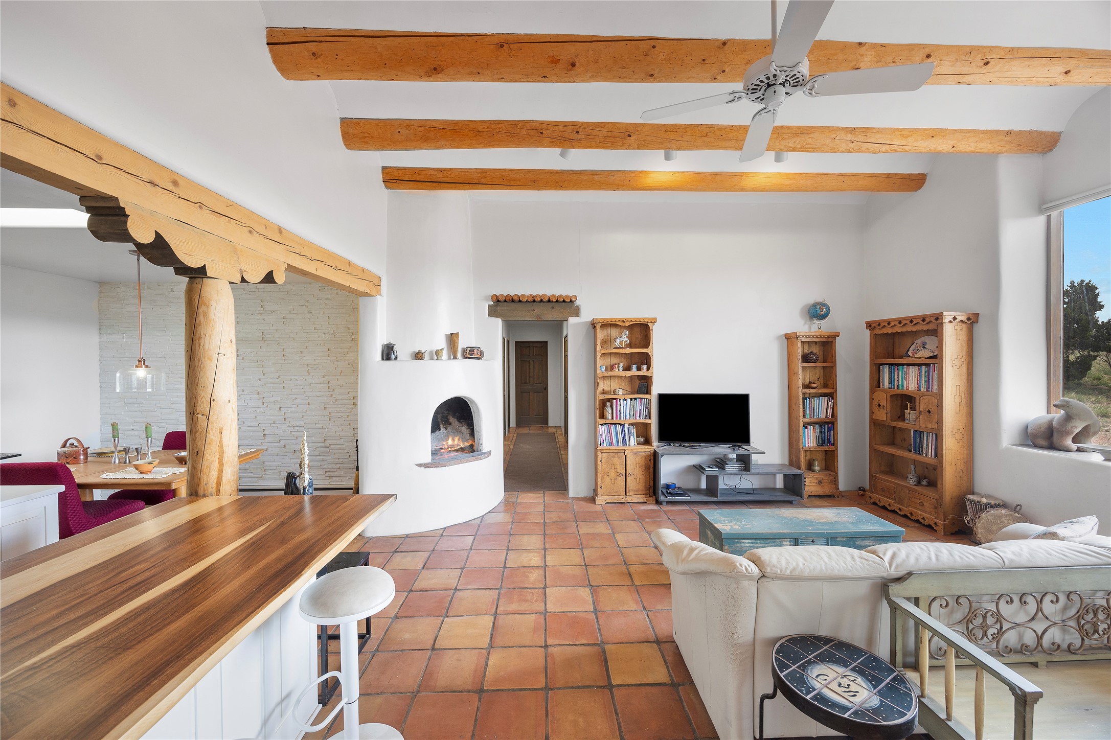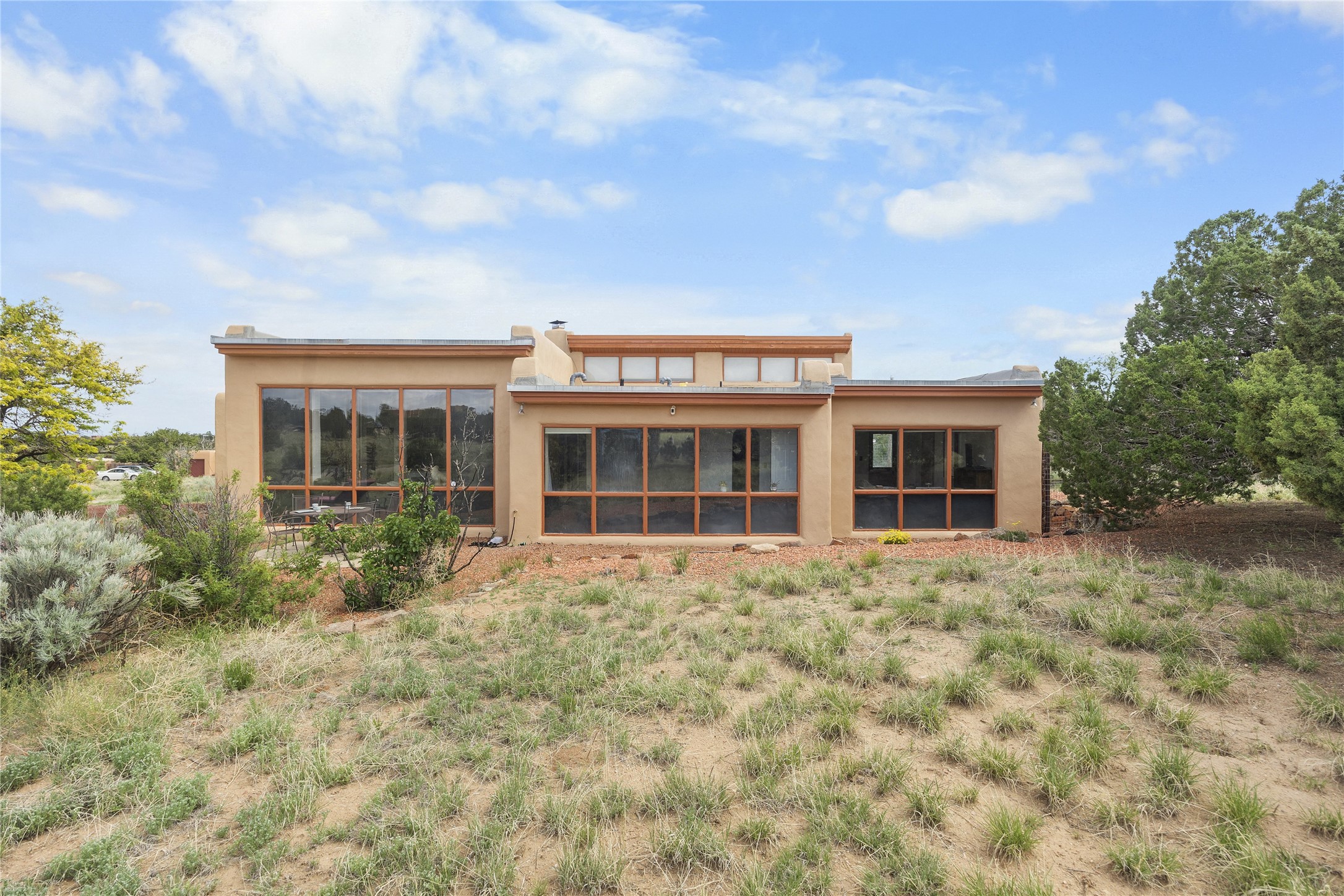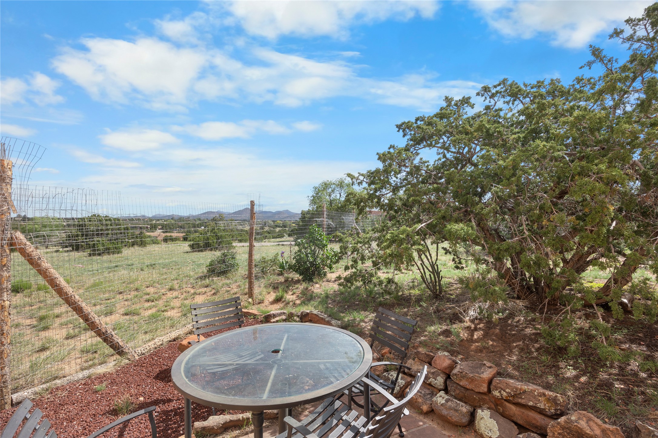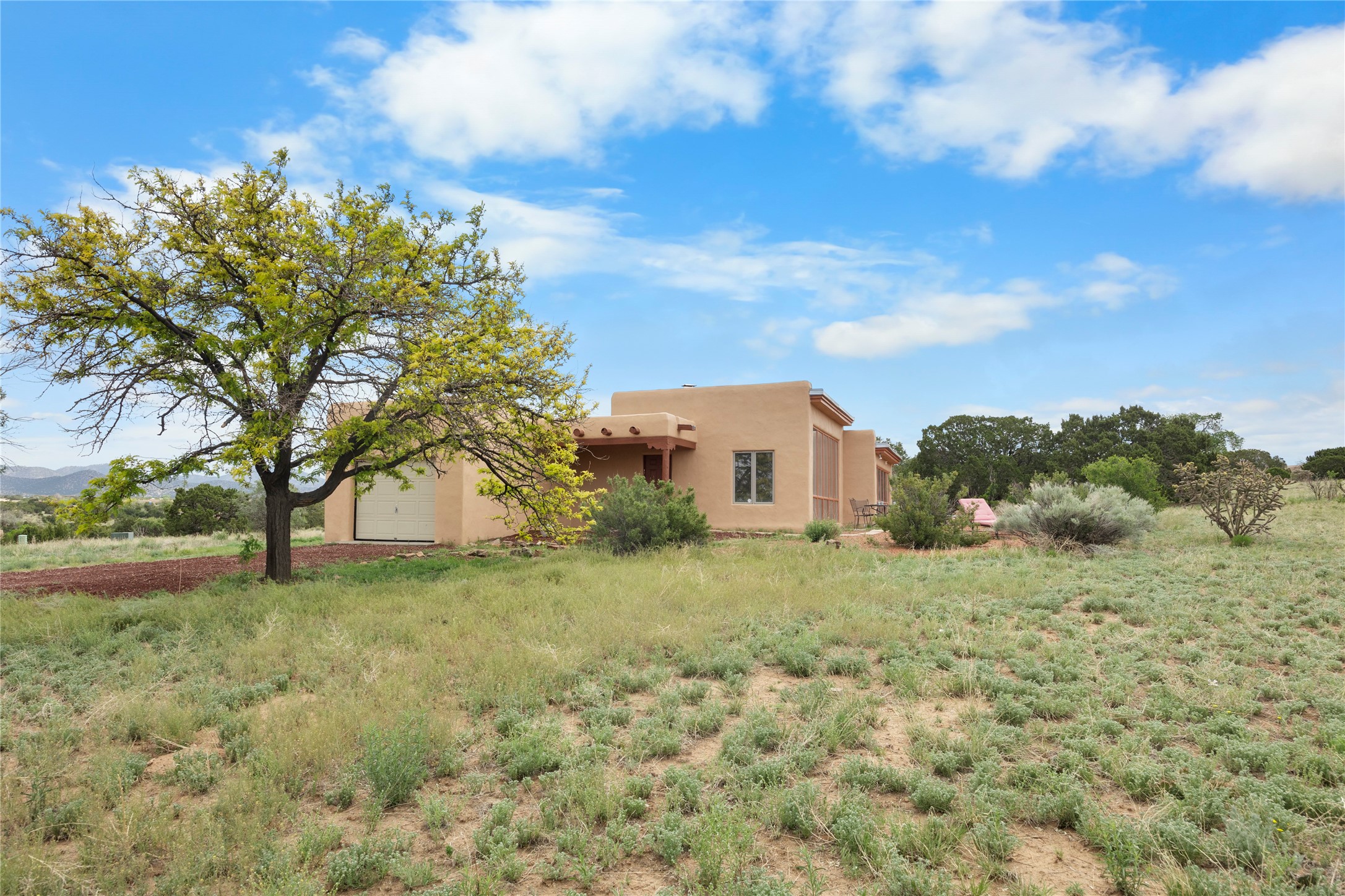 Enjoy the natural beauty of Eldorado, especially its glorious mountain views, from this well built, well designed passive solar gem, on an expansive corner lot. Built by Aram Farber of Adobeworks, the home offers peace and serenity as you enter its spacious Living Room with its light, airy feeling. Enjoy Southwest authenticity and charm from warm saltillo tile flooring, a commanding kiva, beautiful, high tongue and groove ceilings and various wooden accents. Its dining room has a lovely new accent wall, and the kitchen has been upgraded with quartz and butcher block counters and a new stove and dishwasher. You'll find well sized bedrooms and bathrooms that flow nicely from the public spaces. Seller added a fenced area for pets and has repainted the stucco and exterior trim, plus adding new flooring to all bedrooms. Here you'll find a sweet sanctuary to savor a wonderful Santa Fe lifestyle.