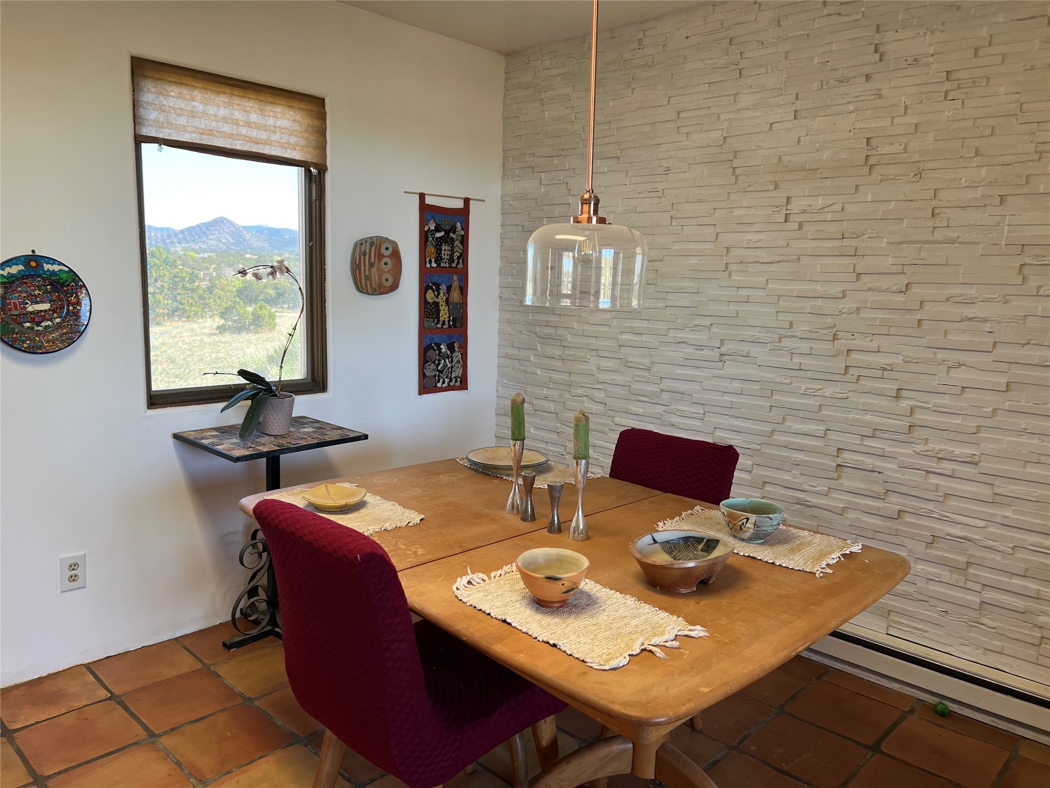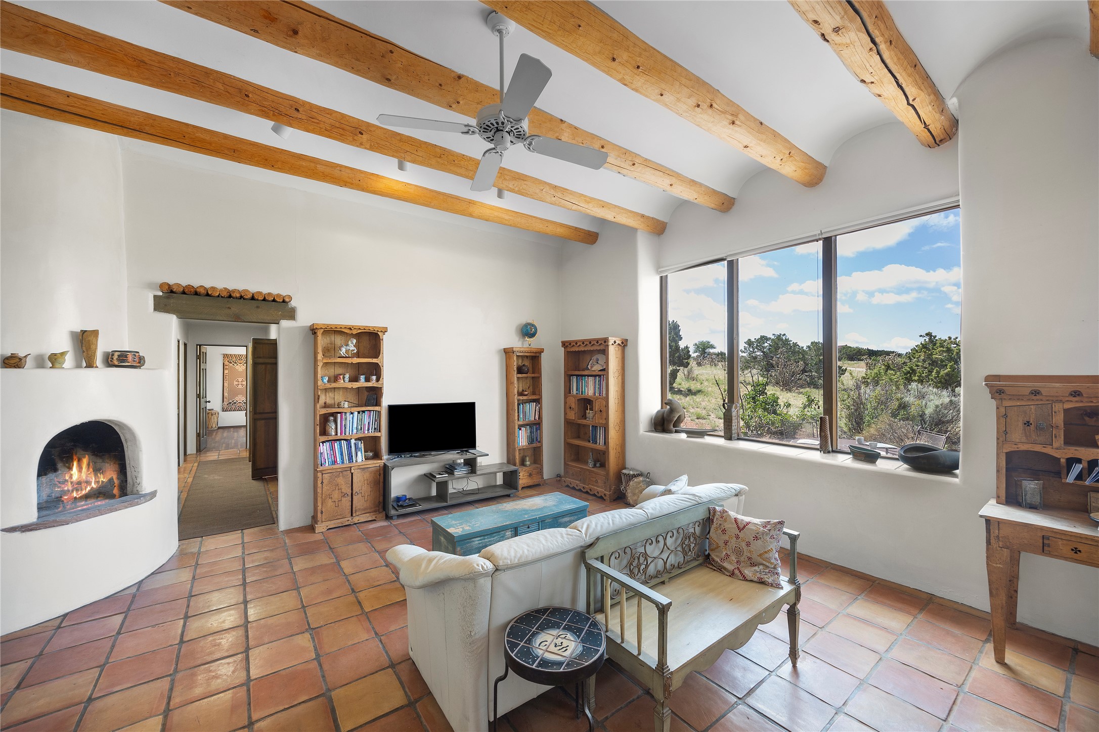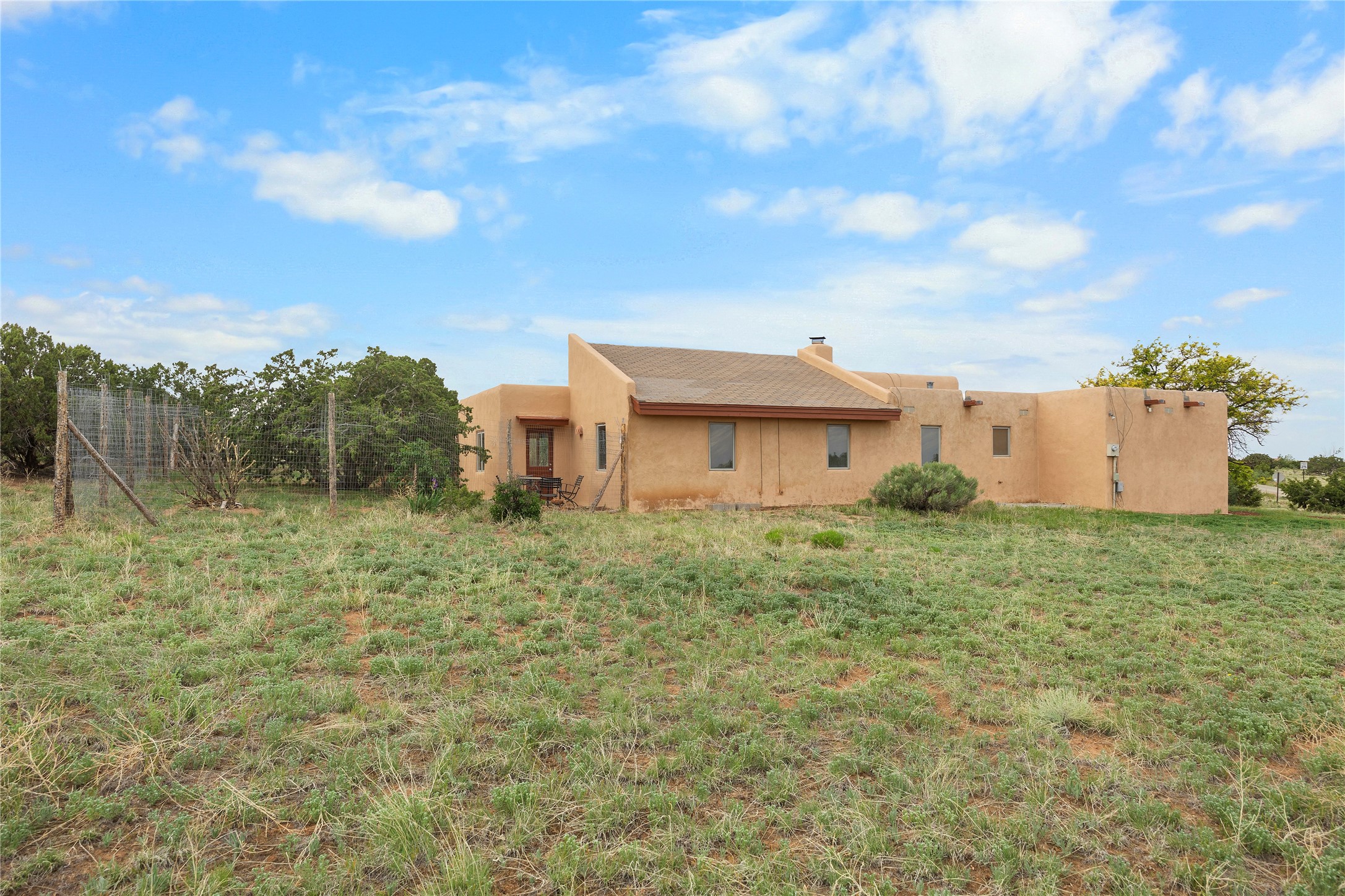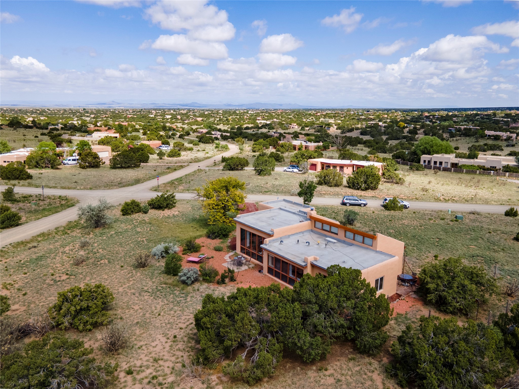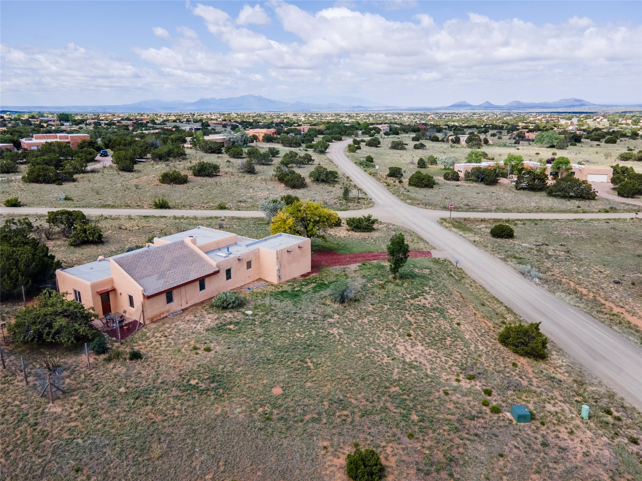 Enjoy the natural beauty of Eldorado, especially its glorious mountain views, from this well built, well designed passive solar gem, on an expansive corner lot. Built by Aram Farber of Adobeworks, the home offers peace and serenity as you enter its spacious Living Room with its light, airy feeling. Enjoy Southwest authenticity and charm from warm saltillo tile flooring, a commanding kiva, beautiful, high tongue and groove ceilings and various wooden accents. Its dining room has a lovely new accent wall, and the kitchen has been upgraded with quartz and butcher block counters and a new stove and dishwasher. You'll find well sized bedrooms and bathrooms that flow nicely from the public spaces. Seller added a fenced area for pets and has repainted the stucco and exterior trim, plus adding new flooring to all bedrooms. Here you'll find a sweet sanctuary to savor a wonderful Santa Fe lifestyle.