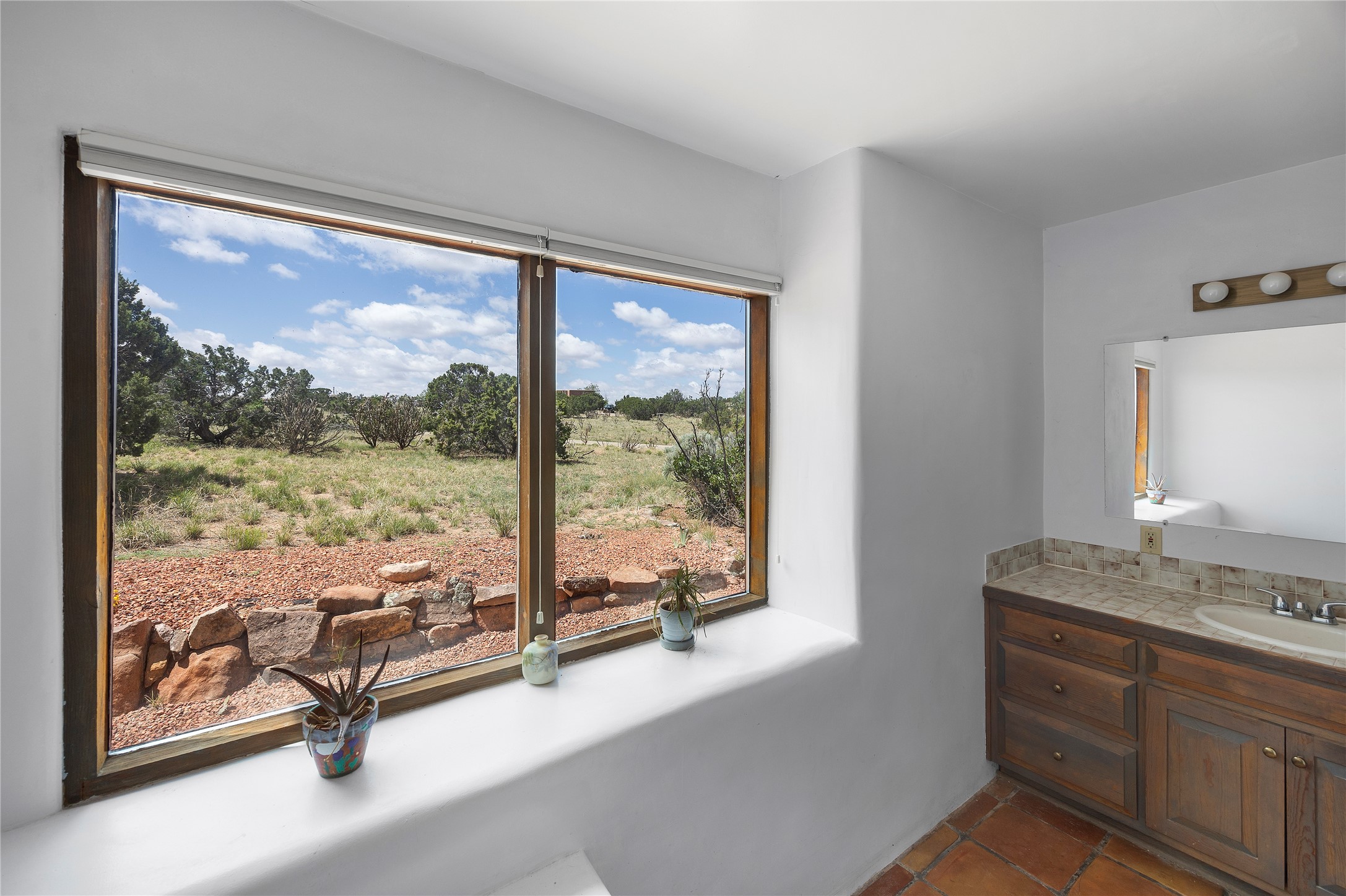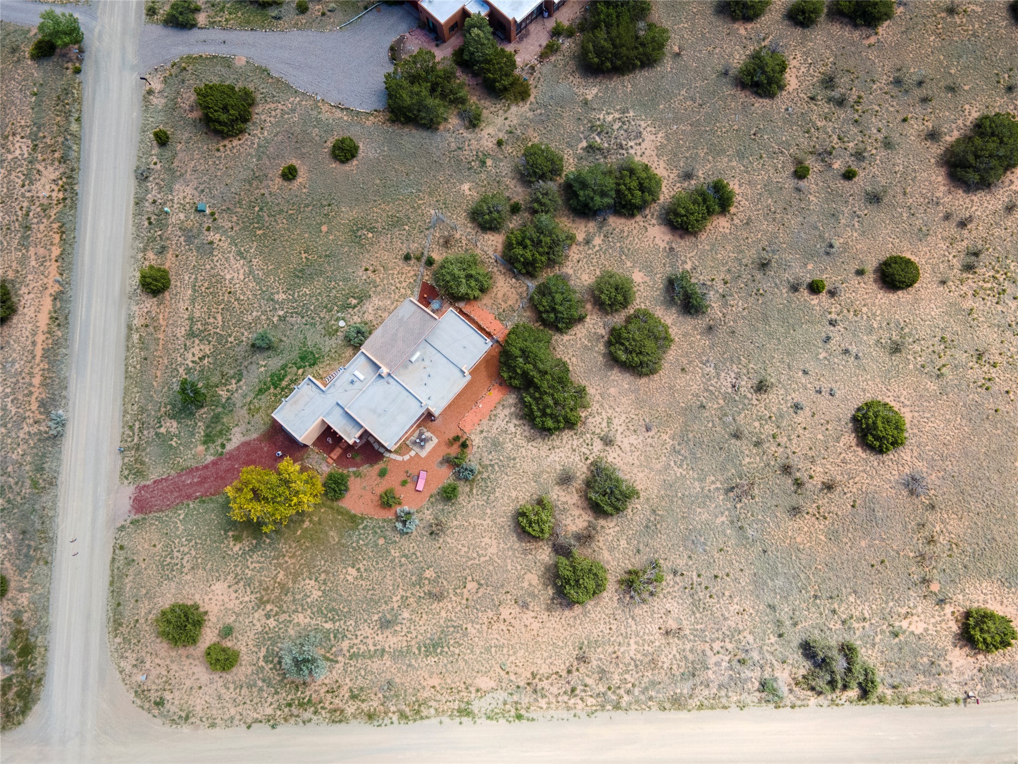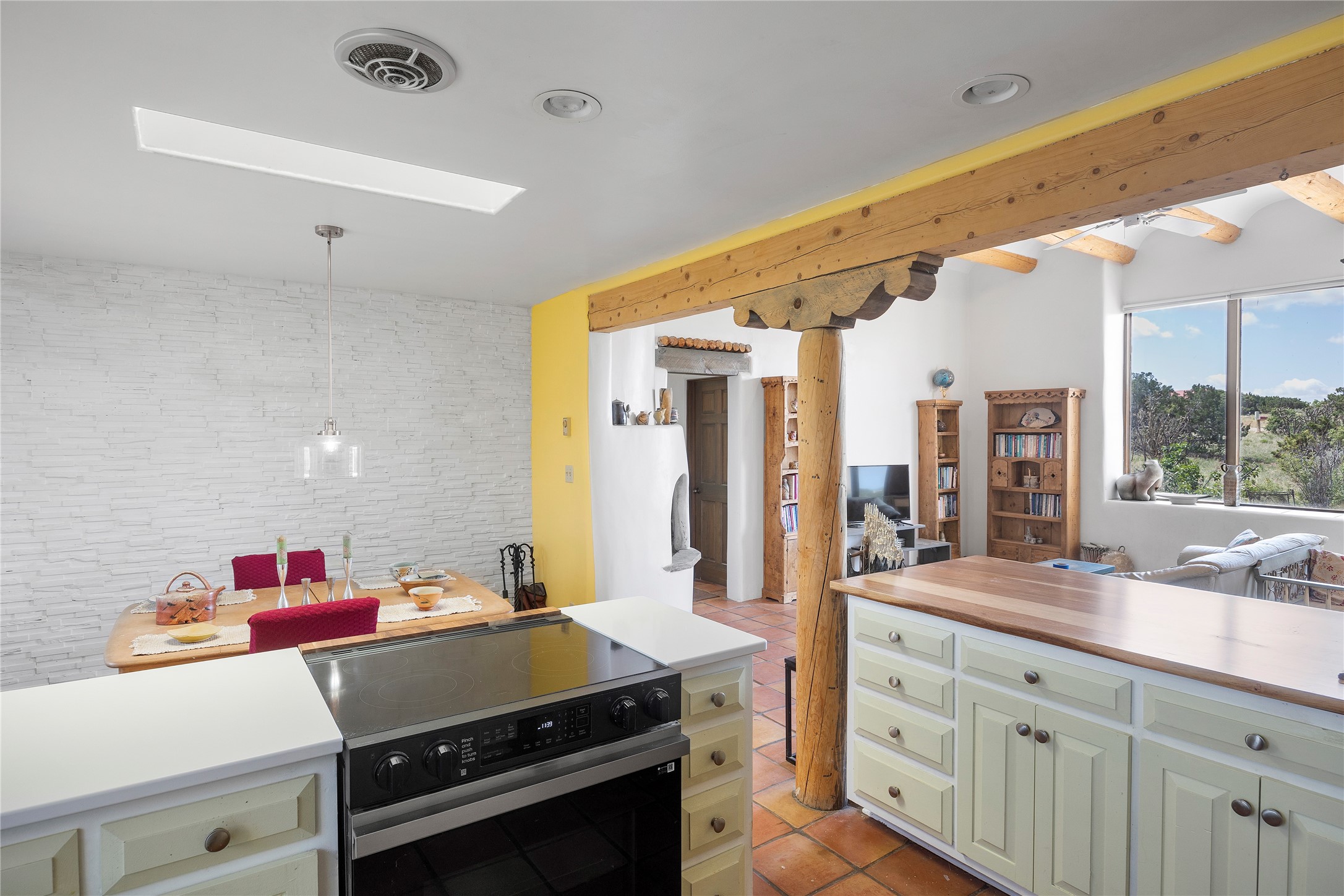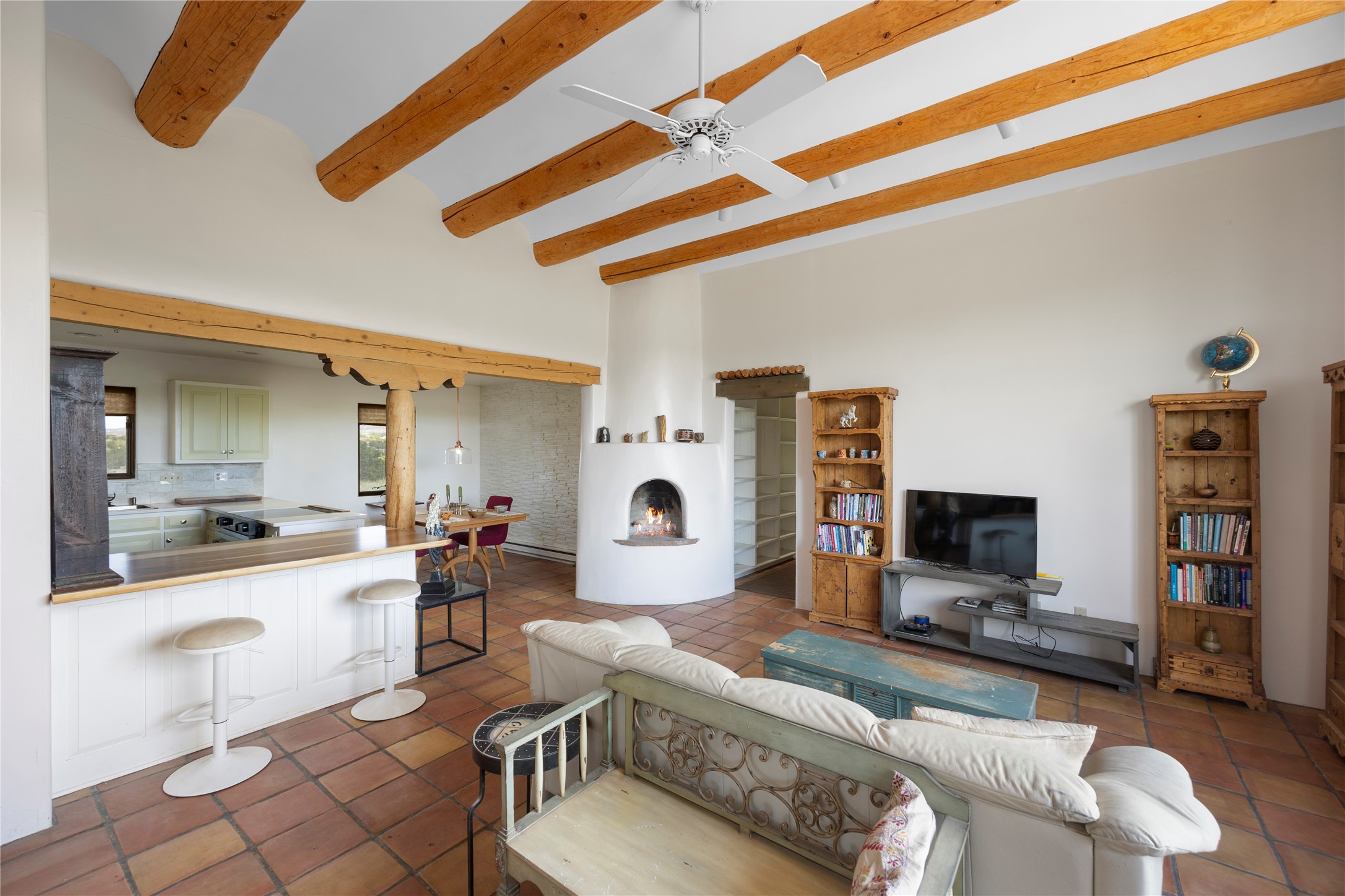 Enjoy the natural beauty of Eldorado, especially its glorious mountain views, from this well built, well designed passive solar gem, on an expansive corner lot. Built by Aram Farber of Adobeworks, the home offers peace and serenity as you enter its spacious Living Room with its light, airy feeling. Enjoy Southwest authenticity and charm from warm saltillo tile flooring, a commanding kiva, beautiful, high tongue and groove ceilings and various wooden accents. Its dining room has a lovely new accent wall, and the kitchen has been upgraded with quartz and butcher block counters and a new stove and dishwasher. You'll find well sized bedrooms and bathrooms that flow nicely from the public spaces. Seller added a fenced area for pets and has repainted the stucco and exterior trim, plus adding new flooring to all bedrooms. Here you'll find a sweet sanctuary to savor a wonderful Santa Fe lifestyle.