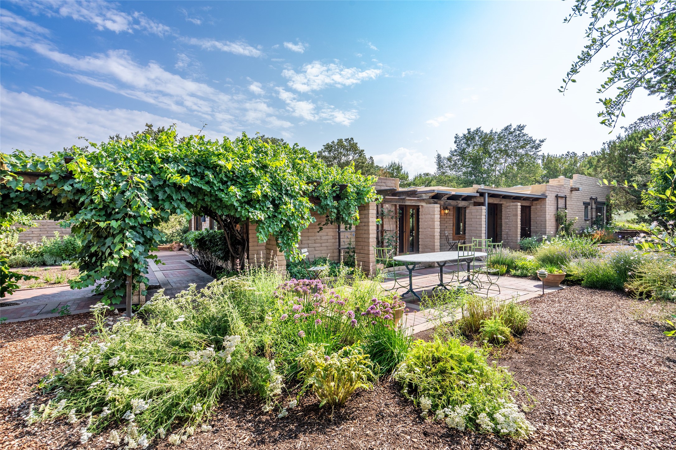 Nestled on 1.46 acres in the coveted Sol Y Lomas neighborhood, this exceptional property blends the earthy beauty of the Southwest with organic lines reminiscent of Frank Lloyd Wright. Thoughtfully curated by a master gardener, the grounds bloom with color and life--an oasis of natural wonder. Lovingly owned by the same family since 1978, the property includes an updated 2-bedroom, 2-bathroom main house (2,063 sq. ft.) and a charming 1-bedroom, 1-bathroom guest house (563 sq. ft.), connected by a breezeway draped in grapevines. Inside the main house, brick flooring and beamed ceilings carry a sense of grounded elegance throughout. At the heart of the home is the kitchen, with open shelving that connects seamlessly to the generous dining and sitting areas--perfect for casual gatherings or quiet evenings. The main living room, with views of the lush front courtyard, is anchored by a wood-burning fireplace and exudes warmth and comfort. The primary suite also features a fireplace and direct access to the western patio, inviting you to enjoy the surrounding beauty. Its bathroom is filled with natural light and includes a sculpted vessel soaking tub and a glass-walled walk-in shower. The guest bedroom, currently used as an office, offers yet another fireplace and the same warm, organic charm. The guest house feels like a step back in time, with its vintage full kitchen, spacious bedroom with ensuite bath, and access to a private patio--ideal for guests or creative retreat space. With timeless presence and inspired design, this remarkable property is a sanctuary of comfort, natural elegance, and casual sophistication.