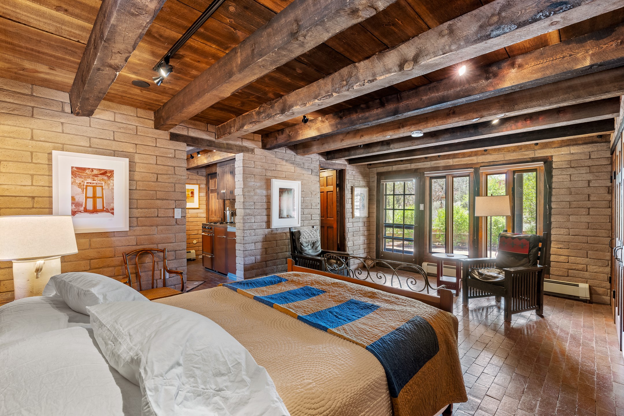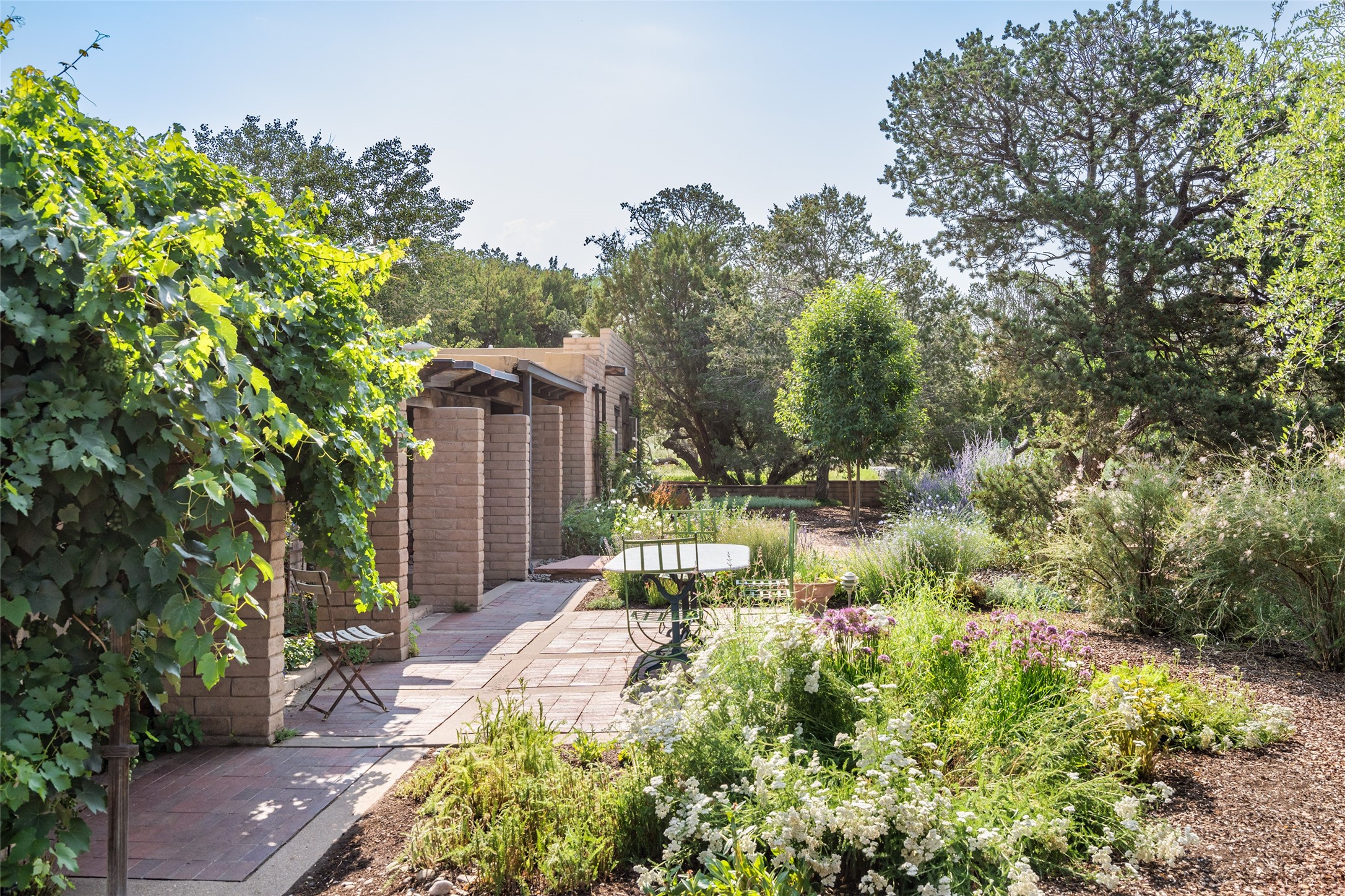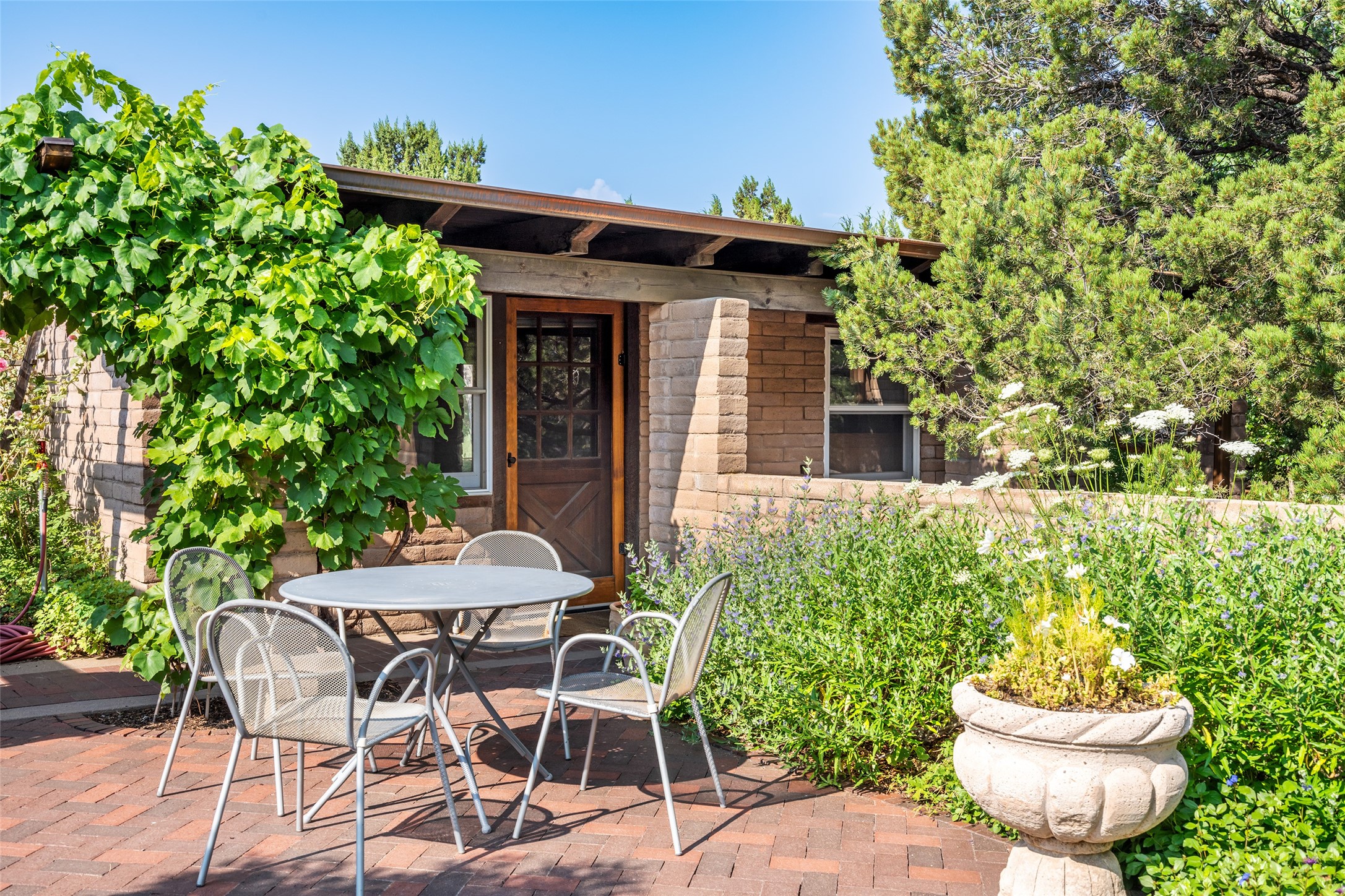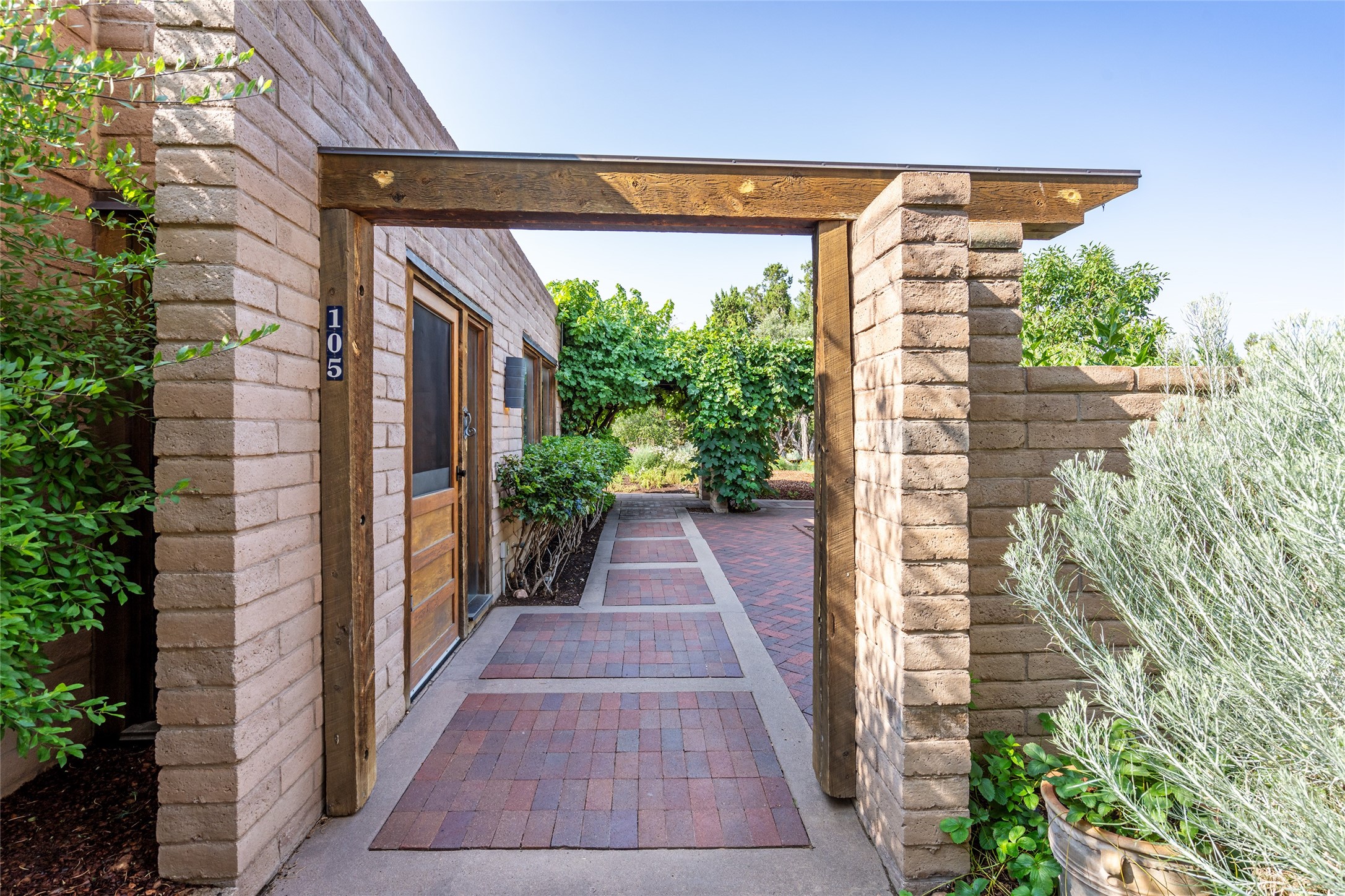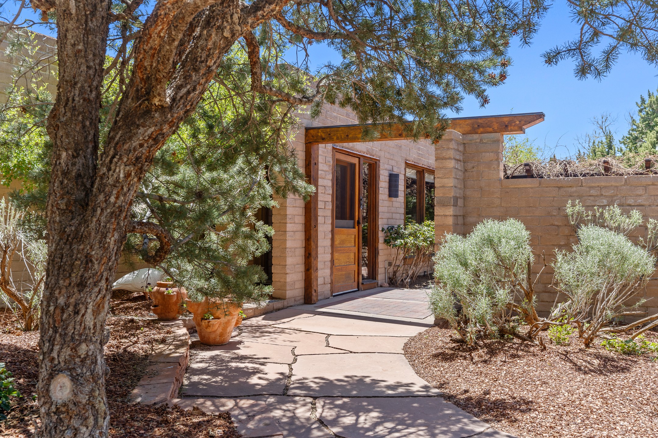 Nestled on 1.46 acres in the coveted Sol Y Lomas neighborhood, this exceptional property blends the earthy beauty of the Southwest with organic lines reminiscent of Frank Lloyd Wright. Thoughtfully curated by a master gardener, the grounds bloom with color and life--an oasis of natural wonder. Lovingly owned by the same family since 1978, the property includes an updated 2-bedroom, 2-bathroom main house (2,063 sq. ft.) and a charming 1-bedroom, 1-bathroom guest house (563 sq. ft.), connected by a breezeway draped in grapevines. Inside the main house, brick flooring and beamed ceilings carry a sense of grounded elegance throughout. At the heart of the home is the kitchen, with open shelving that connects seamlessly to the generous dining and sitting areas--perfect for casual gatherings or quiet evenings. The main living room, with views of the lush front courtyard, is anchored by a wood-burning fireplace and exudes warmth and comfort. The primary suite also features a fireplace and direct access to the western patio, inviting you to enjoy the surrounding beauty. Its bathroom is filled with natural light and includes a sculpted vessel soaking tub and a glass-walled walk-in shower. The guest bedroom, currently used as an office, offers yet another fireplace and the same warm, organic charm. The guest house feels like a step back in time, with its vintage full kitchen, spacious bedroom with ensuite bath, and access to a private patio--ideal for guests or creative retreat space. With timeless presence and inspired design, this remarkable property is a sanctuary of comfort, natural elegance, and casual sophistication.