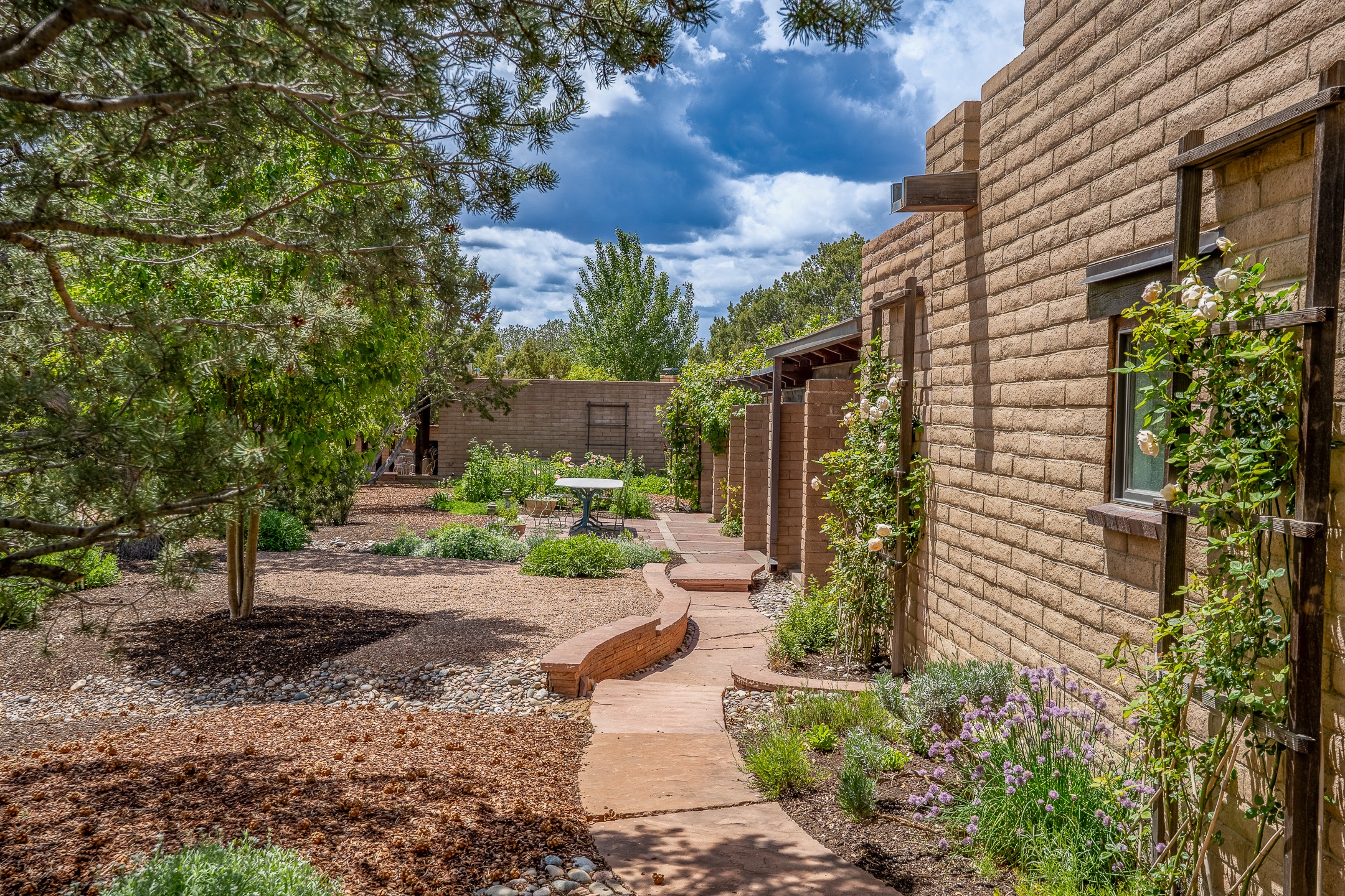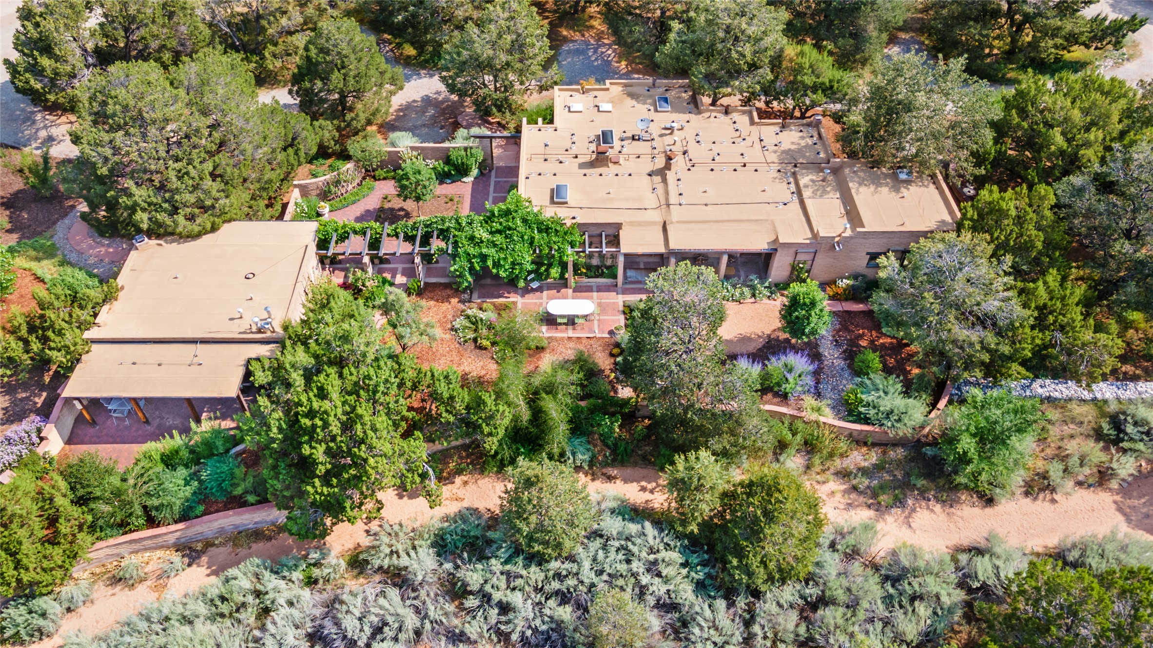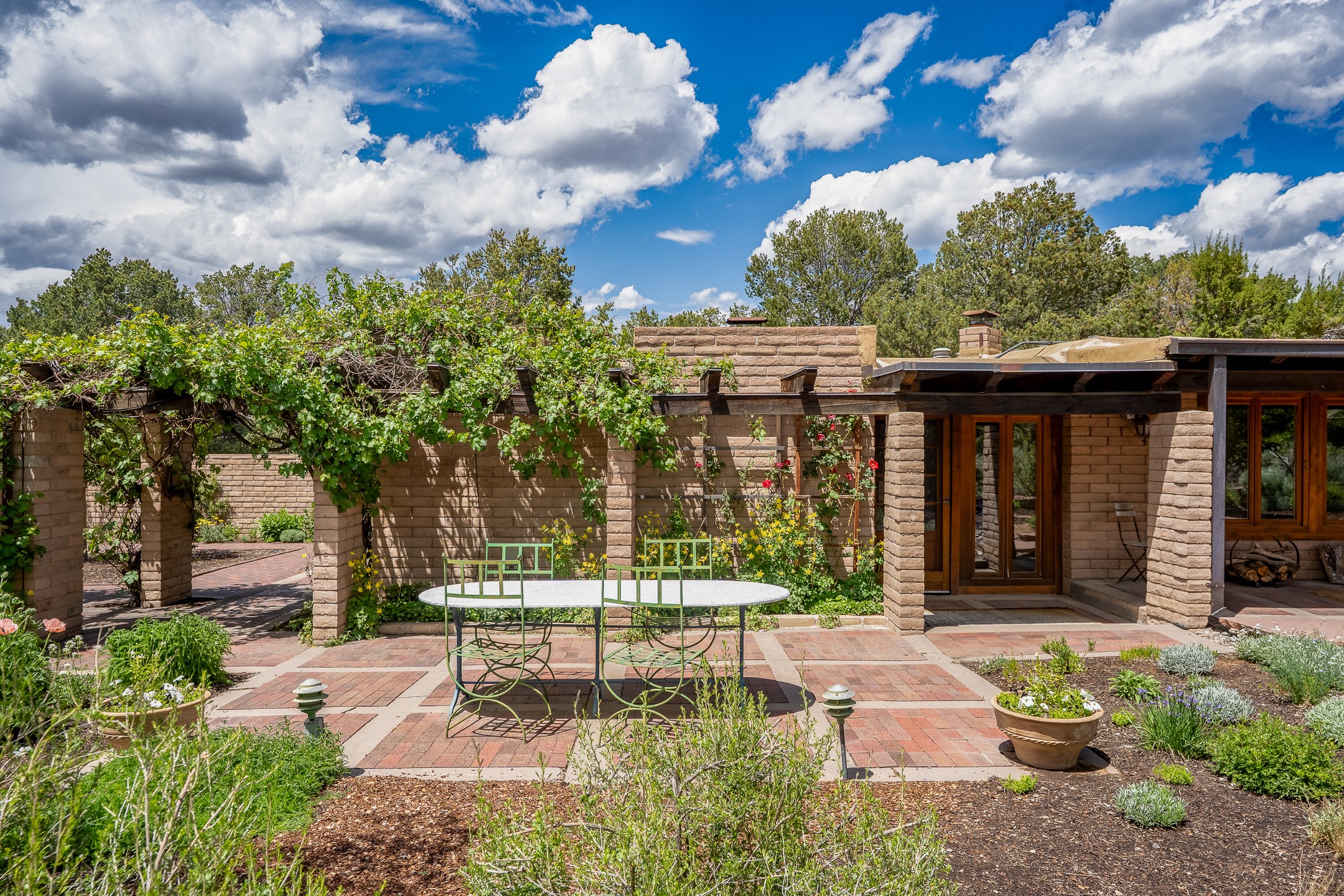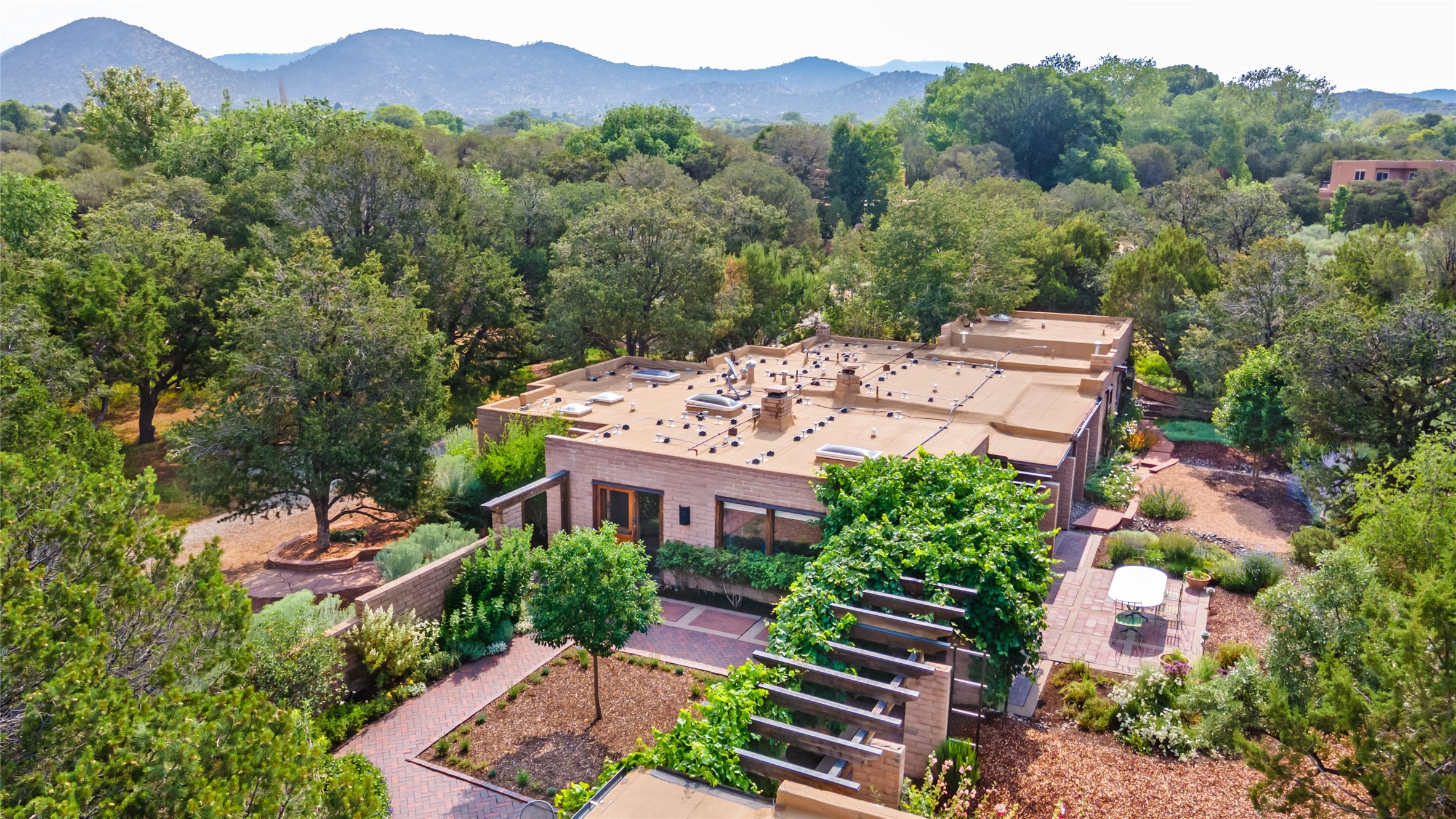 Nestled on 1.46 acres in the coveted Sol Y Lomas neighborhood, this exceptional property blends the earthy beauty of the Southwest with organic lines reminiscent of Frank Lloyd Wright. Thoughtfully curated by a master gardener, the grounds bloom with color and life--an oasis of natural wonder. Lovingly owned by the same family since 1978, the property includes an updated 2-bedroom, 2-bathroom main house (2,063 sq. ft.) and a charming 1-bedroom, 1-bathroom guest house (563 sq. ft.), connected by a breezeway draped in grapevines. Inside the main house, brick flooring and beamed ceilings carry a sense of grounded elegance throughout. At the heart of the home is the kitchen, with open shelving that connects seamlessly to the generous dining and sitting areas--perfect for casual gatherings or quiet evenings. The main living room, with views of the lush front courtyard, is anchored by a wood-burning fireplace and exudes warmth and comfort. The primary suite also features a fireplace and direct access to the western patio, inviting you to enjoy the surrounding beauty. Its bathroom is filled with natural light and includes a sculpted vessel soaking tub and a glass-walled walk-in shower. The guest bedroom, currently used as an office, offers yet another fireplace and the same warm, organic charm. The guest house feels like a step back in time, with its vintage full kitchen, spacious bedroom with ensuite bath, and access to a private patio--ideal for guests or creative retreat space. With timeless presence and inspired design, this remarkable property is a sanctuary of comfort, natural elegance, and casual sophistication.