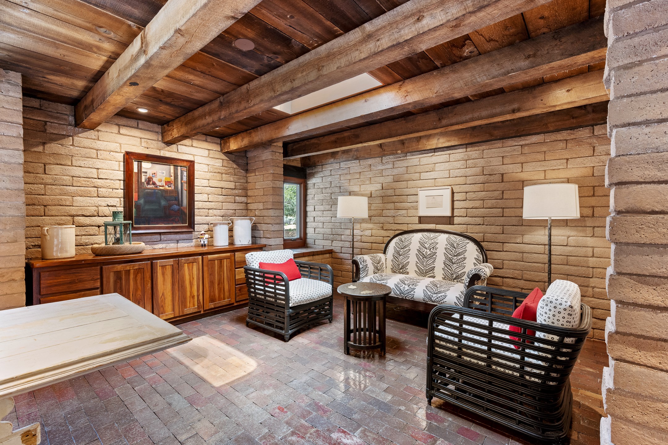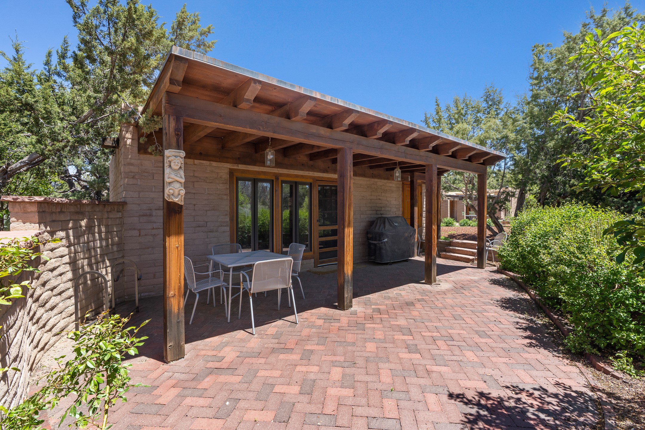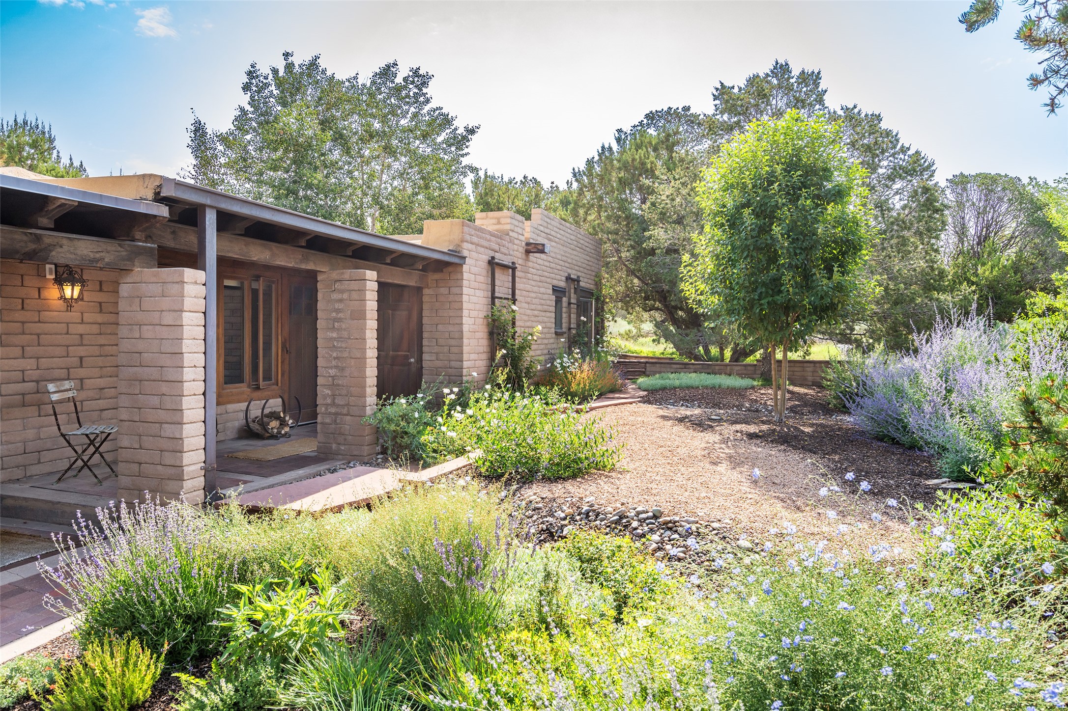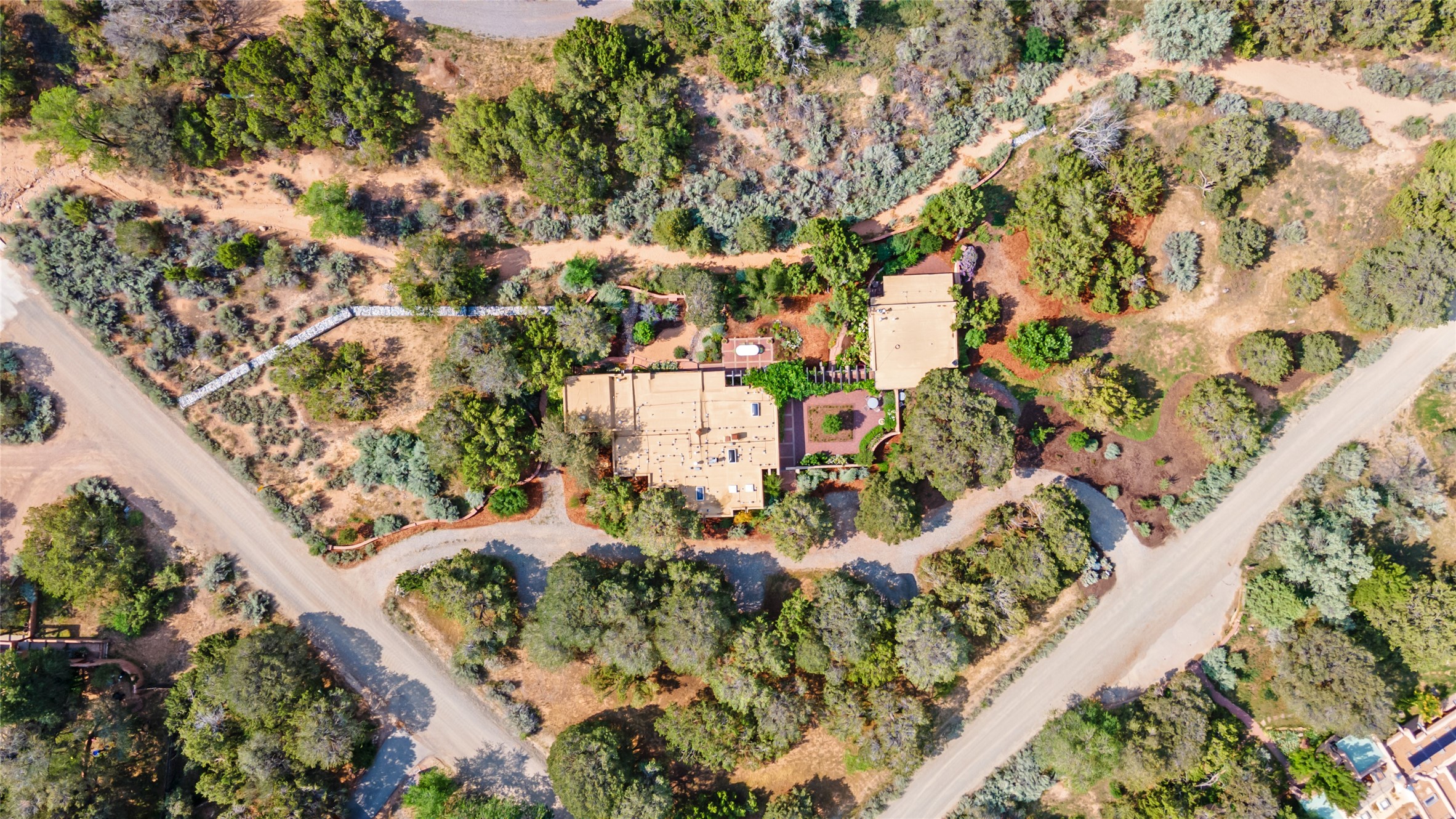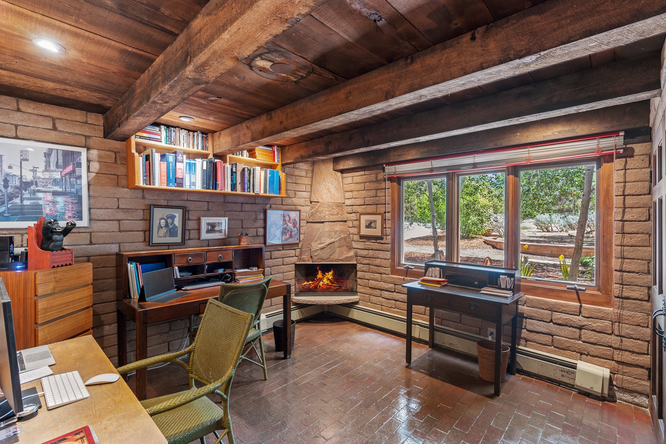 Nestled on 1.46 acres in the coveted Sol Y Lomas neighborhood, this exceptional property blends the earthy beauty of the Southwest with organic lines reminiscent of Frank Lloyd Wright. Thoughtfully curated by a master gardener, the grounds bloom with color and life--an oasis of natural wonder. Lovingly owned by the same family since 1978, the property includes an updated 2-bedroom, 2-bathroom main house (2,063 sq. ft.) and a charming 1-bedroom, 1-bathroom guest house (563 sq. ft.), connected by a breezeway draped in grapevines. Inside the main house, brick flooring and beamed ceilings carry a sense of grounded elegance throughout. At the heart of the home is the kitchen, with open shelving that connects seamlessly to the generous dining and sitting areas--perfect for casual gatherings or quiet evenings. The main living room, with views of the lush front courtyard, is anchored by a wood-burning fireplace and exudes warmth and comfort. The primary suite also features a fireplace and direct access to the western patio, inviting you to enjoy the surrounding beauty. Its bathroom is filled with natural light and includes a sculpted vessel soaking tub and a glass-walled walk-in shower. The guest bedroom, currently used as an office, offers yet another fireplace and the same warm, organic charm. The guest house feels like a step back in time, with its vintage full kitchen, spacious bedroom with ensuite bath, and access to a private patio--ideal for guests or creative retreat space. With timeless presence and inspired design, this remarkable property is a sanctuary of comfort, natural elegance, and casual sophistication.
