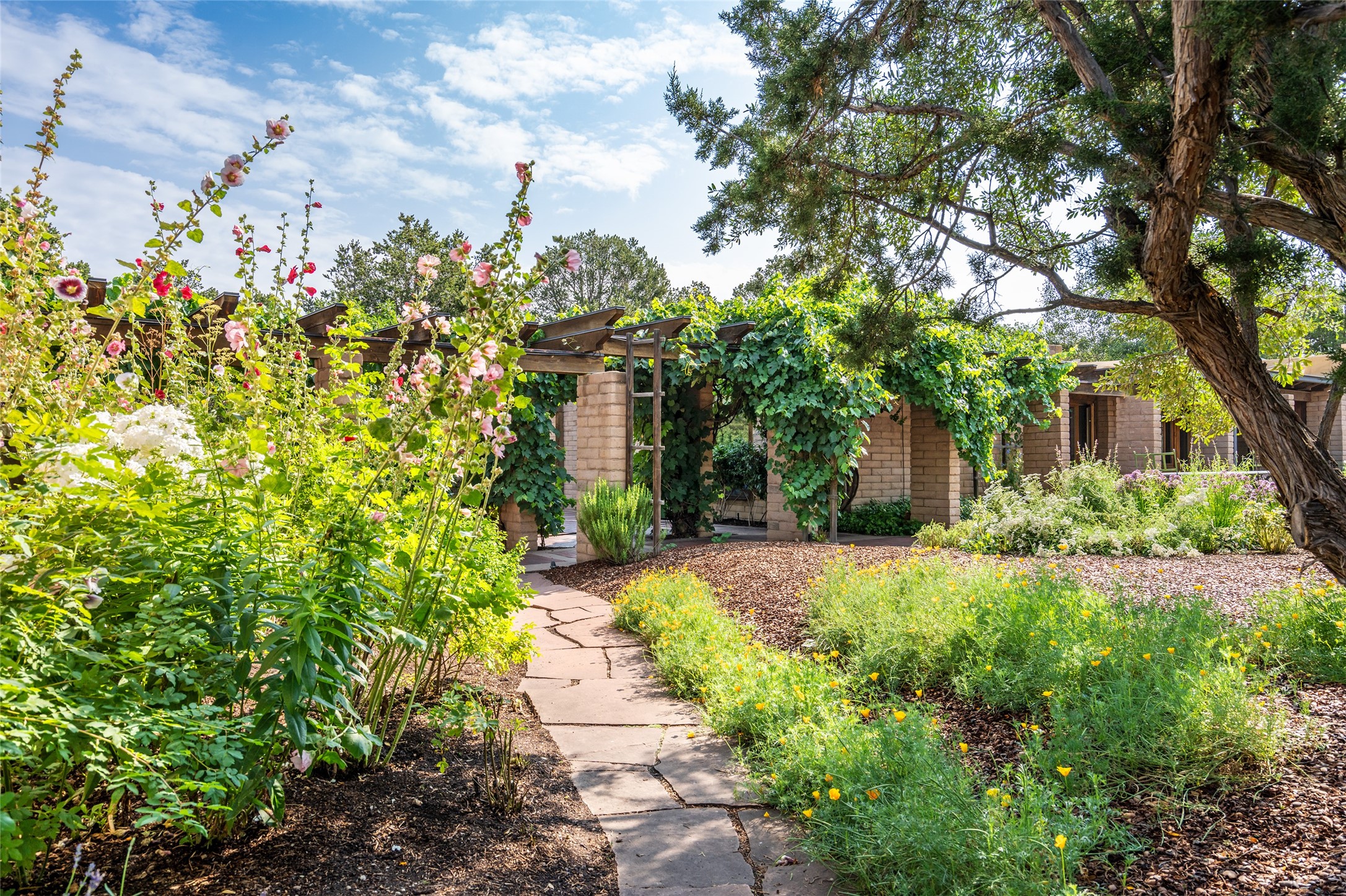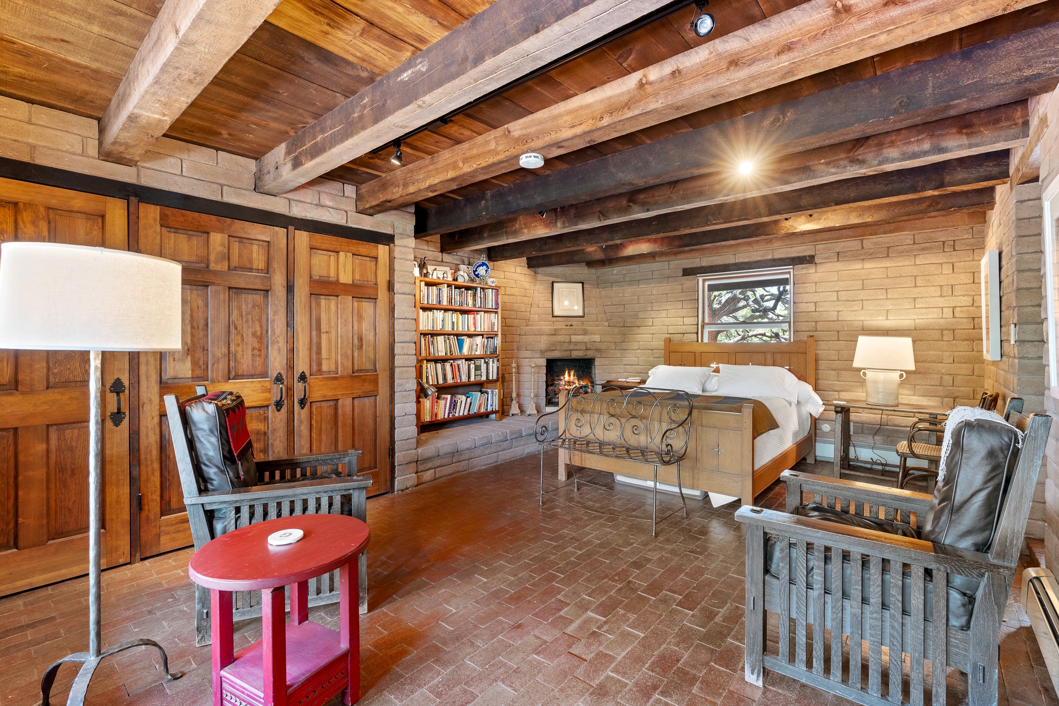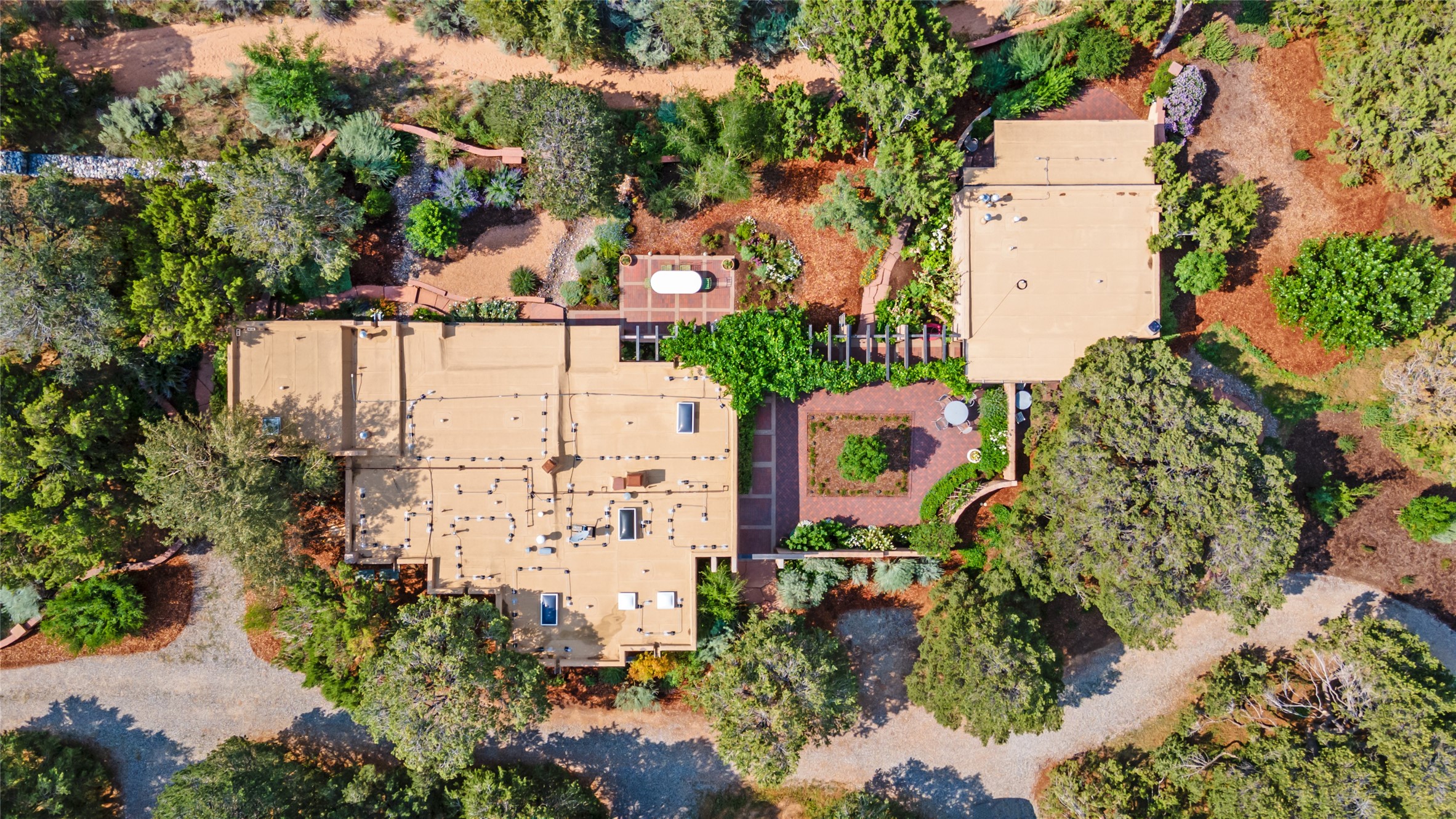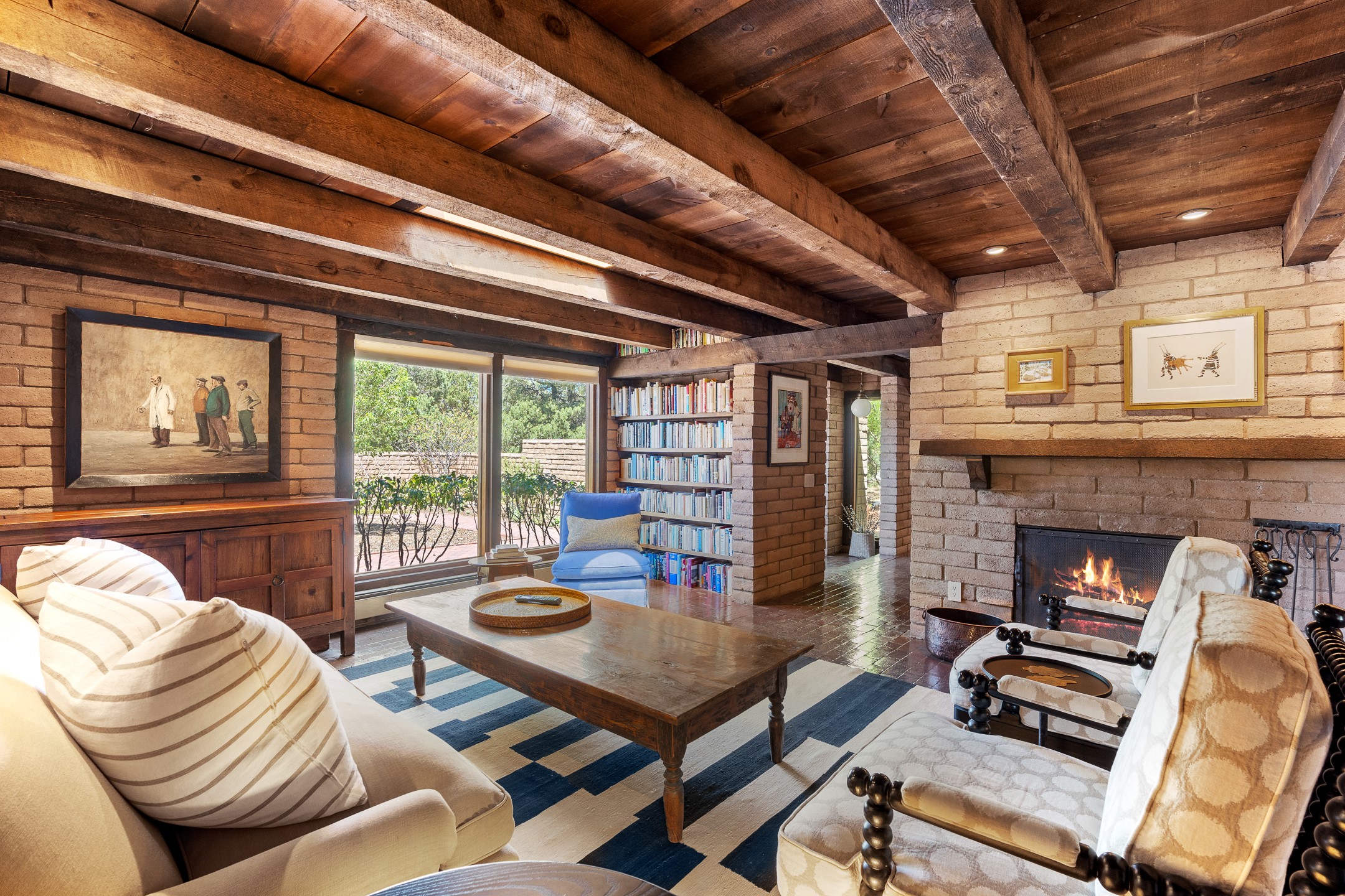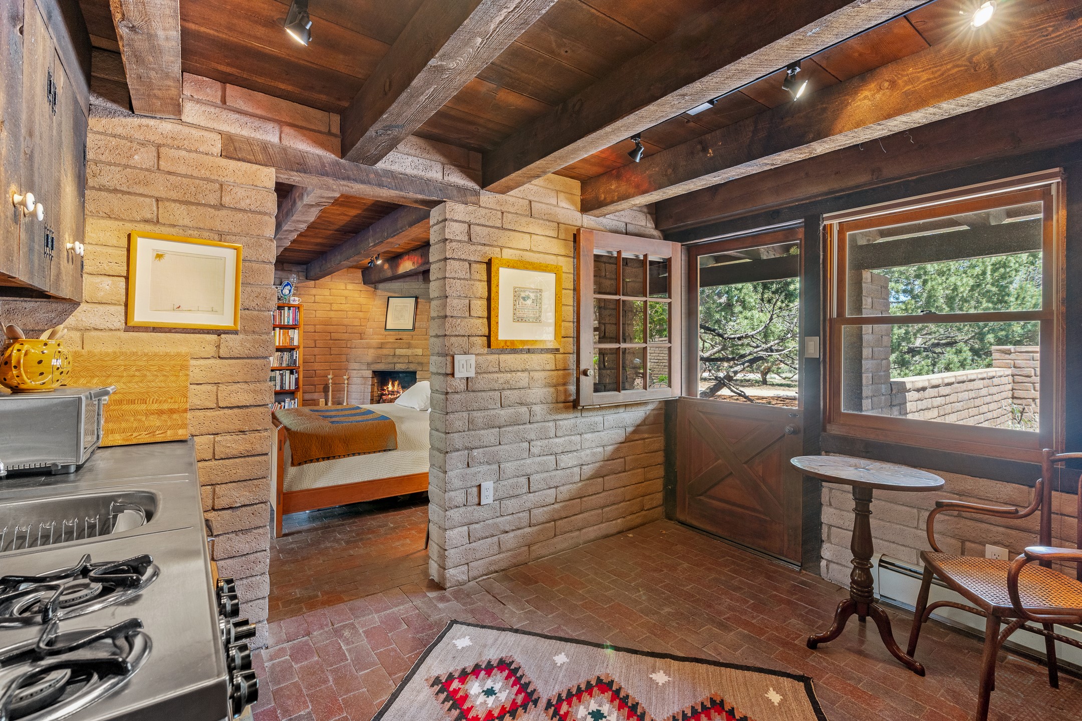 Nestled on 1.46 acres in the coveted Sol Y Lomas neighborhood, this exceptional property blends the earthy beauty of the Southwest with organic lines reminiscent of Frank Lloyd Wright. Thoughtfully curated by a master gardener, the grounds bloom with color and life--an oasis of natural wonder. Lovingly owned by the same family since 1978, the property includes an updated 2-bedroom, 2-bathroom main house (2,063 sq. ft.) and a charming 1-bedroom, 1-bathroom guest house (563 sq. ft.), connected by a breezeway draped in grapevines. Inside the main house, brick flooring and beamed ceilings carry a sense of grounded elegance throughout. At the heart of the home is the kitchen, with open shelving that connects seamlessly to the generous dining and sitting areas--perfect for casual gatherings or quiet evenings. The main living room, with views of the lush front courtyard, is anchored by a wood-burning fireplace and exudes warmth and comfort. The primary suite also features a fireplace and direct access to the western patio, inviting you to enjoy the surrounding beauty. Its bathroom is filled with natural light and includes a sculpted vessel soaking tub and a glass-walled walk-in shower. The guest bedroom, currently used as an office, offers yet another fireplace and the same warm, organic charm. The guest house feels like a step back in time, with its vintage full kitchen, spacious bedroom with ensuite bath, and access to a private patio--ideal for guests or creative retreat space. With timeless presence and inspired design, this remarkable property is a sanctuary of comfort, natural elegance, and casual sophistication.