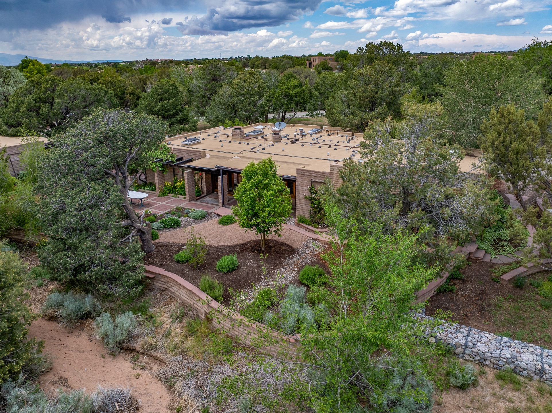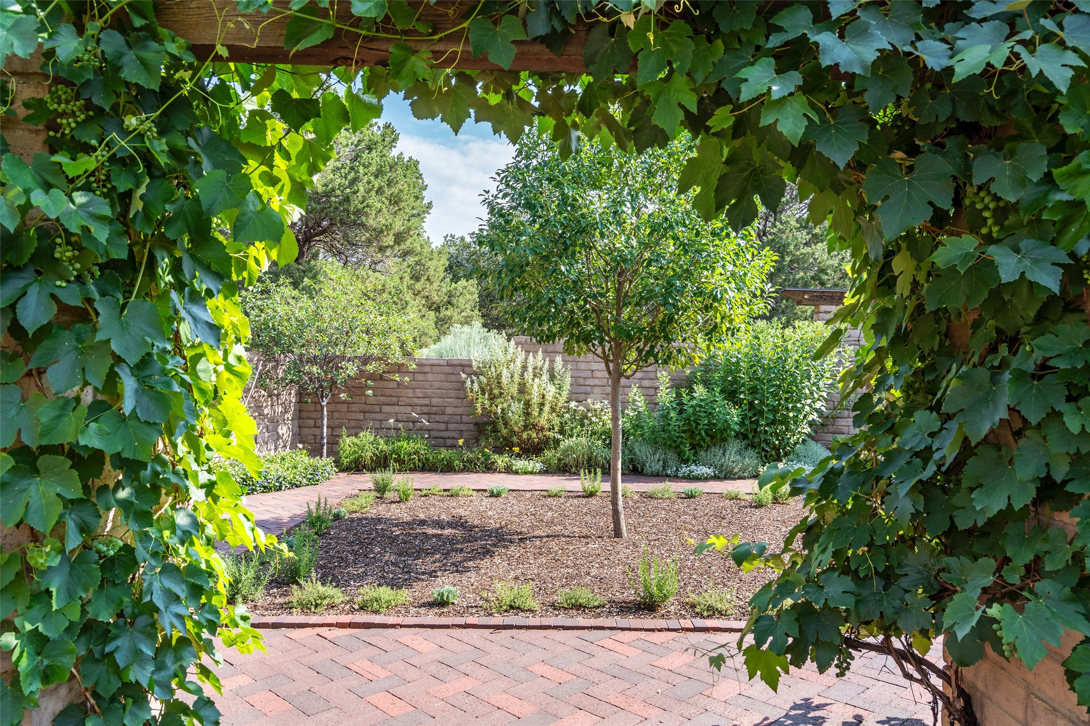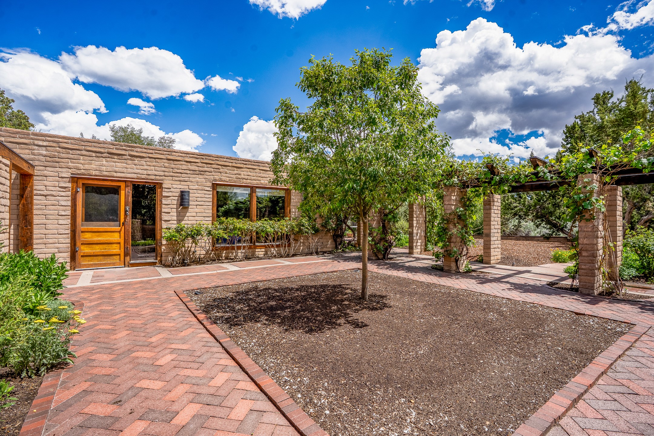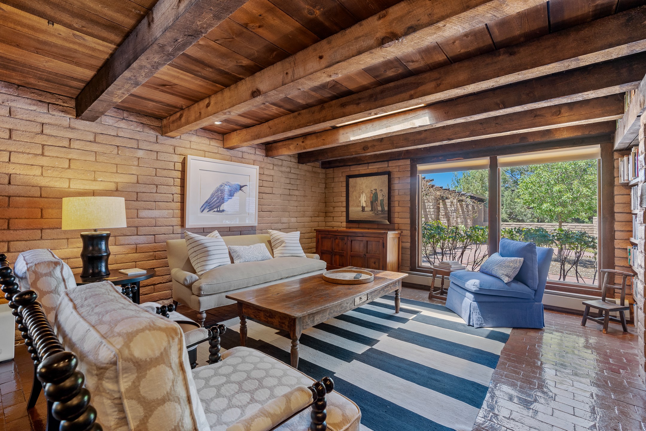 Nestled on 1.46 acres in the coveted Sol Y Lomas neighborhood, this exceptional property blends the earthy beauty of the Southwest with organic lines reminiscent of Frank Lloyd Wright. Thoughtfully curated by a master gardener, the grounds bloom with color and life--an oasis of natural wonder. Lovingly owned by the same family since 1978, the property includes an updated 2-bedroom, 2-bathroom main house (2,063 sq. ft.) and a charming 1-bedroom, 1-bathroom guest house (563 sq. ft.), connected by a breezeway draped in grapevines. Inside the main house, brick flooring and beamed ceilings carry a sense of grounded elegance throughout. At the heart of the home is the kitchen, with open shelving that connects seamlessly to the generous dining and sitting areas--perfect for casual gatherings or quiet evenings. The main living room, with views of the lush front courtyard, is anchored by a wood-burning fireplace and exudes warmth and comfort. The primary suite also features a fireplace and direct access to the western patio, inviting you to enjoy the surrounding beauty. Its bathroom is filled with natural light and includes a sculpted vessel soaking tub and a glass-walled walk-in shower. The guest bedroom, currently used as an office, offers yet another fireplace and the same warm, organic charm. The guest house feels like a step back in time, with its vintage full kitchen, spacious bedroom with ensuite bath, and access to a private patio--ideal for guests or creative retreat space. With timeless presence and inspired design, this remarkable property is a sanctuary of comfort, natural elegance, and casual sophistication.