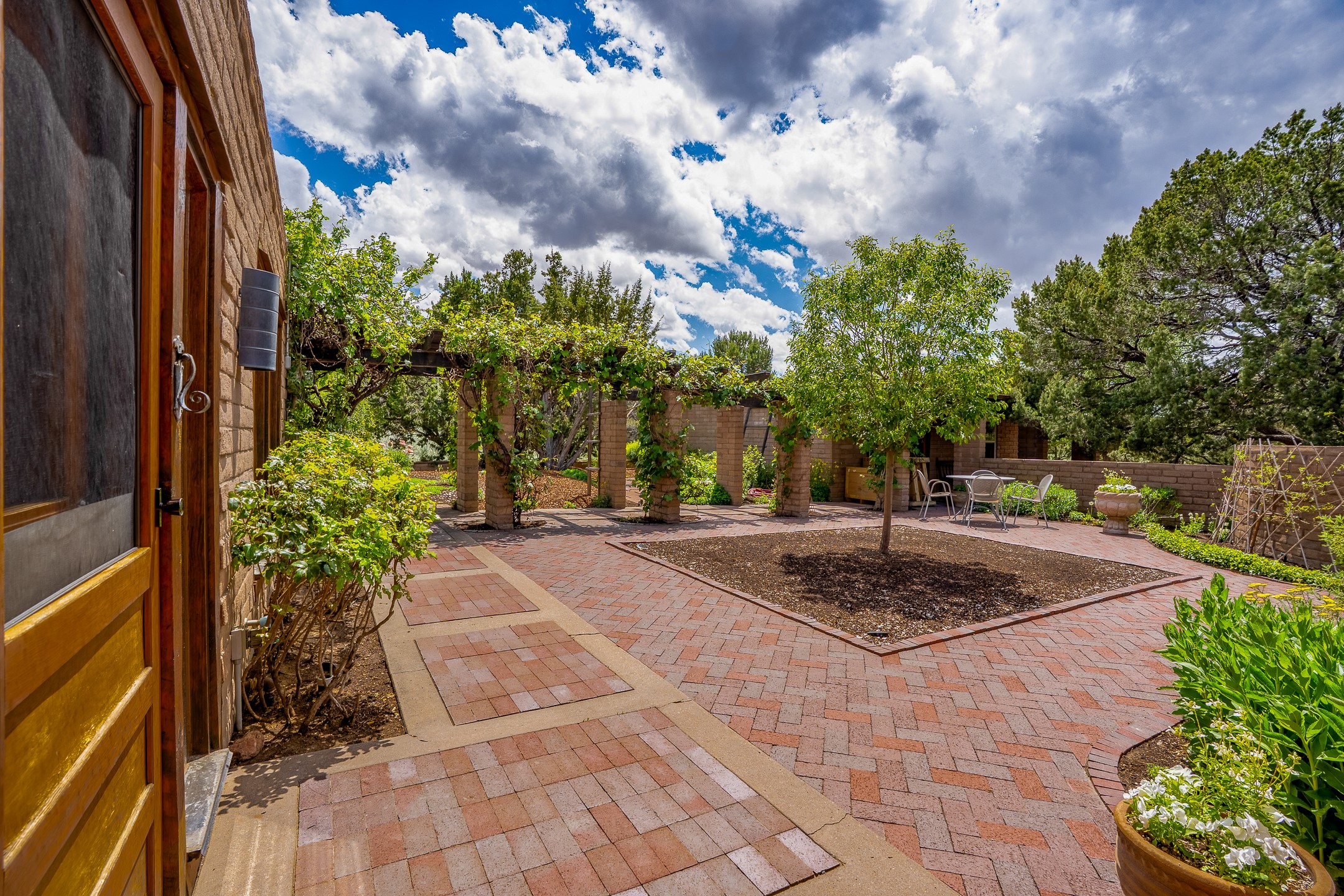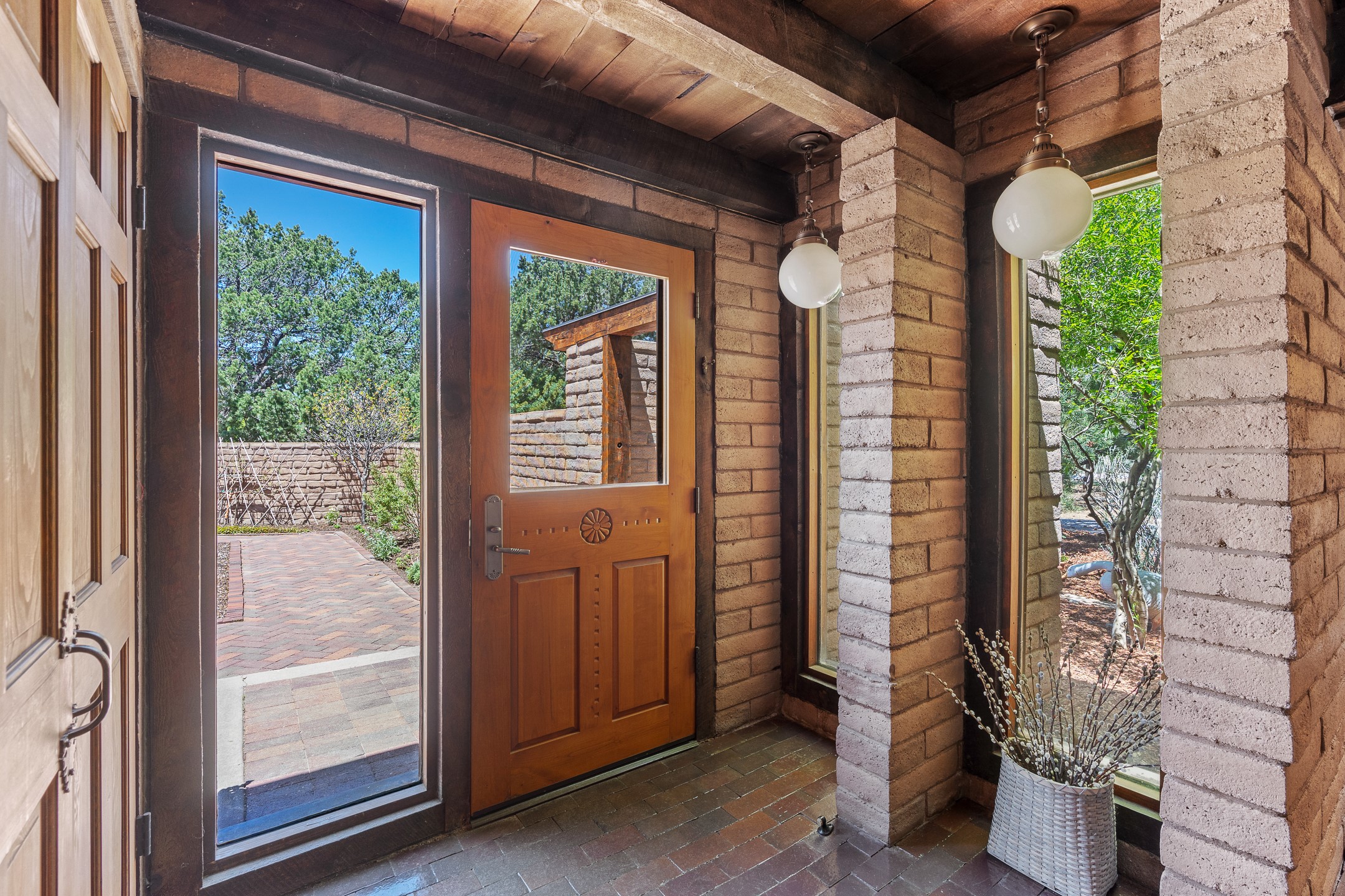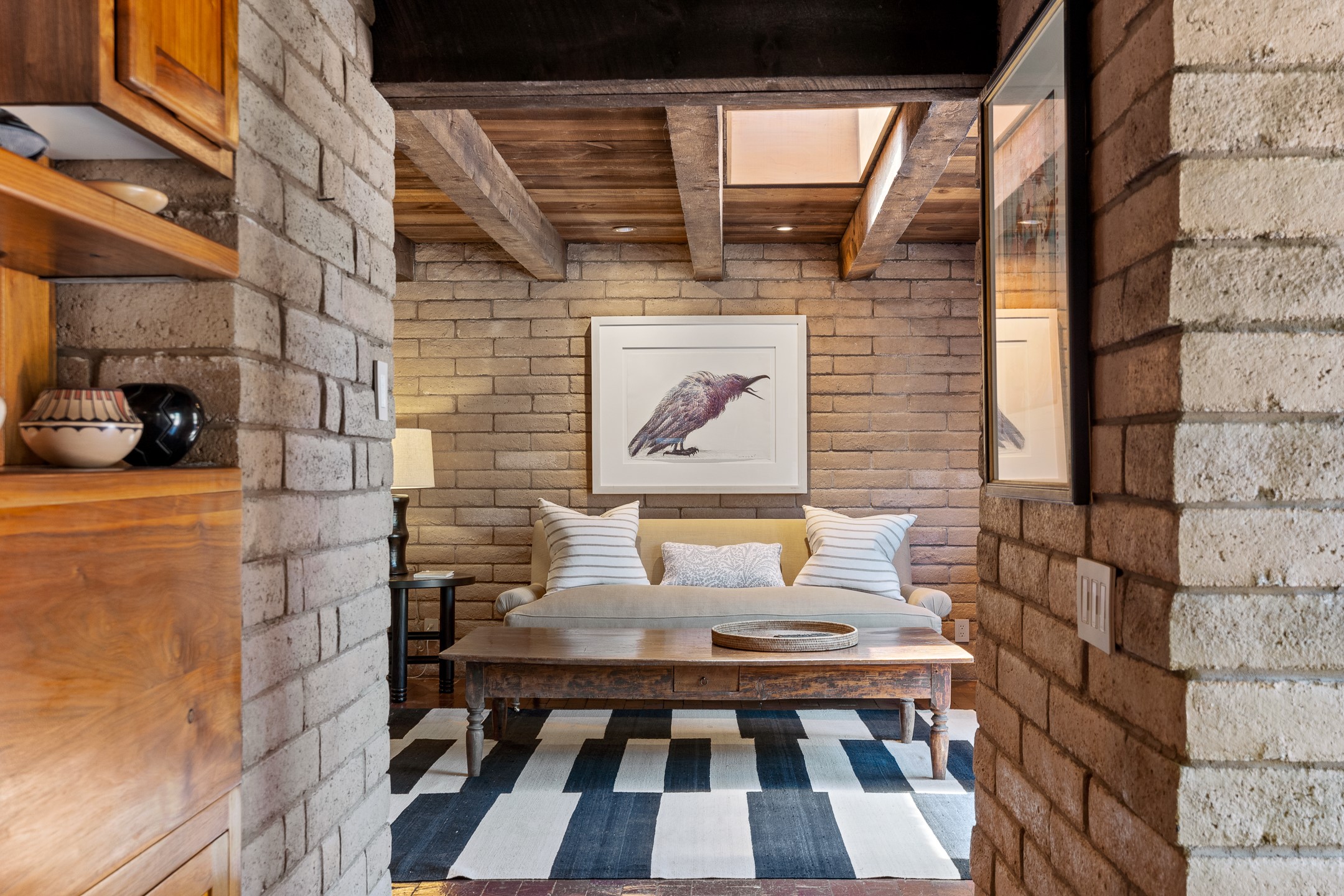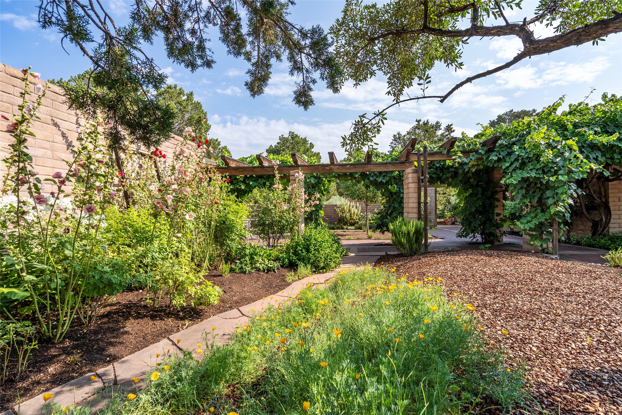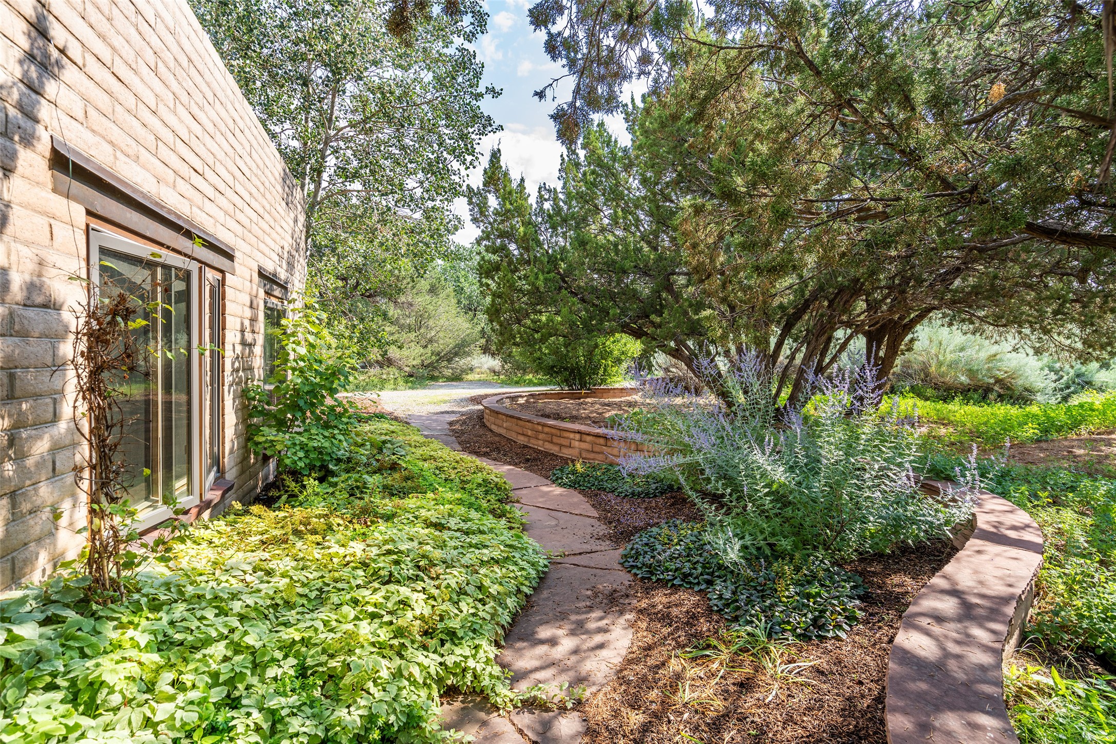 Nestled on 1.46 acres in the coveted Sol Y Lomas neighborhood, this exceptional property blends the earthy beauty of the Southwest with organic lines reminiscent of Frank Lloyd Wright. Thoughtfully curated by a master gardener, the grounds bloom with color and life--an oasis of natural wonder. Lovingly owned by the same family since 1978, the property includes an updated 2-bedroom, 2-bathroom main house (2,063 sq. ft.) and a charming 1-bedroom, 1-bathroom guest house (563 sq. ft.), connected by a breezeway draped in grapevines. Inside the main house, brick flooring and beamed ceilings carry a sense of grounded elegance throughout. At the heart of the home is the kitchen, with open shelving that connects seamlessly to the generous dining and sitting areas--perfect for casual gatherings or quiet evenings. The main living room, with views of the lush front courtyard, is anchored by a wood-burning fireplace and exudes warmth and comfort. The primary suite also features a fireplace and direct access to the western patio, inviting you to enjoy the surrounding beauty. Its bathroom is filled with natural light and includes a sculpted vessel soaking tub and a glass-walled walk-in shower. The guest bedroom, currently used as an office, offers yet another fireplace and the same warm, organic charm. The guest house feels like a step back in time, with its vintage full kitchen, spacious bedroom with ensuite bath, and access to a private patio--ideal for guests or creative retreat space. With timeless presence and inspired design, this remarkable property is a sanctuary of comfort, natural elegance, and casual sophistication.