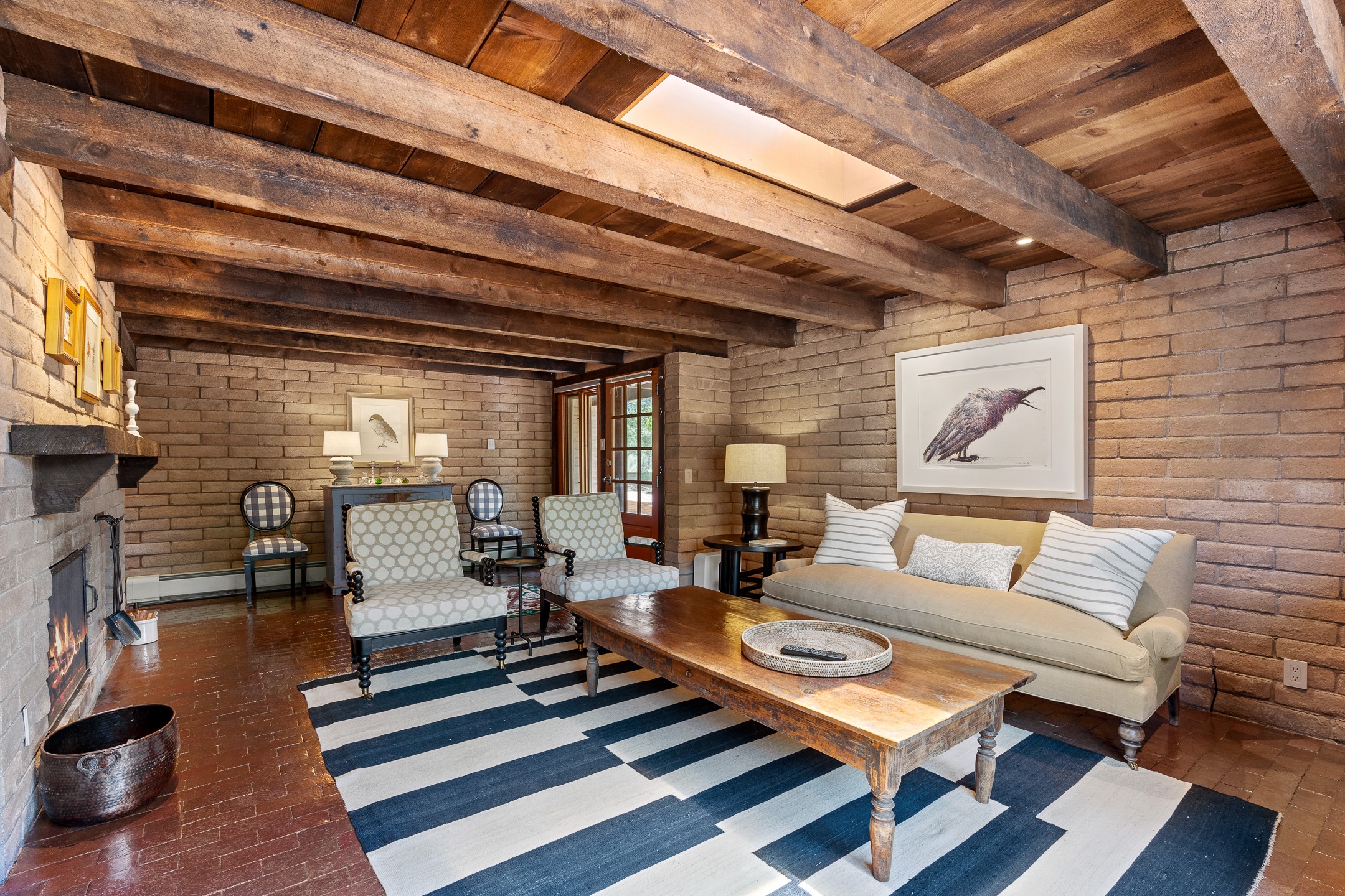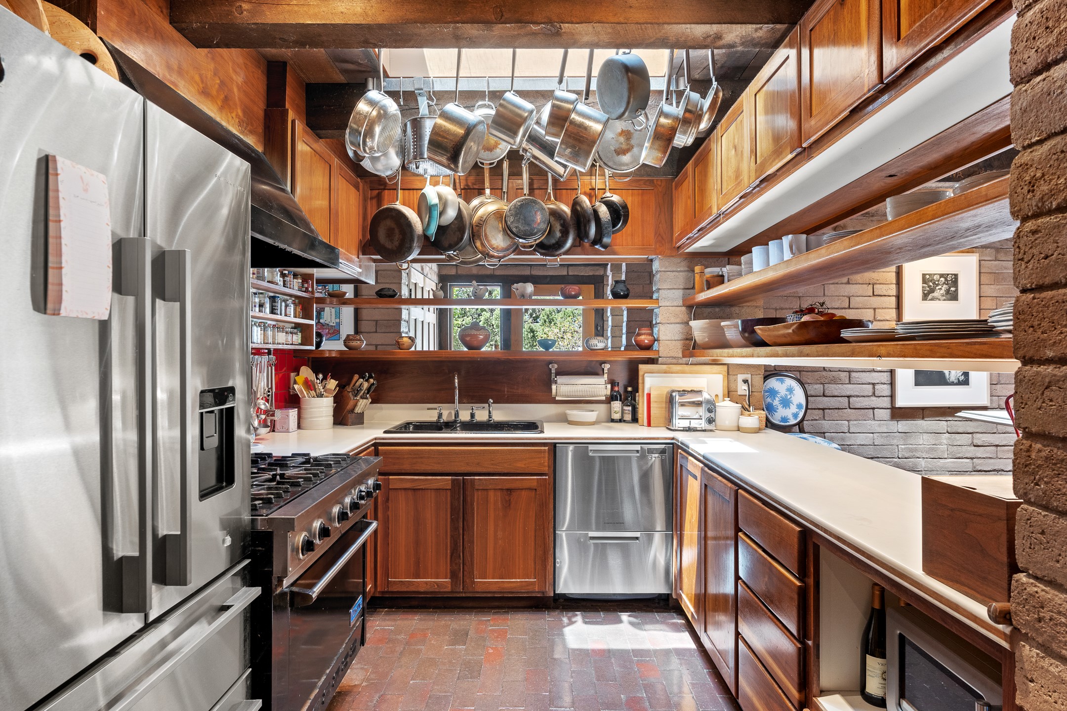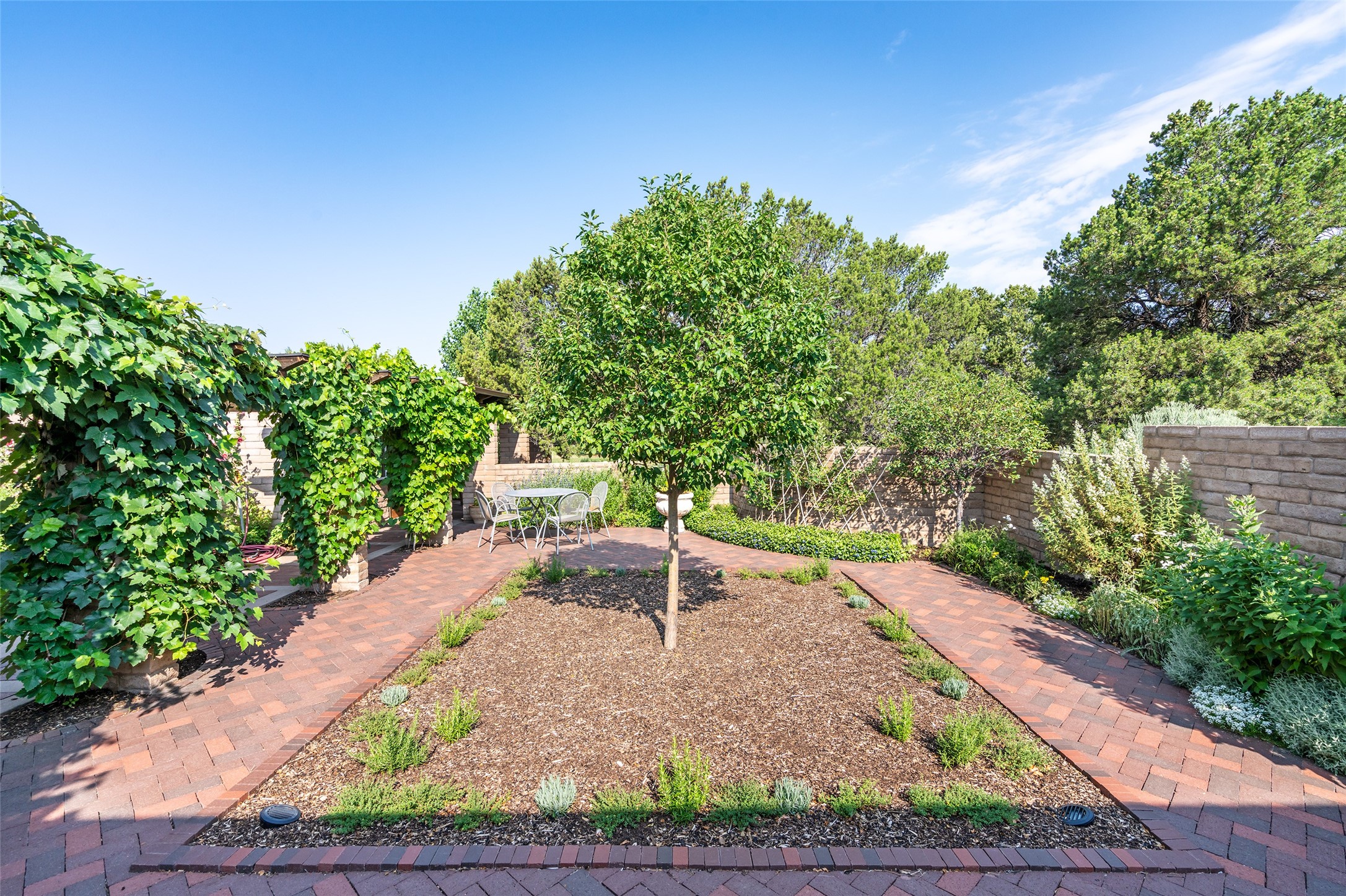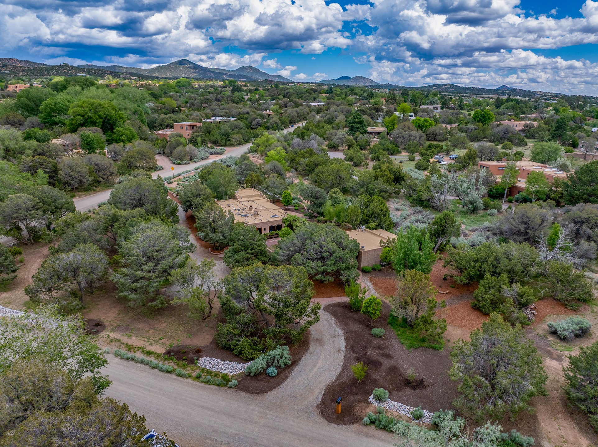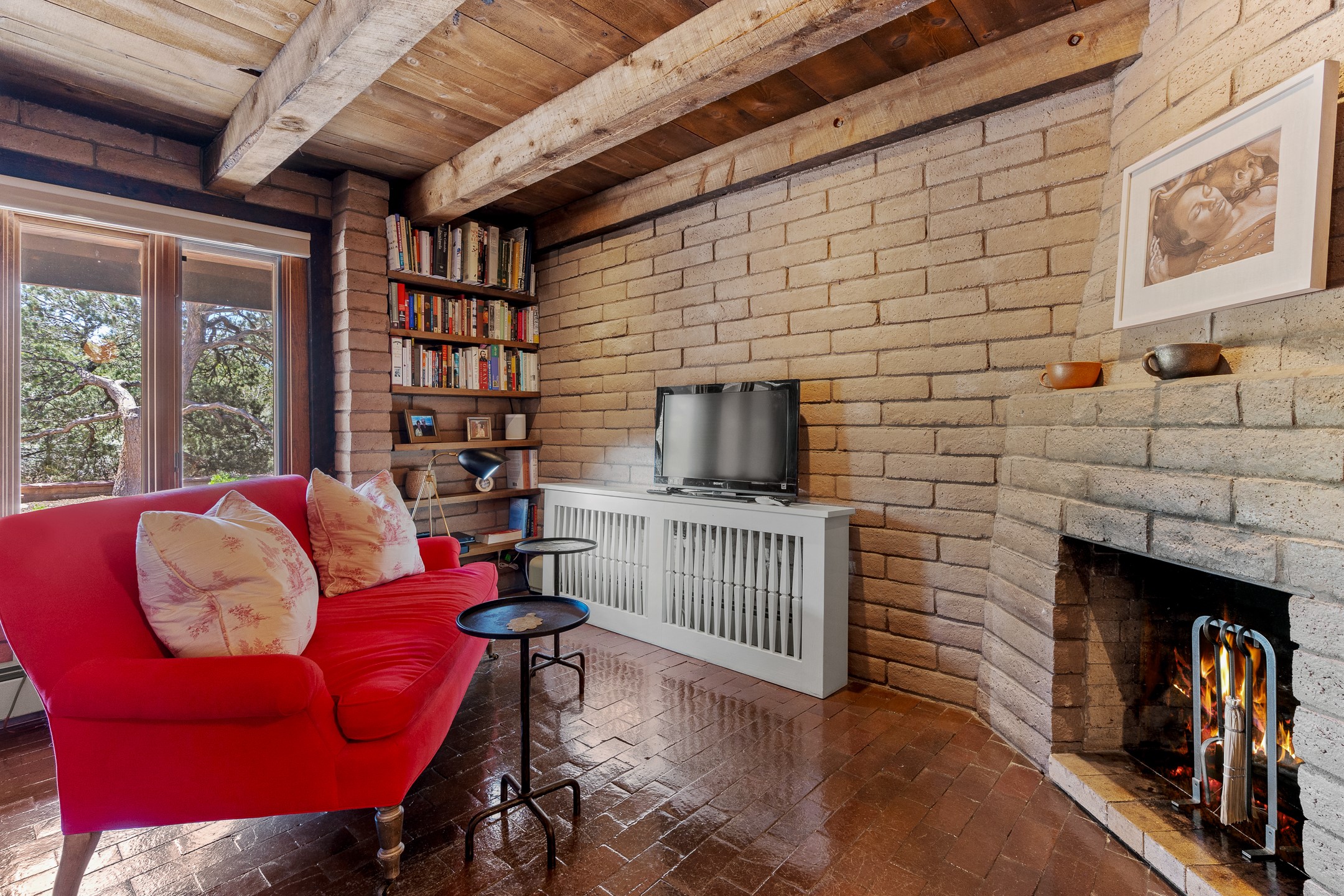 Nestled on 1.46 acres in the coveted Sol Y Lomas neighborhood, this exceptional property blends the earthy beauty of the Southwest with organic lines reminiscent of Frank Lloyd Wright. Thoughtfully curated by a master gardener, the grounds bloom with color and life--an oasis of natural wonder. Lovingly owned by the same family since 1978, the property includes an updated 2-bedroom, 2-bathroom main house (2,063 sq. ft.) and a charming 1-bedroom, 1-bathroom guest house (563 sq. ft.), connected by a breezeway draped in grapevines. Inside the main house, brick flooring and beamed ceilings carry a sense of grounded elegance throughout. At the heart of the home is the kitchen, with open shelving that connects seamlessly to the generous dining and sitting areas--perfect for casual gatherings or quiet evenings. The main living room, with views of the lush front courtyard, is anchored by a wood-burning fireplace and exudes warmth and comfort. The primary suite also features a fireplace and direct access to the western patio, inviting you to enjoy the surrounding beauty. Its bathroom is filled with natural light and includes a sculpted vessel soaking tub and a glass-walled walk-in shower. The guest bedroom, currently used as an office, offers yet another fireplace and the same warm, organic charm. The guest house feels like a step back in time, with its vintage full kitchen, spacious bedroom with ensuite bath, and access to a private patio--ideal for guests or creative retreat space. With timeless presence and inspired design, this remarkable property is a sanctuary of comfort, natural elegance, and casual sophistication.