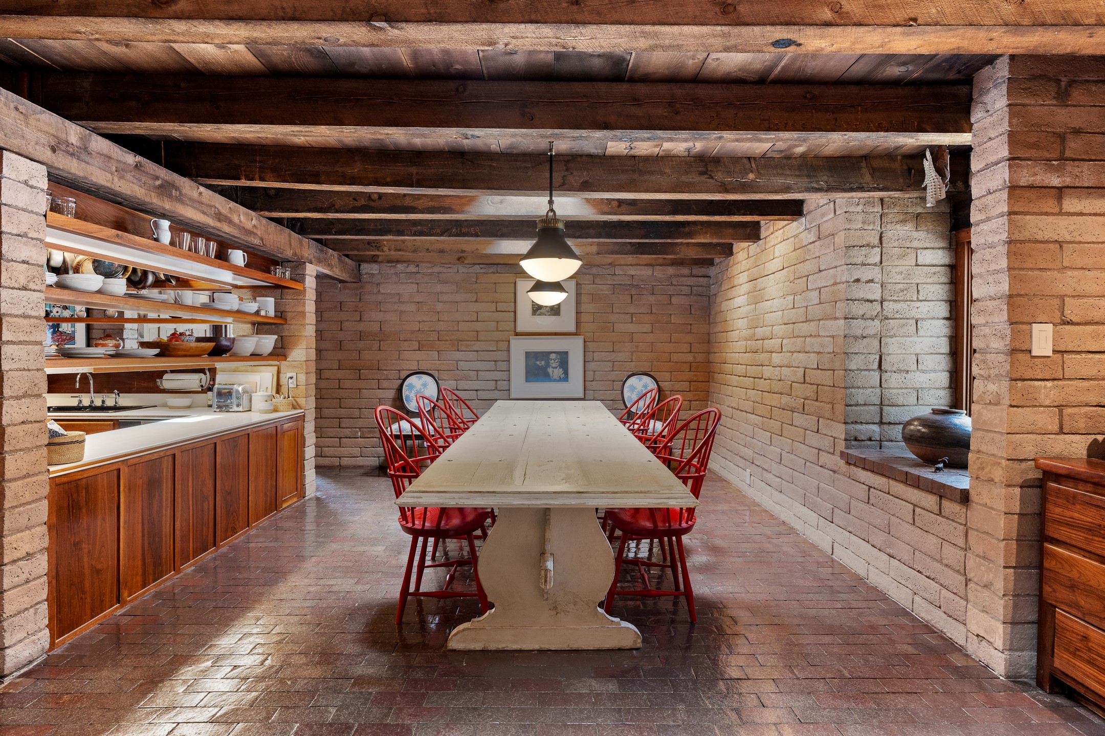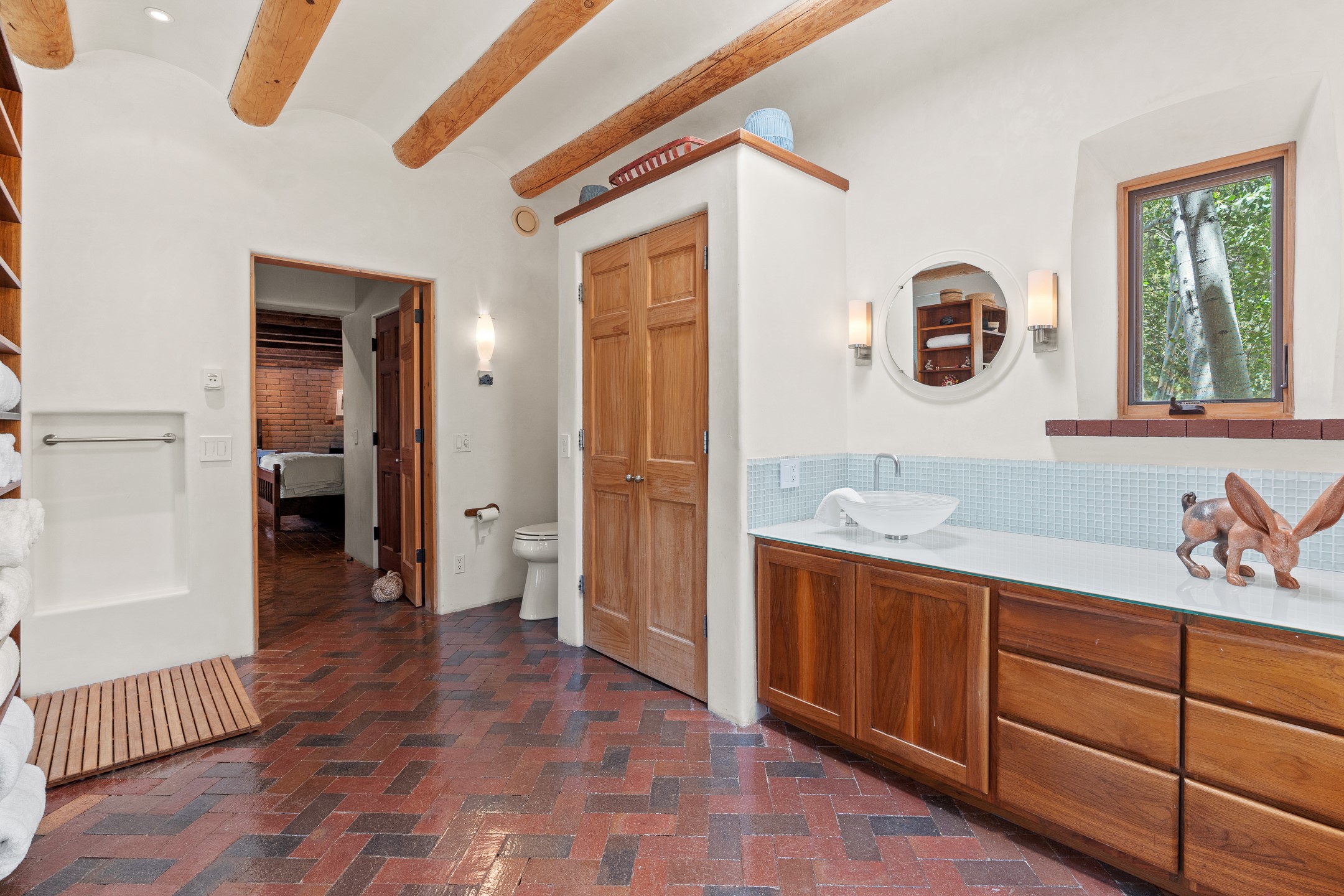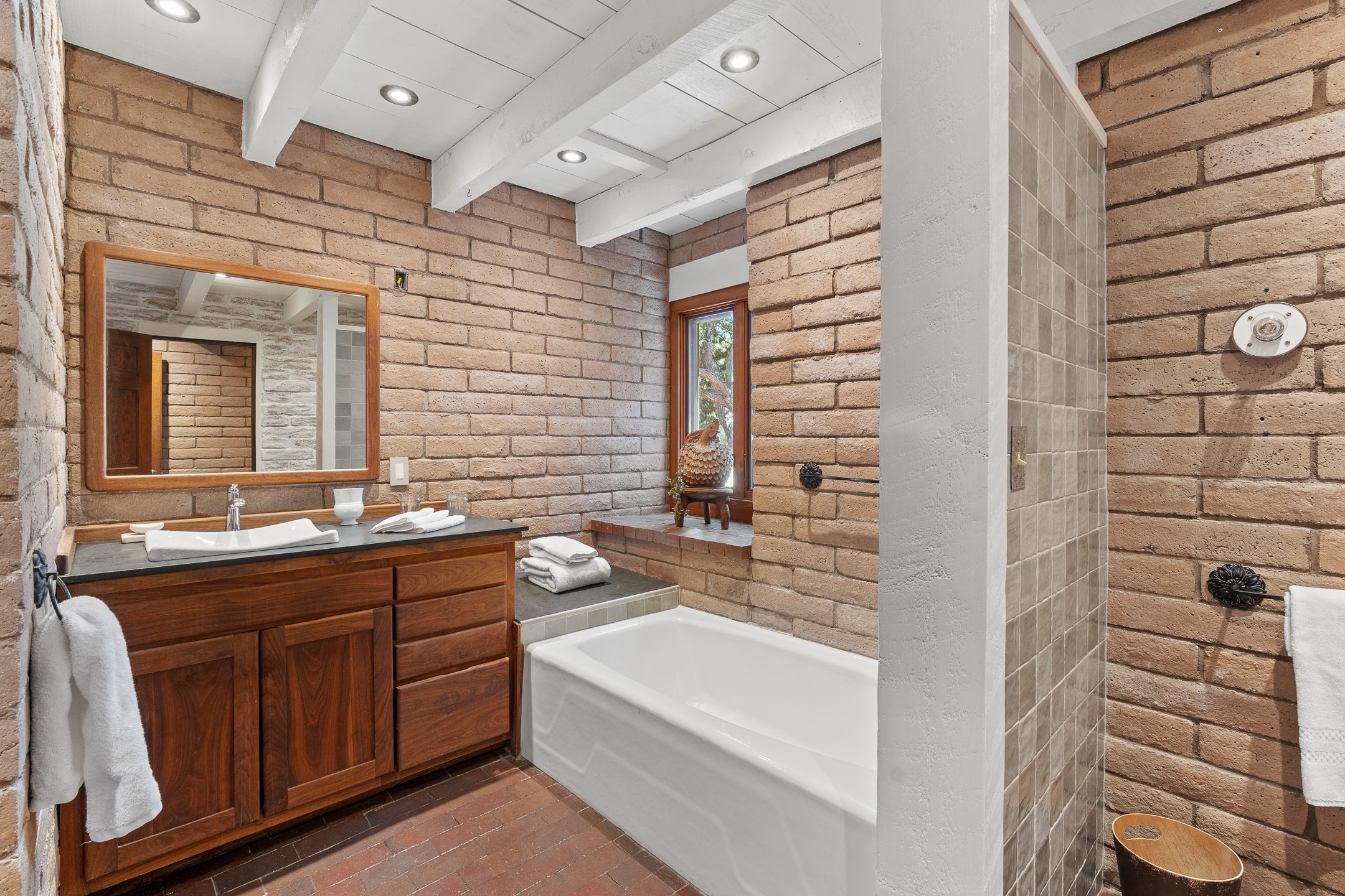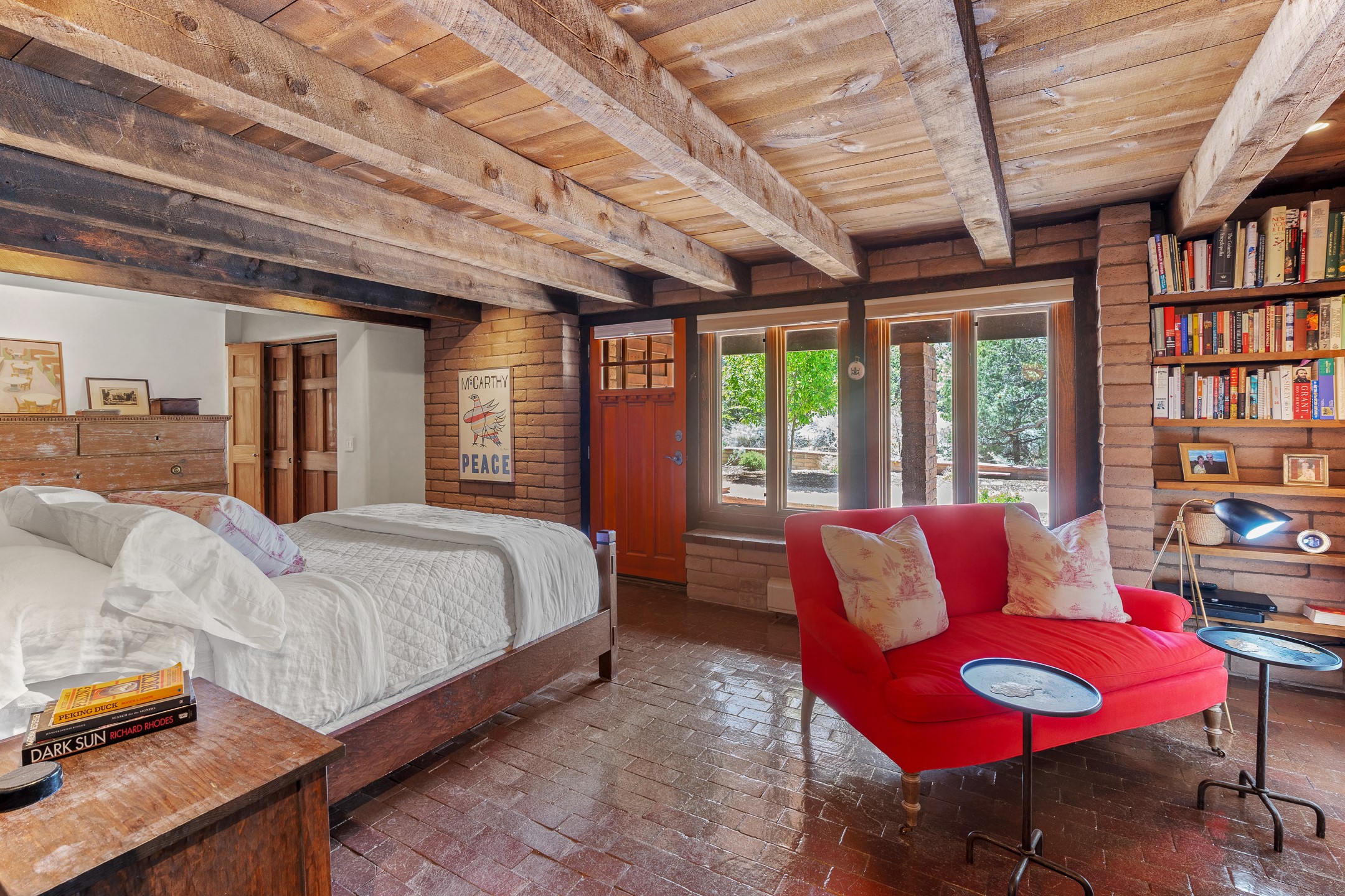 Nestled on 1.46 acres in the coveted Sol Y Lomas neighborhood, this exceptional property blends the earthy beauty of the Southwest with organic lines reminiscent of Frank Lloyd Wright. Thoughtfully curated by a master gardener, the grounds bloom with color and life--an oasis of natural wonder. Lovingly owned by the same family since 1978, the property includes an updated 2-bedroom, 2-bathroom main house (2,063 sq. ft.) and a charming 1-bedroom, 1-bathroom guest house (563 sq. ft.), connected by a breezeway draped in grapevines. Inside the main house, brick flooring and beamed ceilings carry a sense of grounded elegance throughout. At the heart of the home is the kitchen, with open shelving that connects seamlessly to the generous dining and sitting areas--perfect for casual gatherings or quiet evenings. The main living room, with views of the lush front courtyard, is anchored by a wood-burning fireplace and exudes warmth and comfort. The primary suite also features a fireplace and direct access to the western patio, inviting you to enjoy the surrounding beauty. Its bathroom is filled with natural light and includes a sculpted vessel soaking tub and a glass-walled walk-in shower. The guest bedroom, currently used as an office, offers yet another fireplace and the same warm, organic charm. The guest house feels like a step back in time, with its vintage full kitchen, spacious bedroom with ensuite bath, and access to a private patio--ideal for guests or creative retreat space. With timeless presence and inspired design, this remarkable property is a sanctuary of comfort, natural elegance, and casual sophistication.