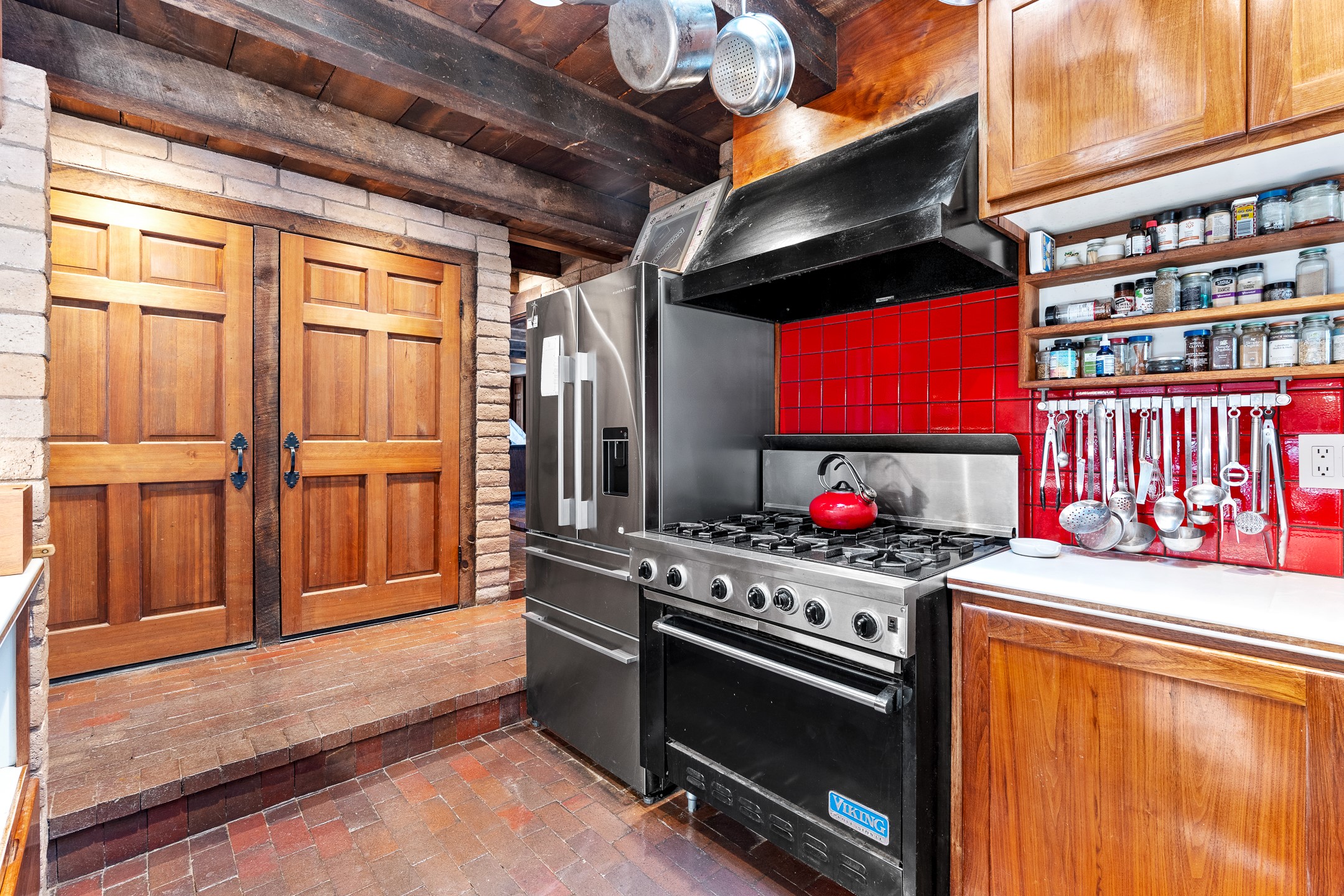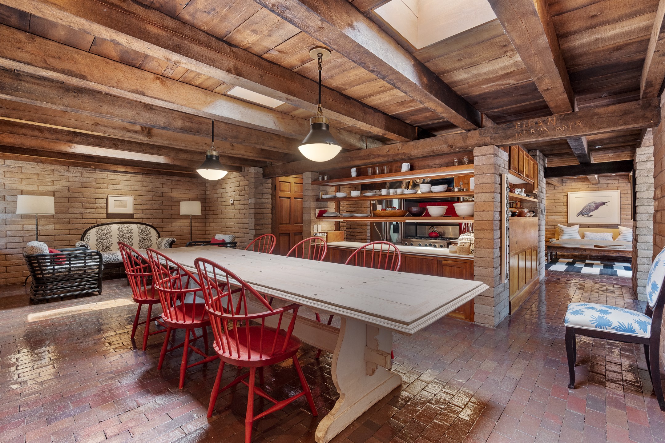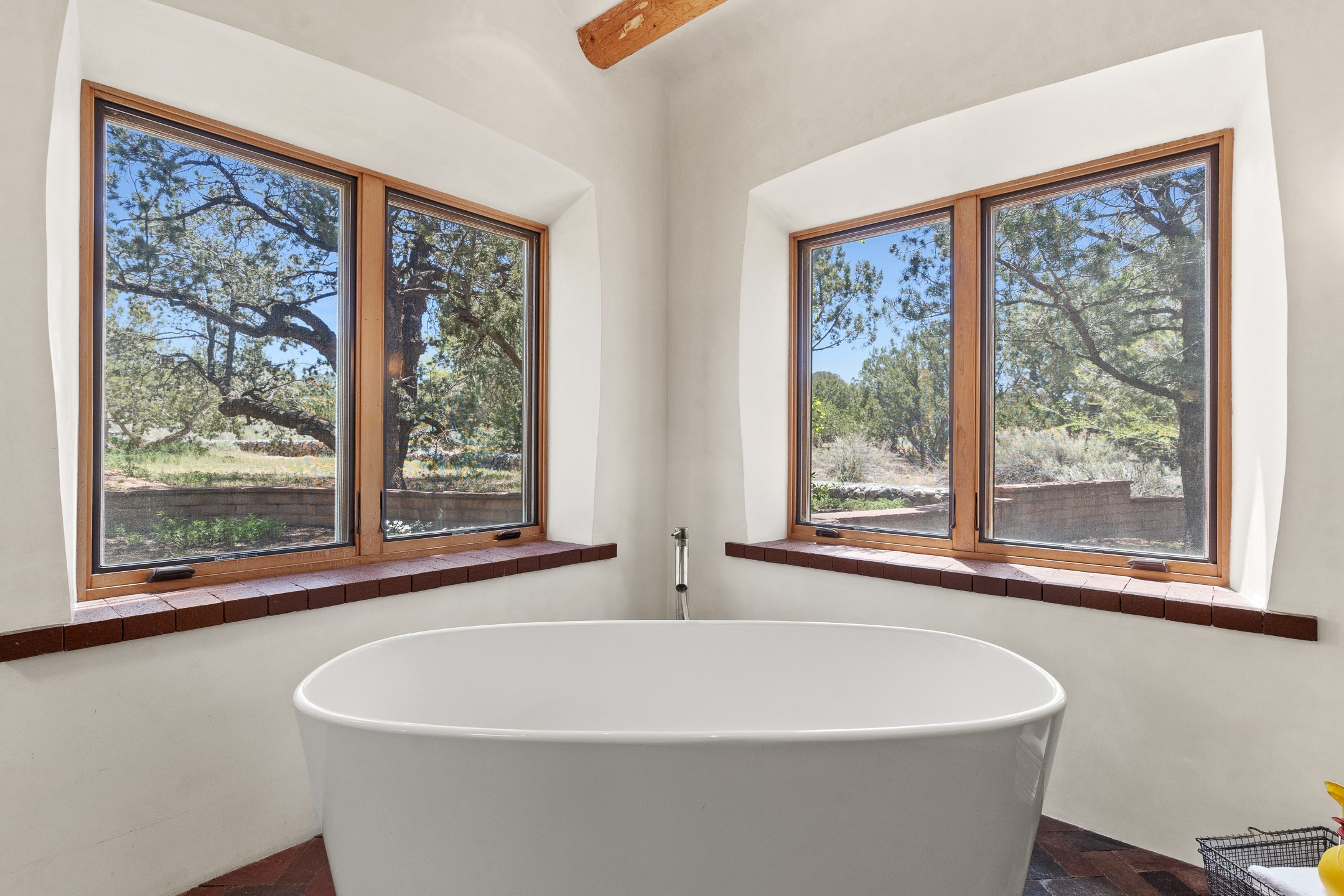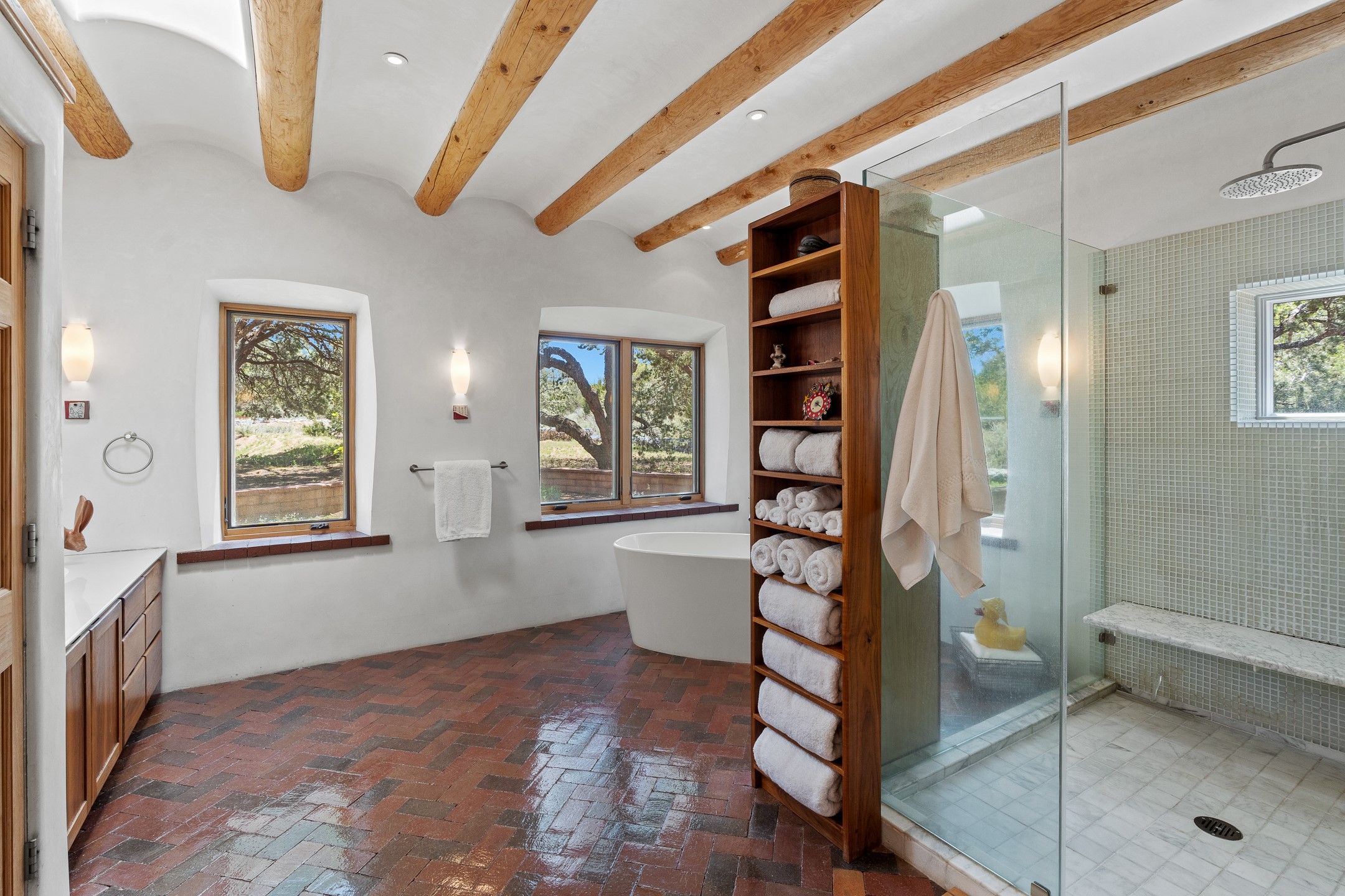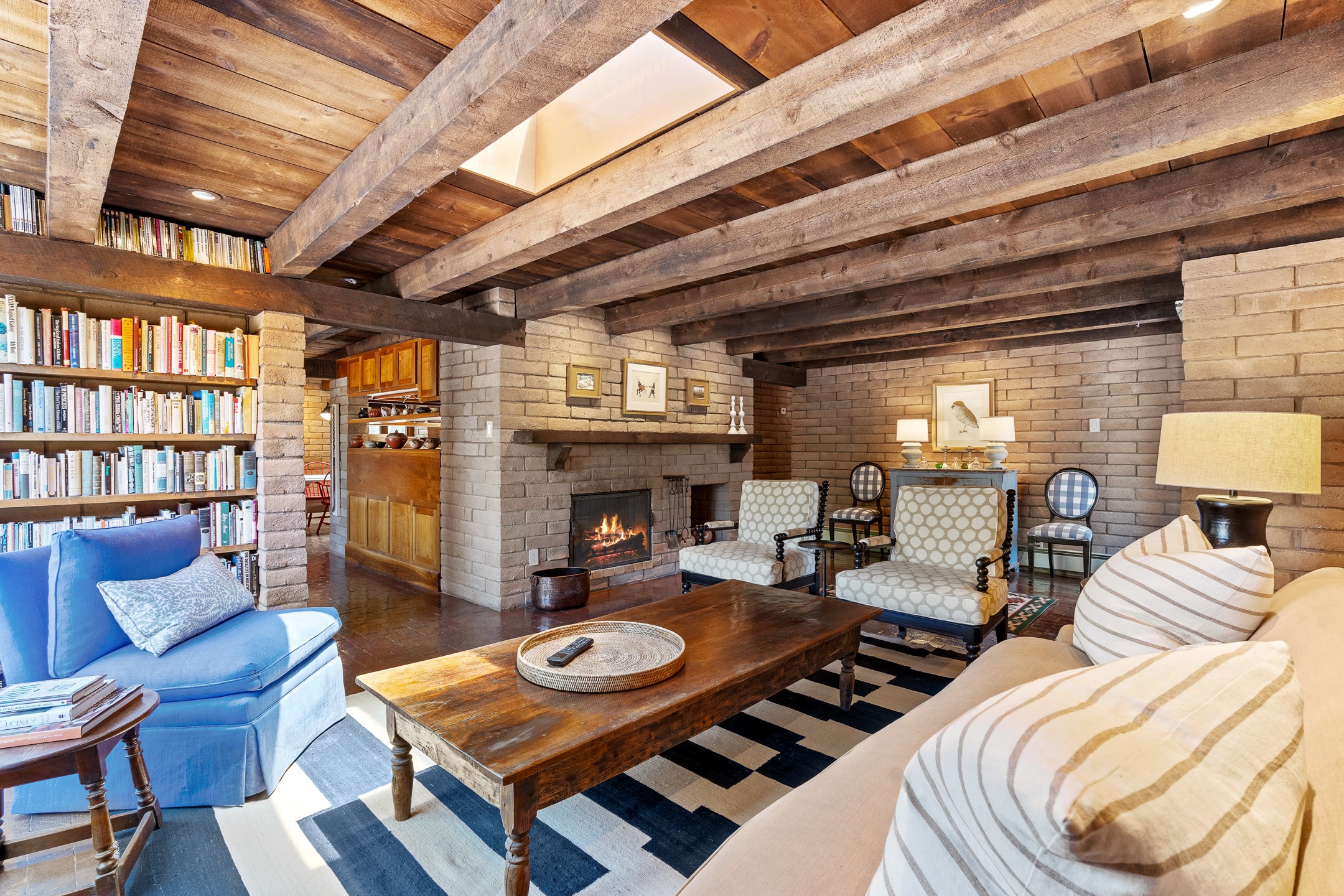 Nestled on 1.46 acres in the coveted Sol Y Lomas neighborhood, this exceptional property blends the earthy beauty of the Southwest with organic lines reminiscent of Frank Lloyd Wright. Thoughtfully curated by a master gardener, the grounds bloom with color and life--an oasis of natural wonder. Lovingly owned by the same family since 1978, the property includes an updated 2-bedroom, 2-bathroom main house (2,063 sq. ft.) and a charming 1-bedroom, 1-bathroom guest house (563 sq. ft.), connected by a breezeway draped in grapevines. Inside the main house, brick flooring and beamed ceilings carry a sense of grounded elegance throughout. At the heart of the home is the kitchen, with open shelving that connects seamlessly to the generous dining and sitting areas--perfect for casual gatherings or quiet evenings. The main living room, with views of the lush front courtyard, is anchored by a wood-burning fireplace and exudes warmth and comfort. The primary suite also features a fireplace and direct access to the western patio, inviting you to enjoy the surrounding beauty. Its bathroom is filled with natural light and includes a sculpted vessel soaking tub and a glass-walled walk-in shower. The guest bedroom, currently used as an office, offers yet another fireplace and the same warm, organic charm. The guest house feels like a step back in time, with its vintage full kitchen, spacious bedroom with ensuite bath, and access to a private patio--ideal for guests or creative retreat space. With timeless presence and inspired design, this remarkable property is a sanctuary of comfort, natural elegance, and casual sophistication.