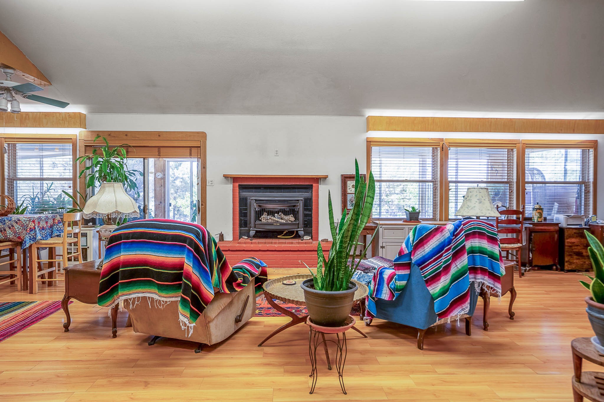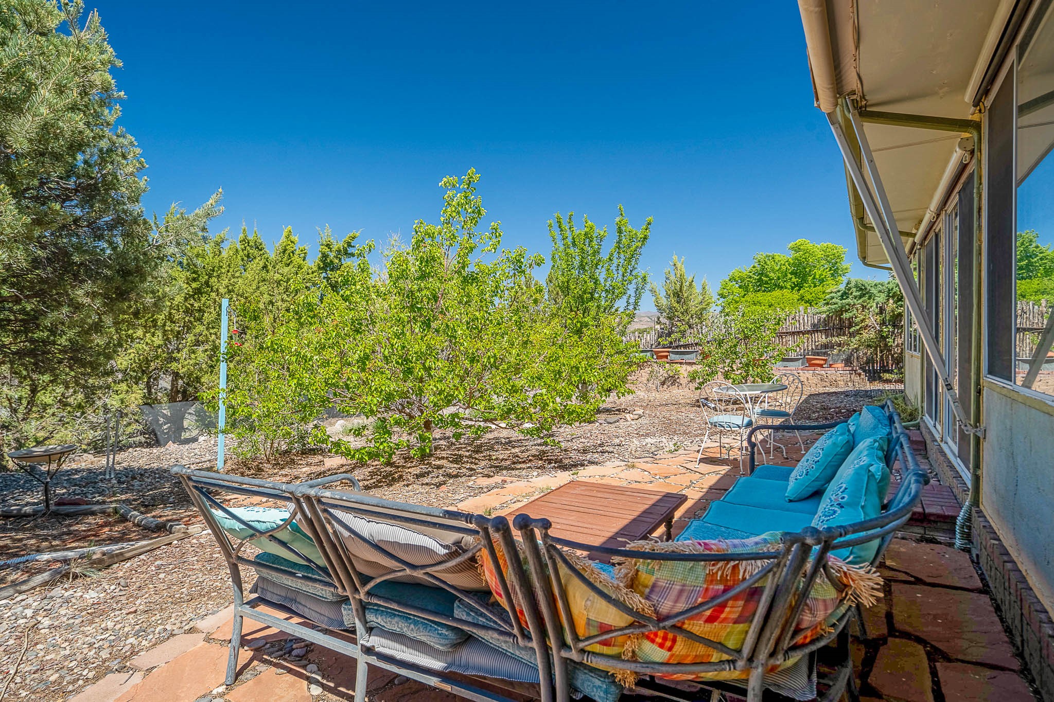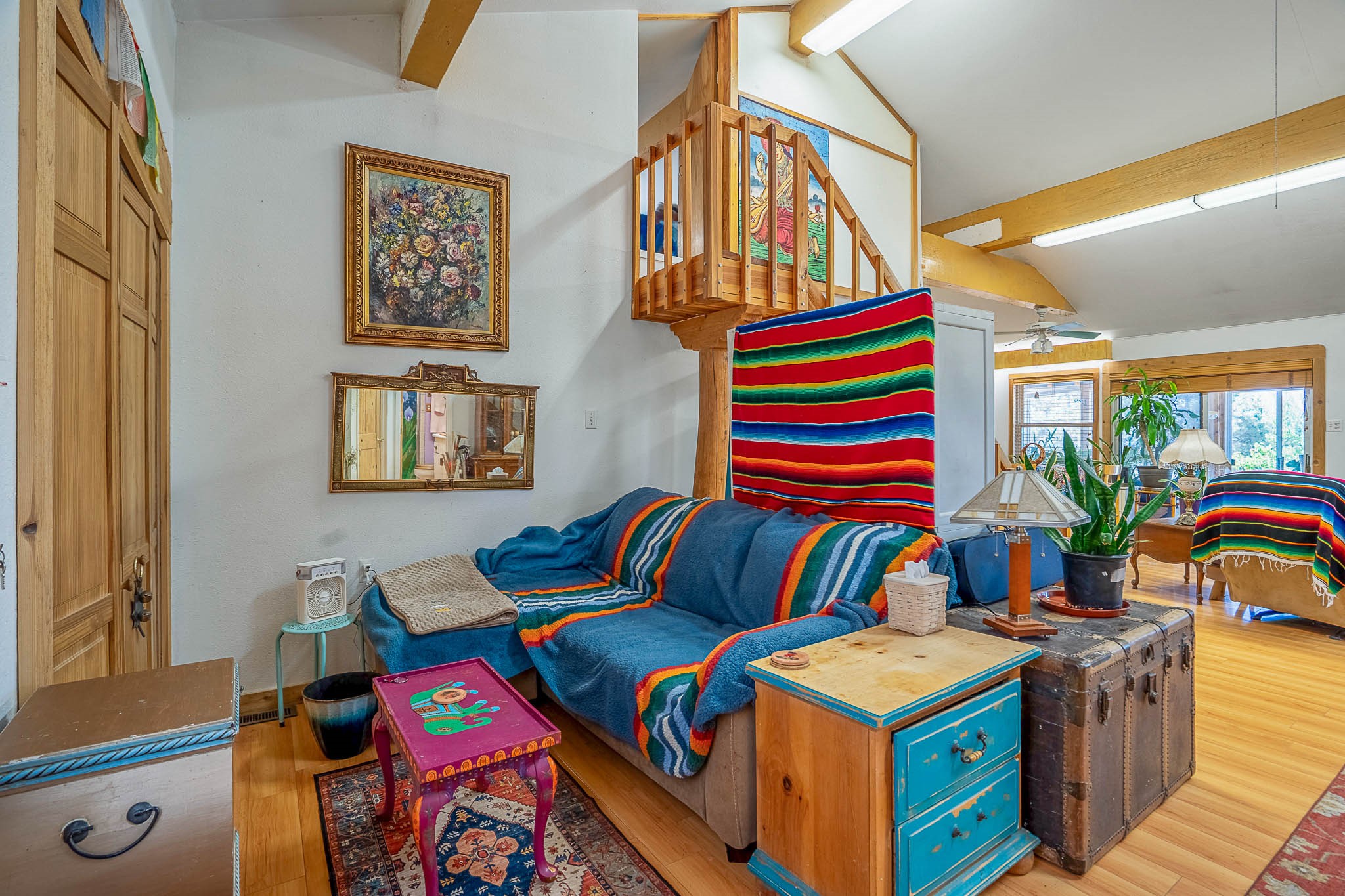 Discover this unique Cochiti Lake home, extensively remodeled in the early 90s to create an expansive, open great room with a soaring vaulted ceiling. The removal of the attic and most interior walls bathes the space in abundant natural light. This inviting home features two bedrooms, including a charming upper-floor loft, and two convenient ground-floor bathrooms. The modest kitchen has open shelving and an attached greenhouse offers year-round gardening potential. Outside, a lush, green backyard with fruit trees offers breathtaking views overlooking the Rio Grande Valley, Sandia Peak, and the Jemez Mountains. Enjoy the convenience of a 1-car garage, large storage shed, and proximity to golf and the serene no-wake lake.