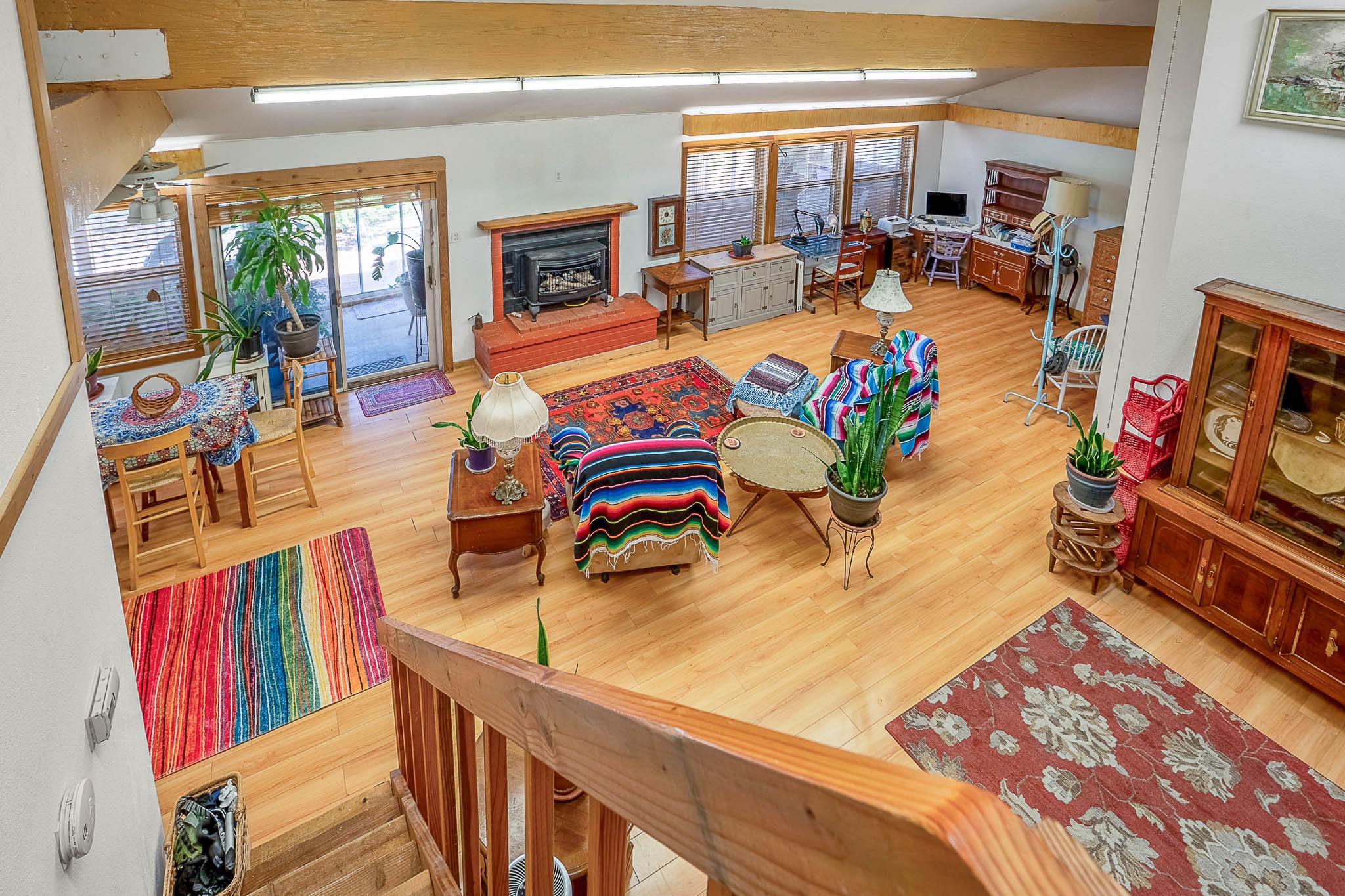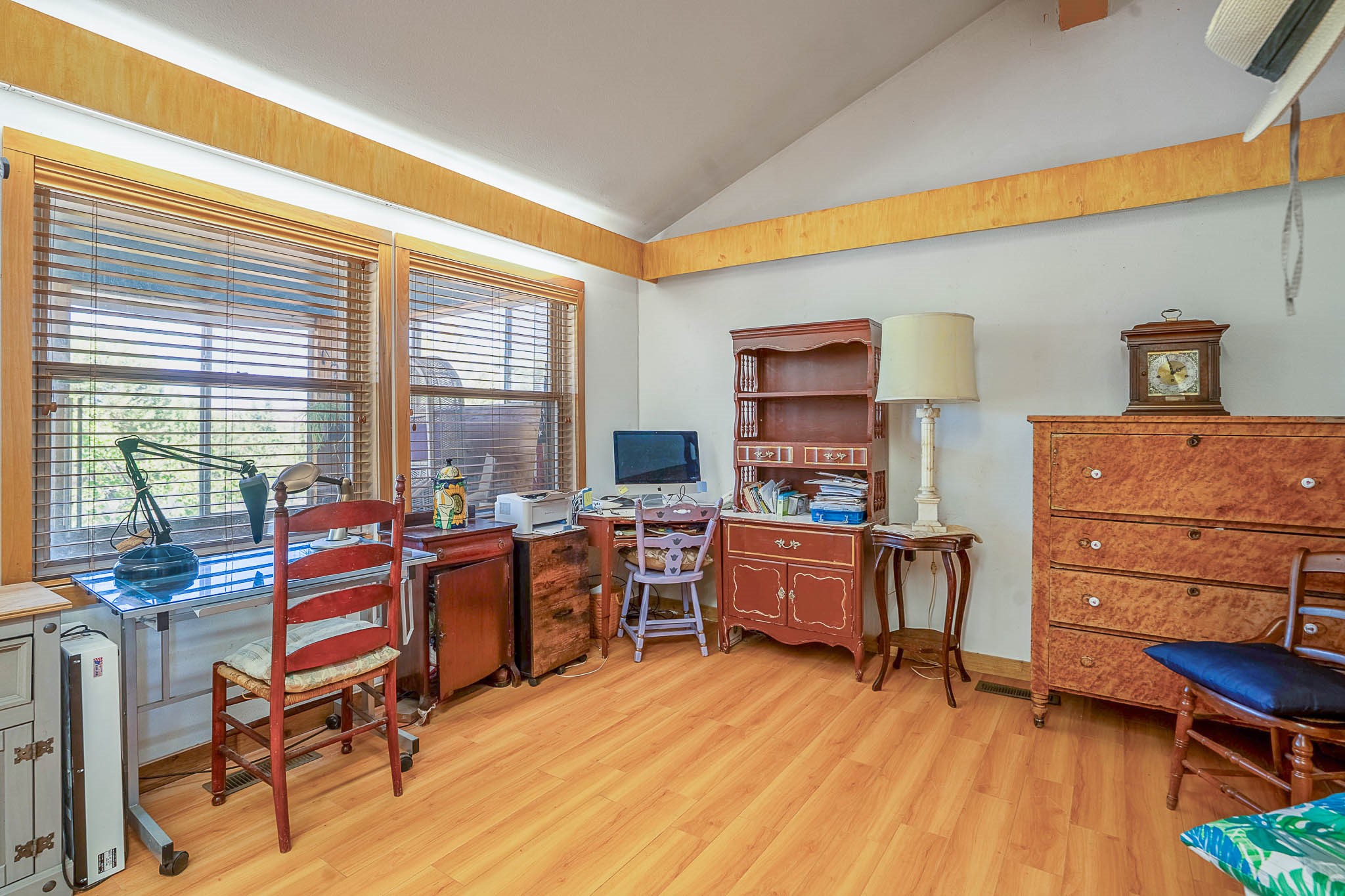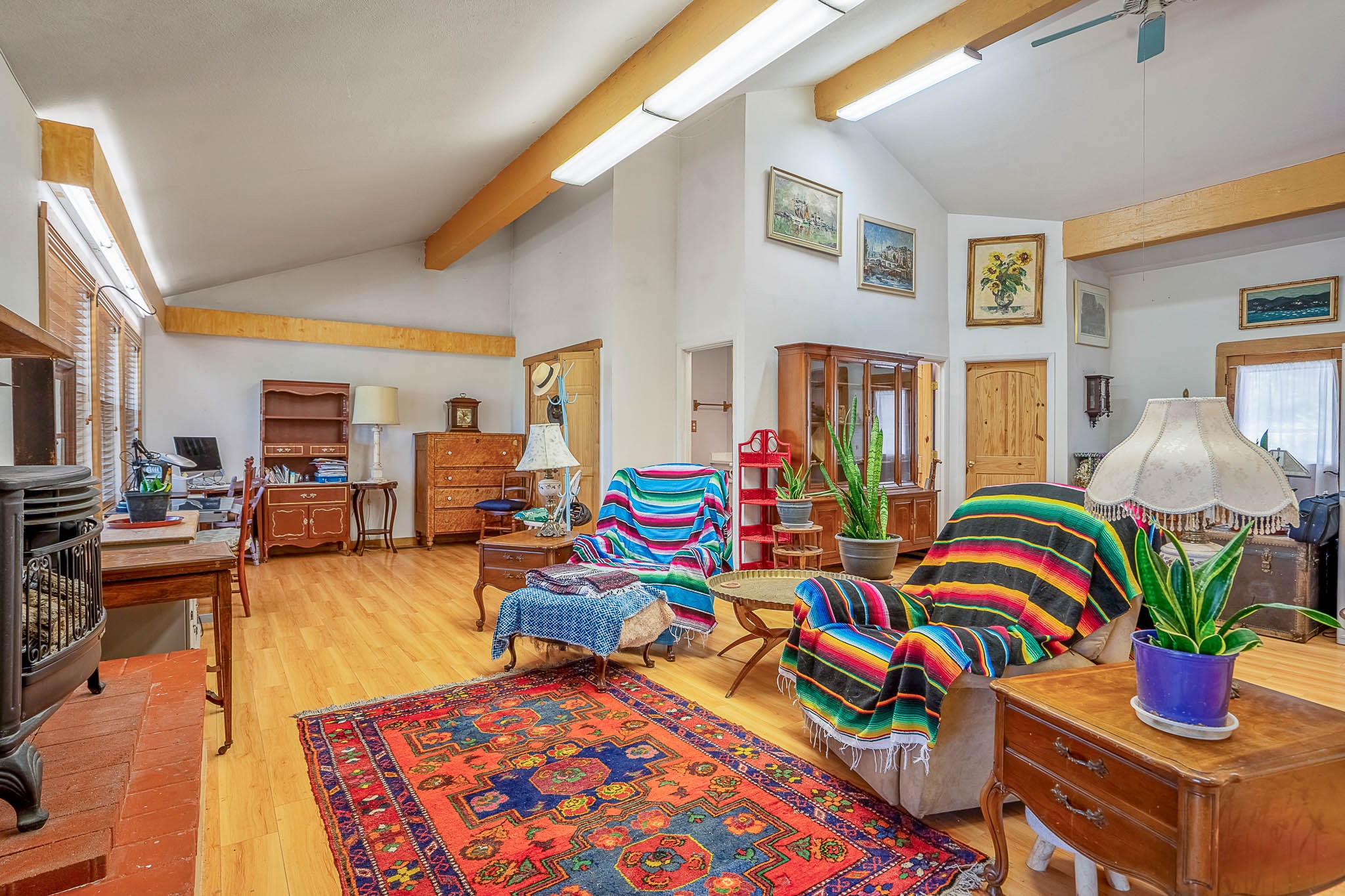 Discover this unique Cochiti Lake home, extensively remodeled in the early 90s to create an expansive, open great room with a soaring vaulted ceiling. The removal of the attic and most interior walls bathes the space in abundant natural light. This inviting home features two bedrooms, including a charming upper-floor loft, and two convenient ground-floor bathrooms. The modest kitchen has open shelving and an attached greenhouse offers year-round gardening potential. Outside, a lush, green backyard with fruit trees offers breathtaking views overlooking the Rio Grande Valley, Sandia Peak, and the Jemez Mountains. Enjoy the convenience of a 1-car garage, large storage shed, and proximity to golf and the serene no-wake lake.