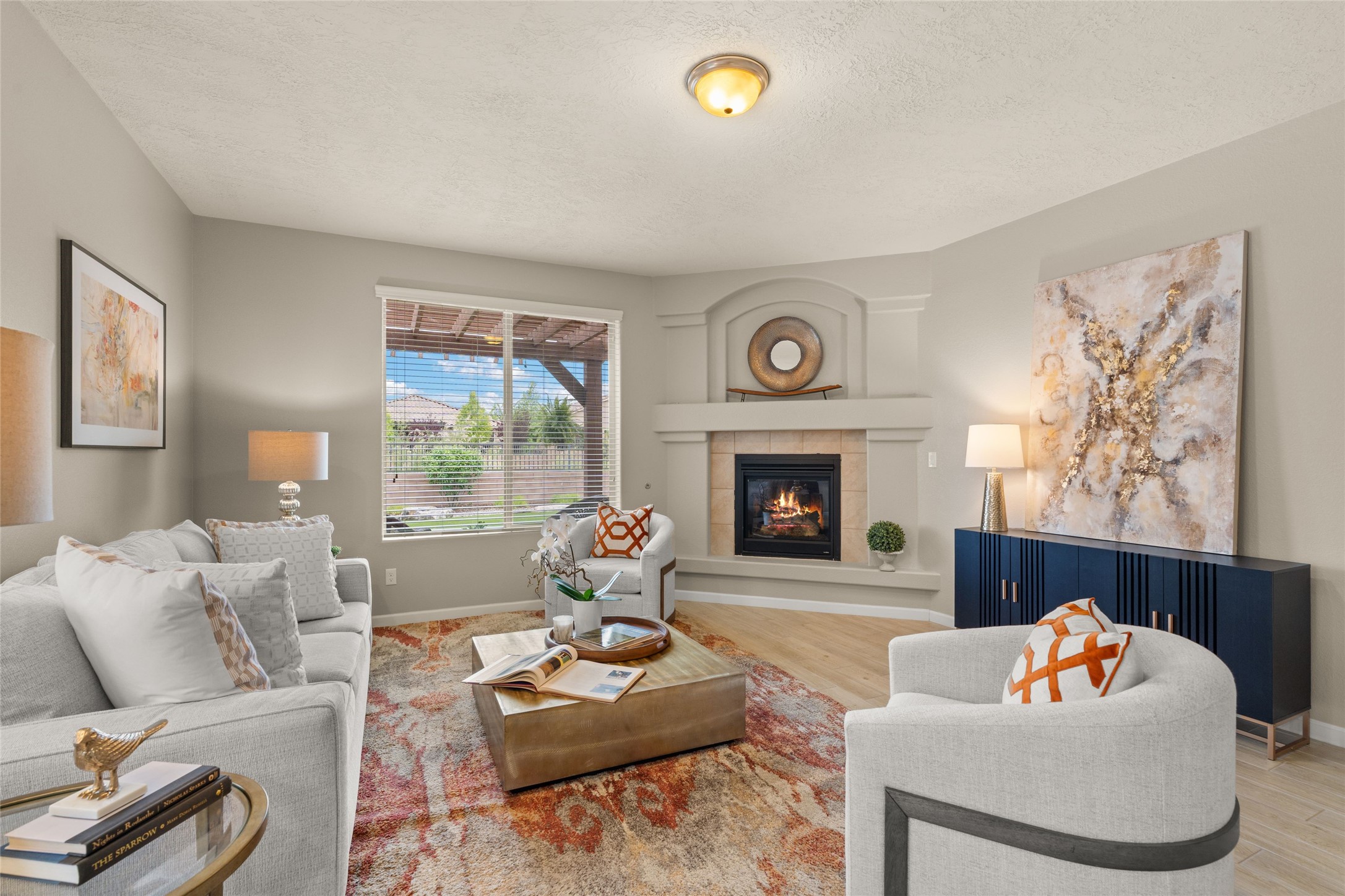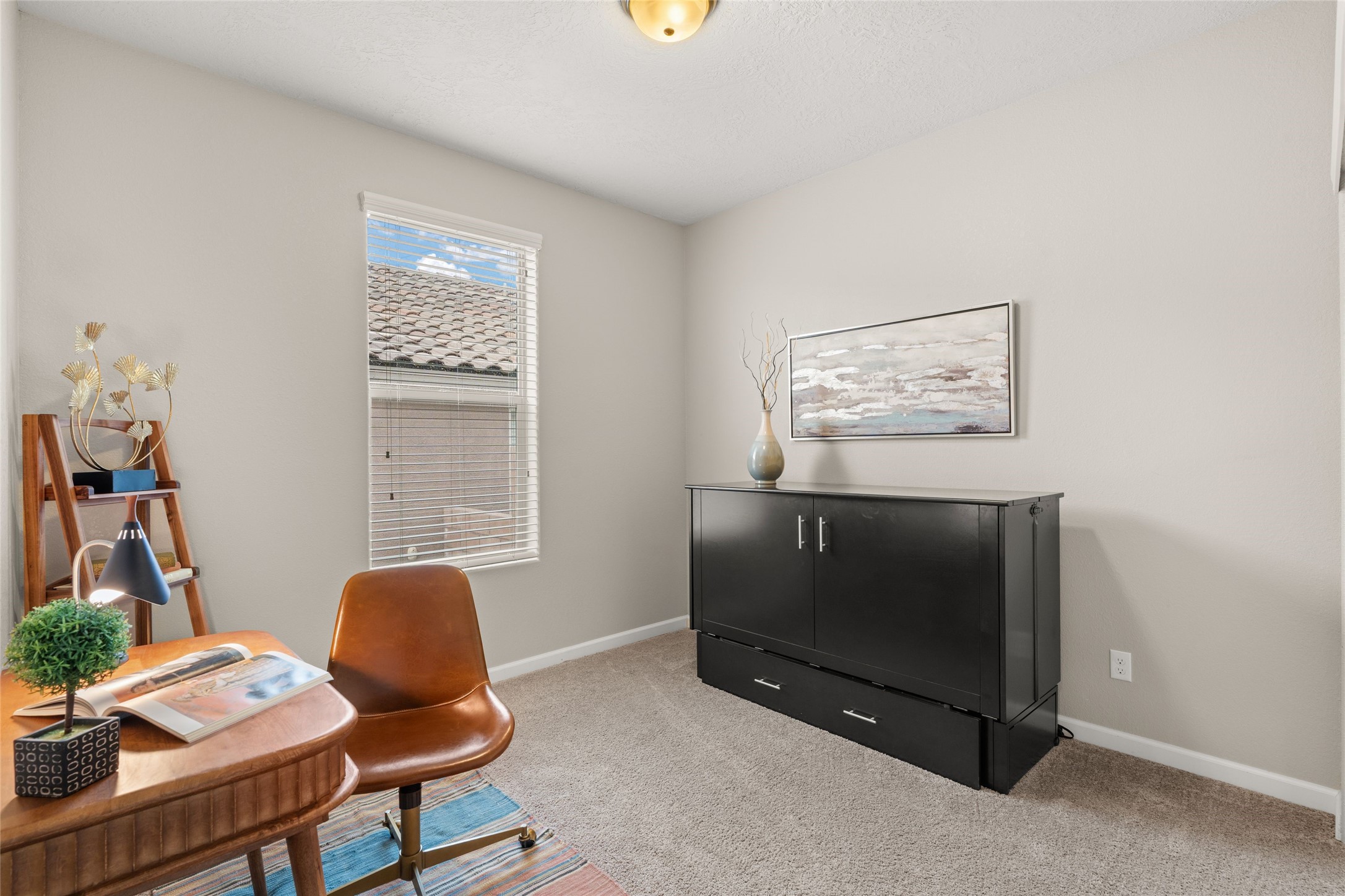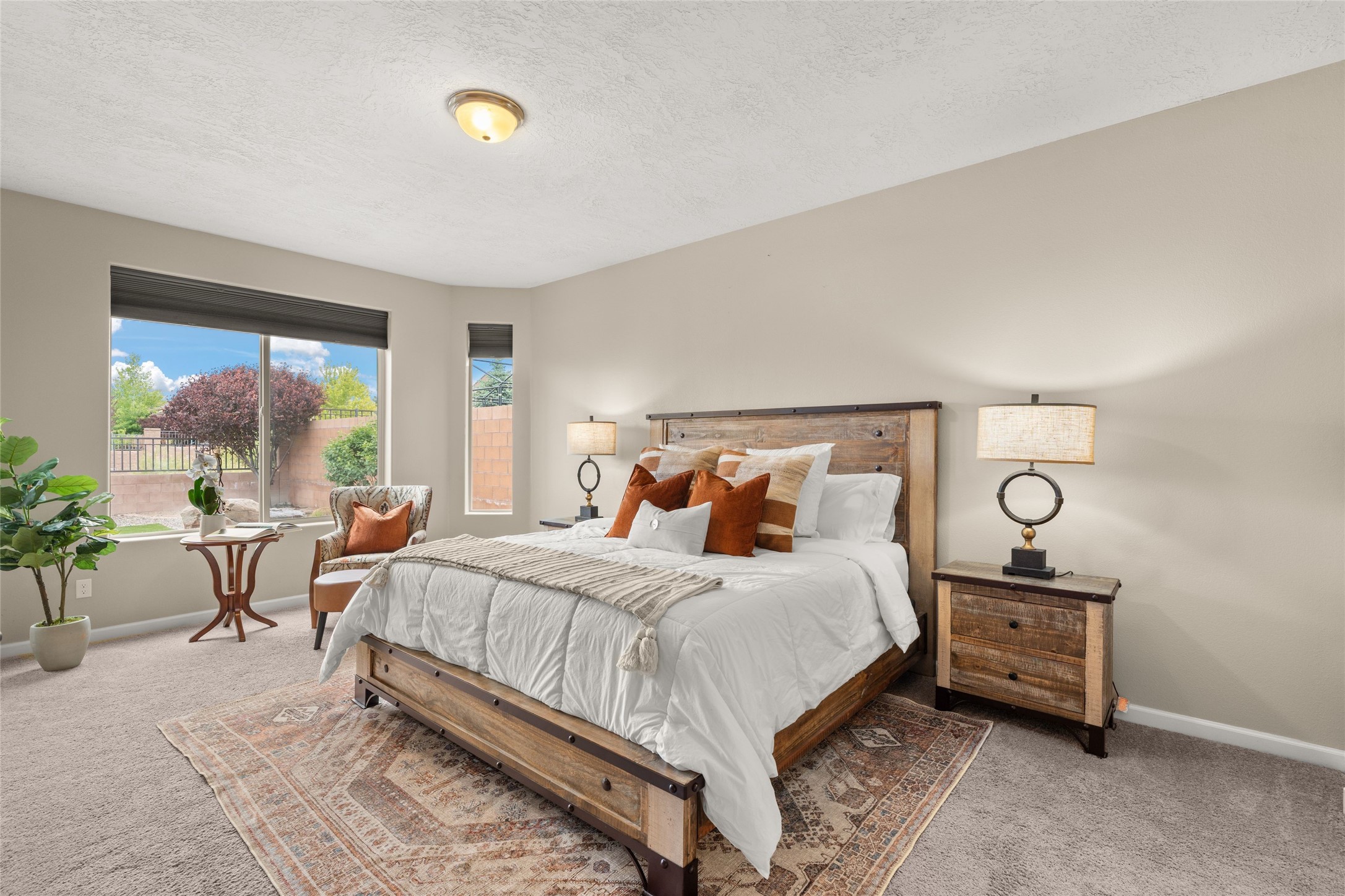 Enjoy the desirable lifestyle of Las Soleras in this beautiful community conveniently located for easy access to downtown Santa Fe, Albuquerque, Los Alamos, the Rail Runner as well as schools, healthcare, shopping, dining and cultural destinations. This 3 bedroom/2 bathroom home was thoughtfully designed and offers a large open plan Living Room, Dining Area and Kitchen and excellent separation between the Primary ensuite Bedroom and the other bedrooms. Enter the Primary Bedroom Ensuite from a foyer off the Living Room and enjoy the generously sized bedroom, a large bathroom with a linen and walk-in closet. Other bedrooms and bathroom are towards the front of the home and adjacent to the long entry hallway opening up to the Living/Dining and Kitchen. The Kitchen has granite counter tops, all wood cabinetry, a Pantry and ample room for cooking and entertaining. Walk outside to a beautiful and welcoming trellis covered patio and green turf back yard area that is ideal for dining and lounging to the trickling sound from the stone water feature. Las Soleras has an extensive trail system for walking and running as well as Las Soleras Park for birdwatching, outdoor sports, picnicking and includes essential amenities like parking restrooms, a leisure playground and a shelter available for use. This is a versatile home that can fit any type of lifestyle so schedule your showing today!