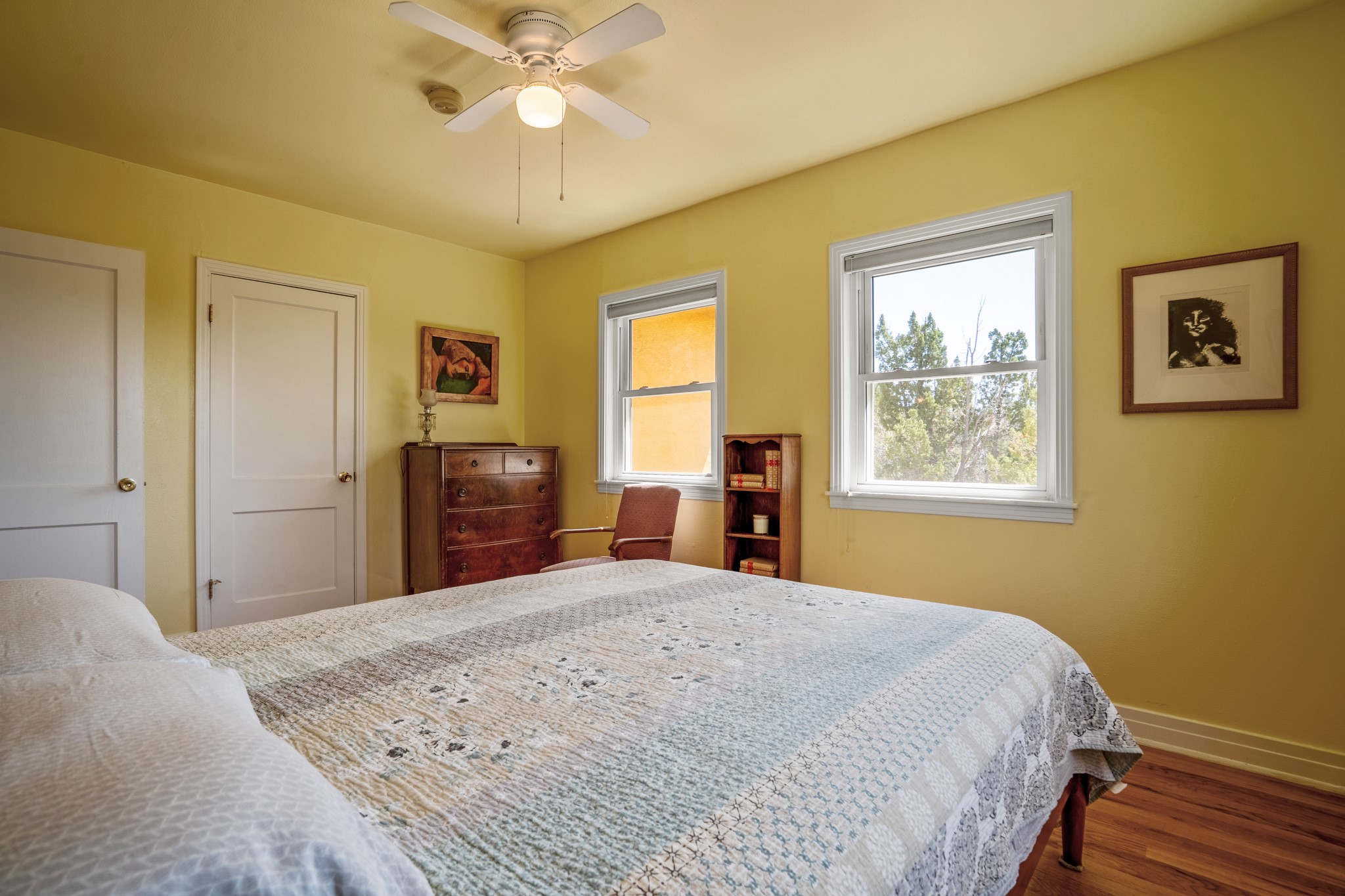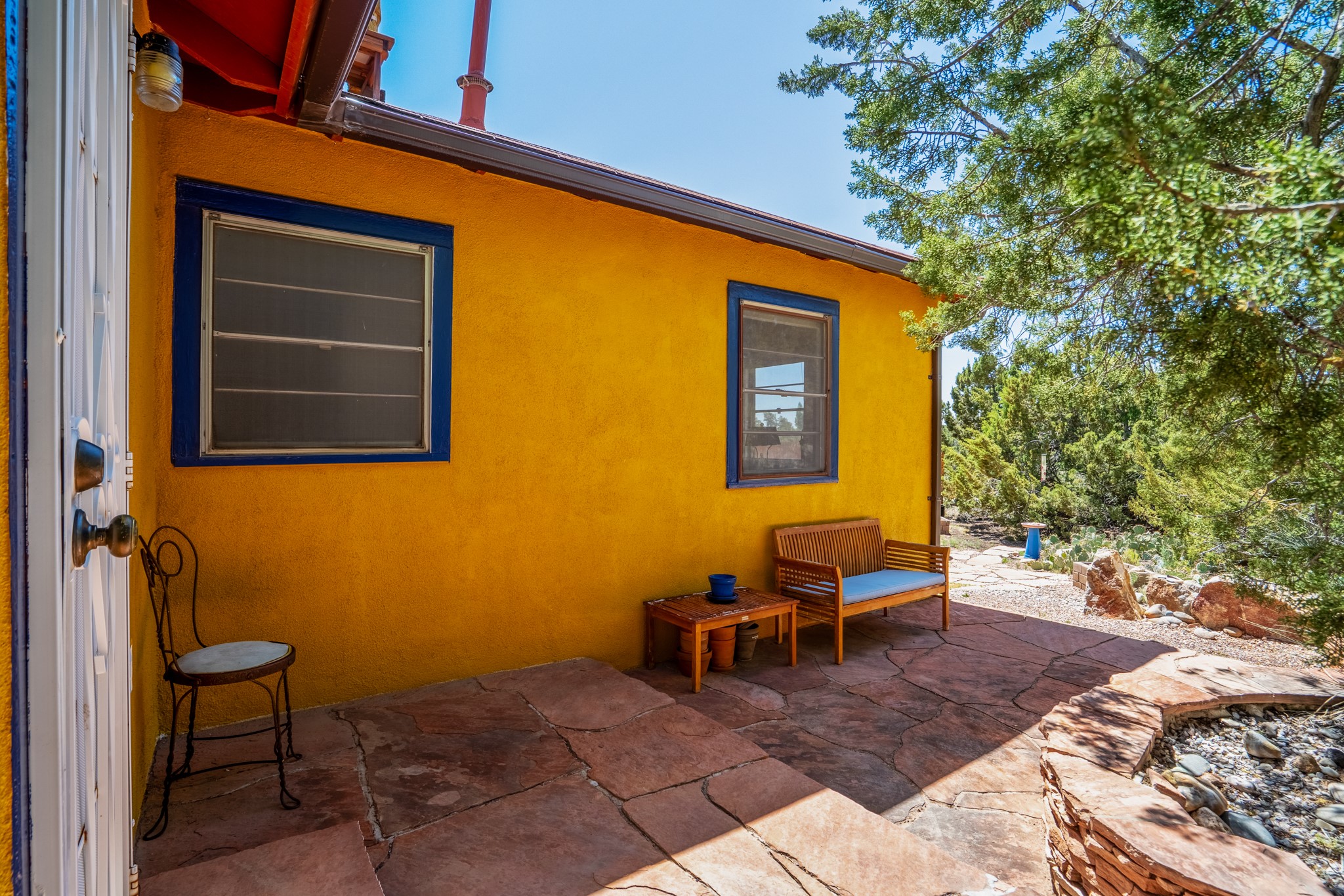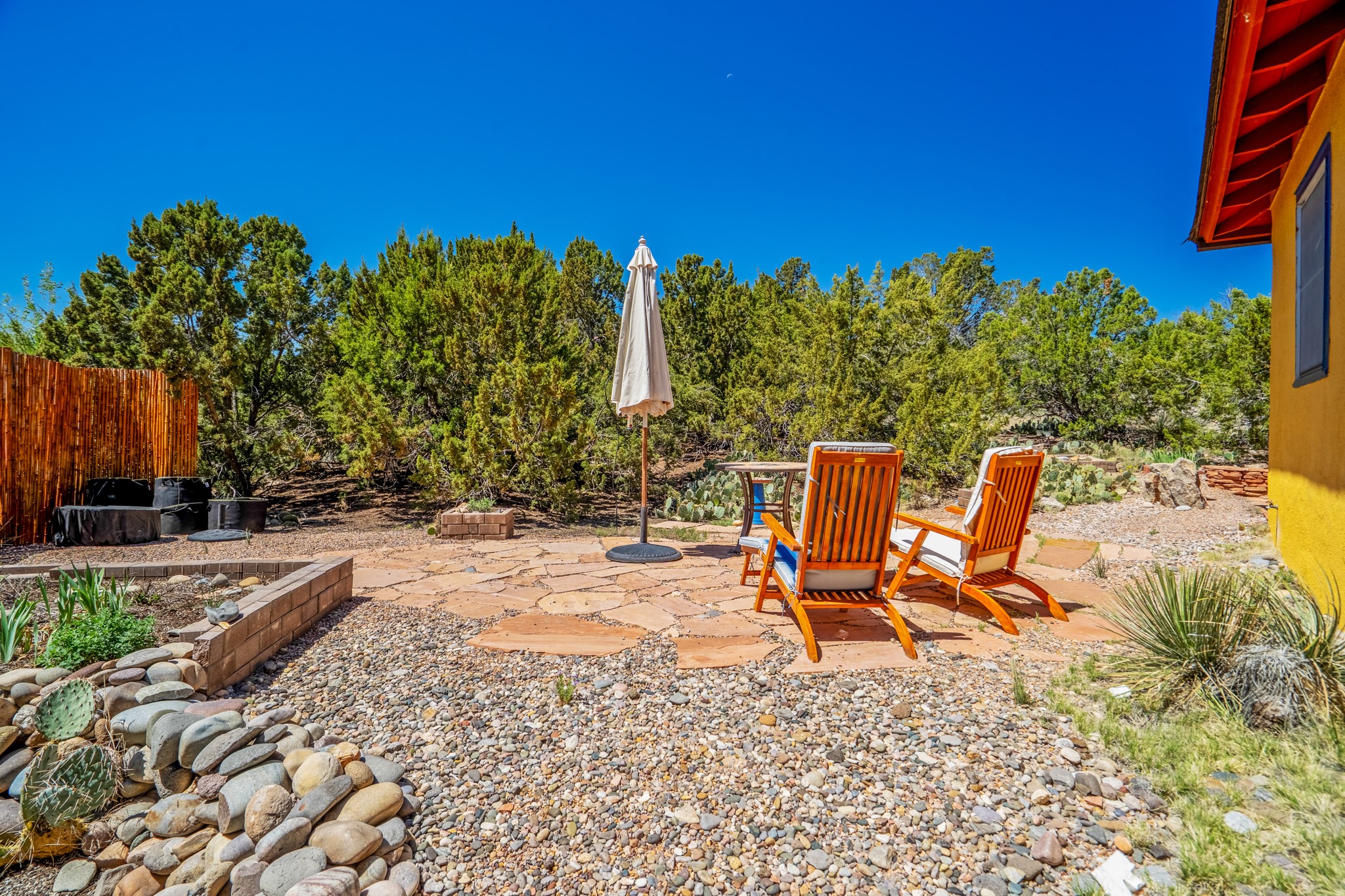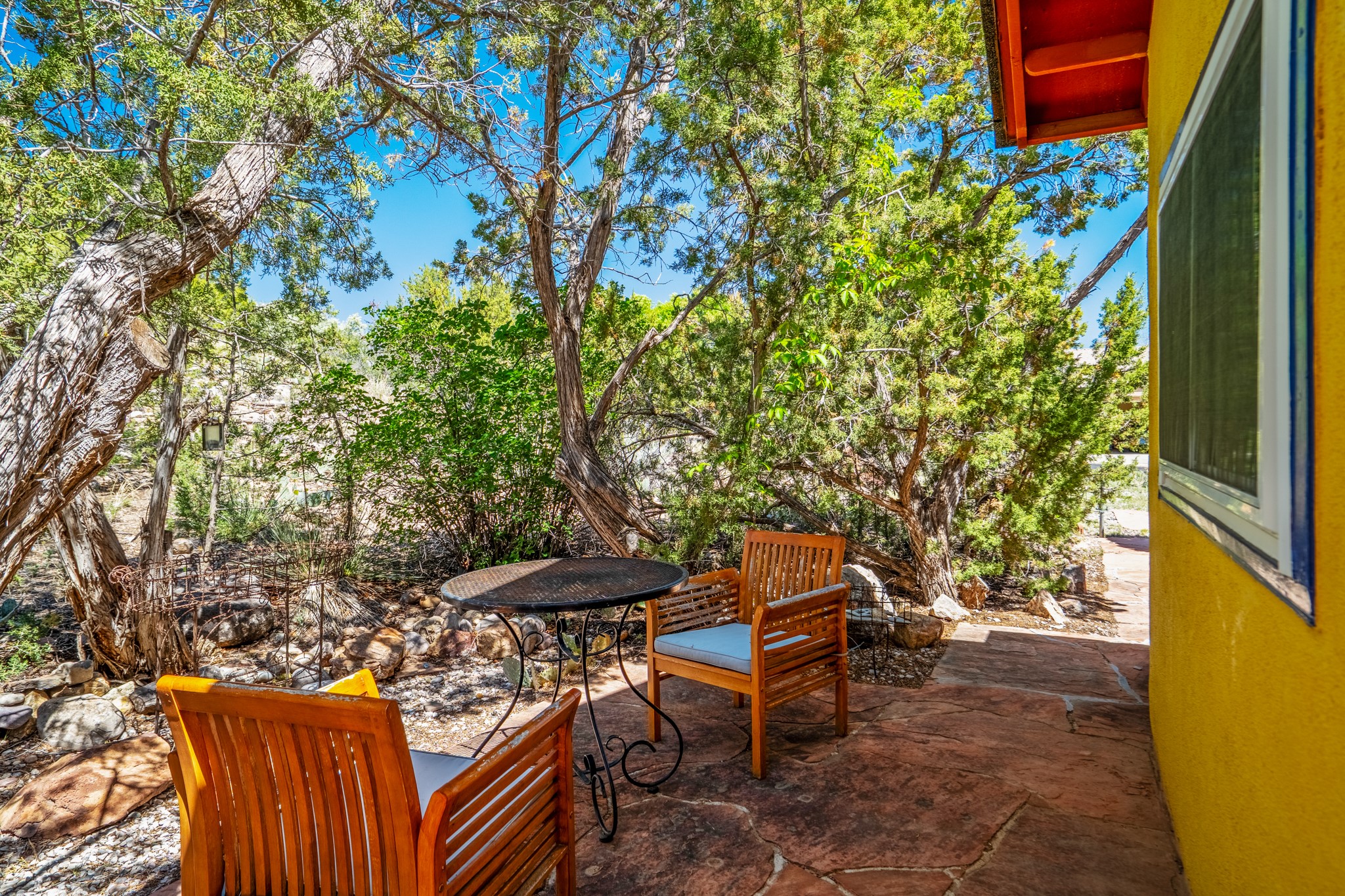 Nestled privately among Pinon and Juniper trees at Cochiti Lake, this well-maintained 3-bedroom, 2-bathroom home offers an inviting retreat. Step through the solid hardwood front door and discover real oak flooring flowing throughout most of the open floor plan, bathed in lots of natural light. Ceiling fans in every room ensure year-round comfort.The third bedroom is currently used as a versatile studio space and has its own bathroom, perfect for hobbies or a home office. Enjoy the convenience of a carport and an included storage shed. The landscaped back patio provides a peaceful outdoor oasis, with limited views of Tetilla Peak adding to the serene atmosphere. This cheery yellow home, with nearby lake access and golf, is an ideal sanctuary for those seeking a blend of comfort and nature. Schedule your showing today!