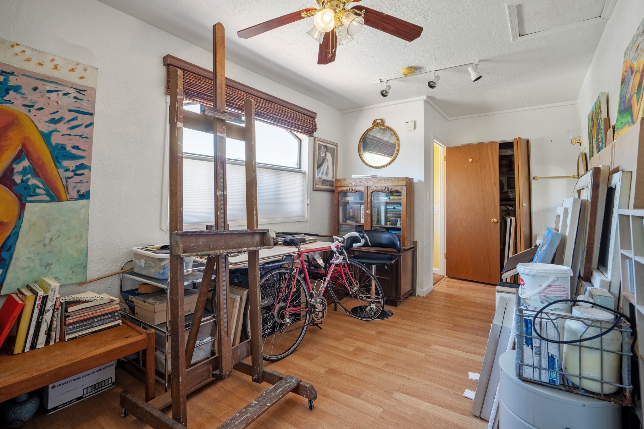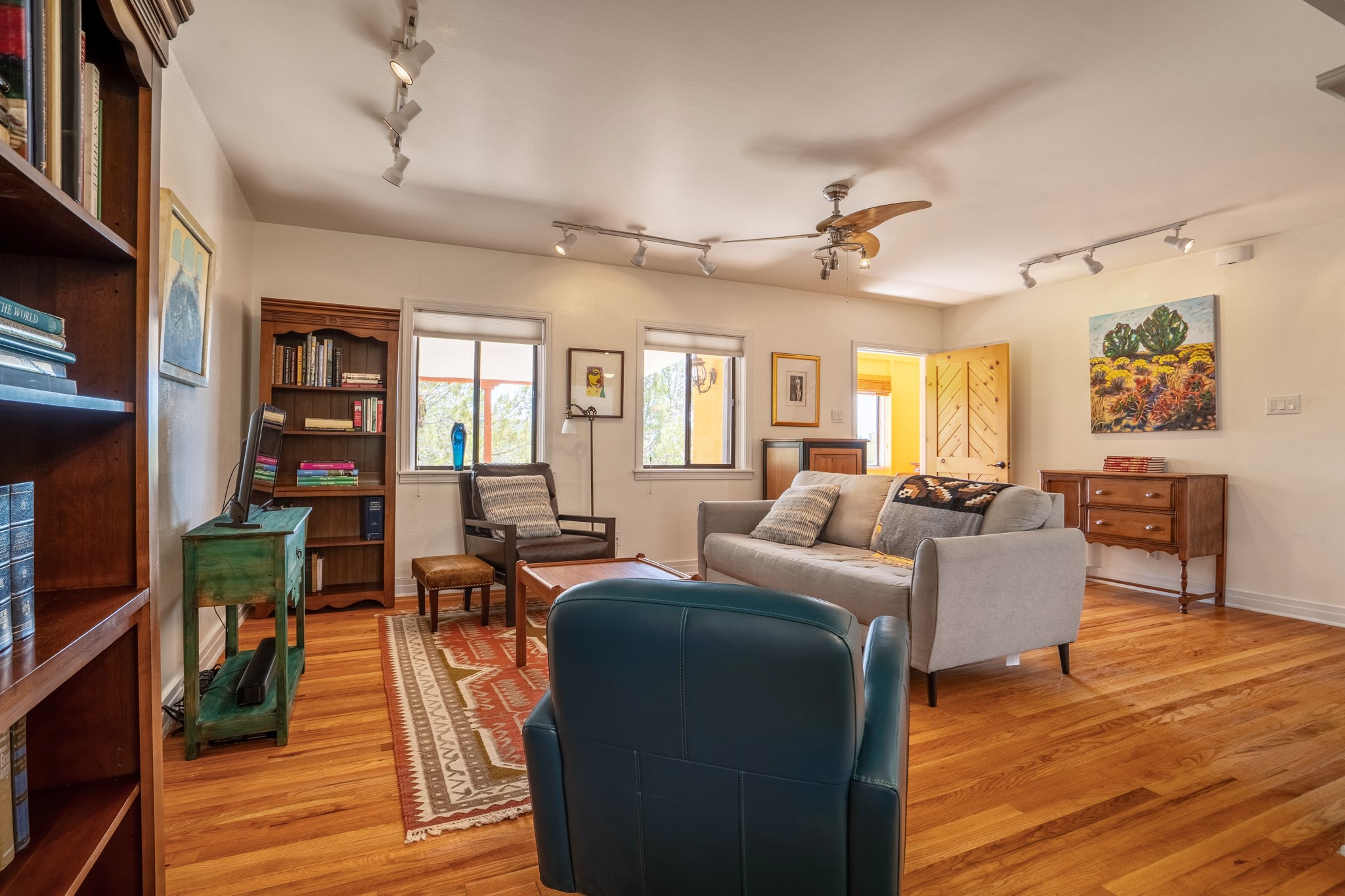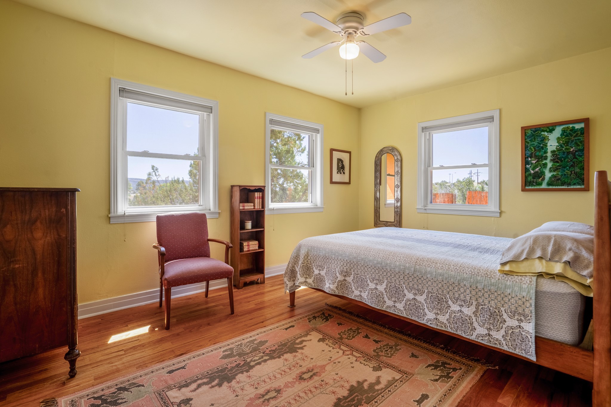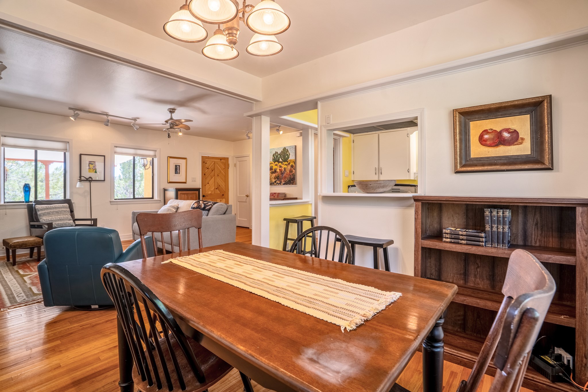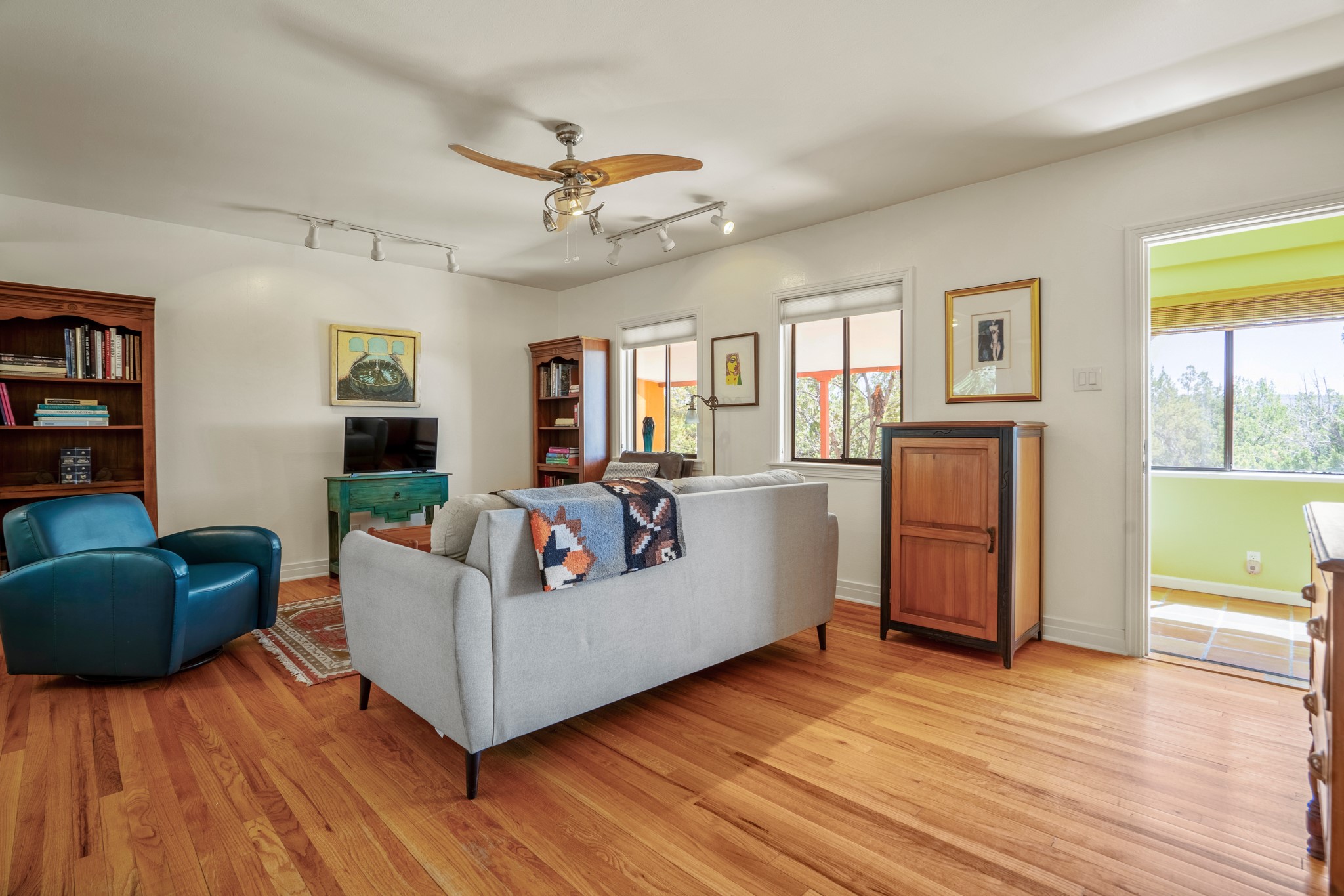 Nestled privately among Pinon and Juniper trees at Cochiti Lake, this well-maintained 3-bedroom, 2-bathroom home offers an inviting retreat. Step through the solid hardwood front door and discover real oak flooring flowing throughout most of the open floor plan, bathed in lots of natural light. Ceiling fans in every room ensure year-round comfort.The third bedroom is currently used as a versatile studio space and has its own bathroom, perfect for hobbies or a home office. Enjoy the convenience of a carport and an included storage shed. The landscaped back patio provides a peaceful outdoor oasis, with limited views of Tetilla Peak adding to the serene atmosphere. This cheery yellow home, with nearby lake access and golf, is an ideal sanctuary for those seeking a blend of comfort and nature. Schedule your showing today!
