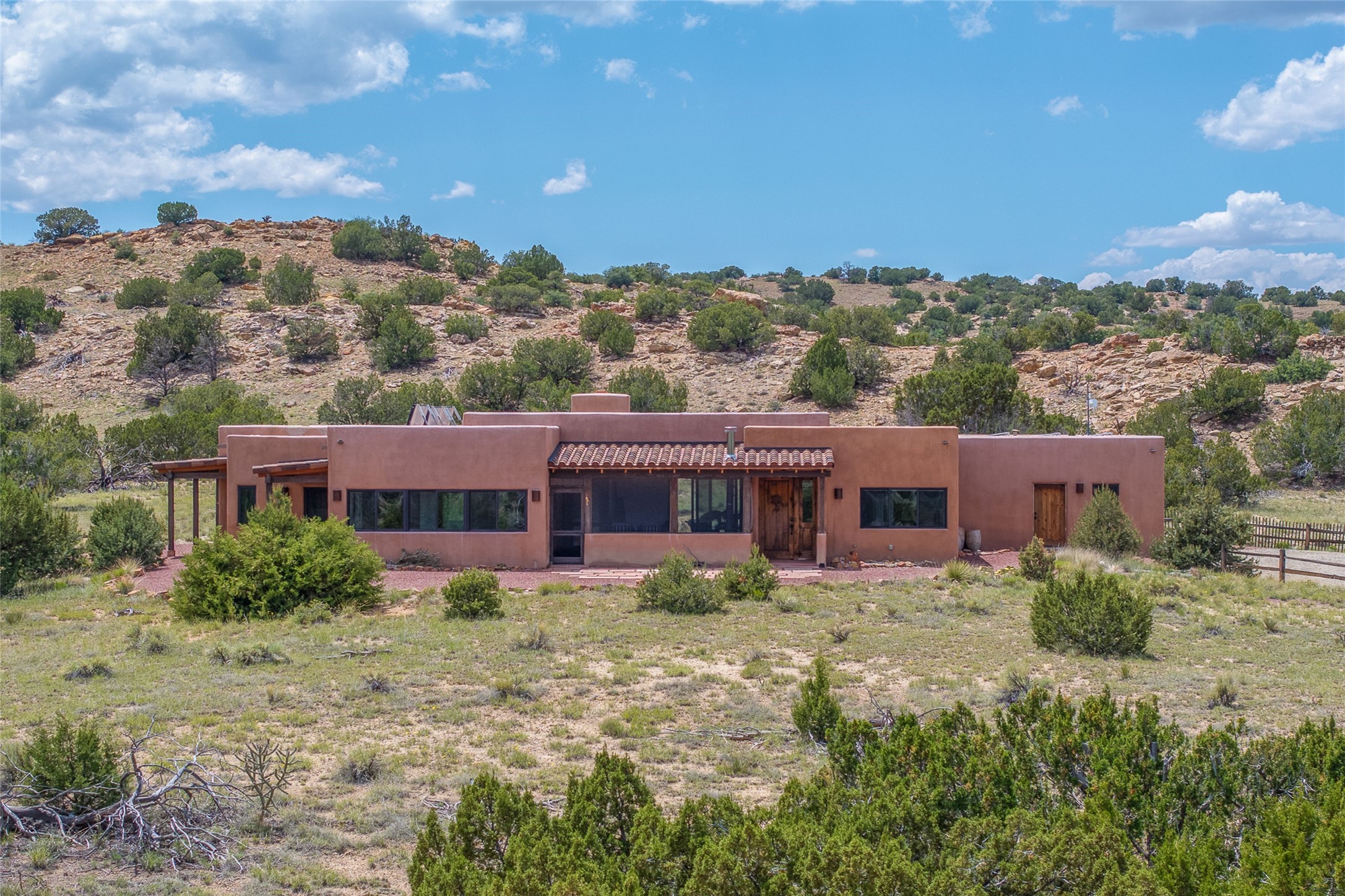 Nestled on 140 acres off the breathtaking scenic Turquoise Trail, this exceptional home blends modern elegance with serene pastoral beauty. Surrounded by expansive ranch land, it offers privacy and tranquility, where horses are welcome. The sweeping views, stunning rock formations, and pristine night skies create a truly peaceful retreat. Built in 2017, this "smart" home is designed for efficiency and comfort, featuring solar electric panels, solar radiant heating, and a grid connection. Mini-splits provide heating and cooling throughout, while stained concrete floors, handmade doors and beams from La Puerta Originals, and sleek design elements enhance the home's tranquil, minimalist aesthetic. The third bedroom, full of natural light, presents a perfect space for an artist's studio. The generously sized living area boasts an open floor plan, an inviting eat-in kitchen with sophisticated wine cooler, and a cozy kiva fireplace. Seamless indoor-outdoor living is achieved with multiple patios--both open and enclosed--including a screened-in dining space with a wood stove and patio heaters, along with an outdoor shower. Located south of Santa Fe, this rural haven offers convenient access to both Santa Fe and Albuquerque. It's also near the charming and historic villages of Madrid and Cerrillos, where vibrant restaurants, art galleries, summer farmers' markets, and two general stores bring local culture to life.