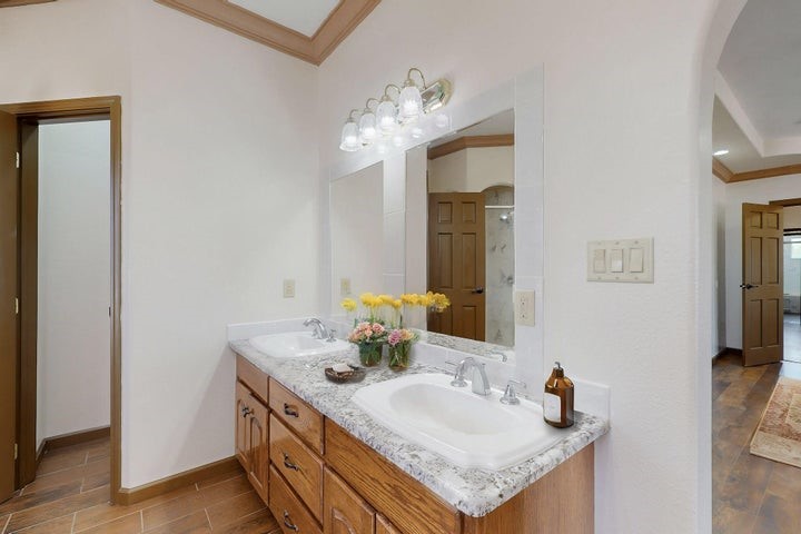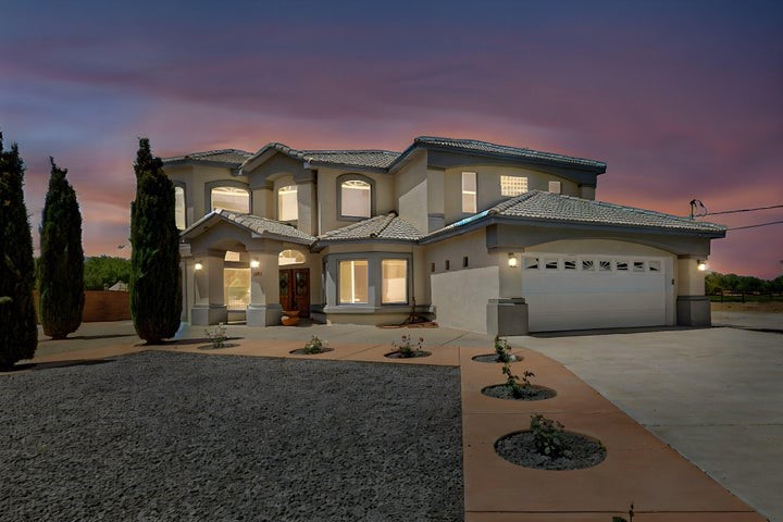 Owner to owner financing available! This one-of-a-kind luxury home is nestled in a highly sought-after, tucked-away neighborhood with million-dollar views of the Sandia Mountains. Set on nearly an acre with an agricultural feel and neighboring green pastures, it offers ultimate privacy and tranquility. The home features a newly stuccoed exterior, fresh paint, tile roofing, soaring ceilings, radiant heated floors, and two combo units with refrigerated air. The oversized kitchen island anchors a spacious, updated interior perfect for entertaining. Step onto the expansive balcony with custom decking to take in the stunning views. A fully finished 2-car garage, a detached 4 car garage/Workshop and updated workshop add incredible functionality. Multiple fruit trees.