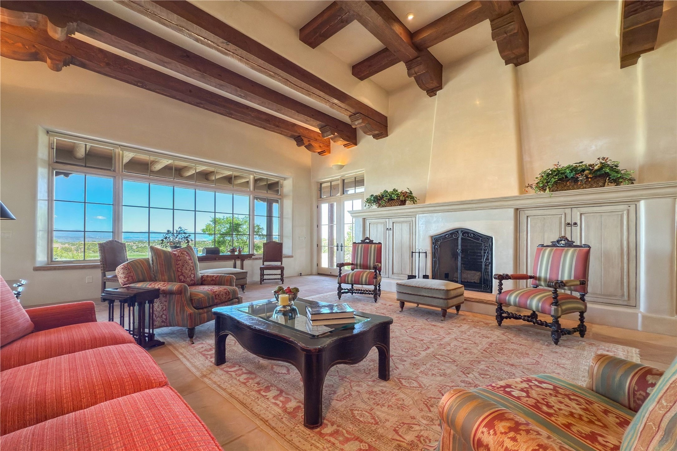 Sophisticated Country Estate with Panoramic Mountain Views in Prestigious Las Campanas.Discover unparalleled luxury in this meticulously crafted estate that seamlessly blends timeless elegance with regional architectural charm. Set within a private courtyard sanctuary surrounded by mature trees, this exceptional home offers breathtaking Jemez and Sangre de Cristo mountain vistas alongside Las Campanas golf course views.Enter through impressive carved alder double doors into soaring ceilings and rich woodwork throughout. The light-filled living room centers around a magnificent fireplace, perfectly framing mountain and golf course panoramas. Hickory wood floors add warmth while shuttered windows enhance the sophisticated country aesthetic.The chef's dream kitchen features a substantial island, granite countertops, and premium appliances ideal for culinary enthusiasts. The curved dining room showcases custom limestone floors, with stunning dual mountain range views leading to a tranquil portal with fireplace--perfect for morning coffee or evening cocktails.Retreat to the spacious primary suite featuring a private portal, mountain vistas, dual walk-in closets, and separate his-and-hers bathroom spaces. All four bathrooms in this home showcase custom decorative tile designed exclusively for this home by renowned Taos artist Jill Rounds.Additional Amenities include a dedicated study offering peaceful views, built-in shelving, and custom alder desk. Two generous guest en-suites share a convenient wet bar and courtyard access. Practical features include a spacious laundry room, kitchen office nook, and mudroom with ample storage. Multiple portal access points maximize indoor-outdoor living.Las Campanas provides 24-hour security and EMT services. Club memberships available for purchase upon approval.
