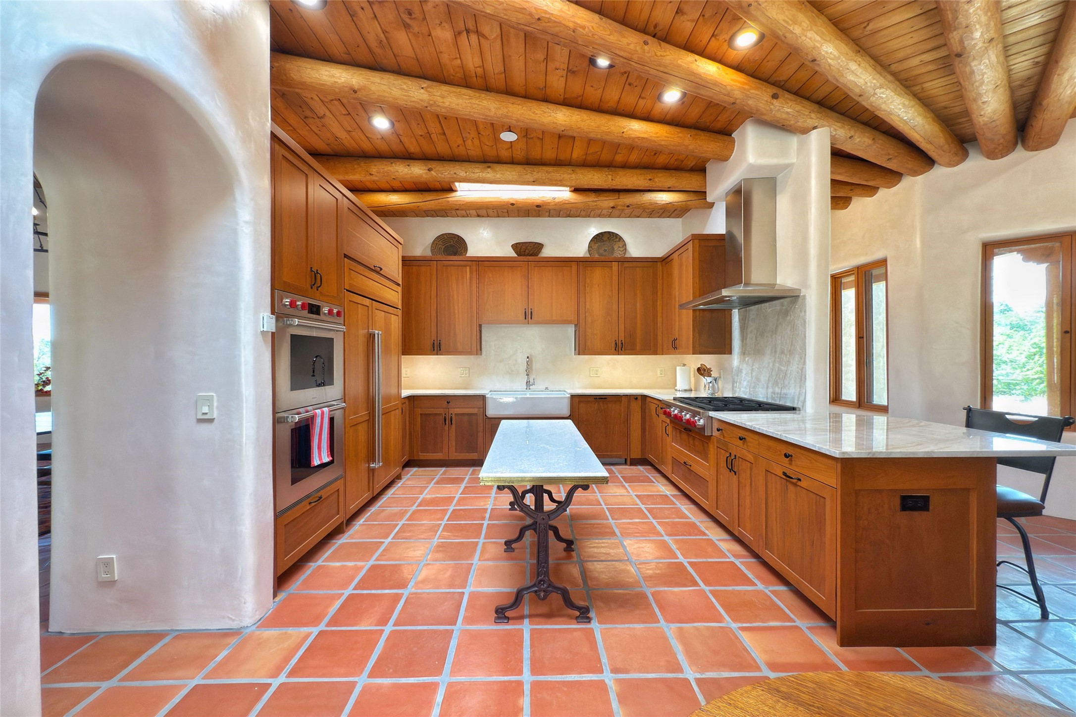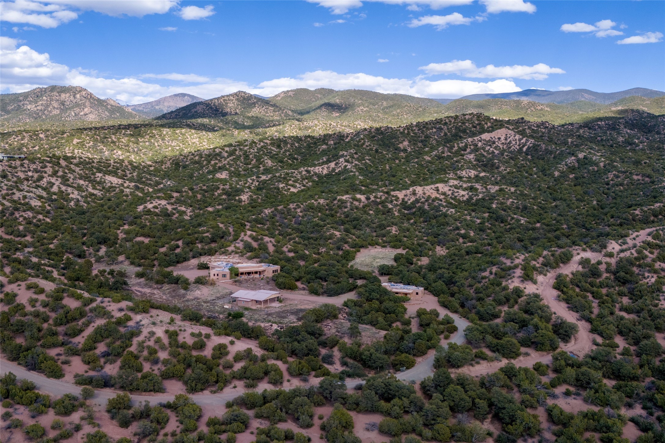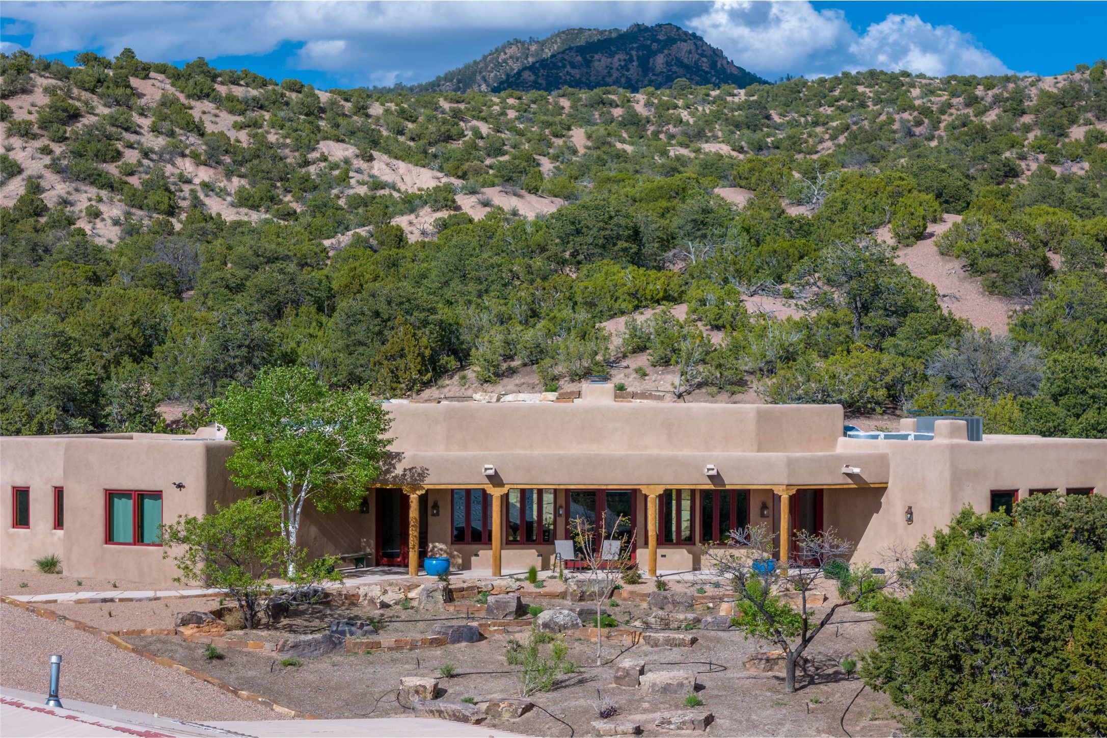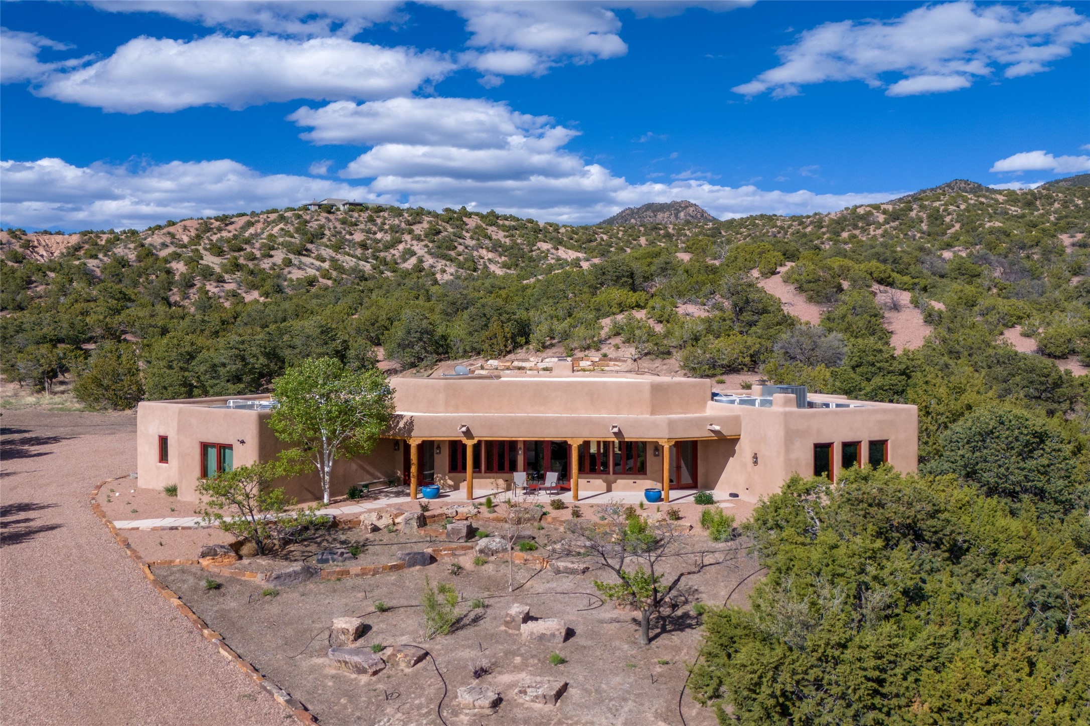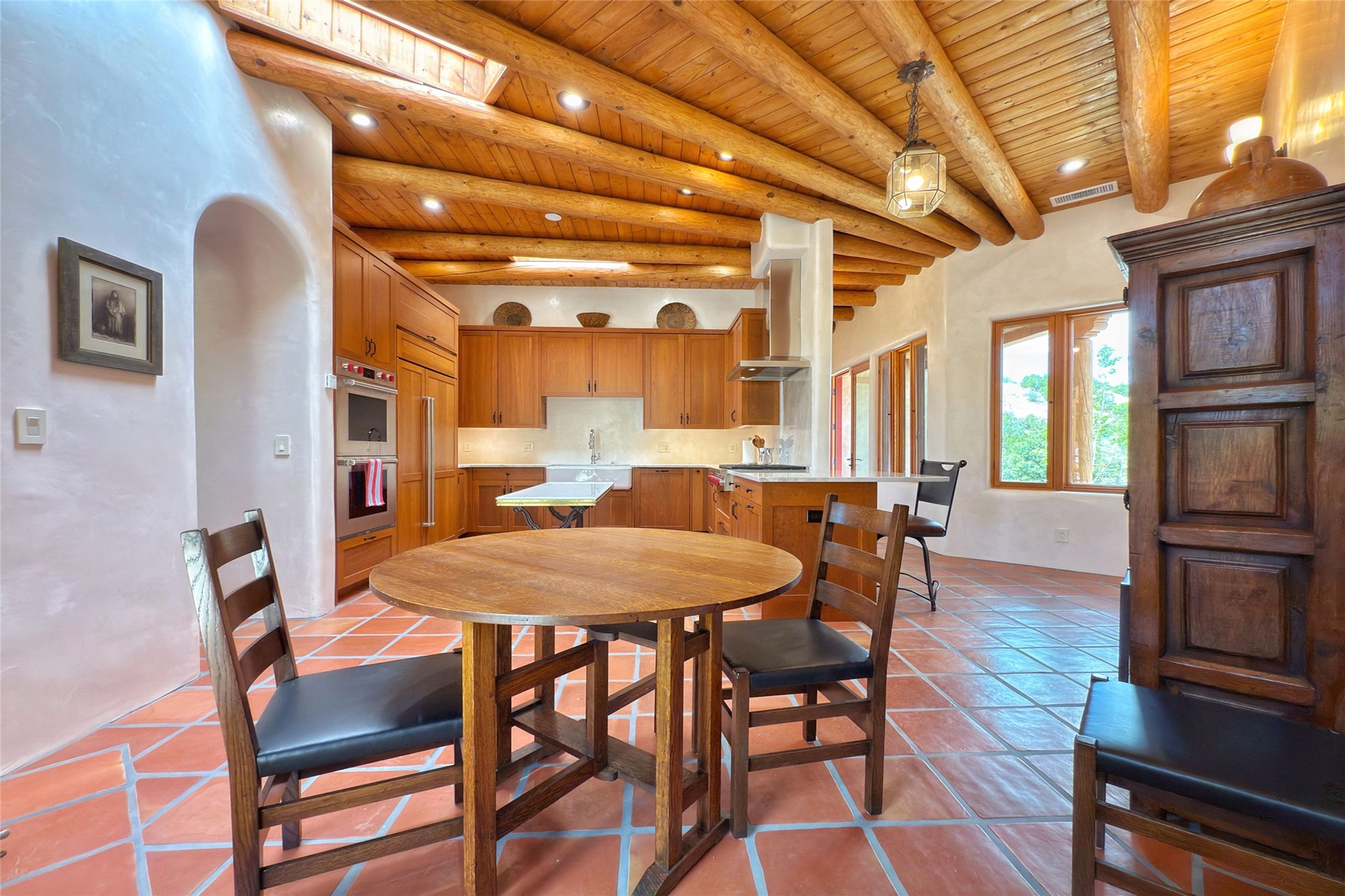 Southwest Elegance Meets Modern Luxury - Tesuque Estate Near Santa FeExperience timeless charm and refined upgrades in this exceptional Tesuque estate just 15 minutes from downtown Santa Fe. The property includes a beautifully renovated main house, a private guesthouse, and a versatile third structure ideal as a studio, barn, or additional guest quarters.The main residence showcases superior craftsmanship with diamond plaster walls, Loewen windows and doors, and Saltillo tile floors. The chef's kitchen features SubZero and Wolf appliances, an Asko dishwasher, an imported porcelain farmhouse sink, and striking Taj Mahal quartz countertops. The great room impresses with soaring ceilings, dual chandeliers, a wood-burning fireplace, and expansive western views, flowing onto two covered flagstone patios--perfect for indoor-outdoor living.The primary suite offers a luxurious retreat with its own fireplace, a spa-like bath with soaking tub, walk-in shower, dual pedestal sinks, and an adjacent study with fireplace and patio access. Two additional bedrooms complete the home--one with ensuite bath, the other with access to a nearby half bath. Comforts include radiant floor heating and central A/C.The guesthouse offers two bedrooms and two baths, with upgrades mirroring the main home: diamond plaster walls, quartz countertops, radiant heating, central A/C, and Loewen windows. Its primary suite features a kiva fireplace, soaking tub, and walk-in shower, while the second bedroom enjoys tranquil western views. A cozy living/dining area with kiva fireplace and a private flagstone patio complete the space.Set on a beautifully landscaped lot with mature junipers, fenced areas, and irrigated gardens, this private estate offers peace and elegance just minutes from the heart of Santa Fe.