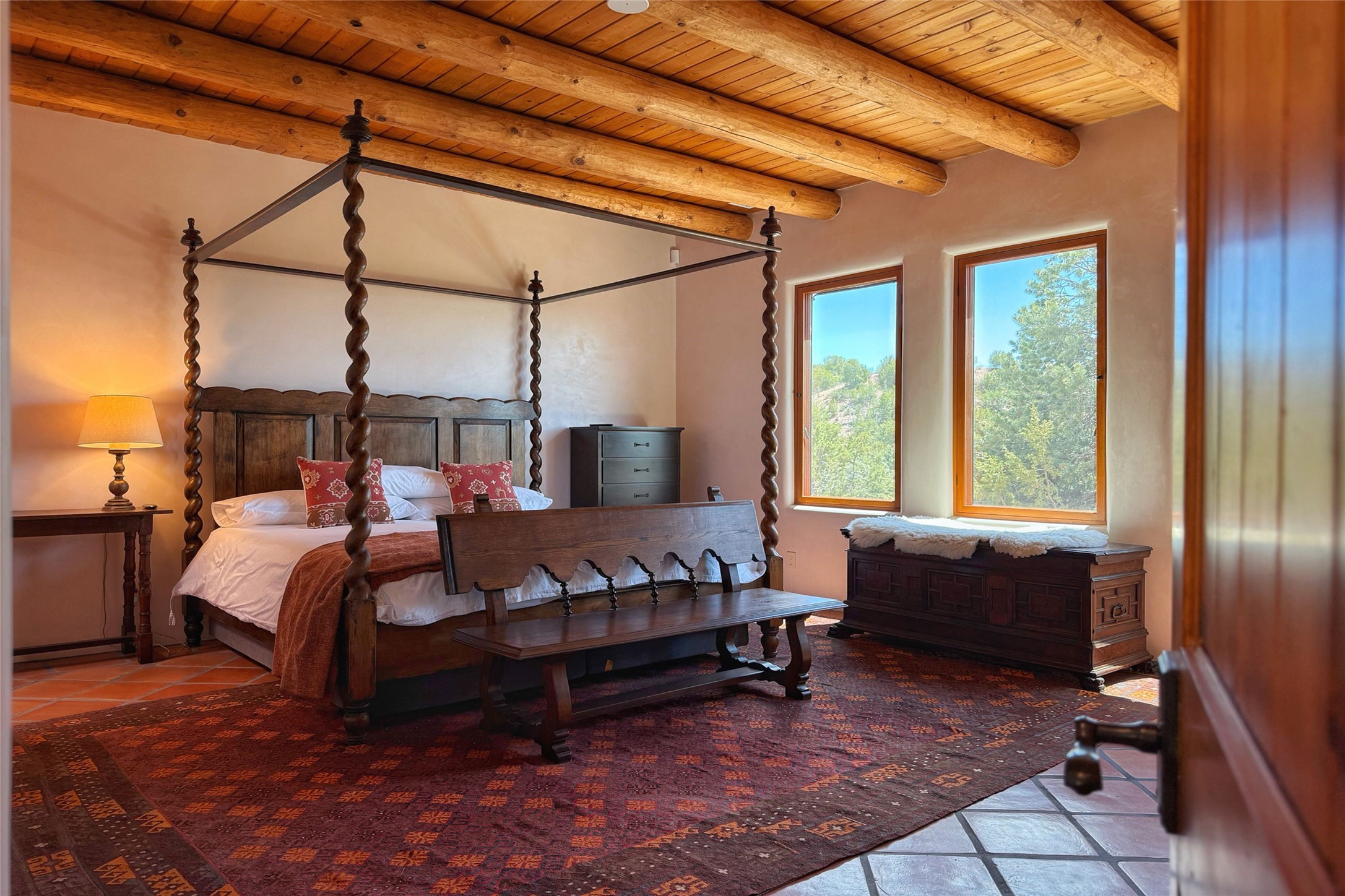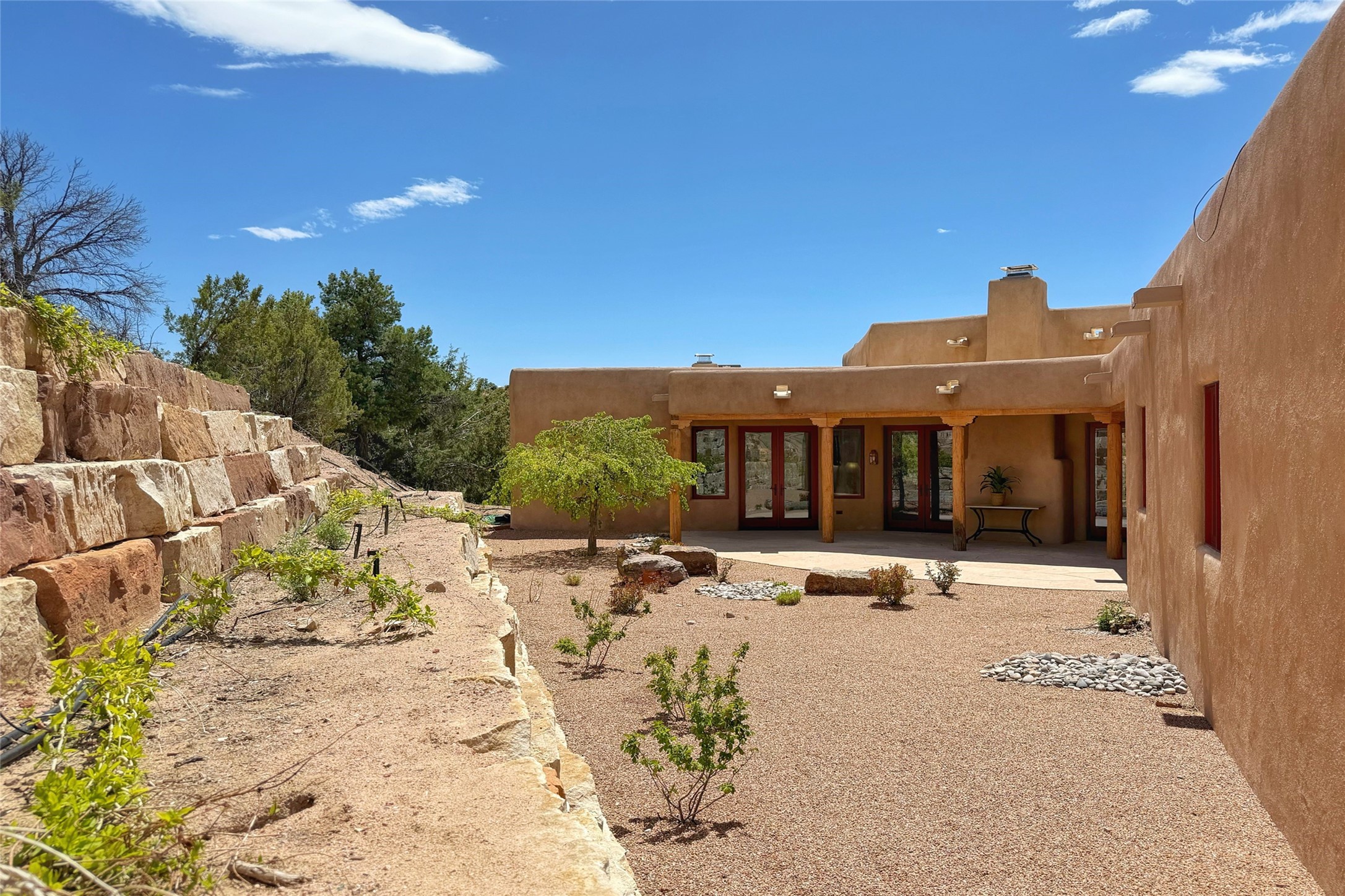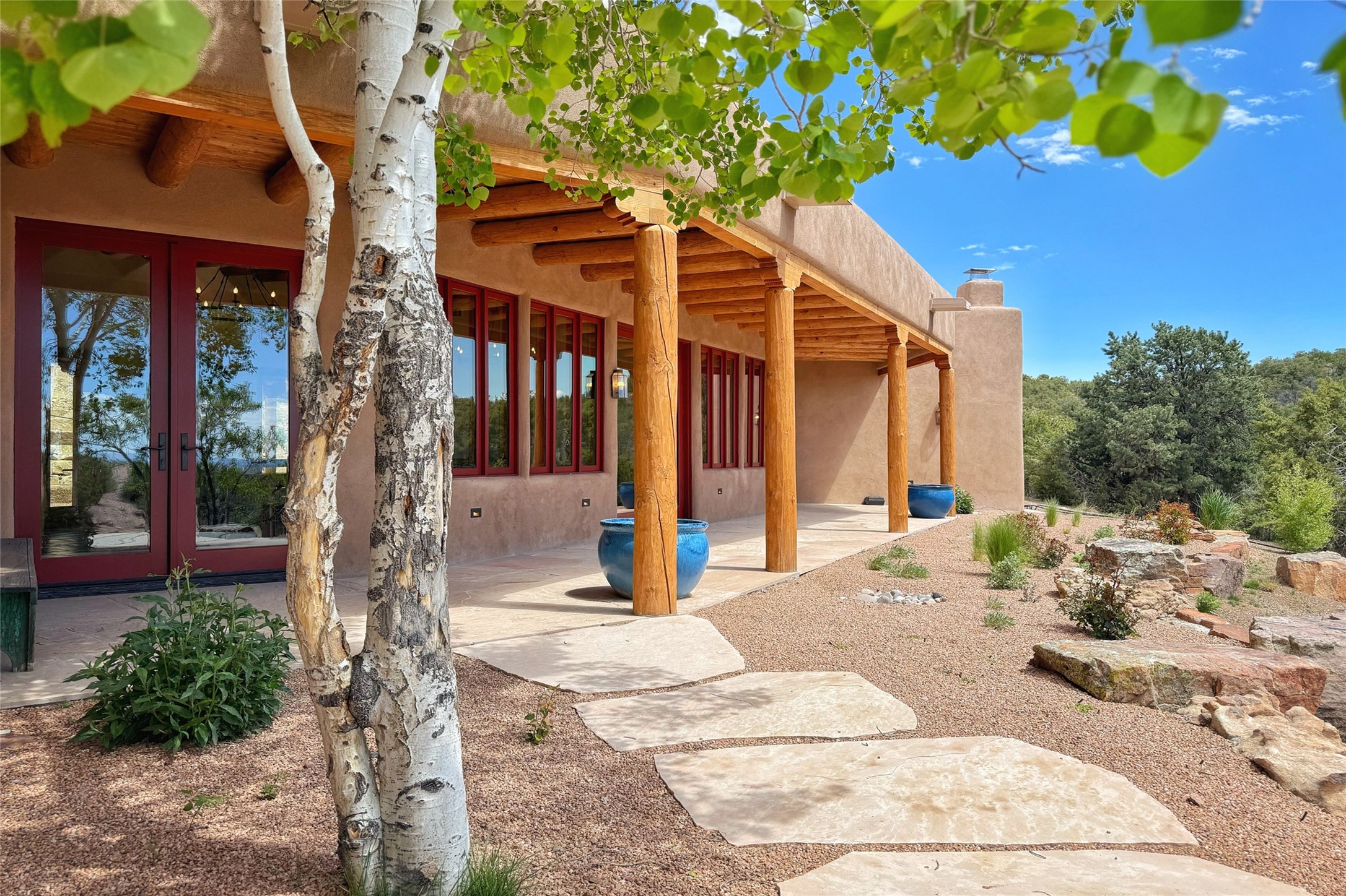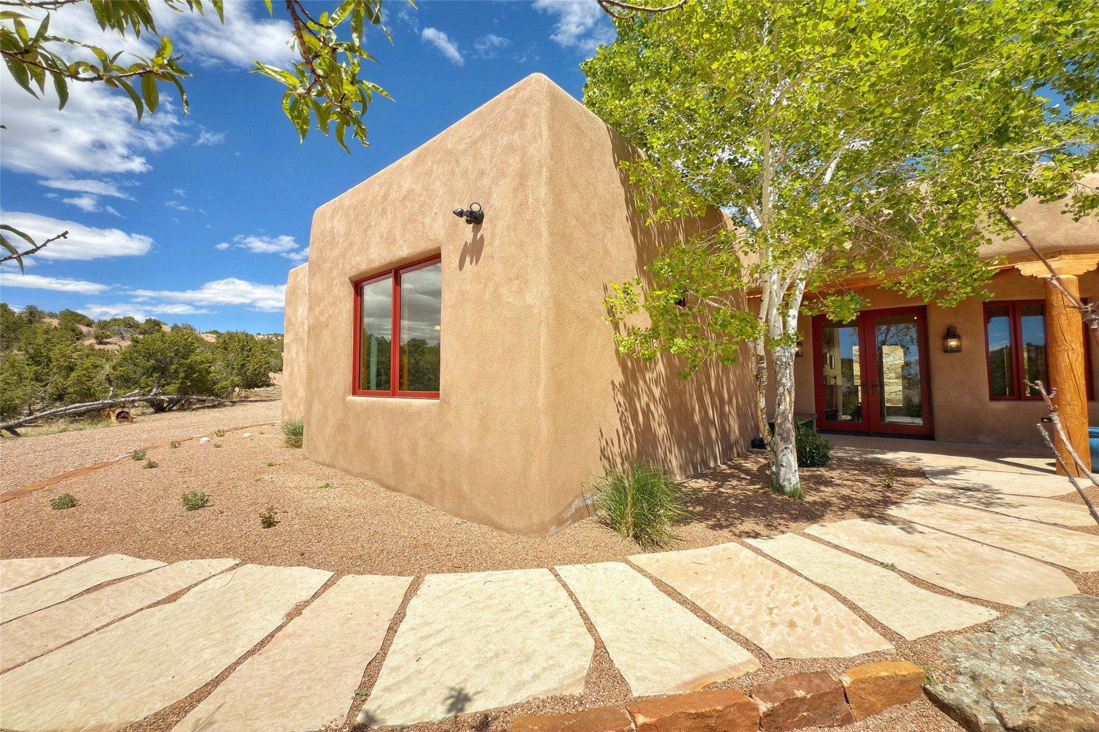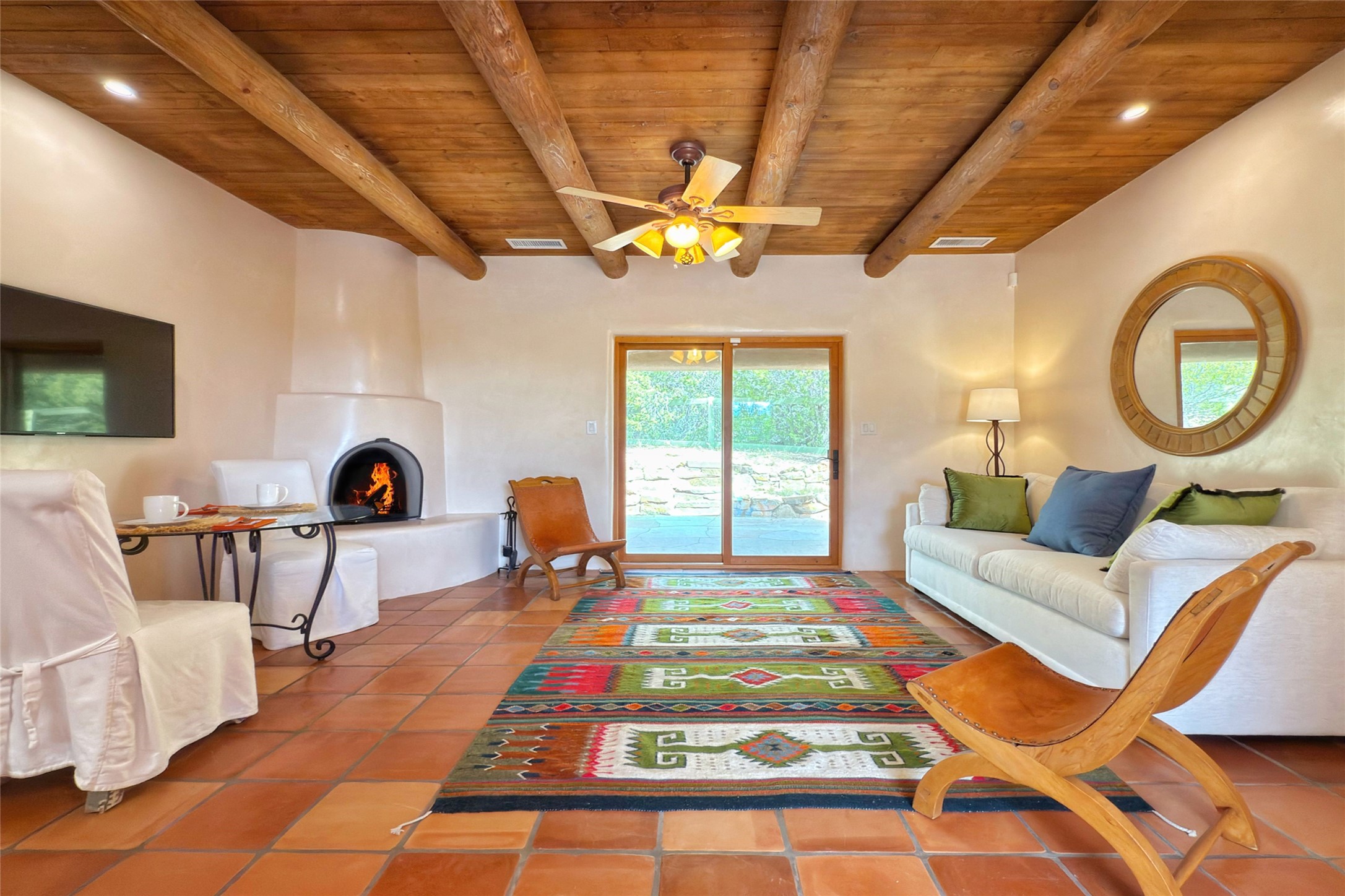 Southwest Elegance Meets Modern Luxury - Tesuque Estate Near Santa FeExperience timeless charm and refined upgrades in this exceptional Tesuque estate just 15 minutes from downtown Santa Fe. The property includes a beautifully renovated main house, a private guesthouse, and a versatile third structure ideal as a studio, barn, or additional guest quarters.The main residence showcases superior craftsmanship with diamond plaster walls, Loewen windows and doors, and Saltillo tile floors. The chef's kitchen features SubZero and Wolf appliances, an Asko dishwasher, an imported porcelain farmhouse sink, and striking Taj Mahal quartz countertops. The great room impresses with soaring ceilings, dual chandeliers, a wood-burning fireplace, and expansive western views, flowing onto two covered flagstone patios--perfect for indoor-outdoor living.The primary suite offers a luxurious retreat with its own fireplace, a spa-like bath with soaking tub, walk-in shower, dual pedestal sinks, and an adjacent study with fireplace and patio access. Two additional bedrooms complete the home--one with ensuite bath, the other with access to a nearby half bath. Comforts include radiant floor heating and central A/C.The guesthouse offers two bedrooms and two baths, with upgrades mirroring the main home: diamond plaster walls, quartz countertops, radiant heating, central A/C, and Loewen windows. Its primary suite features a kiva fireplace, soaking tub, and walk-in shower, while the second bedroom enjoys tranquil western views. A cozy living/dining area with kiva fireplace and a private flagstone patio complete the space.Set on a beautifully landscaped lot with mature junipers, fenced areas, and irrigated gardens, this private estate offers peace and elegance just minutes from the heart of Santa Fe.