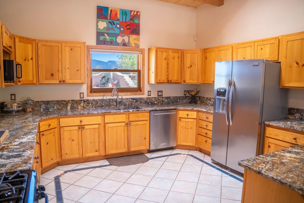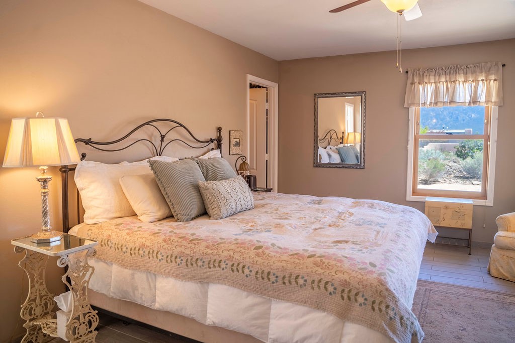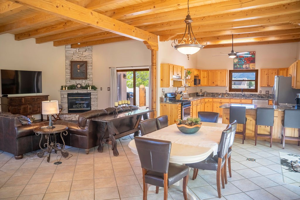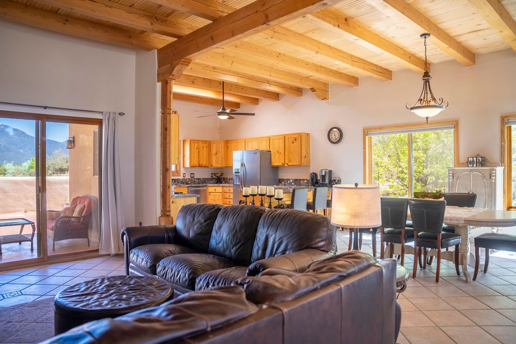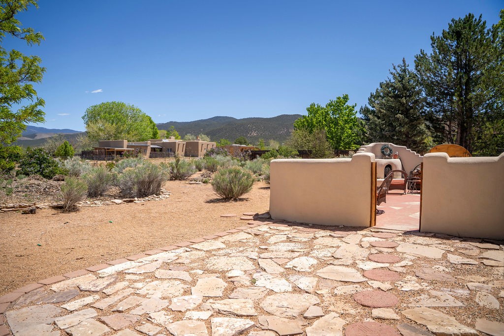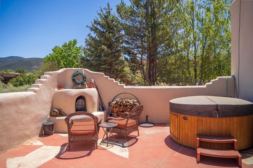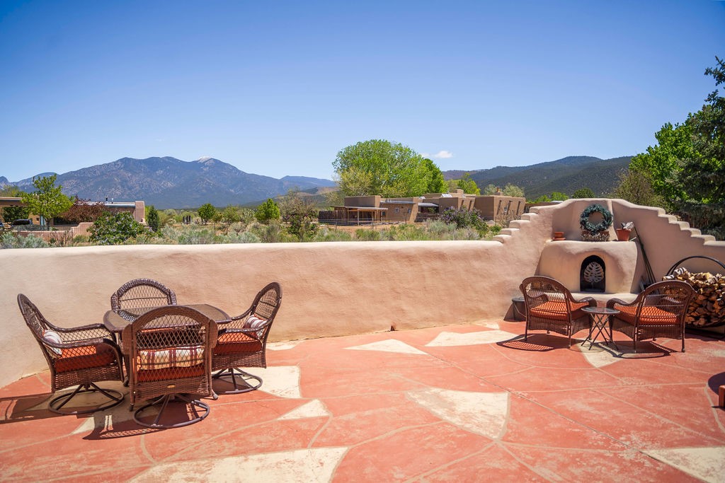 Welcome to this beautiful well maintained home in the Vegas de Taos Subdivision discover comfort and community in this desirable neighborhood with spectacular mountain and sunset views. Enjoy municipal services, newly paved roads, sidewalks, and underground utilities in a setting that feels both peaceful and connected. This property is just five minutes from historic Taos Plaza, offering easy access to shopping, dining, art, and culture. Step inside to an open and welcoming great room with vaulted 14 foot tongue and groove ceilings and a spacious kitchen with peninsula designed for both culinary creativity and casual gatherings. A sunlit sitting area tucked into a curved nook creates an ideal space for reading, reflection, or relaxation. The home features radiant floor heating and tile throughout including closets adding comfort and ease of maintenance. The great room includes thoughtful design accents that reflect the regions Southwestern character, while built-in electrical floor outlets allow for flexible furniture placement. This well-appointed residence includes 3 bedrooms and 2.5 bathrooms, providing both functionality and privacy. The generously sized primary suite features a walk-in closet and an ensuite bathroom with a skylight, claw foot soaking tub with hand held shower, double sinks, and a separate walk in shower. The second full bathroom conveniently located between the two additional bedrooms also includes a walk in shower with a built in bench. A discreetly located powder room off the great room offers added convenience for guests. A gas fireplace in the living area enhances the cozy atmosphere during cooler seasons, while three swamp coolers help maintain comfort during warmer months. Outdoor living is effortless, with a patio that offers unobstructed views of Pueblo Peak and access from both the great room and primary bedroom. A traditional kiva fireplace invites year-round enjoyment, and a four person hot tub provides a relaxing retreat for stargazing or listening to elk bugling in the distance. The two-car garage includes ample built-in storage and an additional refrigerator/freezer, with both keypad entry and automatic openers. The fully fenced, three-quarter-acre lot is designed for low-maintenance care and is enhanced by mature trees including cottonwoods and evergreens that add privacy and natural beauty. This thoughtfully designed home offers comfort, functionality, and scenic surroundings, all within minutes of the cultural and recreational amenities of Taos. Whether you're looking for a full time residence, a mountain getaway, or an easy to maintain base in the heart of Northern New Mexico, this home offers comfort, community, and that unmistakable Taos spirit. Location, lifestyle, and livability this is Vegas de Taos.