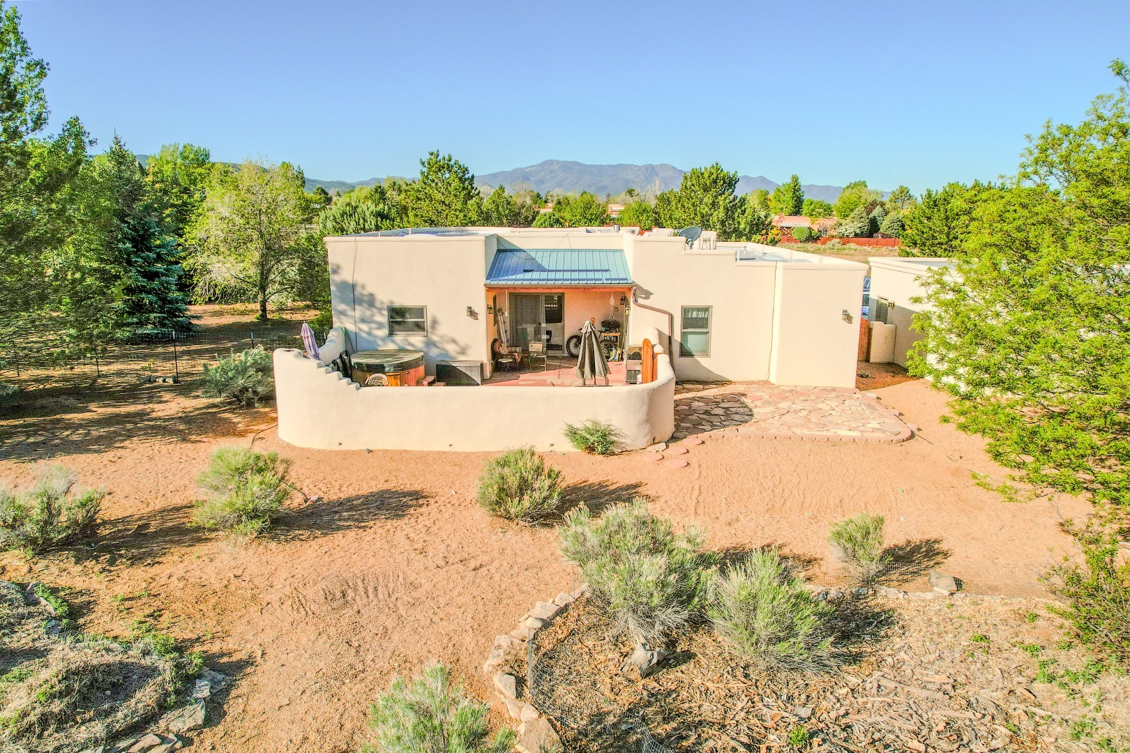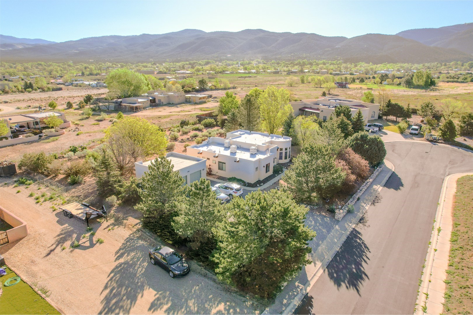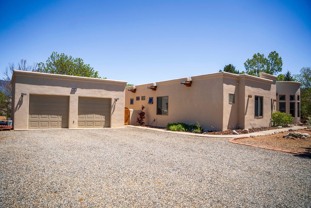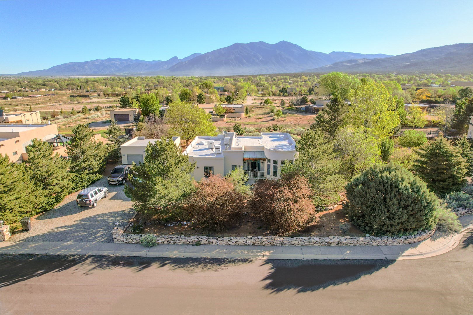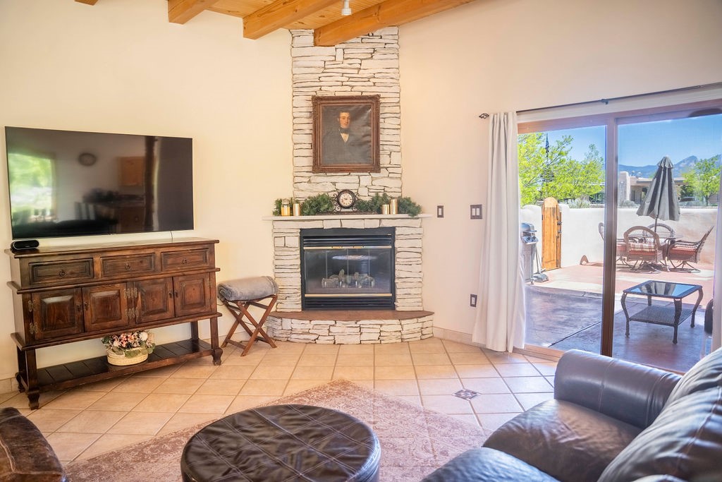 Welcome to this beautiful well maintained home in the Vegas de Taos Subdivision discover comfort and community in this desirable neighborhood with spectacular mountain and sunset views. Enjoy municipal services, newly paved roads, sidewalks, and underground utilities in a setting that feels both peaceful and connected. This property is just five minutes from historic Taos Plaza, offering easy access to shopping, dining, art, and culture. Step inside to an open and welcoming great room with vaulted 14 foot tongue and groove ceilings and a spacious kitchen with peninsula designed for both culinary creativity and casual gatherings. A sunlit sitting area tucked into a curved nook creates an ideal space for reading, reflection, or relaxation. The home features radiant floor heating and tile throughout including closets adding comfort and ease of maintenance. The great room includes thoughtful design accents that reflect the regions Southwestern character, while built-in electrical floor outlets allow for flexible furniture placement. This well-appointed residence includes 3 bedrooms and 2.5 bathrooms, providing both functionality and privacy. The generously sized primary suite features a walk-in closet and an ensuite bathroom with a skylight, claw foot soaking tub with hand held shower, double sinks, and a separate walk in shower. The second full bathroom conveniently located between the two additional bedrooms also includes a walk in shower with a built in bench. A discreetly located powder room off the great room offers added convenience for guests. A gas fireplace in the living area enhances the cozy atmosphere during cooler seasons, while three swamp coolers help maintain comfort during warmer months. Outdoor living is effortless, with a patio that offers unobstructed views of Pueblo Peak and access from both the great room and primary bedroom. A traditional kiva fireplace invites year-round enjoyment, and a four person hot tub provides a relaxing retreat for stargazing or listening to elk bugling in the distance. The two-car garage includes ample built-in storage and an additional refrigerator/freezer, with both keypad entry and automatic openers. The fully fenced, three-quarter-acre lot is designed for low-maintenance care and is enhanced by mature trees including cottonwoods and evergreens that add privacy and natural beauty. This thoughtfully designed home offers comfort, functionality, and scenic surroundings, all within minutes of the cultural and recreational amenities of Taos. Whether you're looking for a full time residence, a mountain getaway, or an easy to maintain base in the heart of Northern New Mexico, this home offers comfort, community, and that unmistakable Taos spirit. Location, lifestyle, and livability this is Vegas de Taos.