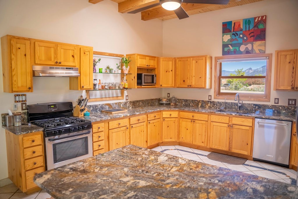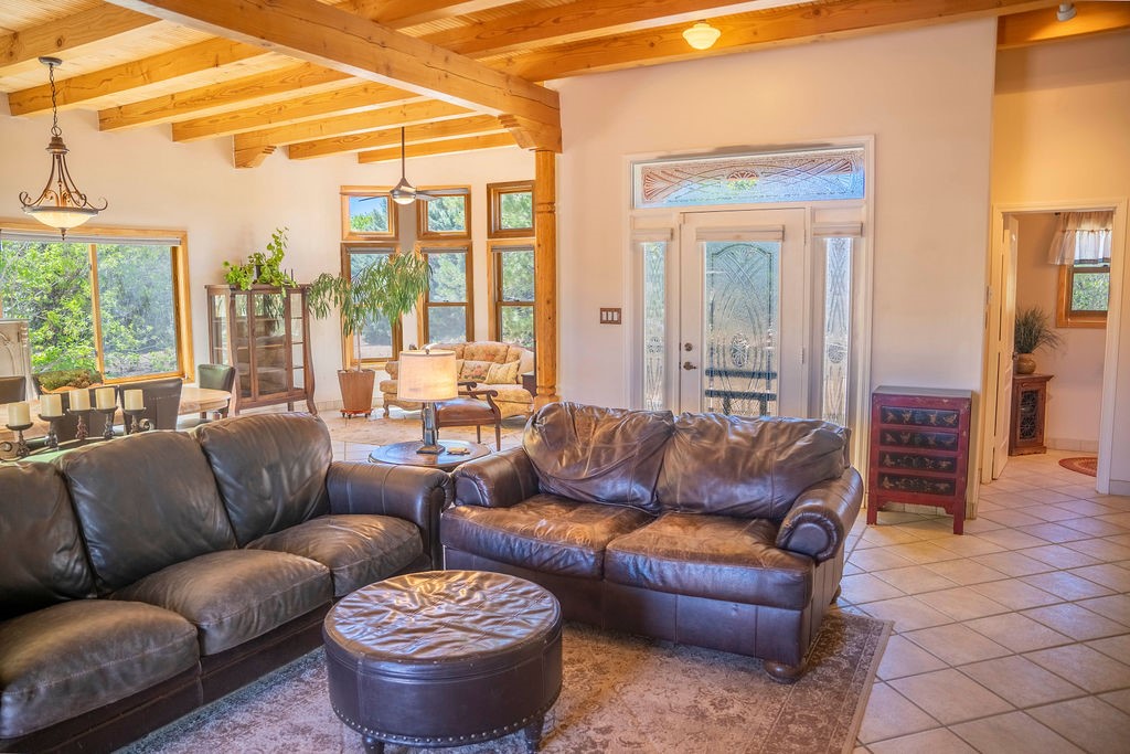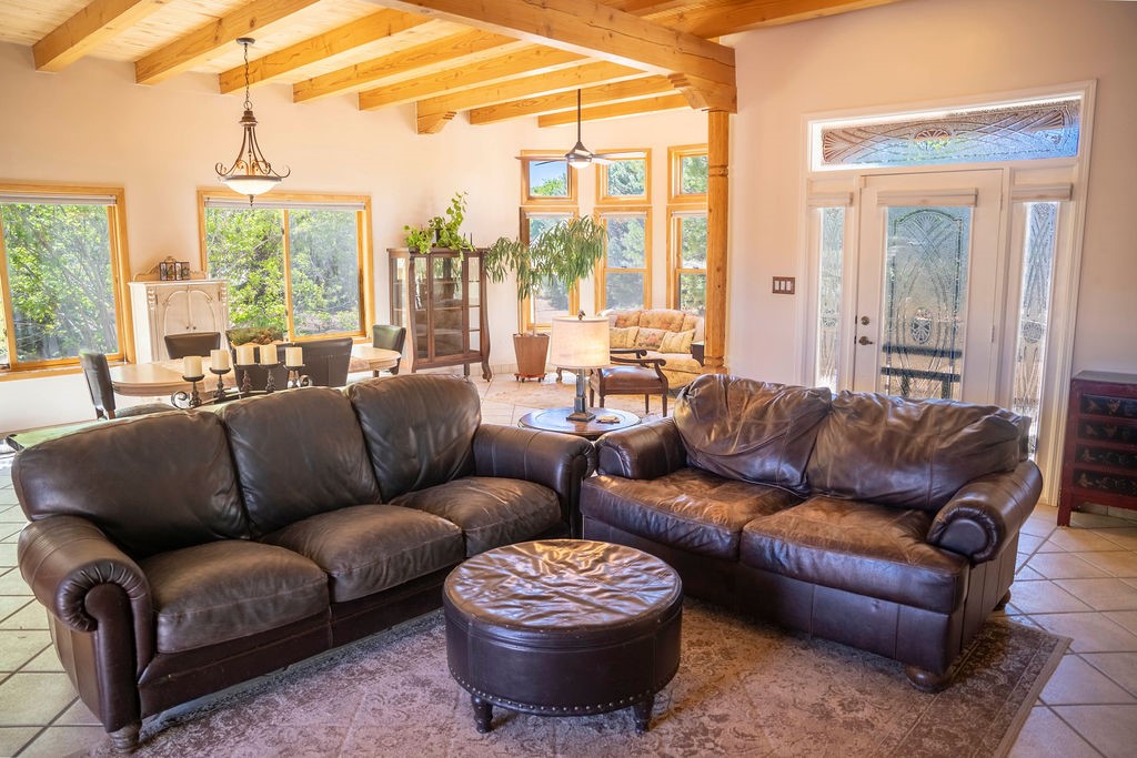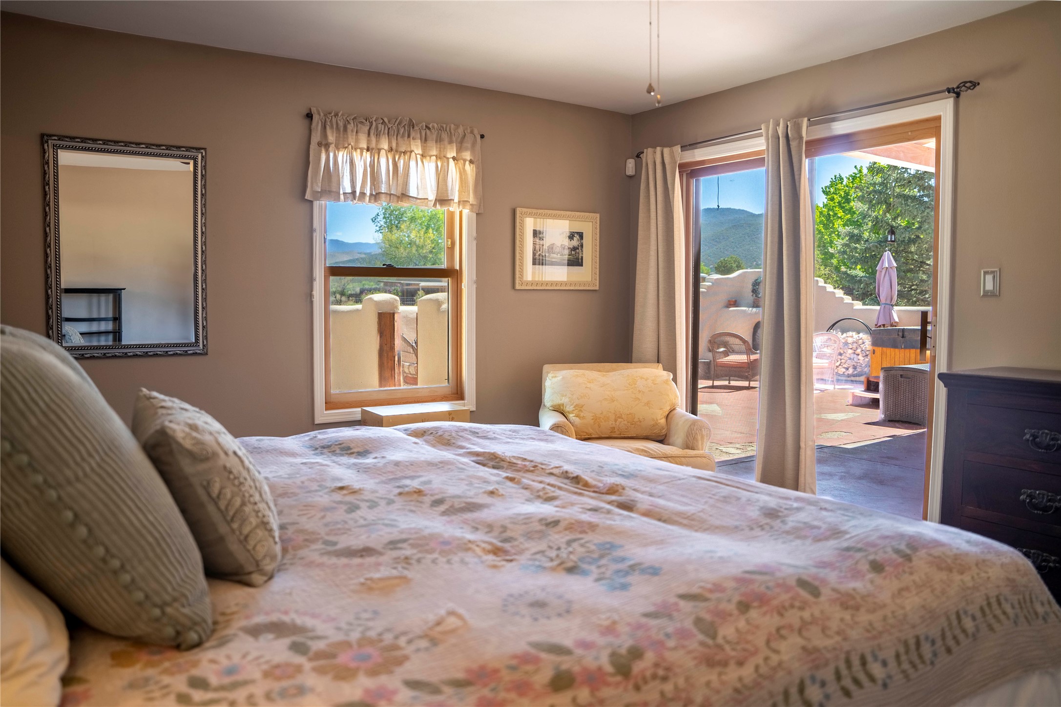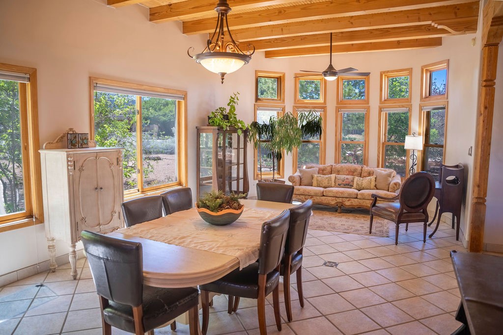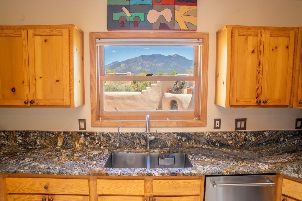 Welcome to this beautiful well maintained home in the Vegas de Taos Subdivision discover comfort and community in this desirable neighborhood with spectacular mountain and sunset views. Enjoy municipal services, newly paved roads, sidewalks, and underground utilities in a setting that feels both peaceful and connected. This property is just five minutes from historic Taos Plaza, offering easy access to shopping, dining, art, and culture. Step inside to an open and welcoming great room with vaulted 14 foot tongue and groove ceilings and a spacious kitchen with peninsula designed for both culinary creativity and casual gatherings. A sunlit sitting area tucked into a curved nook creates an ideal space for reading, reflection, or relaxation. The home features radiant floor heating and tile throughout including closets adding comfort and ease of maintenance. The great room includes thoughtful design accents that reflect the regions Southwestern character, while built-in electrical floor outlets allow for flexible furniture placement. This well-appointed residence includes 3 bedrooms and 2.5 bathrooms, providing both functionality and privacy. The generously sized primary suite features a walk-in closet and an ensuite bathroom with a skylight, claw foot soaking tub with hand held shower, double sinks, and a separate walk in shower. The second full bathroom conveniently located between the two additional bedrooms also includes a walk in shower with a built in bench. A discreetly located powder room off the great room offers added convenience for guests. A gas fireplace in the living area enhances the cozy atmosphere during cooler seasons, while three swamp coolers help maintain comfort during warmer months. Outdoor living is effortless, with a patio that offers unobstructed views of Pueblo Peak and access from both the great room and primary bedroom. A traditional kiva fireplace invites year-round enjoyment, and a four person hot tub provides a relaxing retreat for stargazing or listening to elk bugling in the distance. The two-car garage includes ample built-in storage and an additional refrigerator/freezer, with both keypad entry and automatic openers. The fully fenced, three-quarter-acre lot is designed for low-maintenance care and is enhanced by mature trees including cottonwoods and evergreens that add privacy and natural beauty. This thoughtfully designed home offers comfort, functionality, and scenic surroundings, all within minutes of the cultural and recreational amenities of Taos. Whether you're looking for a full time residence, a mountain getaway, or an easy to maintain base in the heart of Northern New Mexico, this home offers comfort, community, and that unmistakable Taos spirit. Location, lifestyle, and livability this is Vegas de Taos.