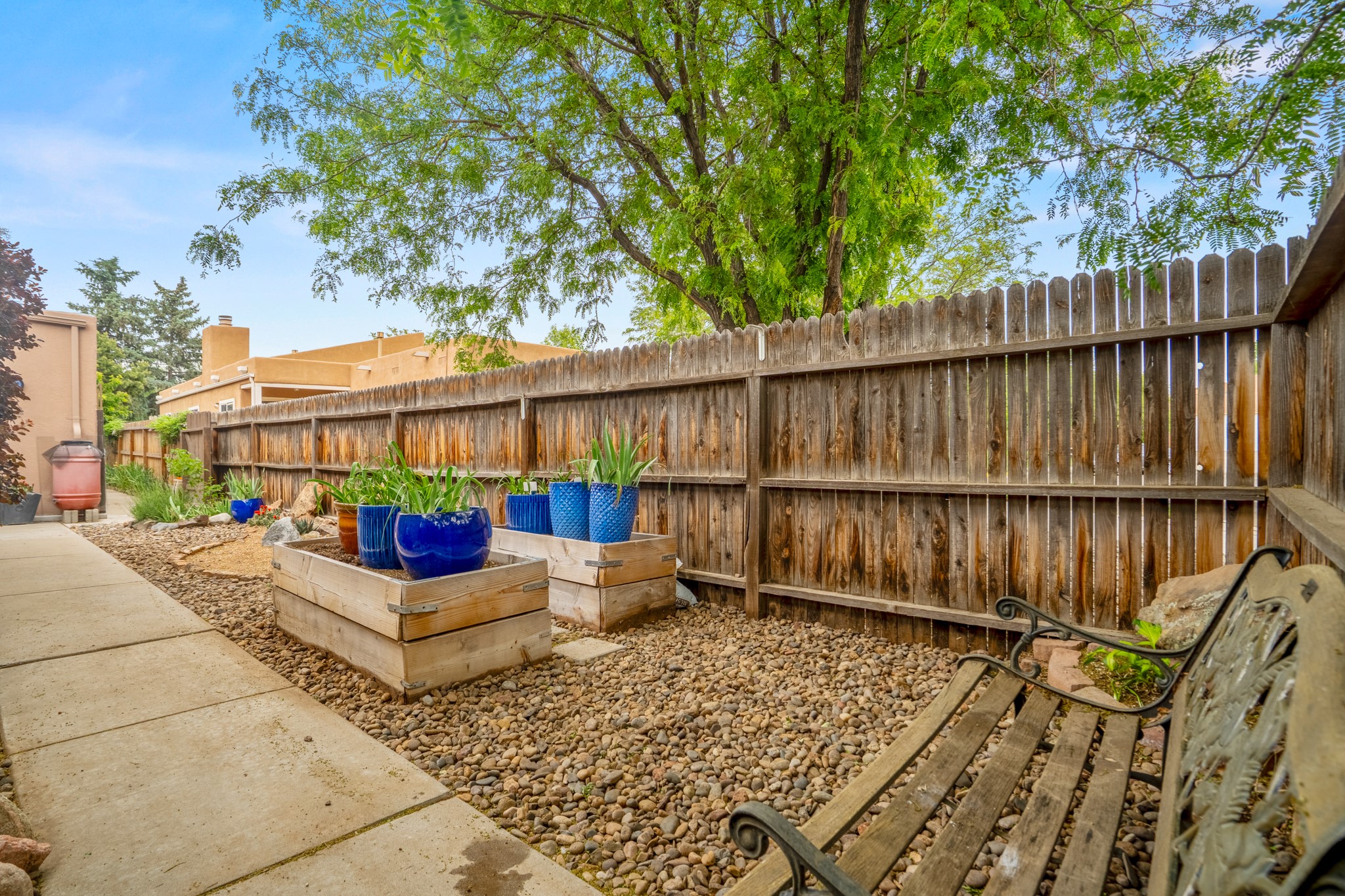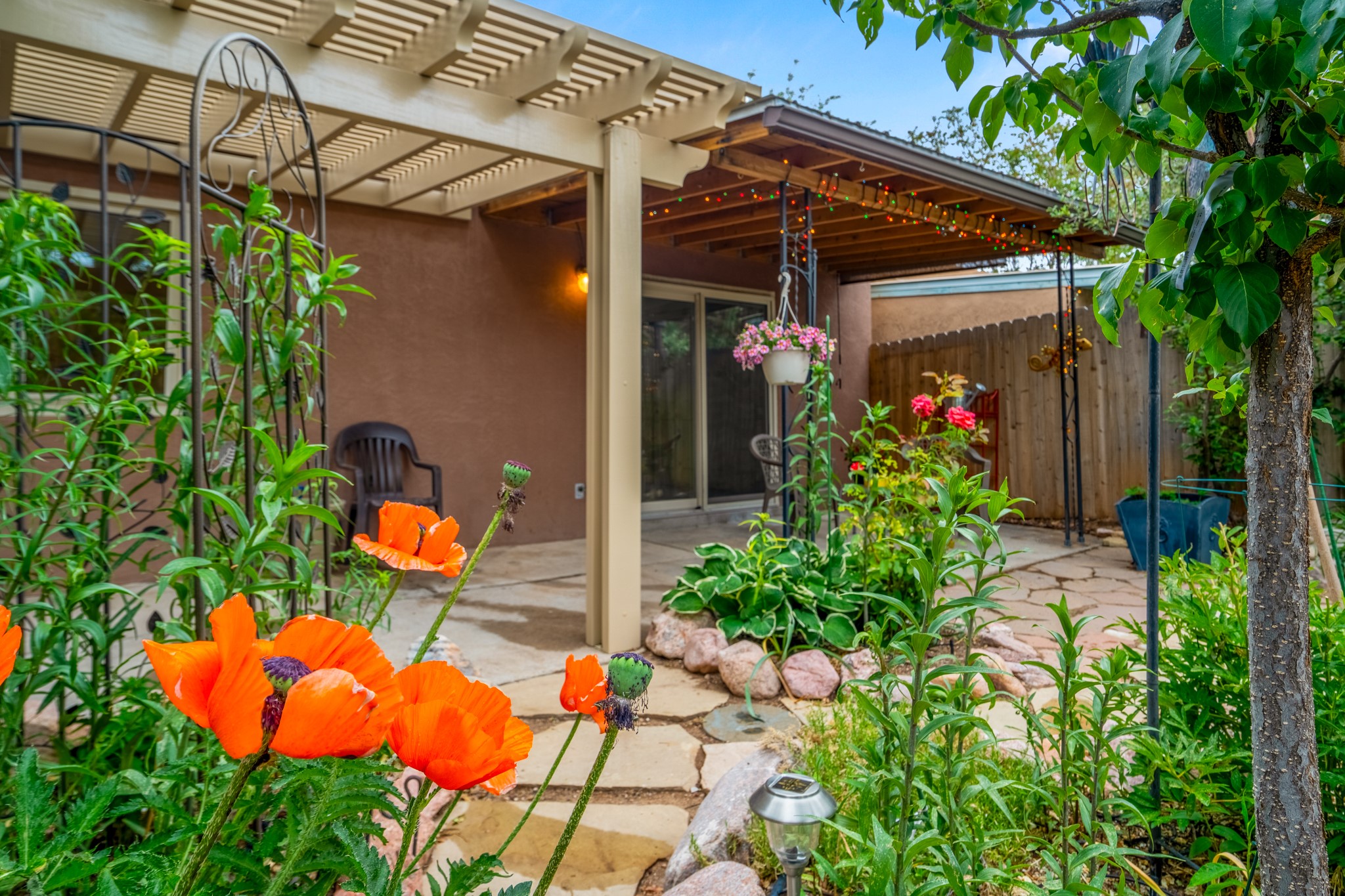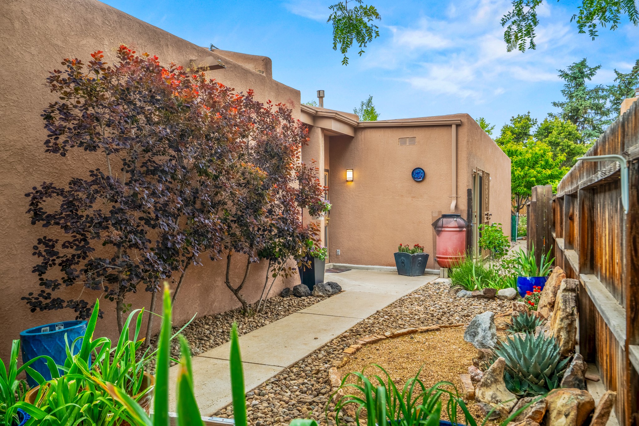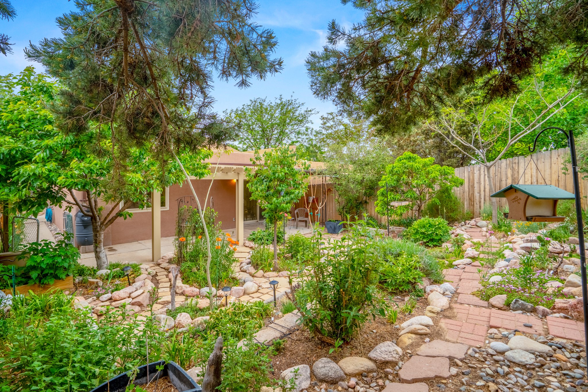 Tucked away on a centrally located cul-de-sac in the desirable La Resolana community, this charming 2-bedroom, 2-bathroom home offers approximately 1,276 square feet of comfort and style--plus a dedicated office that could easily be converted into a third bedroom and a spacious 2-car garage. The beautifully landscaped property features exquisite gardens, multiple mature trees, and a private cedar wood-fenced yard with a pergola and patio, perfect for peaceful outdoor living and entertaining. Inside, you'll find a light-filled open layout with fresh paint, granite countertops in both the kitchen and updated bathroom vanities, updated appliances, and new energy-efficient windows added in 2024. Additional improvements include a replaced flat portion of the roof (2021), central air cooling, offering both comfort and practicality. Additional highlights include seller-provided building plans and unbeatable convenience with easy access to nearby parks, major shopping centers, and the internationally acclaimed Meow Wolf. Don't miss this rare opportunity to own a lovingly maintained home with lush landscaping and exceptional curb appeal in one of Santa Fe's most central and established neighborhoods.