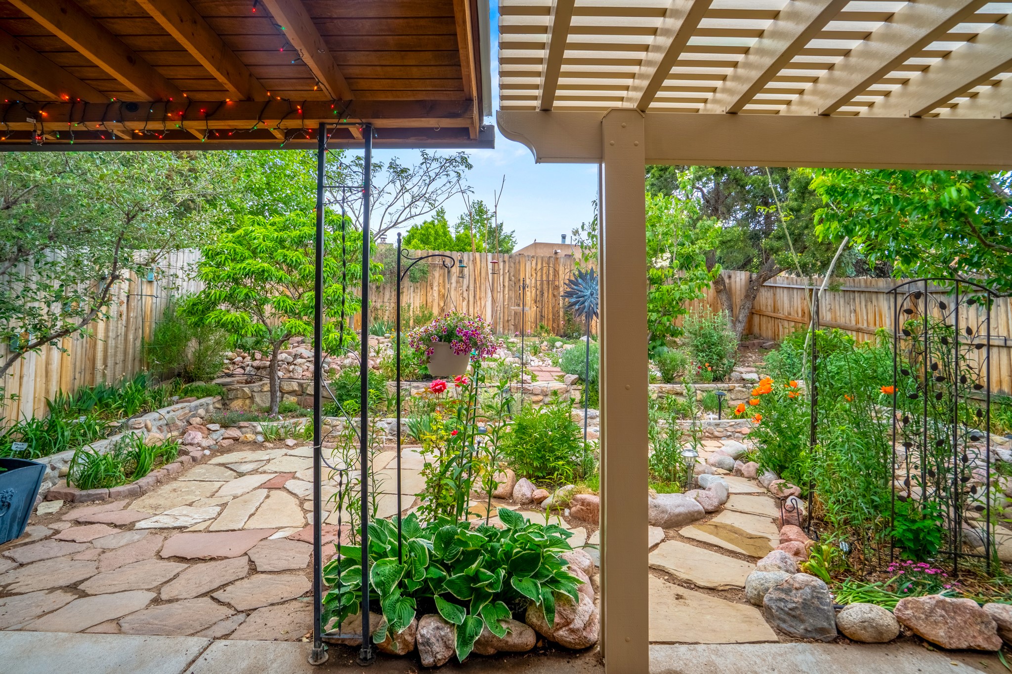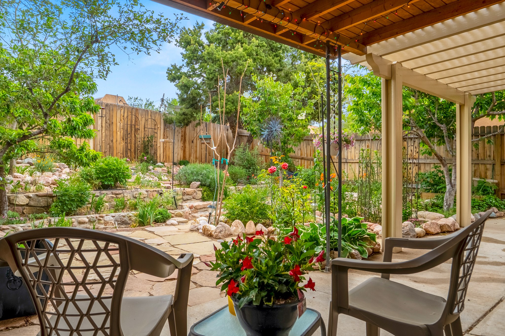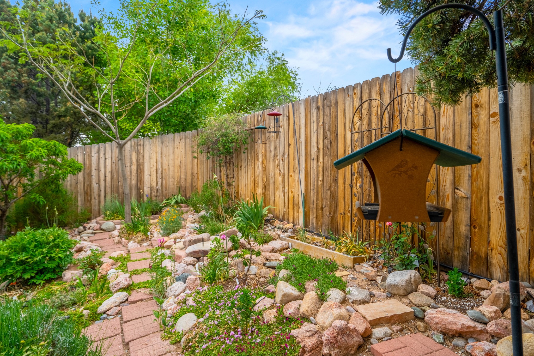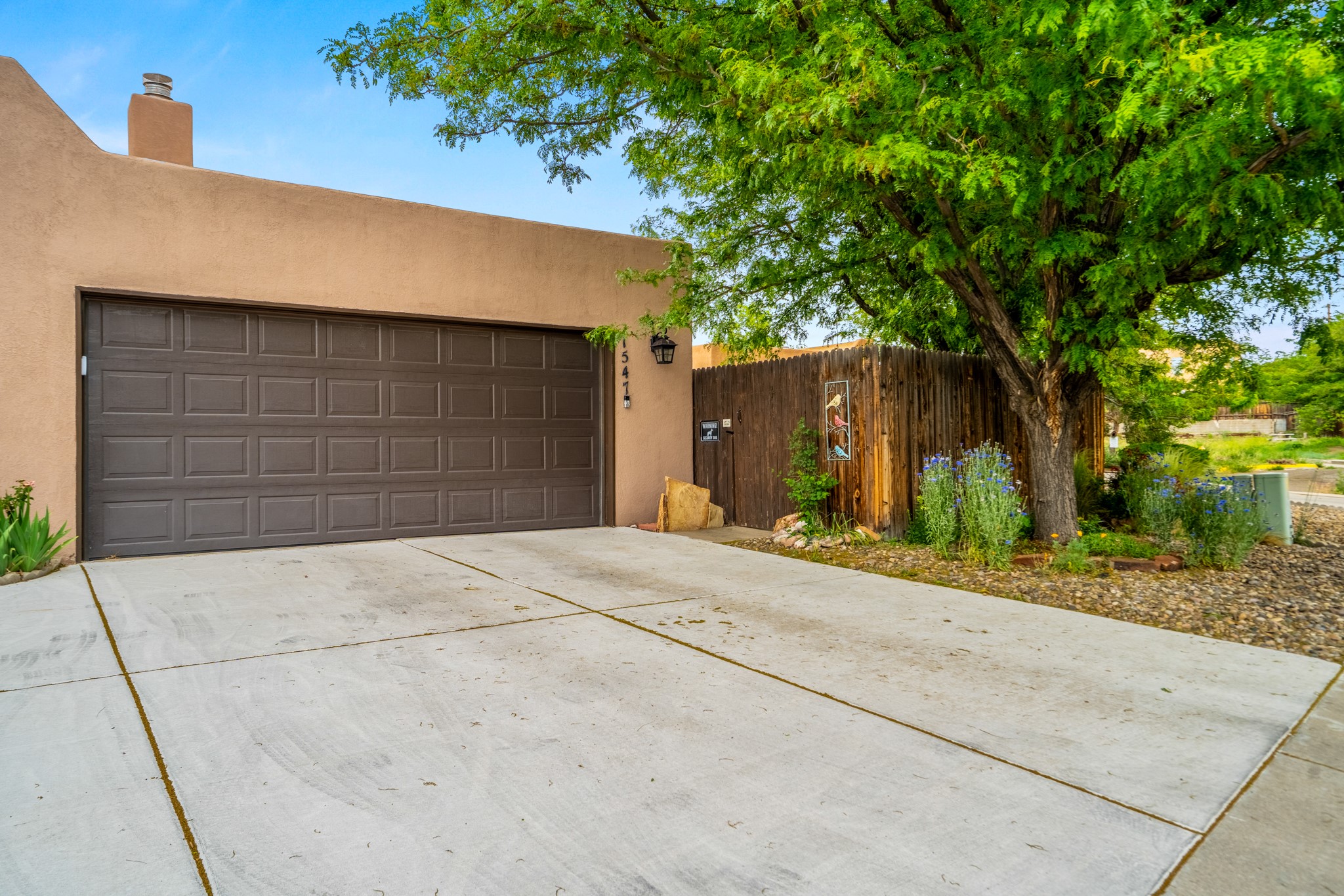Tucked away on a centrally located cul-de-sac in the desirable La Resolana community, this charming 2-bedroom, 2-bathroom home offers approximately 1,276 square feet of comfort and style--plus a dedicated office that could easily be converted into a third bedroom and a spacious 2-car garage. The beautifully landscaped property features exquisite gardens, multiple mature trees, and a private cedar wood-fenced yard with a pergola and patio, perfect for peaceful outdoor living and entertaining. Inside, you'll find a light-filled open layout with fresh paint, granite countertops in both the kitchen and updated bathroom vanities, updated appliances, and new energy-efficient windows added in 2024. Additional improvements include a replaced flat portion of the roof (2021), central air cooling, offering both comfort and practicality. Additional highlights include seller-provided building plans and unbeatable convenience with easy access to nearby parks, major shopping centers, and the internationally acclaimed Meow Wolf. Don't miss this rare opportunity to own a lovingly maintained home with lush landscaping and exceptional curb appeal in one of Santa Fe's most central and established neighborhoods.