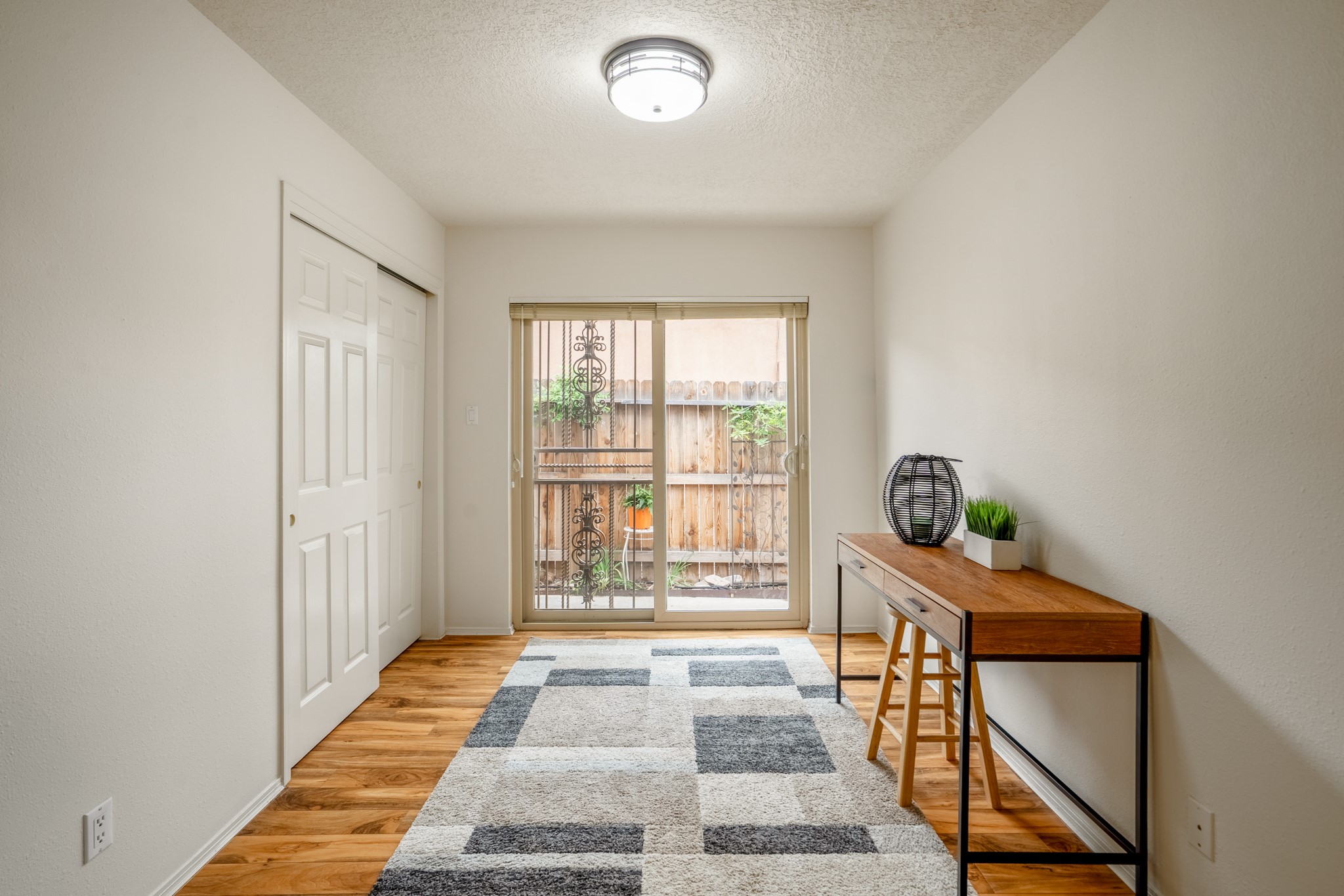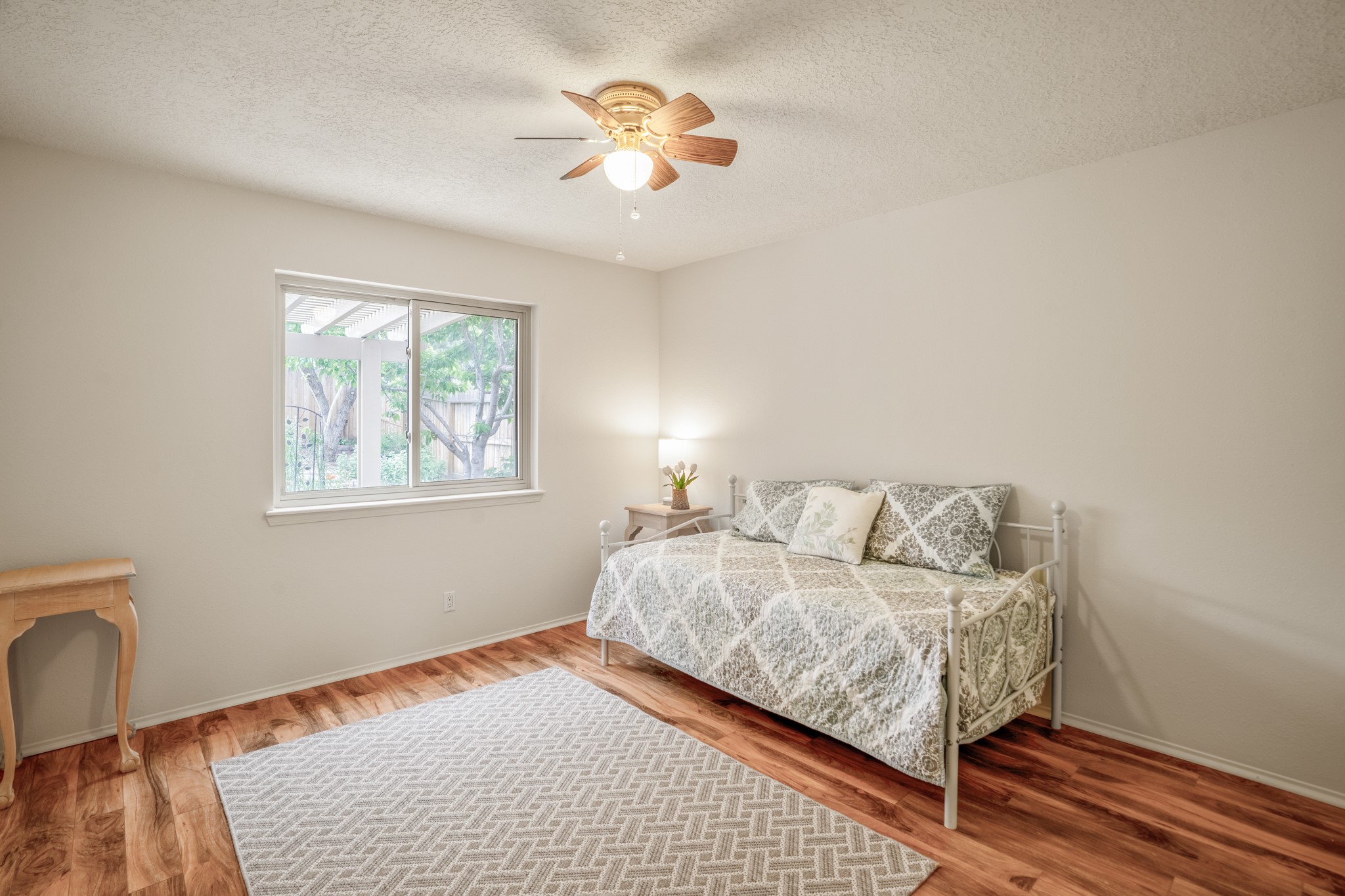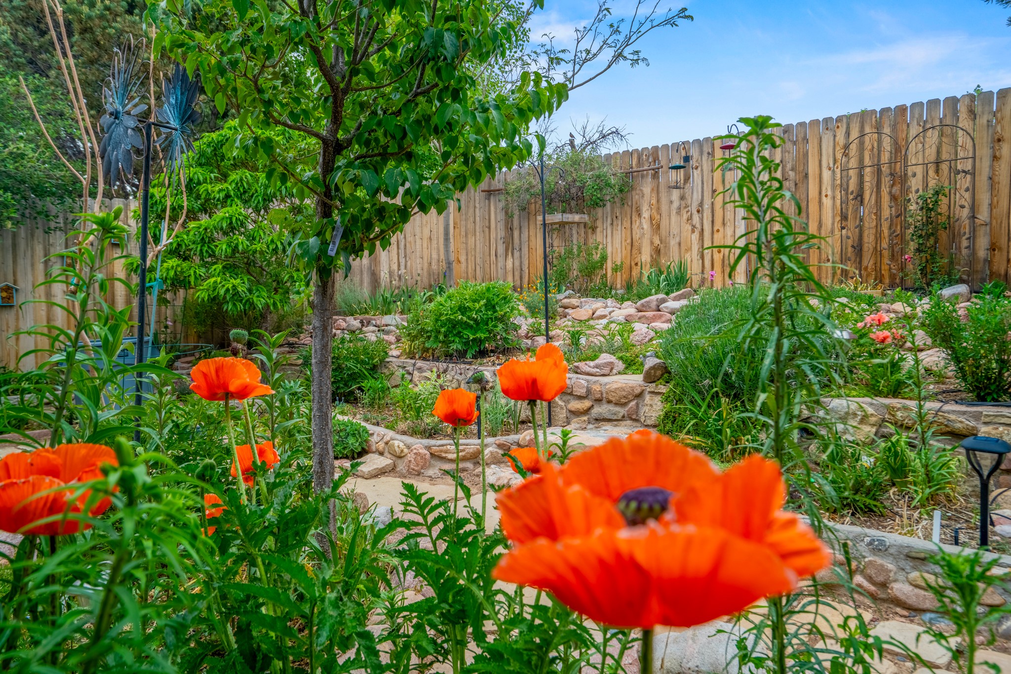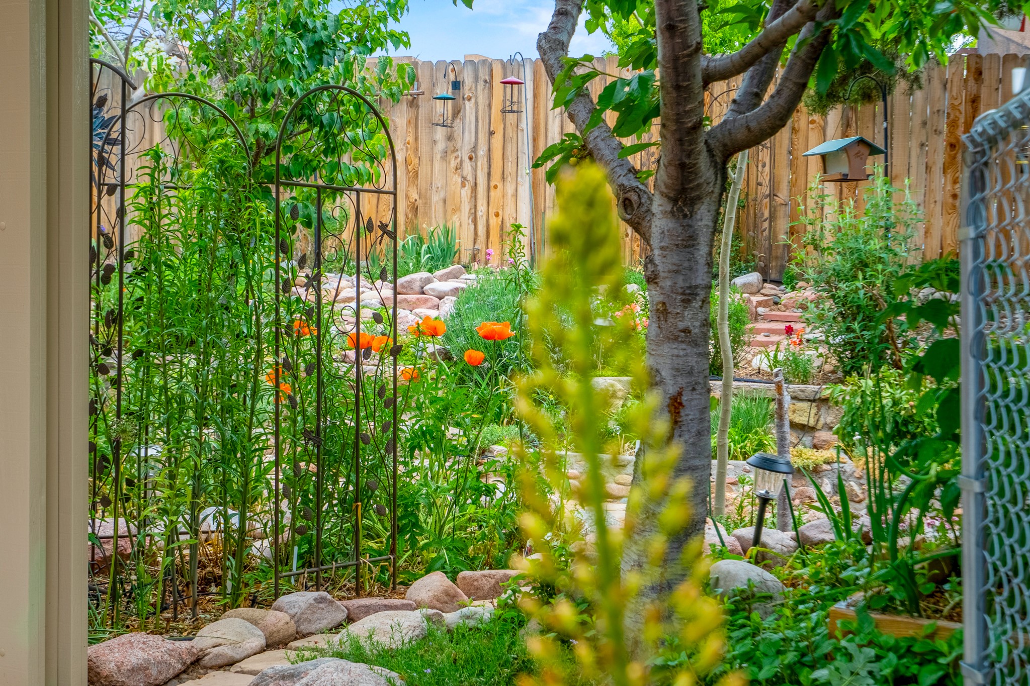 Tucked away on a centrally located cul-de-sac in the desirable La Resolana community, this charming 2-bedroom, 2-bathroom home offers approximately 1,276 square feet of comfort and style--plus a dedicated office that could easily be converted into a third bedroom and a spacious 2-car garage. The beautifully landscaped property features exquisite gardens, multiple mature trees, and a private cedar wood-fenced yard with a pergola and patio, perfect for peaceful outdoor living and entertaining. Inside, you'll find a light-filled open layout with fresh paint, granite countertops in both the kitchen and updated bathroom vanities, updated appliances, and new energy-efficient windows added in 2024. Additional improvements include a replaced flat portion of the roof (2021), central air cooling, offering both comfort and practicality. Additional highlights include seller-provided building plans and unbeatable convenience with easy access to nearby parks, major shopping centers, and the internationally acclaimed Meow Wolf. Don't miss this rare opportunity to own a lovingly maintained home with lush landscaping and exceptional curb appeal in one of Santa Fe's most central and established neighborhoods.