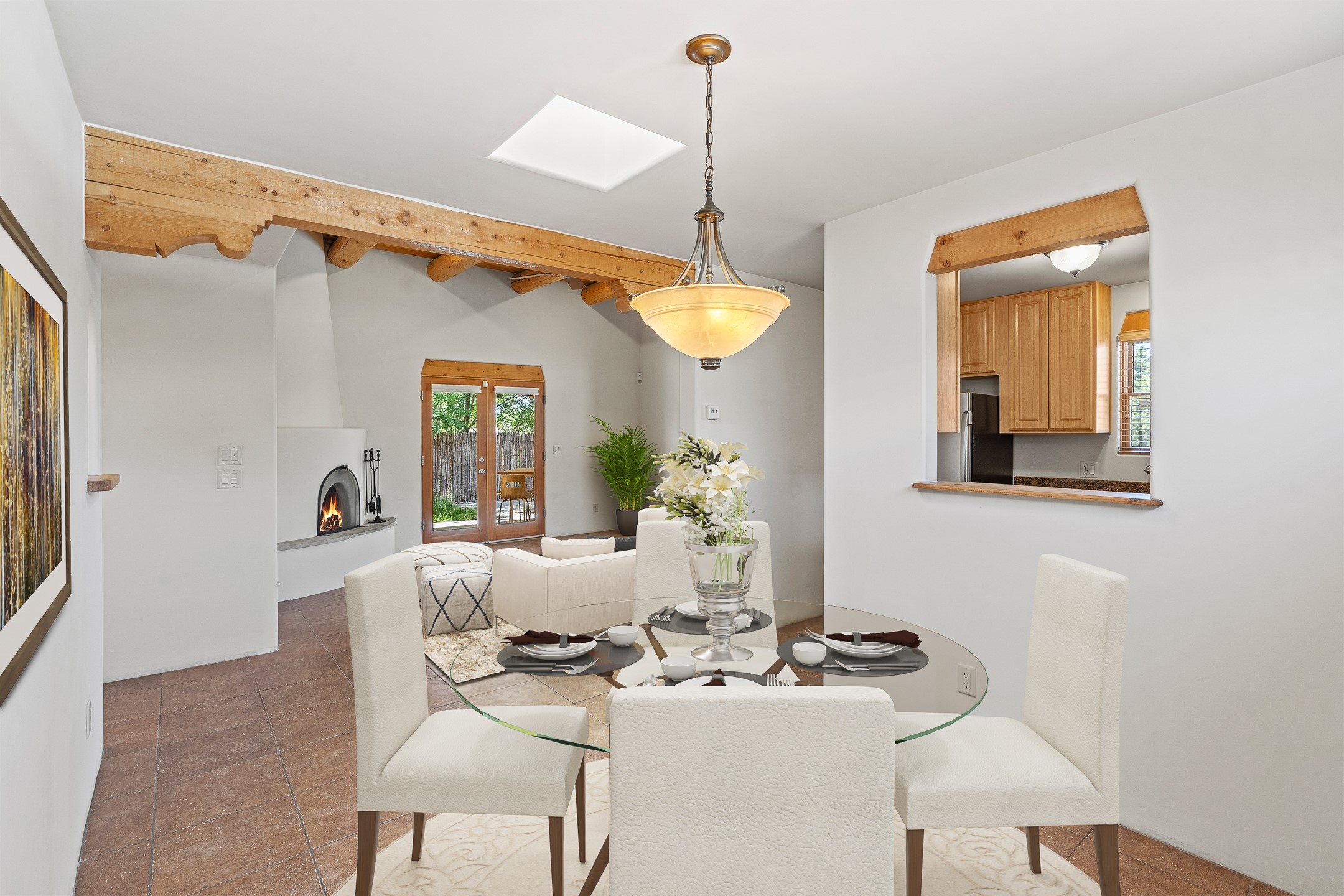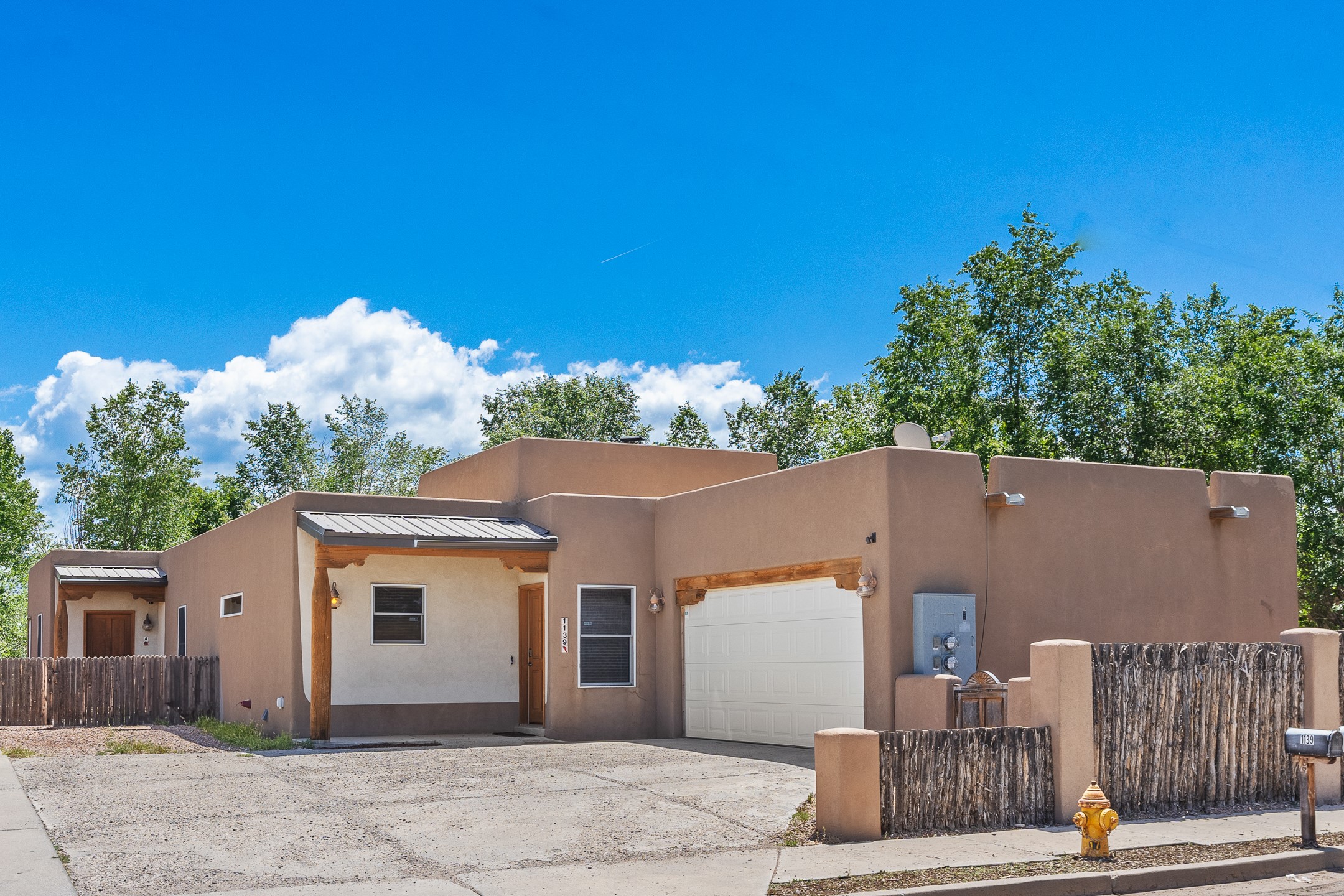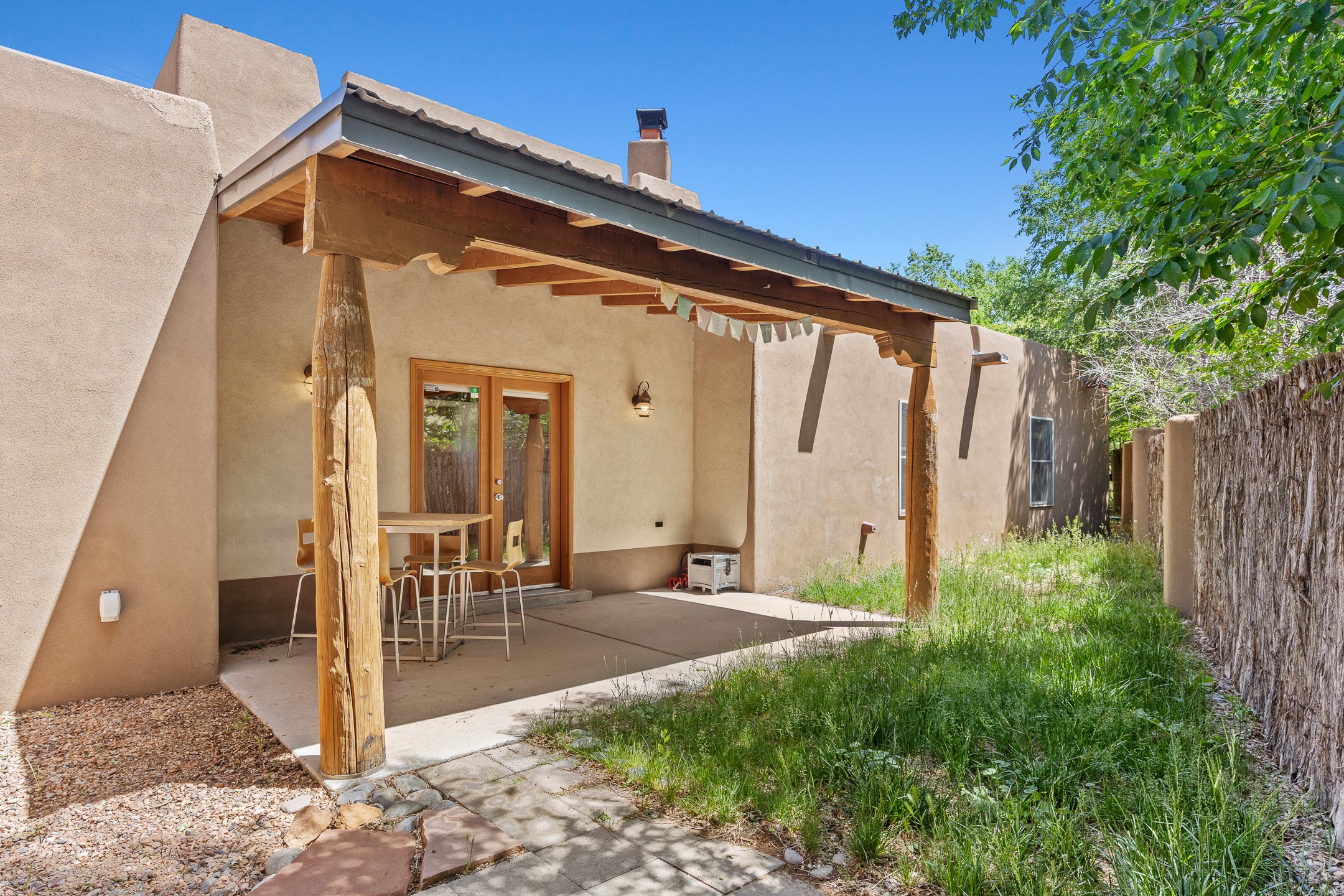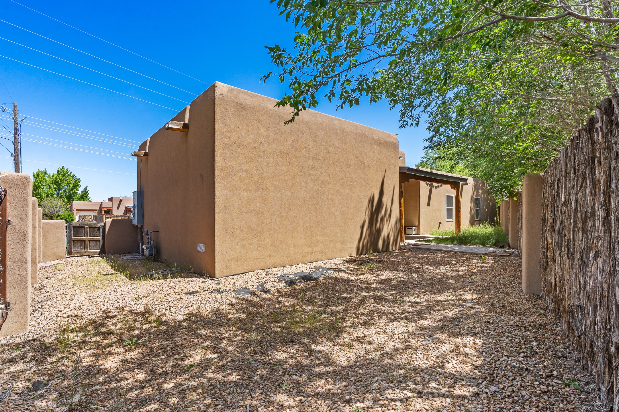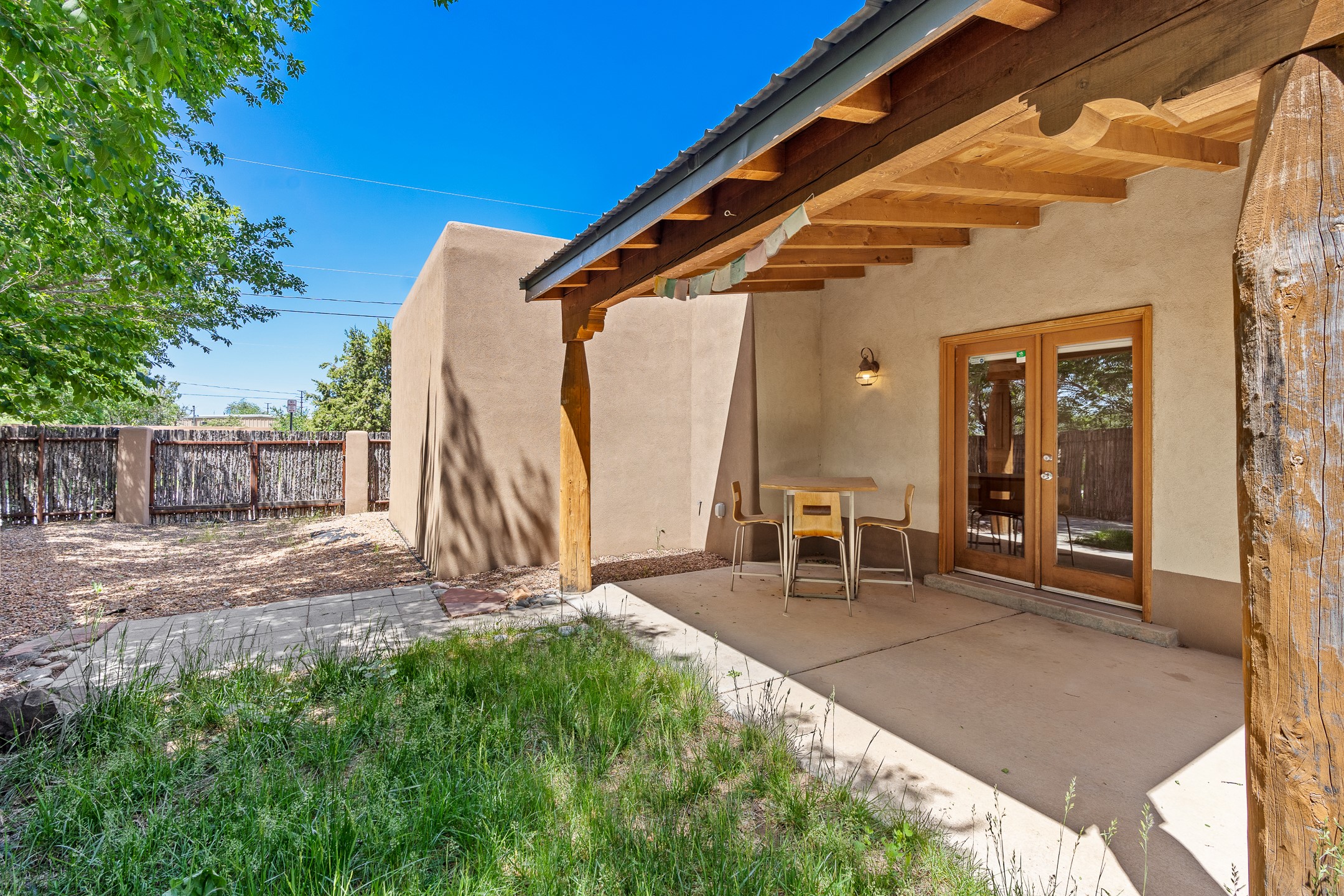 A versatile and charming property featuring a 3-bedroom, 2-bath main house plus a separate 1-bedroom, 1-bath guest house; ideal for rental income, extended family, or a home studio. The main house offers a spacious living area with tile floors, wood-beamed ceilings, and a traditional kiva fireplace, opening into the dining and kitchen area and a lovely covered patio area in a fully fenced yard. The primary suite includes a private bath and walk-in closet. A two-car garage adds to the flexible usage of the property. The guest house has its own entrance and includes a living area, kitchenette, bedroom, and full bath. There is also a washer / dryer hook-up, and it is separately metered. Centrally located, less than a 10-minute walk to restaurants such as Escondido and Tumbleroot Brewery, and a 10-minute drive to the Plaza.