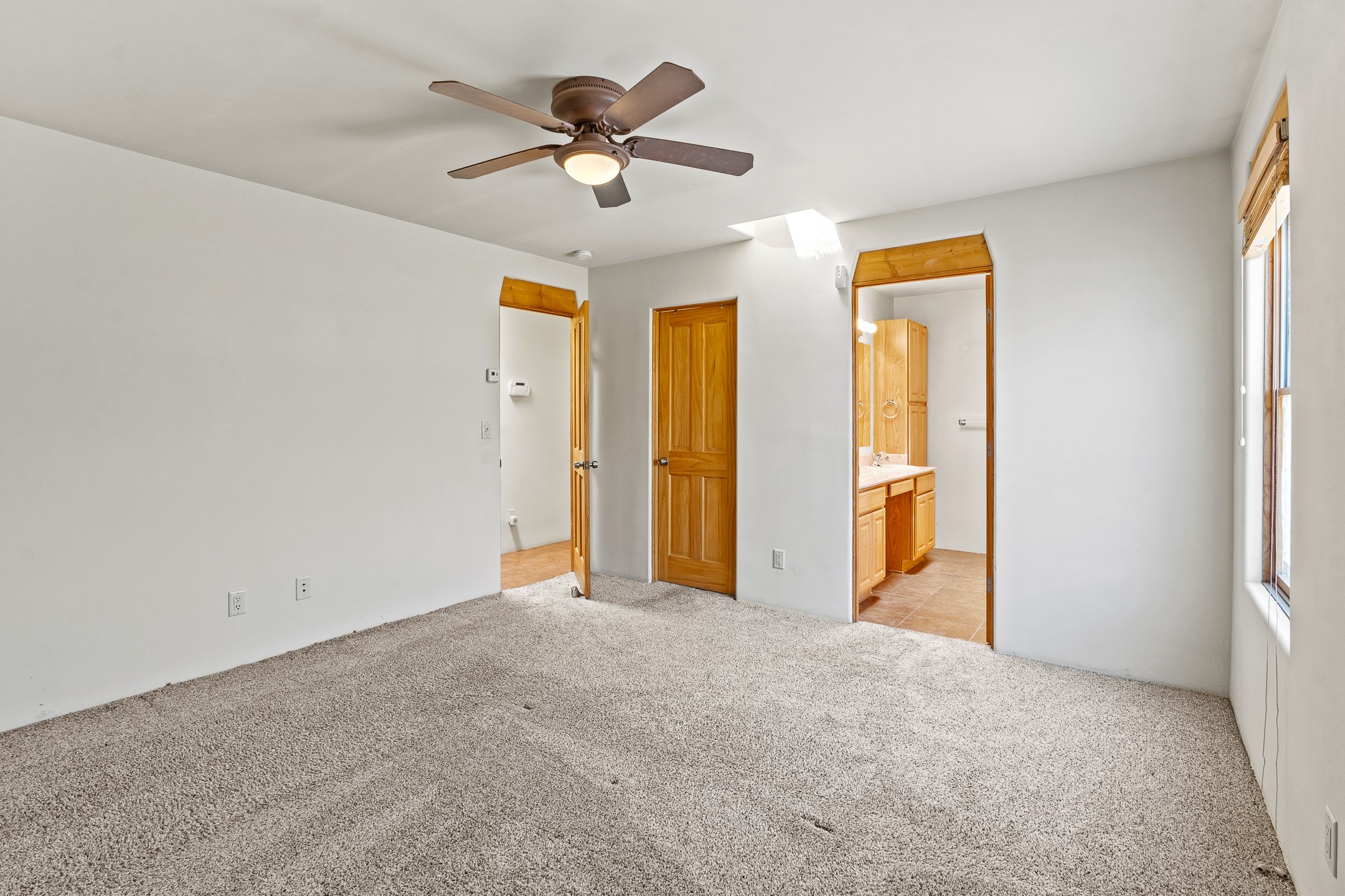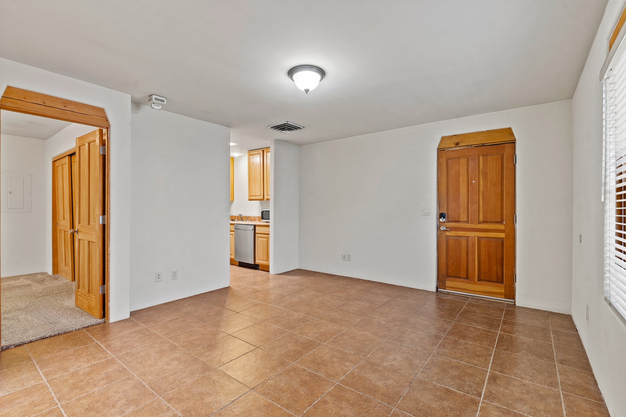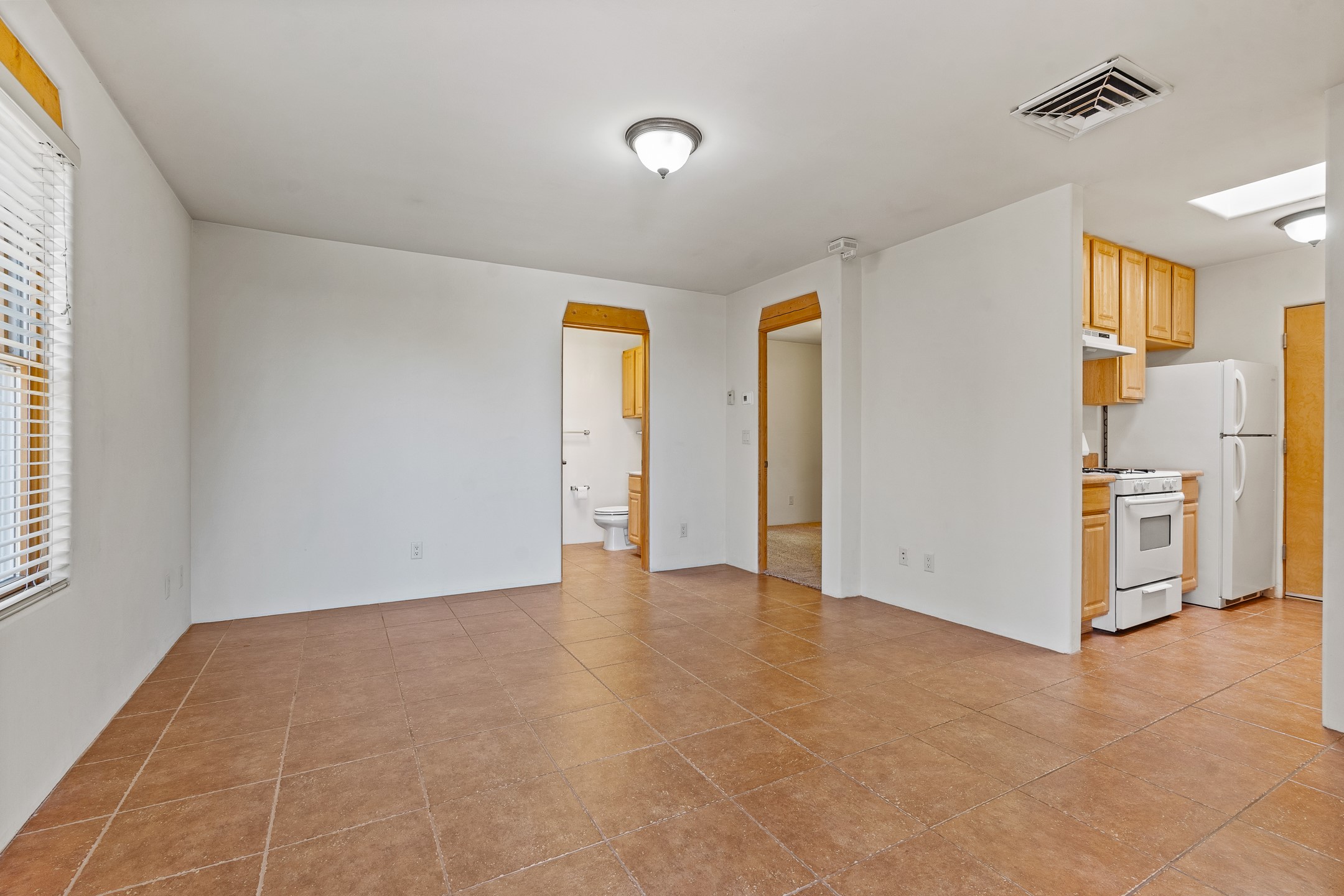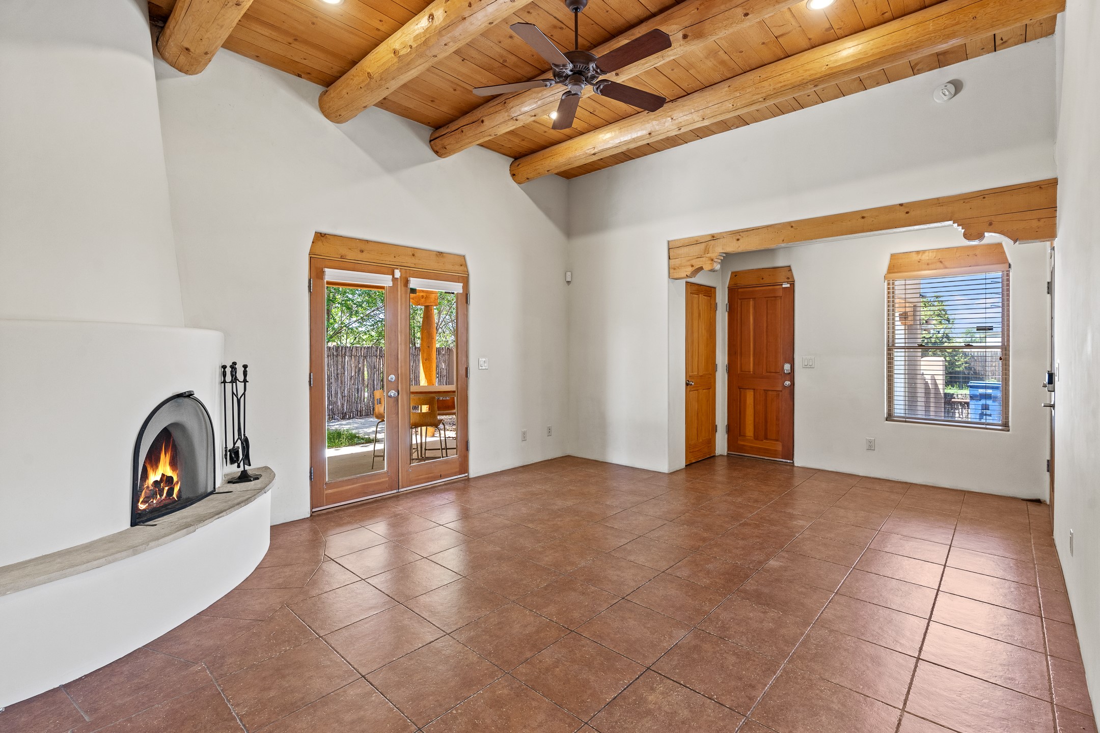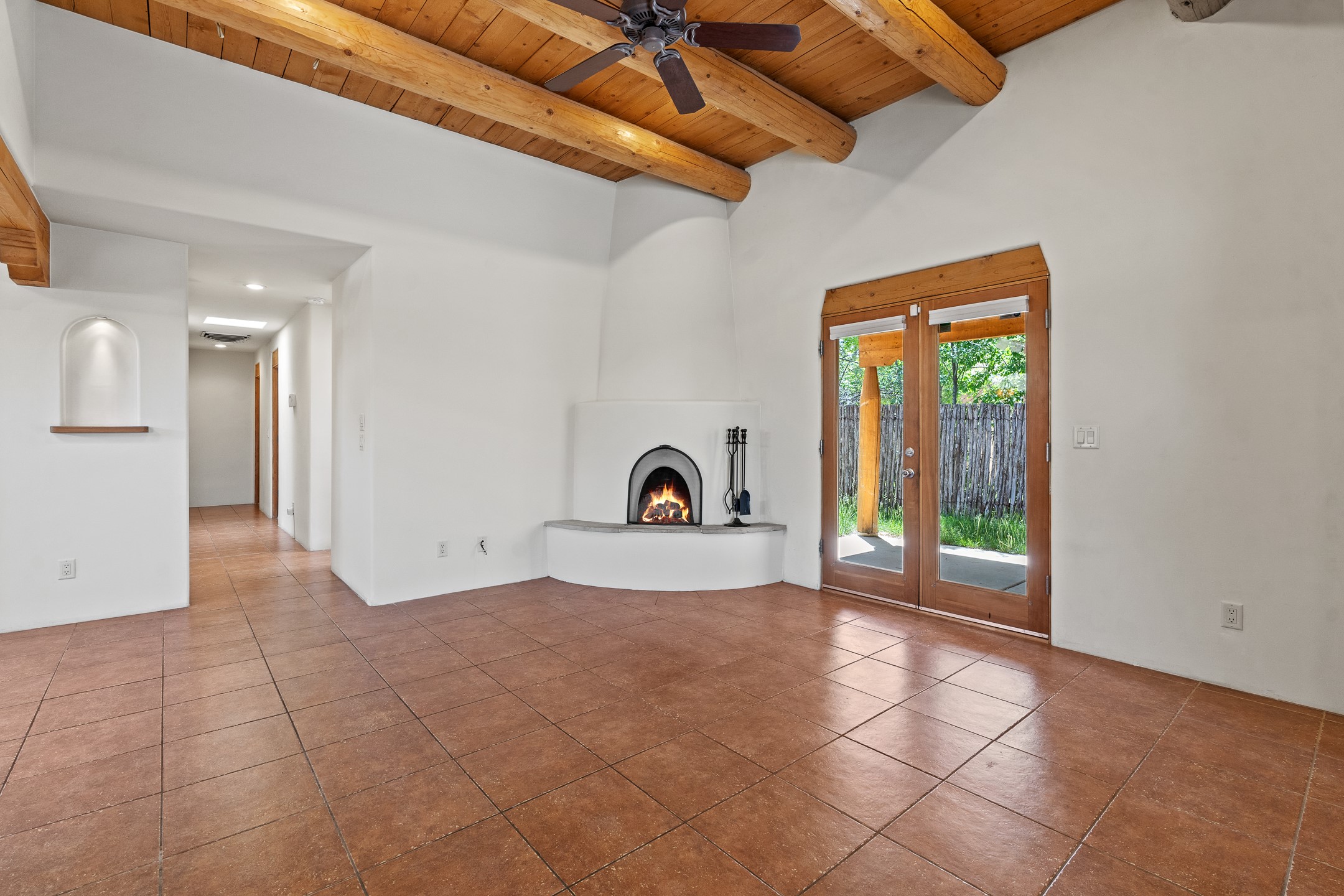 A versatile and charming property featuring a 3-bedroom, 2-bath main house plus a separate 1-bedroom, 1-bath guest house; ideal for rental income, extended family, or a home studio. The main house offers a spacious living area with tile floors, wood-beamed ceilings, and a traditional kiva fireplace, opening into the dining and kitchen area and a lovely covered patio area in a fully fenced yard. The primary suite includes a private bath and walk-in closet. A two-car garage adds to the flexible usage of the property. The guest house has its own entrance and includes a living area, kitchenette, bedroom, and full bath. There is also a washer / dryer hook-up, and it is separately metered. Centrally located, less than a 10-minute walk to restaurants such as Escondido and Tumbleroot Brewery, and a 10-minute drive to the Plaza.