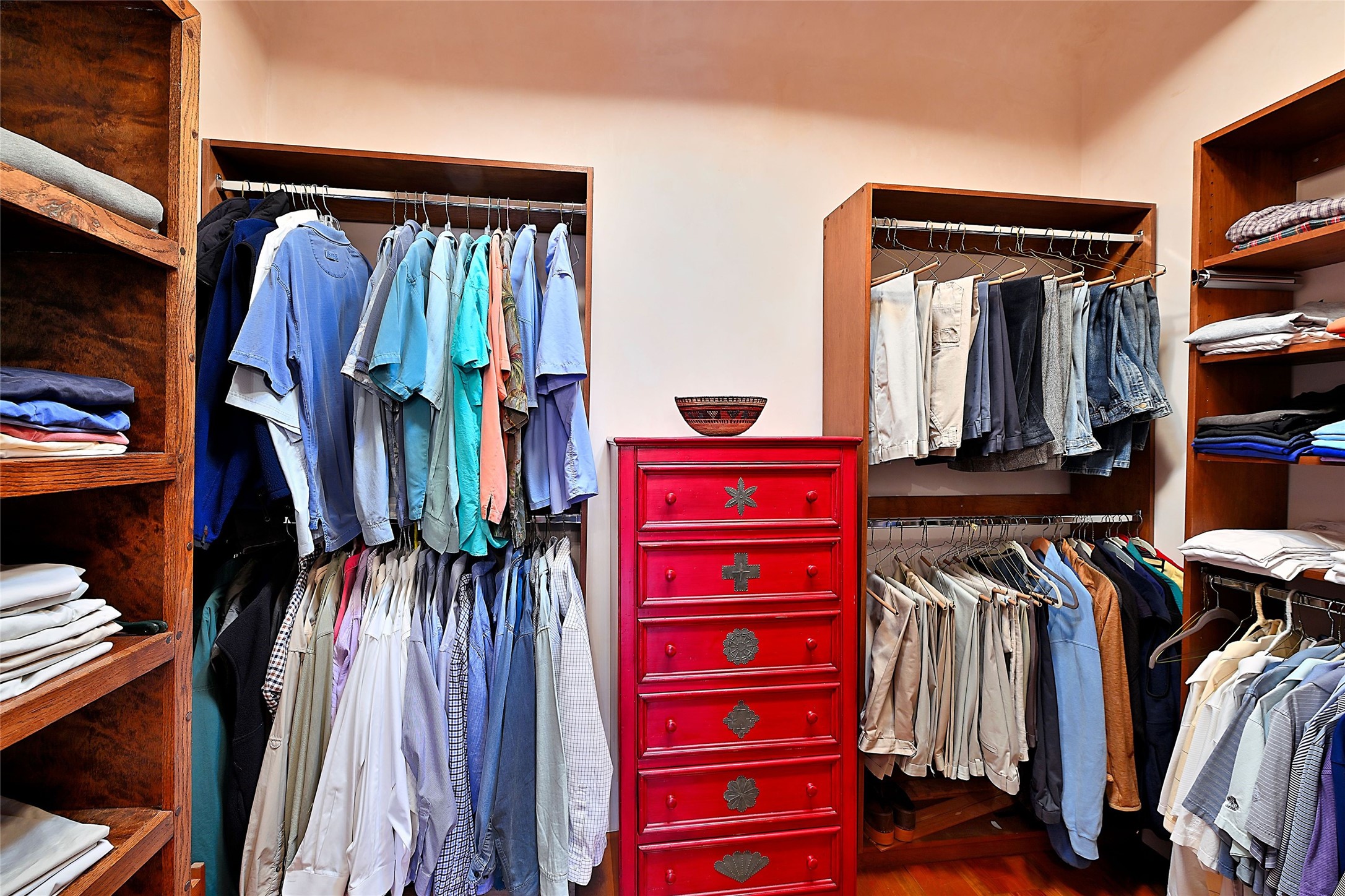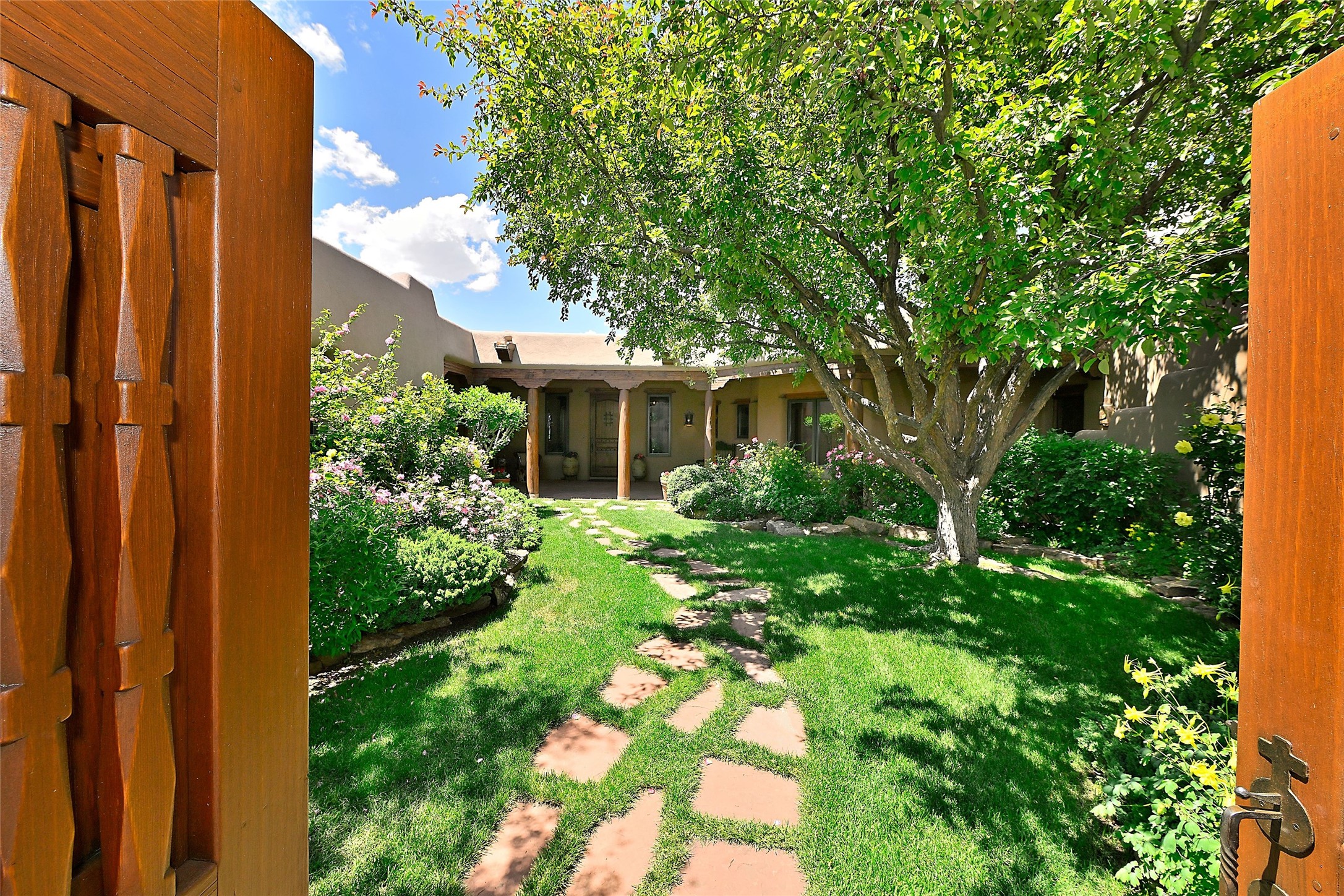Nestled in a prime location on the Sunrise Golf Course, this exceptional adobe residence invites you into a lifestyle defined by comfort, artistry, and connection to the outdoors. A stunning portal wraps around the entire back of the home, framing expansive views of both the Jemez and Sangre de Cristo Mountains. Overlooking lush gardens and a beautifully landscaped backyard, this outdoor space is a favorite spot for outdoor dining, relaxing with a book, or simply enjoying the peaceful and quiet. Inside, the great room welcomes you with warmth and grandeur. A unique entryway, curved walls, artful niches, and a substantial fireplace create a space that feels both impressive and intimate. Just beyond, the warm and cheerful kitchen draws everyone in--anchored by a cozy fireplace and defined by handcrafted tin and tile accents, custom cabinetry, and inviting seating areas. The primary suite is a spacious retreat with a beautifully designed bathroom and a generous double shower. A separate wing of the house holds three self-contained guest bedrooms, each with its own distinctive bath, offering privacy and comfort to family and visitors alike. A charming library, currently used as an office, is accompanied by a finely finished guest bath. Throughout the home, attention to detail abounds--from hand-carved wooden doors to vigas and latillas that lend warmth and texture to every room. Thick adobe walls offer natural insulation year-round, while gently curved interior walls contribute to the home's organic flow. Multiple fireplaces throughout the home and portal provide both ambiance and warmth. This is a home filled with light, character, and soul--whether strolling near the golf course at sunset or savoring the serenity of the gardens, every space offers something truly special. Above all, it is simply a wonderful home to live in and love.