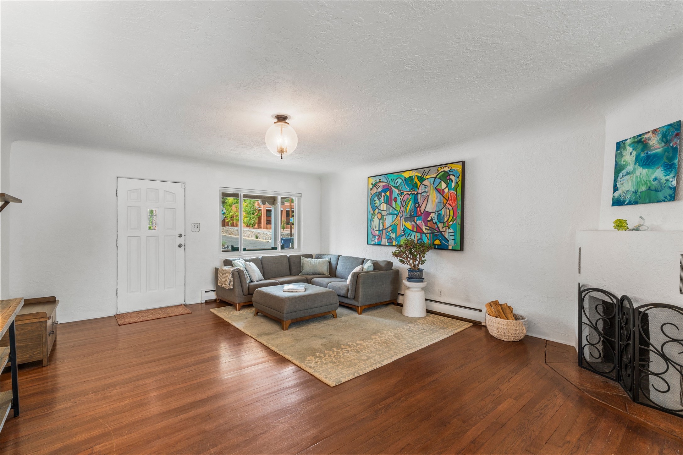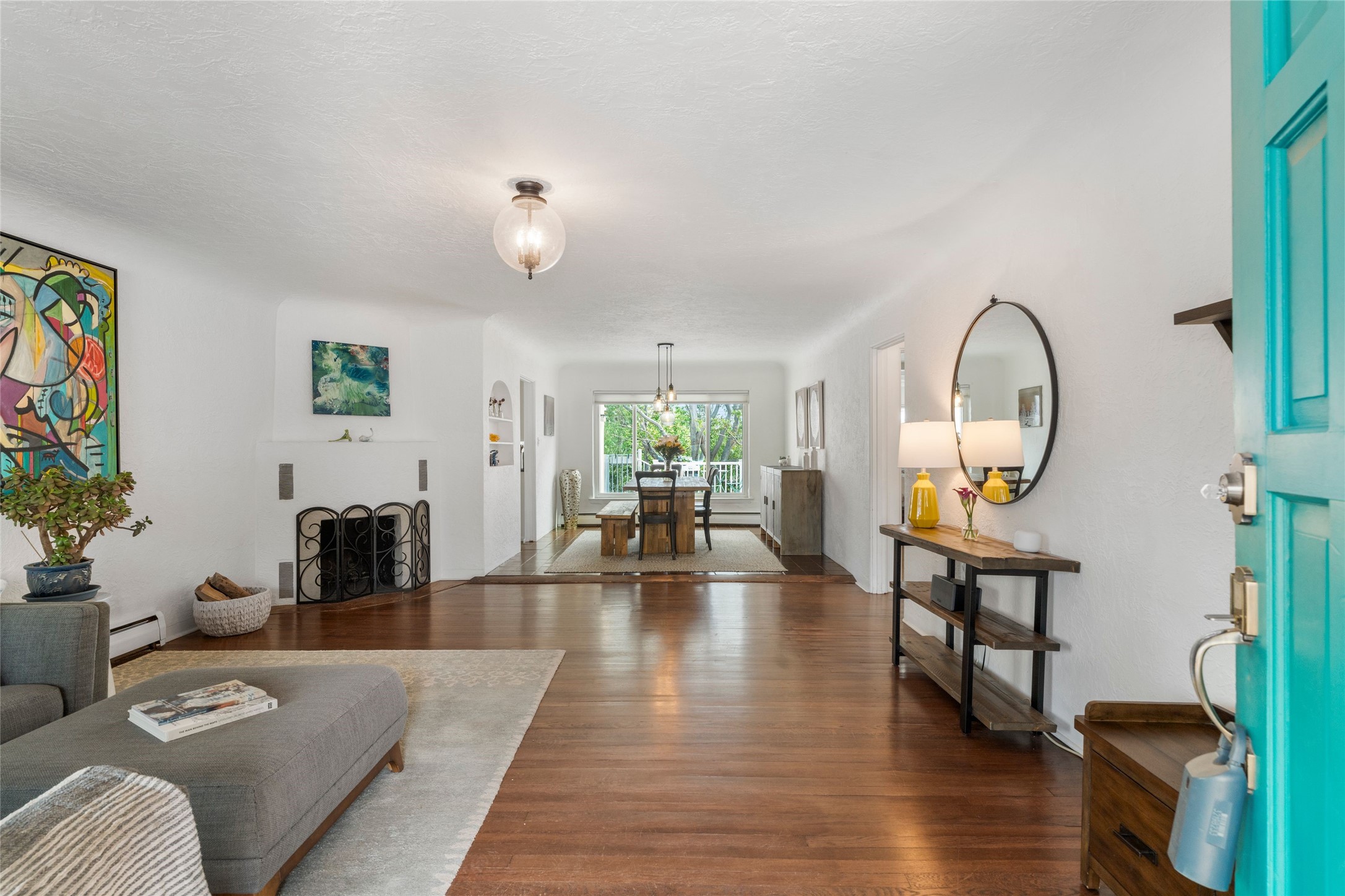 Centrally located in this quiet South Capitol neighborhood, this chic and updated 2,470 sq.ft., two-story single family home is situated on a quiet street with a large landscaped lot and updated interior finishes throughout the home. There are are a total of 3 bedrooms and 3 bathrooms (two bedrooms/1 full bathroom at the entry level, and 1 bedroom and 2 baths on the lower level). The open-concept living/dining room look out onto treed and landscaped views with private walled and gated outdoor space, perfect for seasonal living and plenty of room for entertaining. The nearby kitchen with bar seating, stainless appliances, and granite countertops has another family room adjacent to it with upper deck access and treetop views. A wood burning kiva fireplace centers this living area with an additional kiva wood-burning fireplace in the formal entry living room. Downstairs, a third living area could function as a private guest quarters with its own access, or a flex space/office perfect for growing family or professionals needing additional work space. The home has large view windows, bathing the spaces in natural light. Wood and tile floors cascade throughout adding to the organic warmth of the home. The large back yard has a bubbling fountain, in-ground trampoline and grassed area, ideal for entertaining or quiet privacy. A direct access 1-car oversized garage and off-street parking comes with the property. Accessibility to the downtown and midtown area is what makes this lovingly maintained property an ideal location to call home.